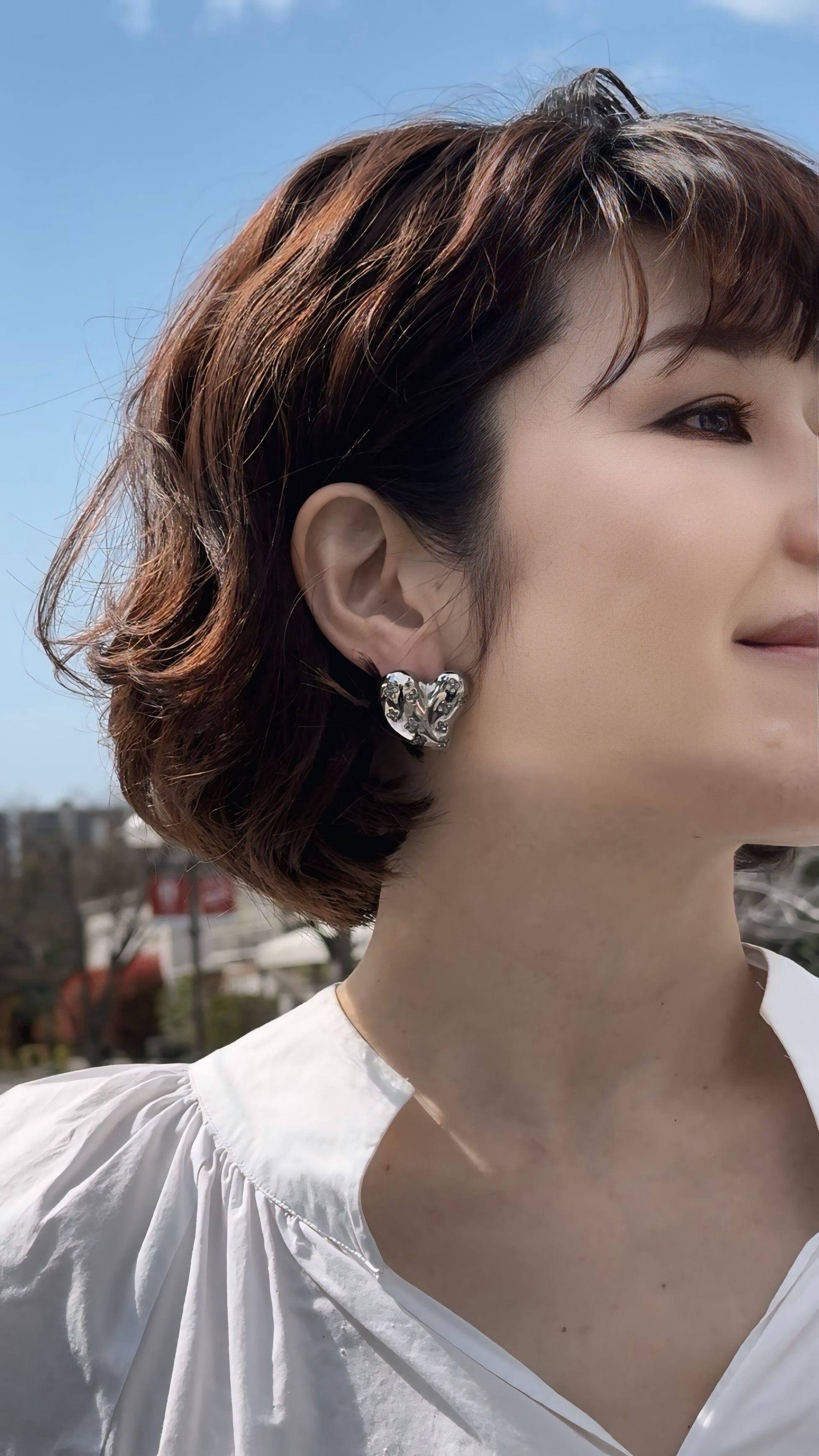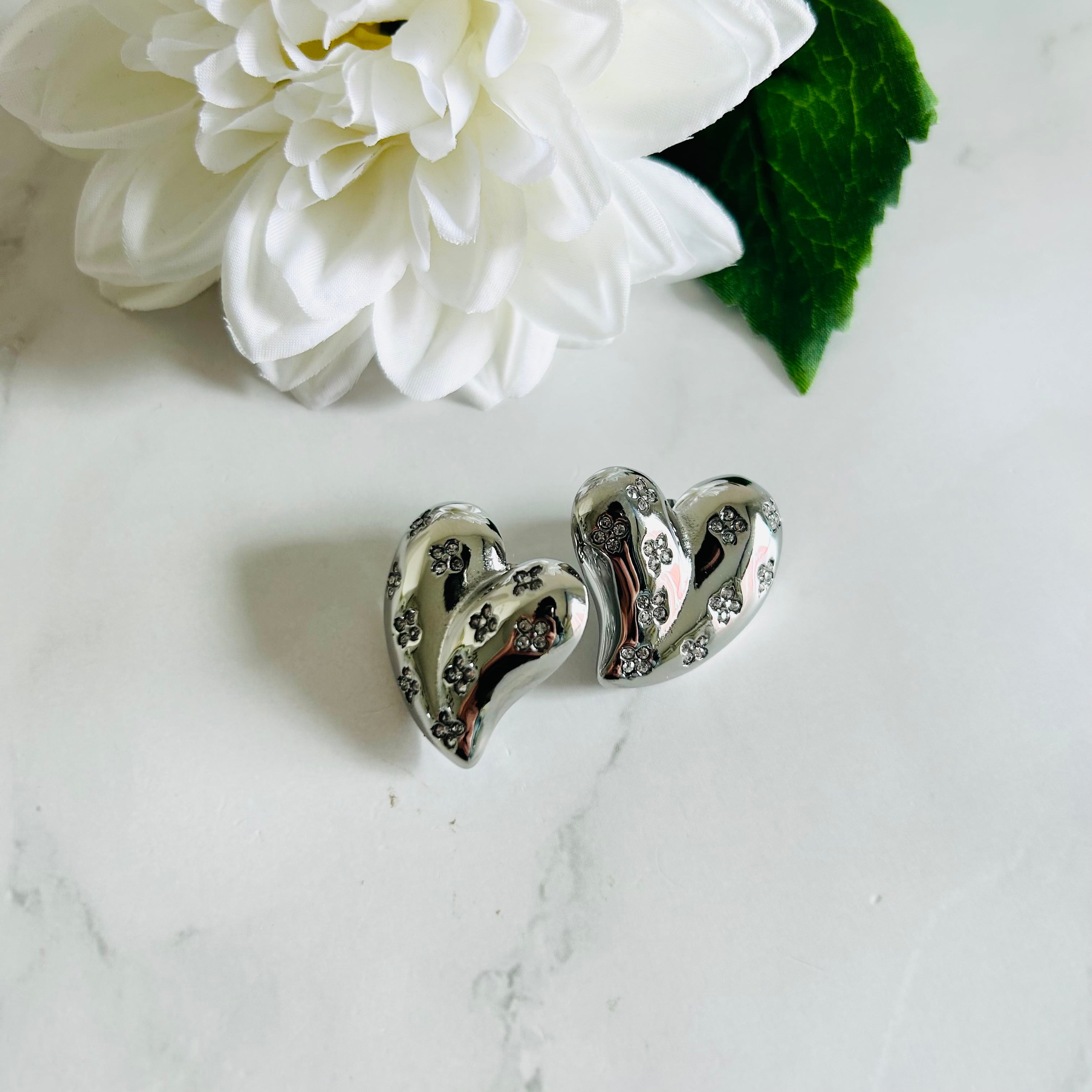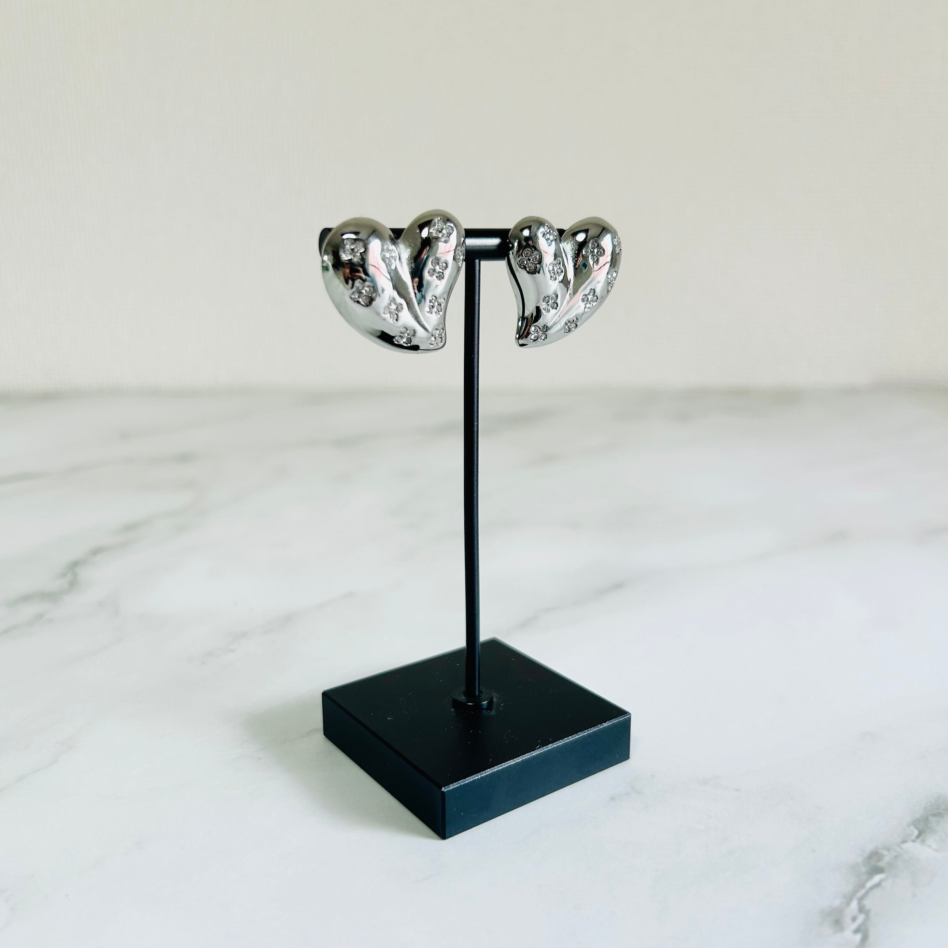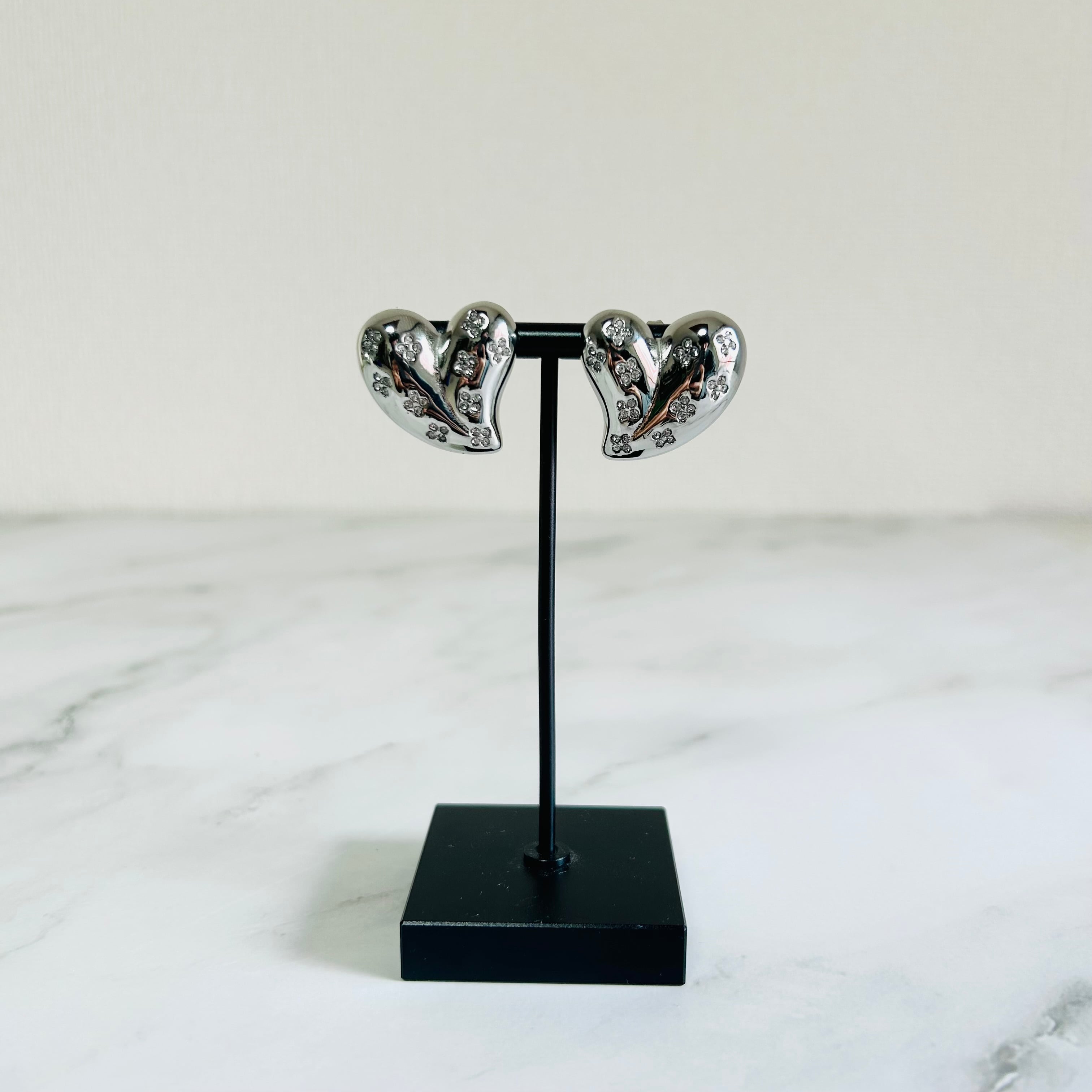 つややかなシルバーハートに、きらりと光る小さなお花のようなストーンが散りばめられた、見ているだけで気分が上がるピアスです♡