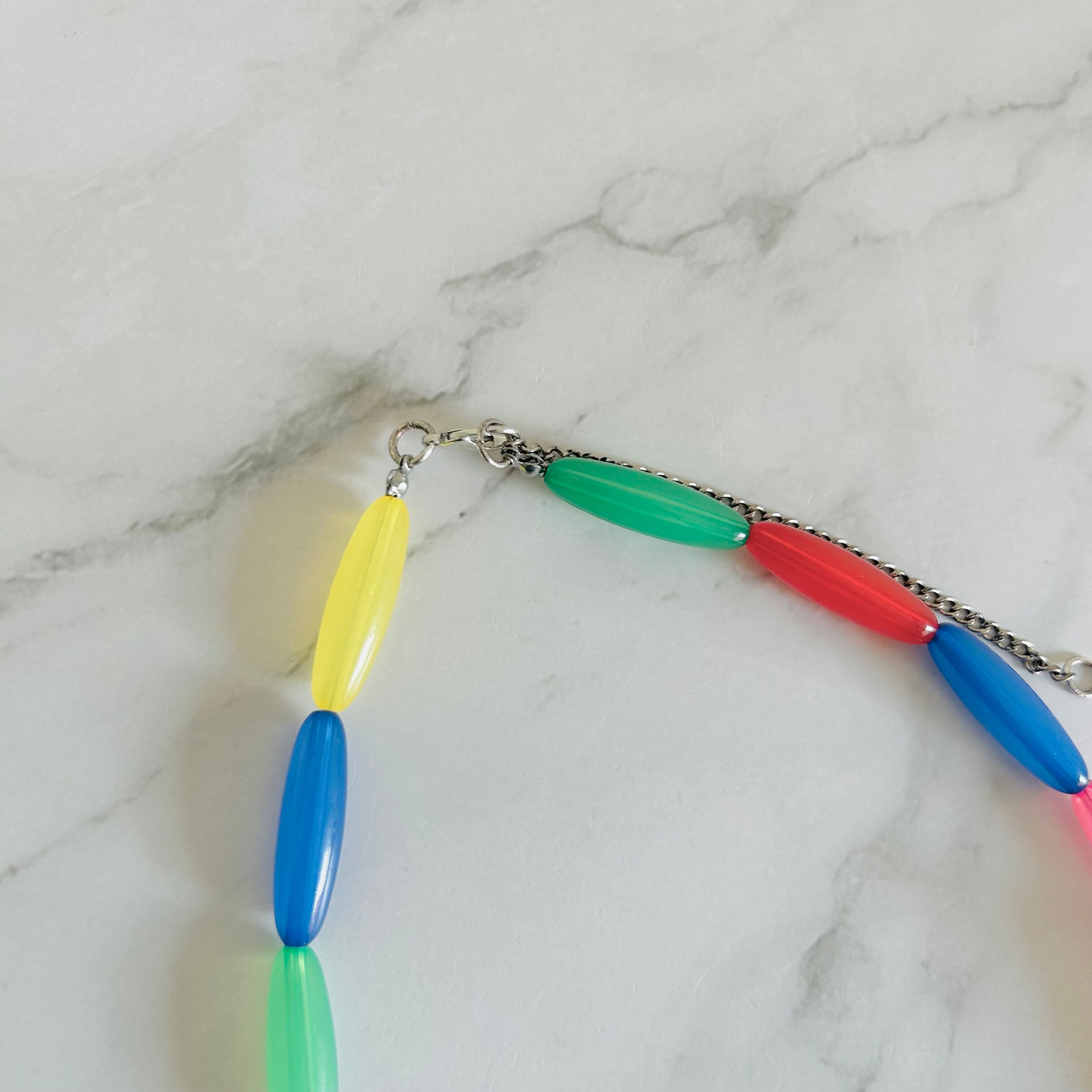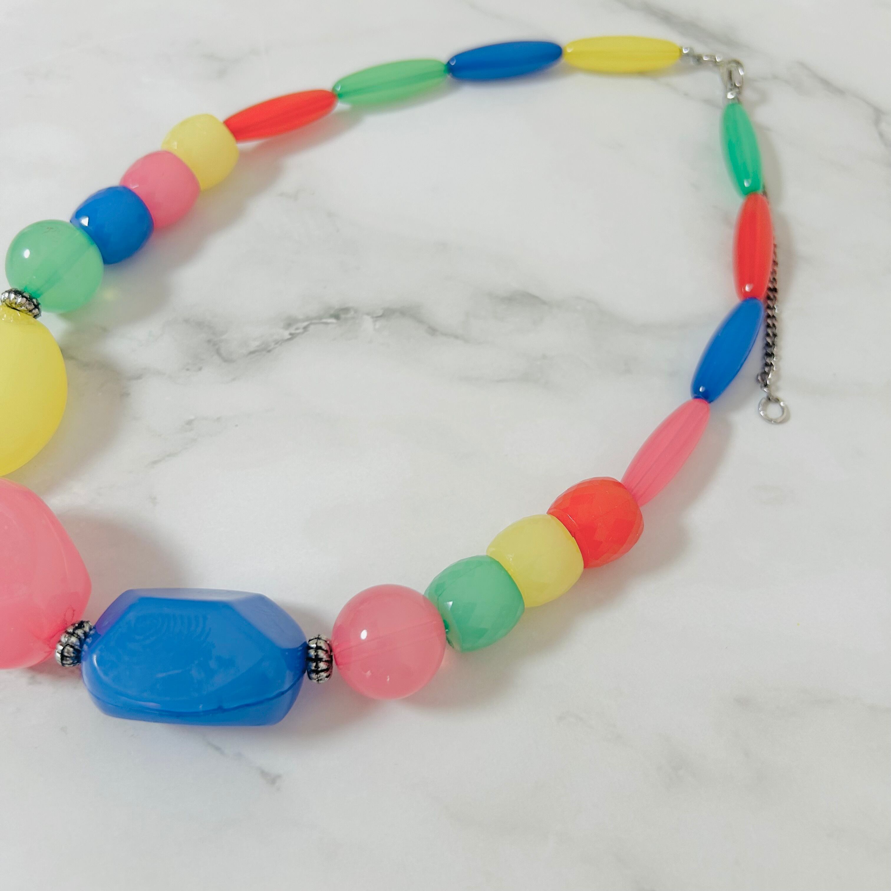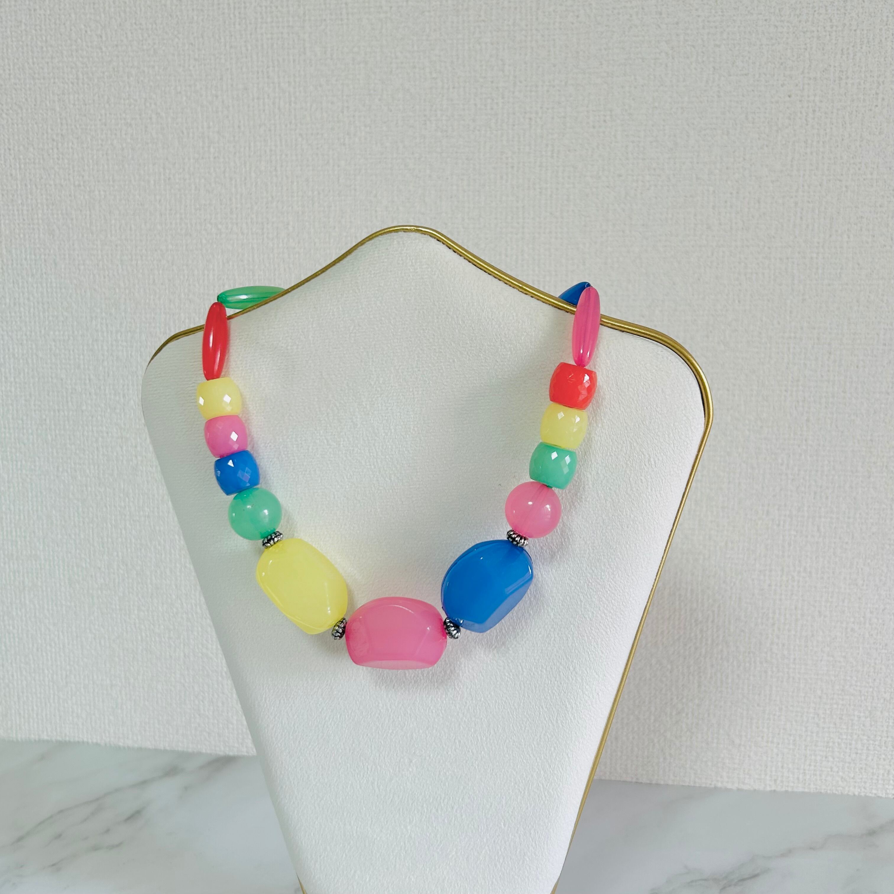 まるでキャンディを並べたようなカラフルなアクリルパーツを組み合わせた、心躍るデザインのネックレスです。