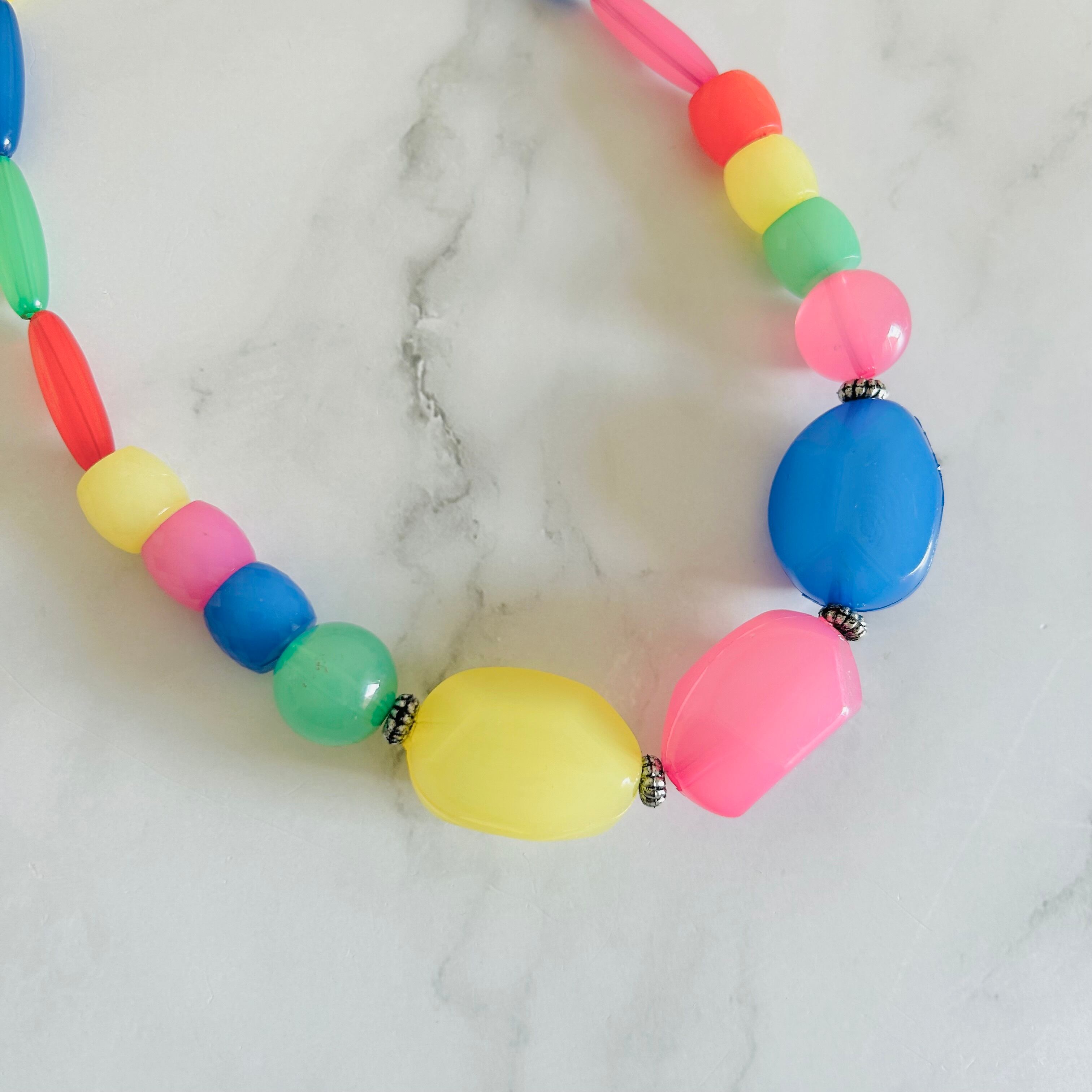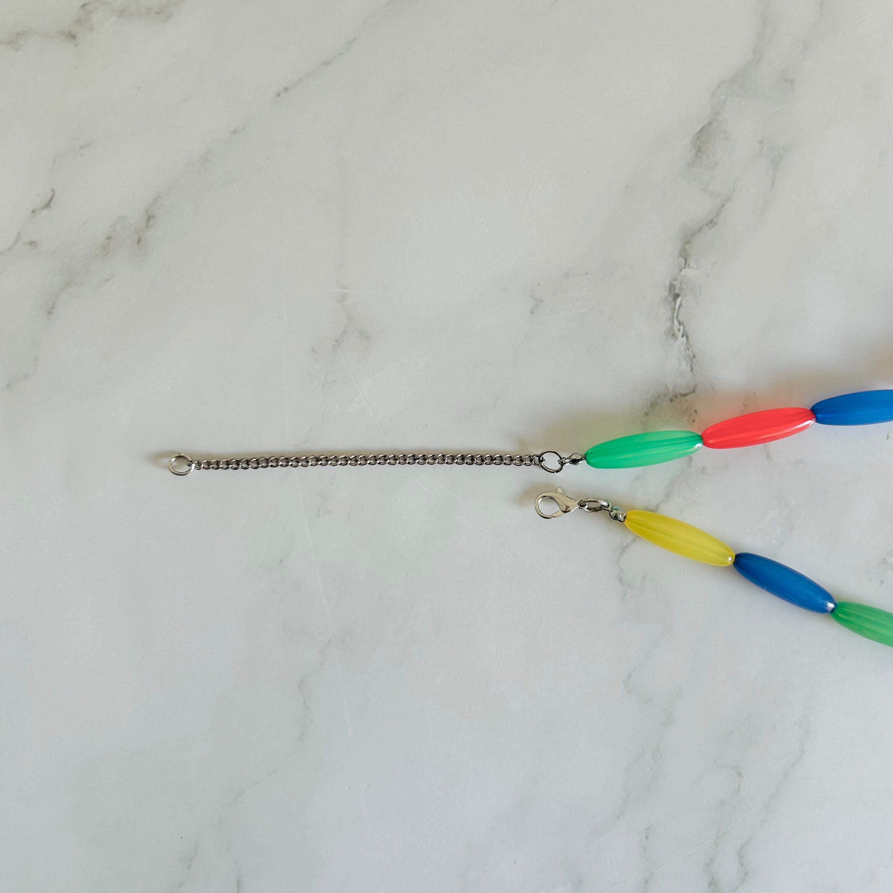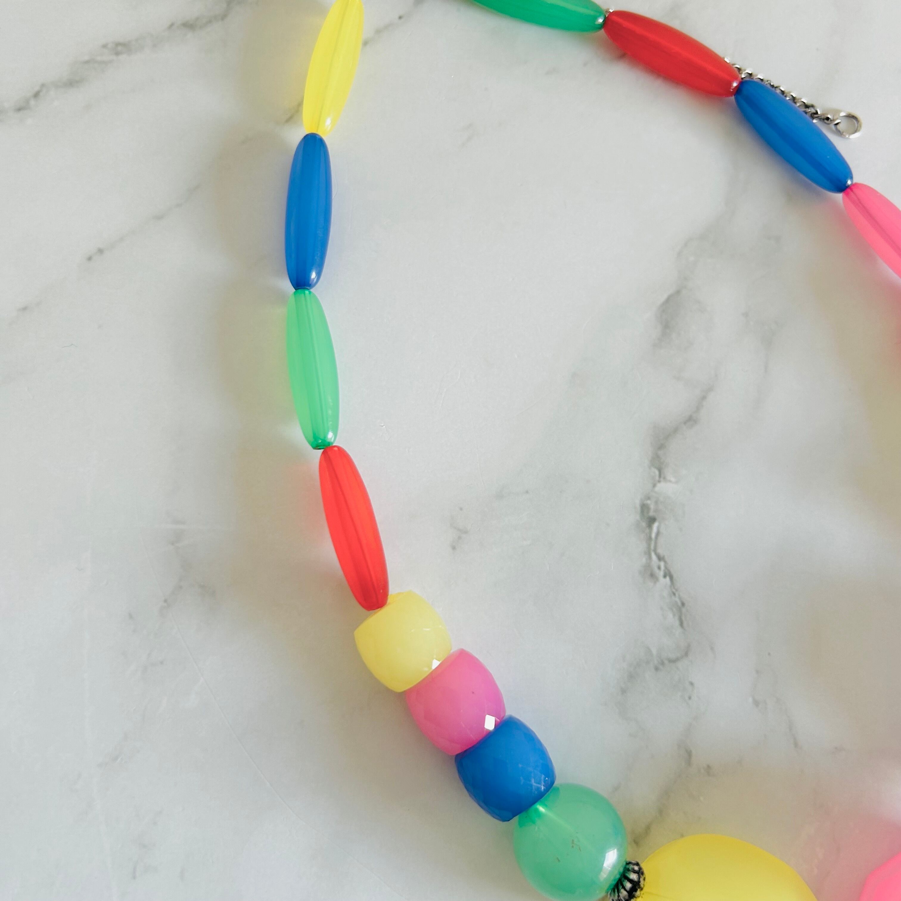 まるでキャンディを並べたようなカラフルなアクリルパーツを組み合わせた、心躍るデザインのネックレスです。