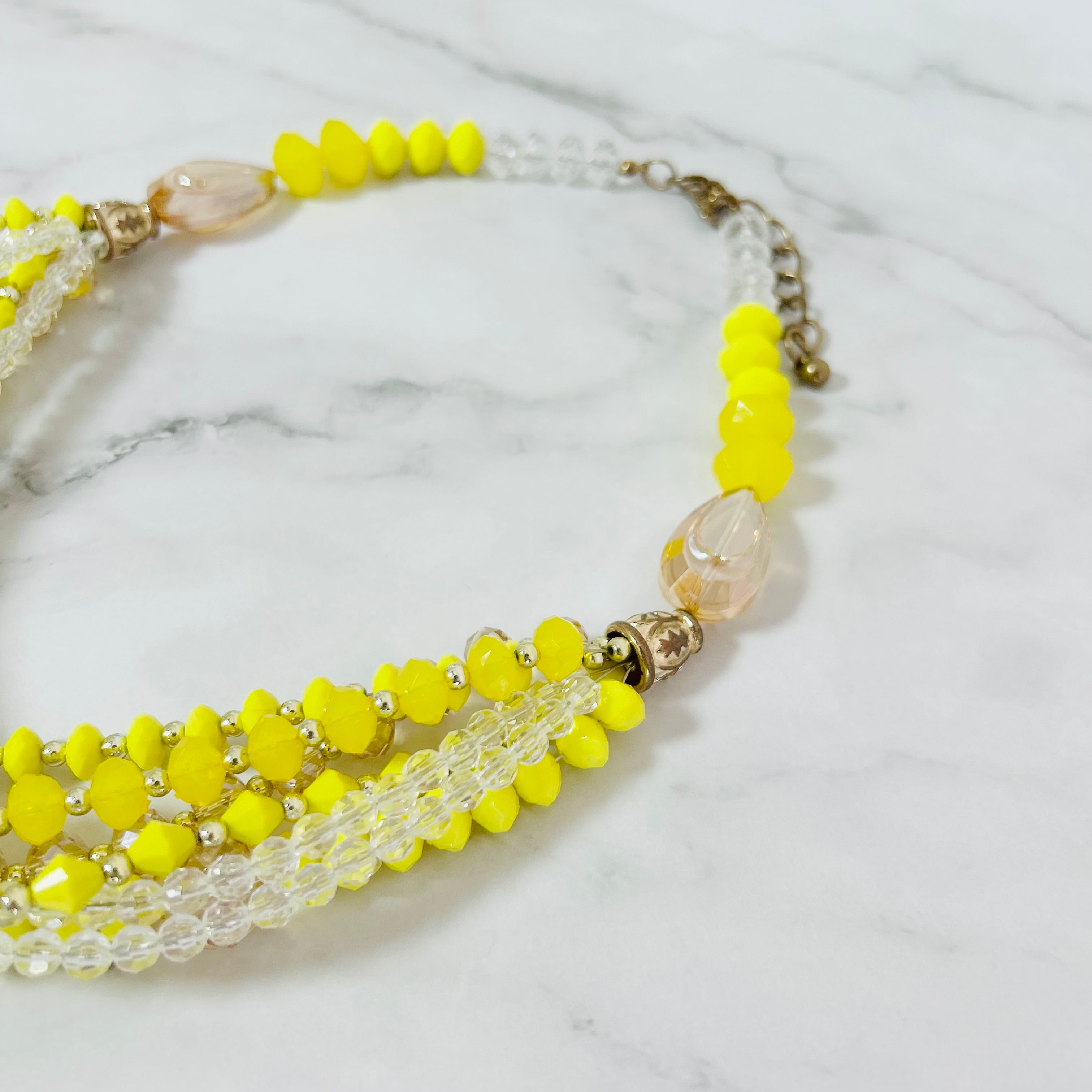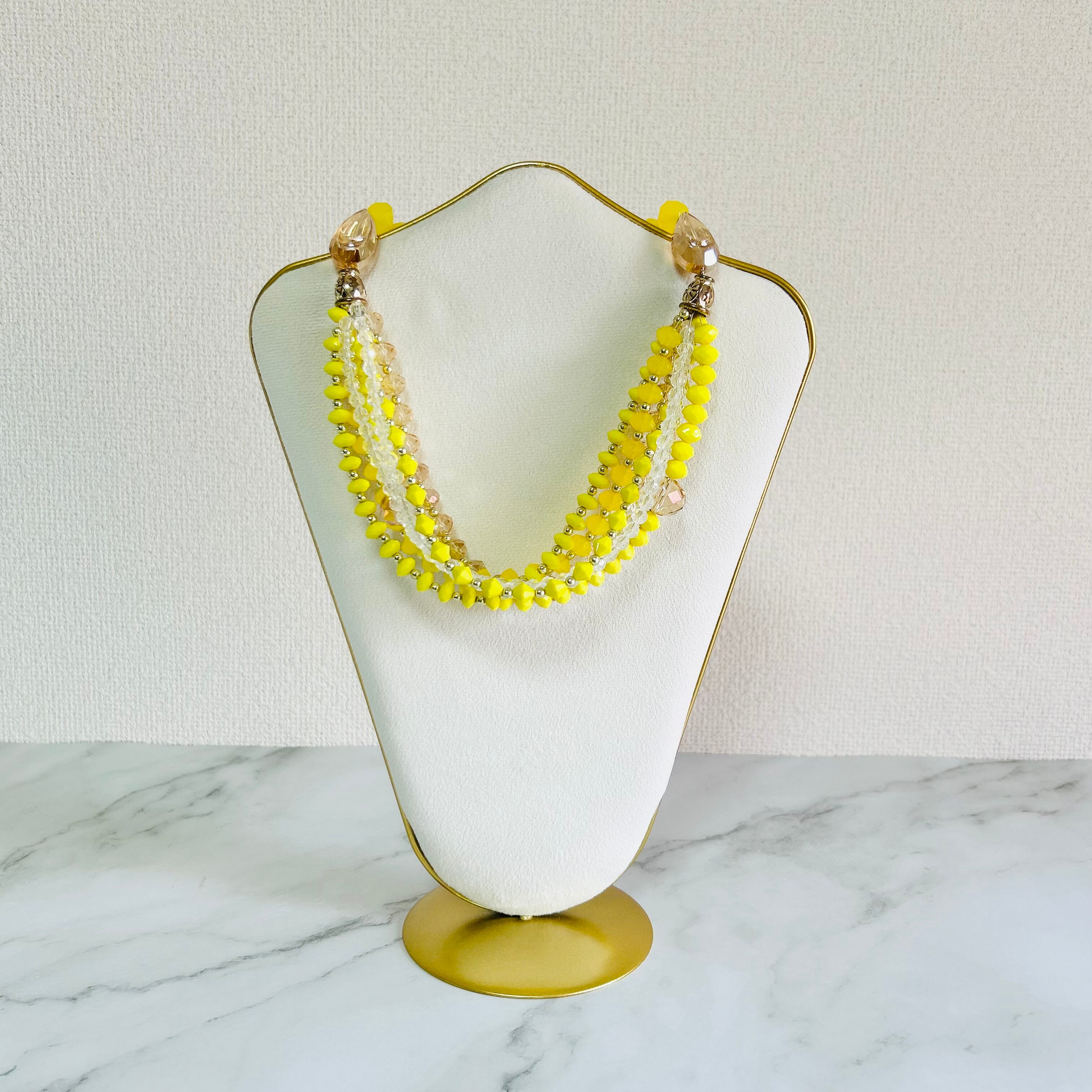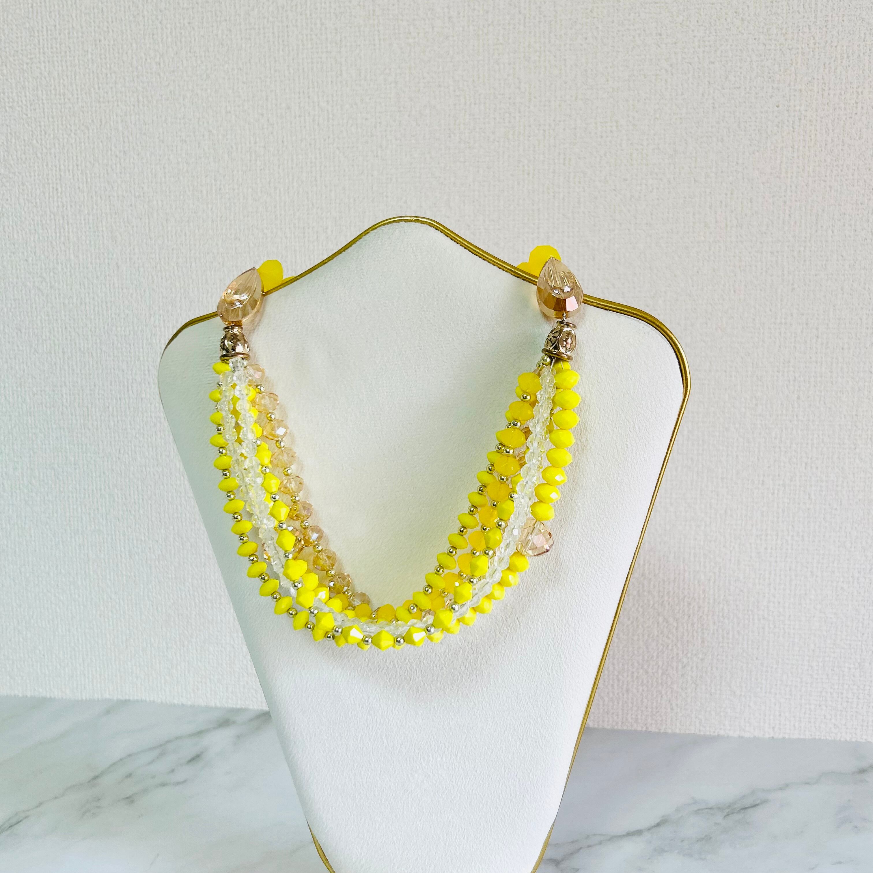 艶やかなイエロービーズと、透明感あるクリアビーズ、ベージュのクリスタルビーズを組み合わせた7連のネックレスです。