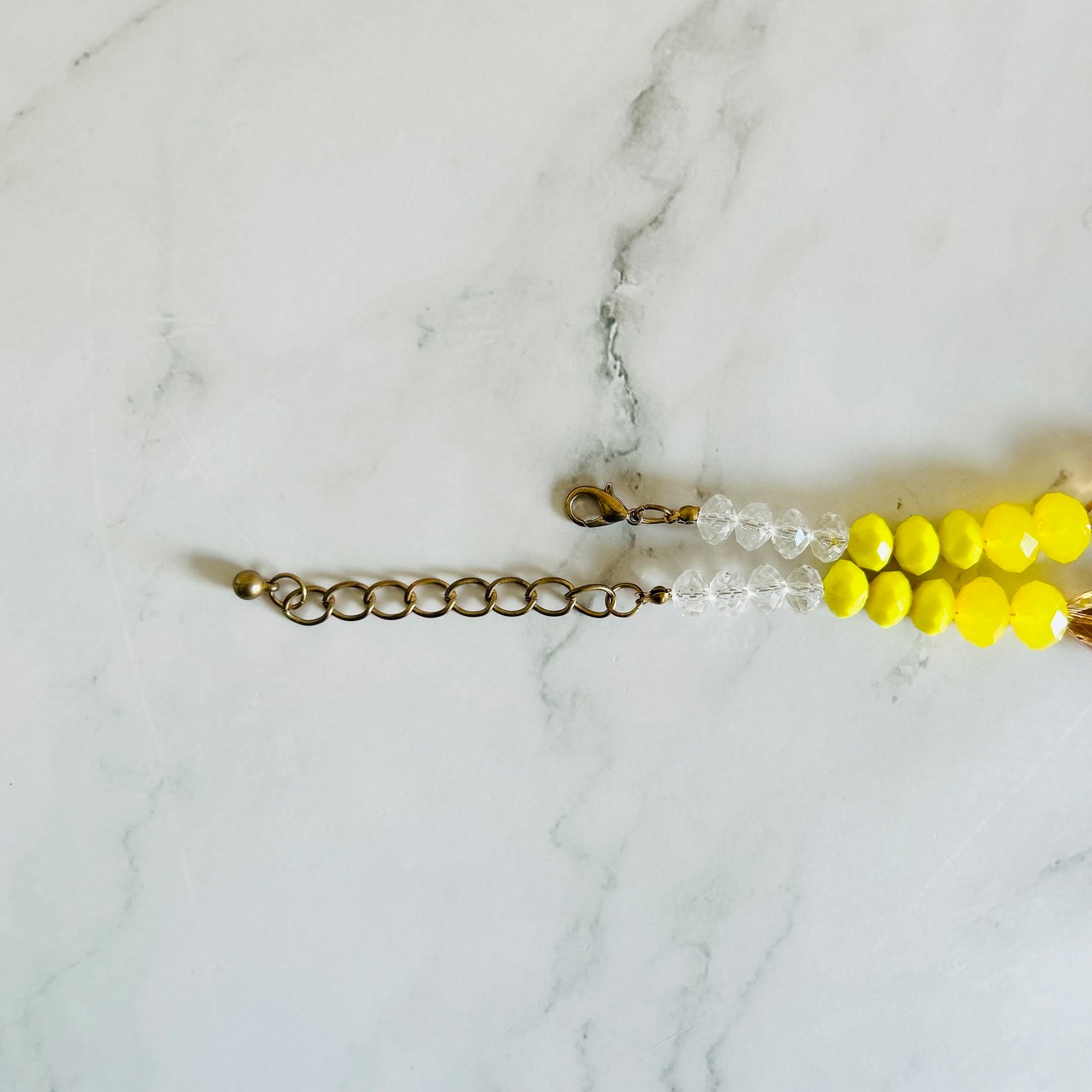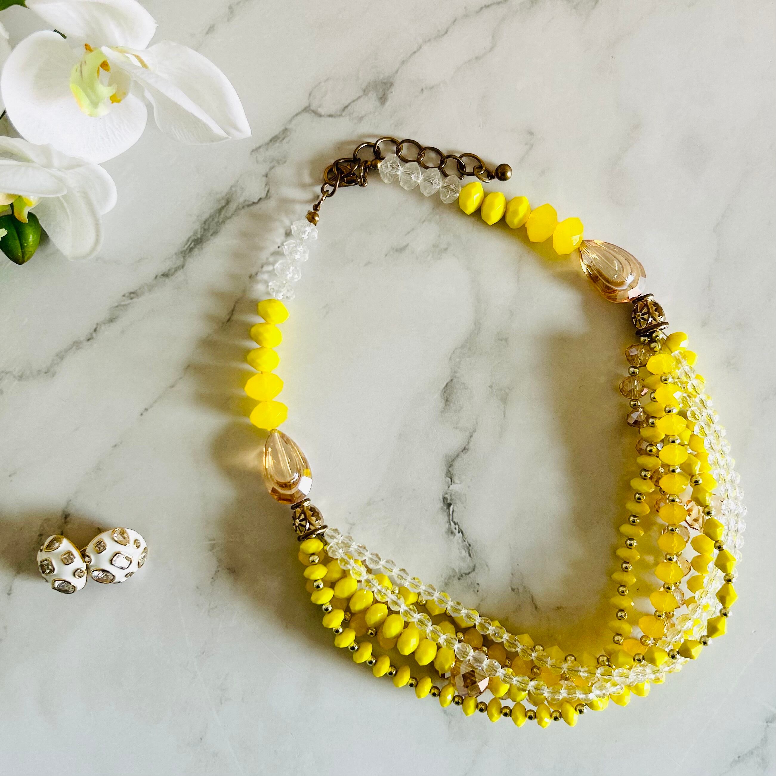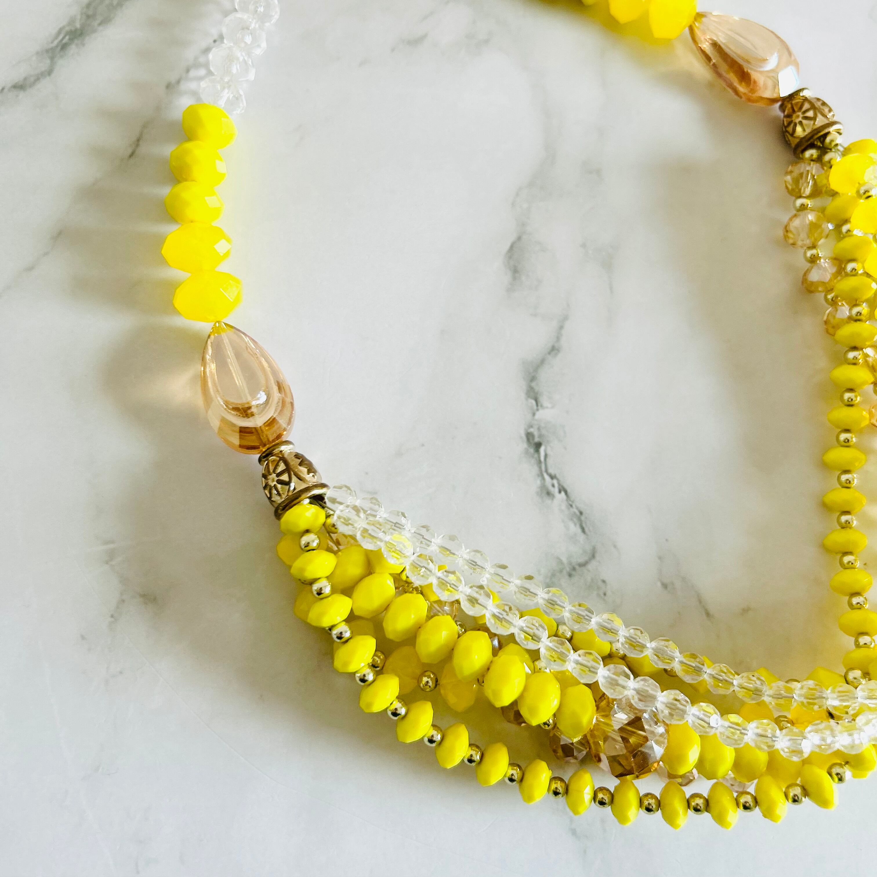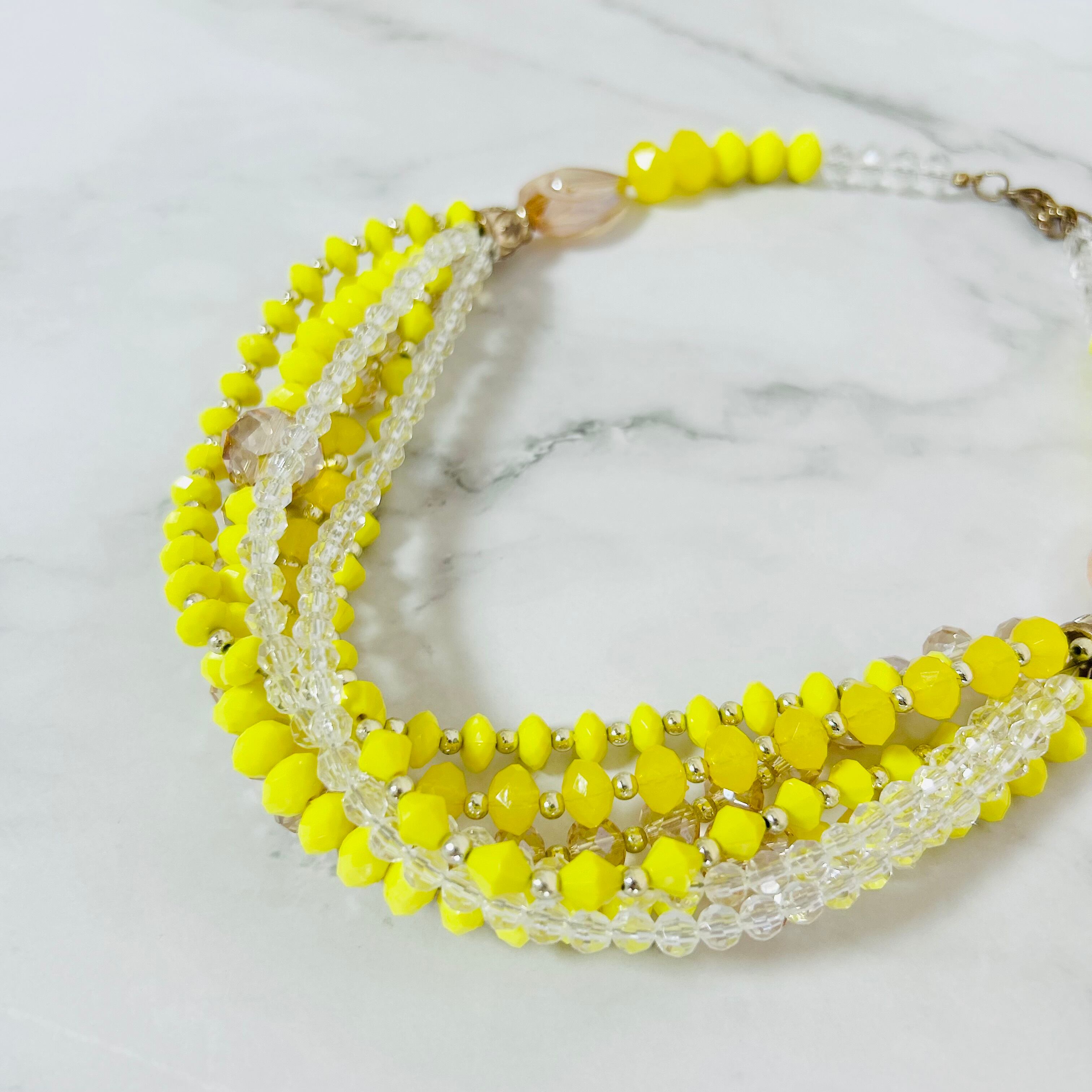 艶やかなイエロービーズと、透明感あるクリアビーズ、ベージュのクリスタルビーズを組み合わせた7連のネックレスです。
