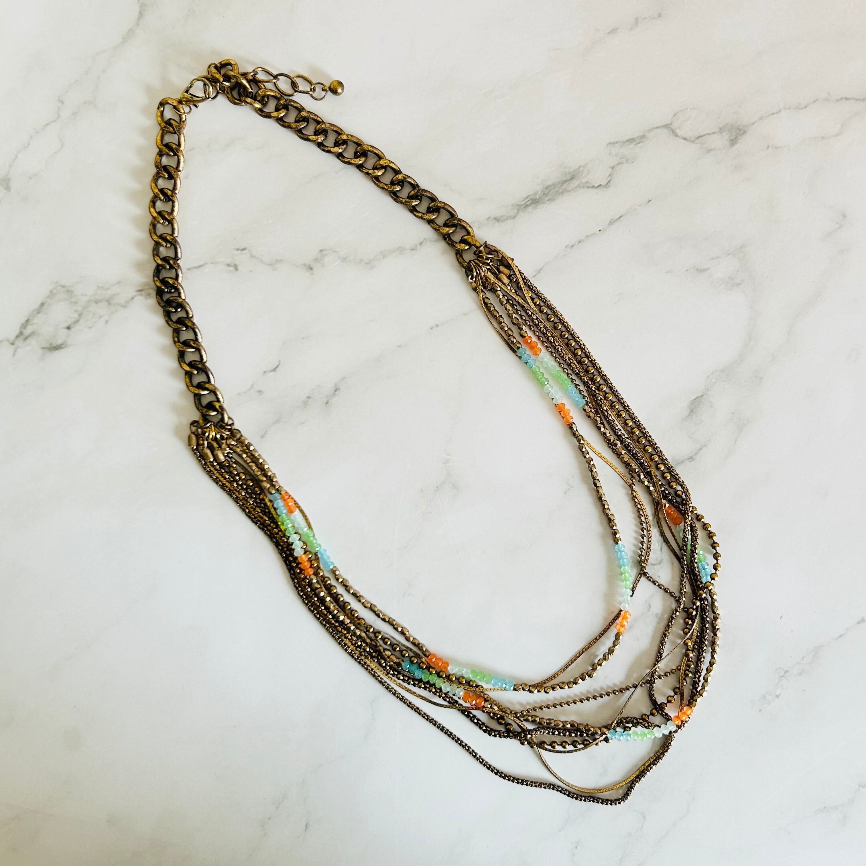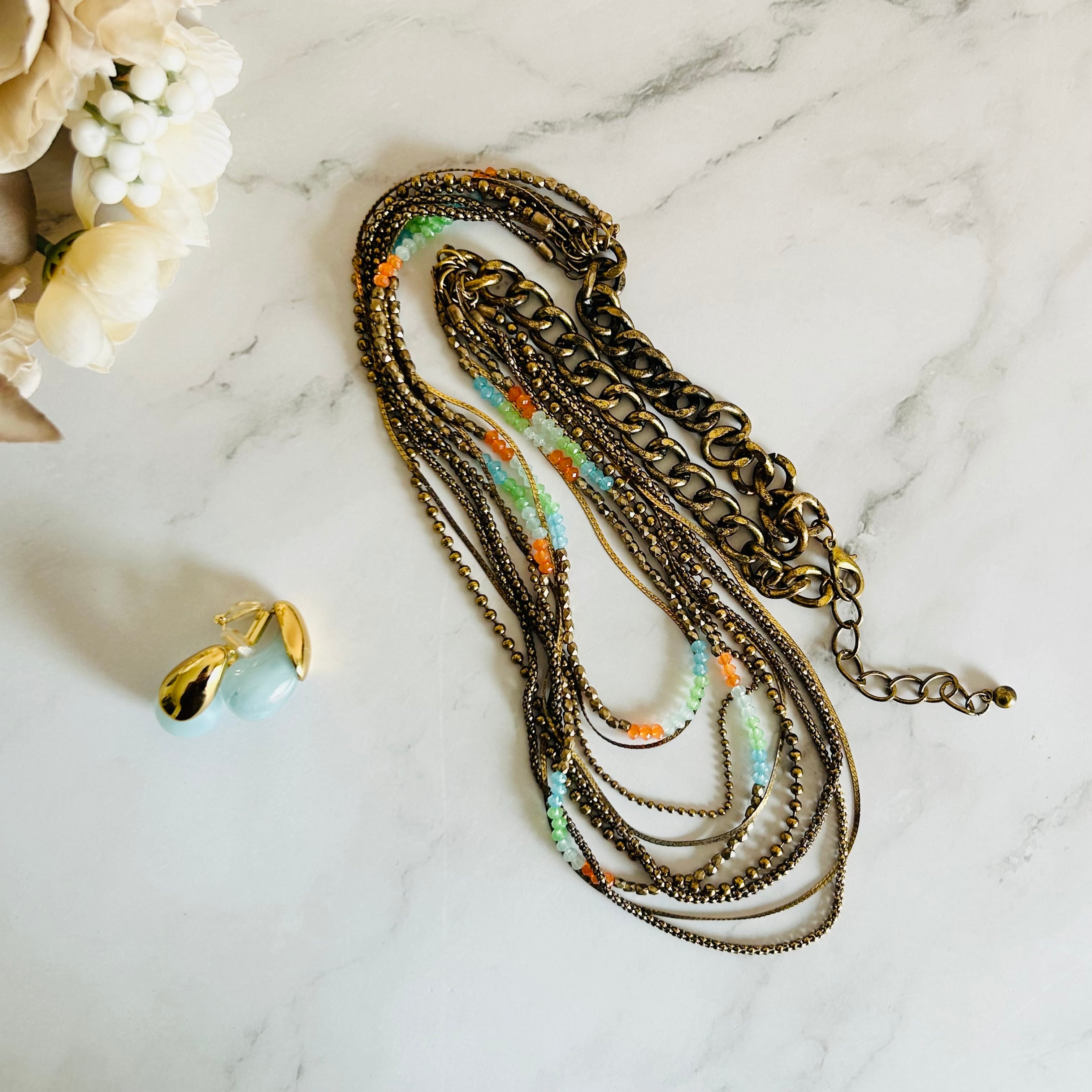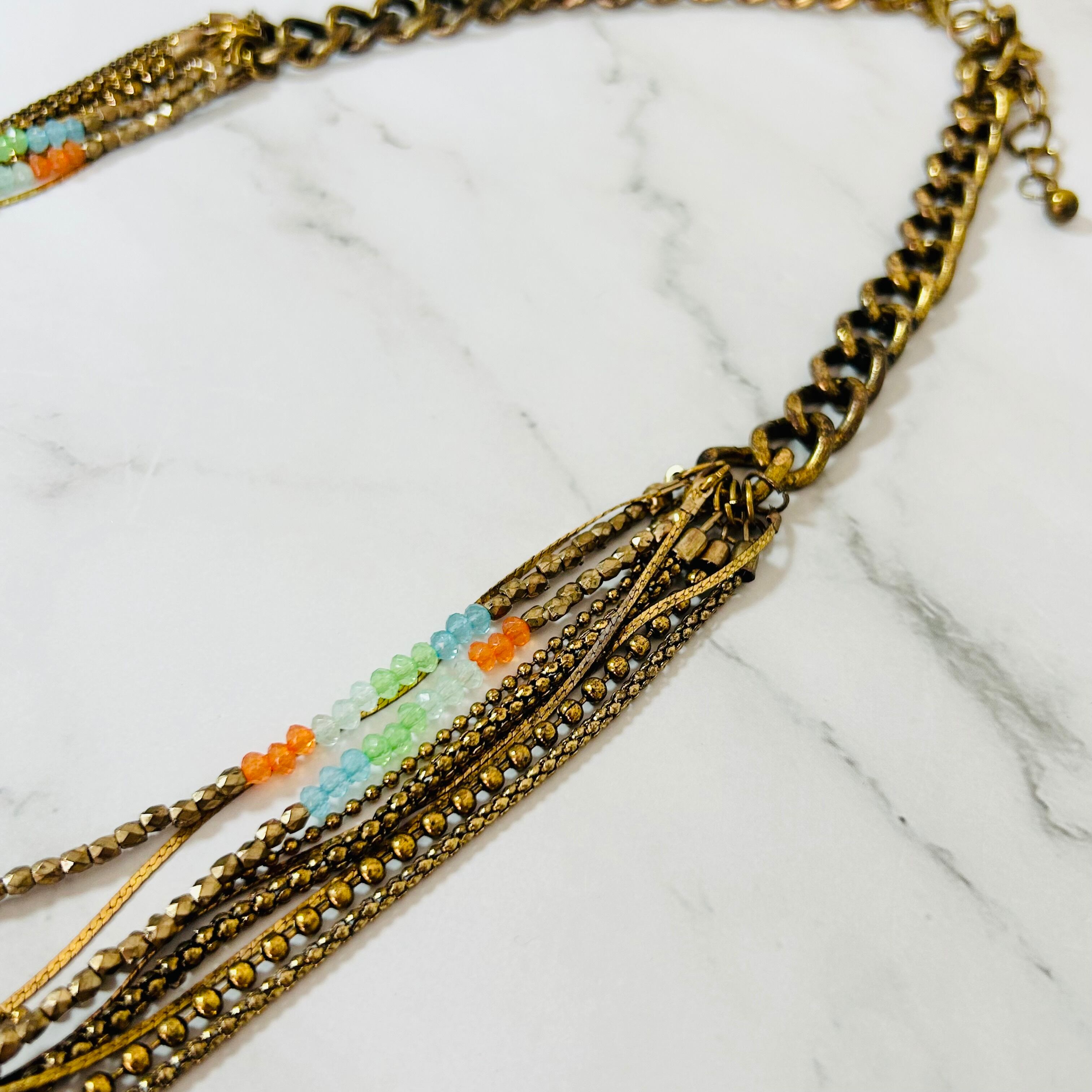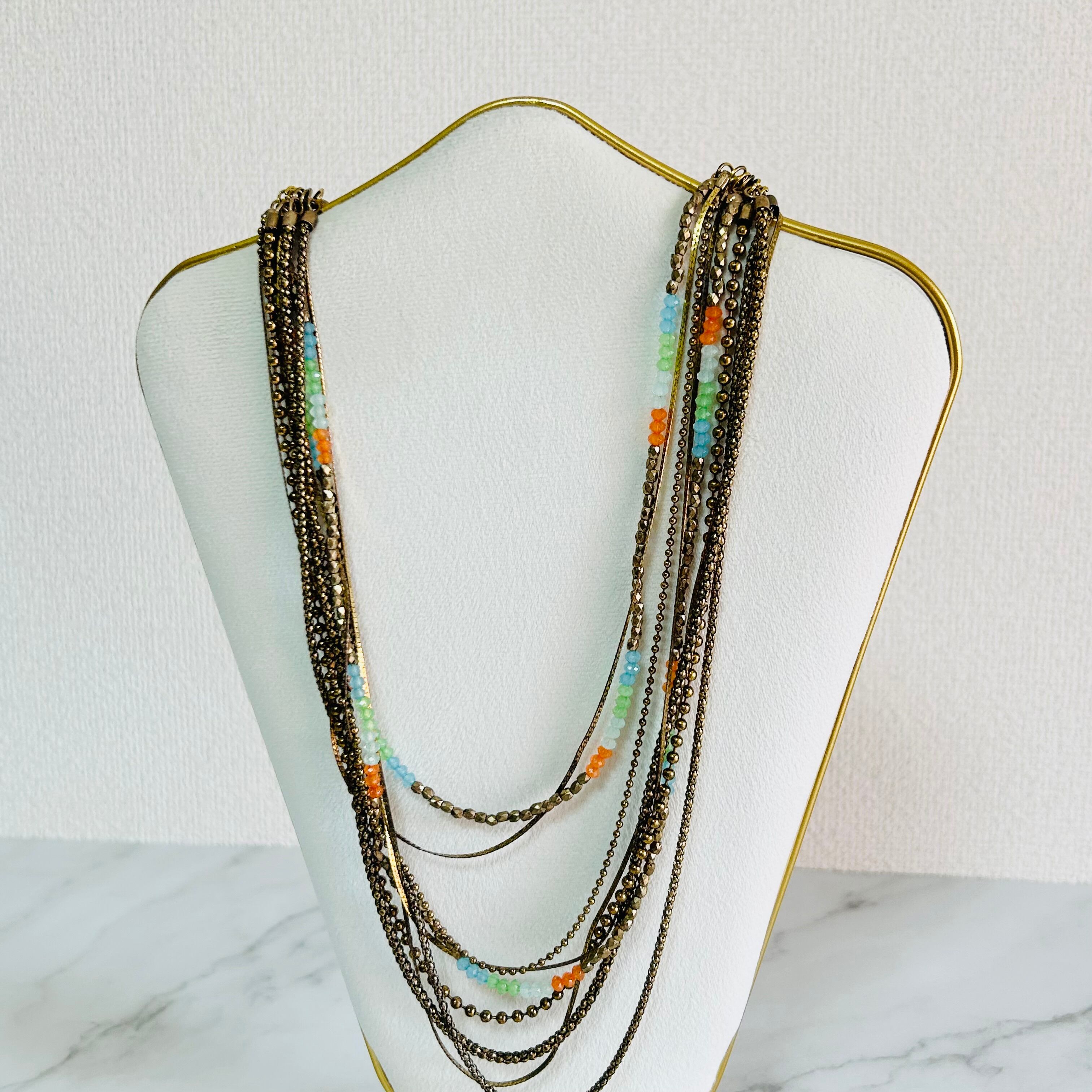 燻したようなアンティークゴールドのチェーンに、オレンジ・グリーン・ブルーのビーズがほどよい彩りを添えた、遊び心と上品さを兼ね備えたロングネックレス。