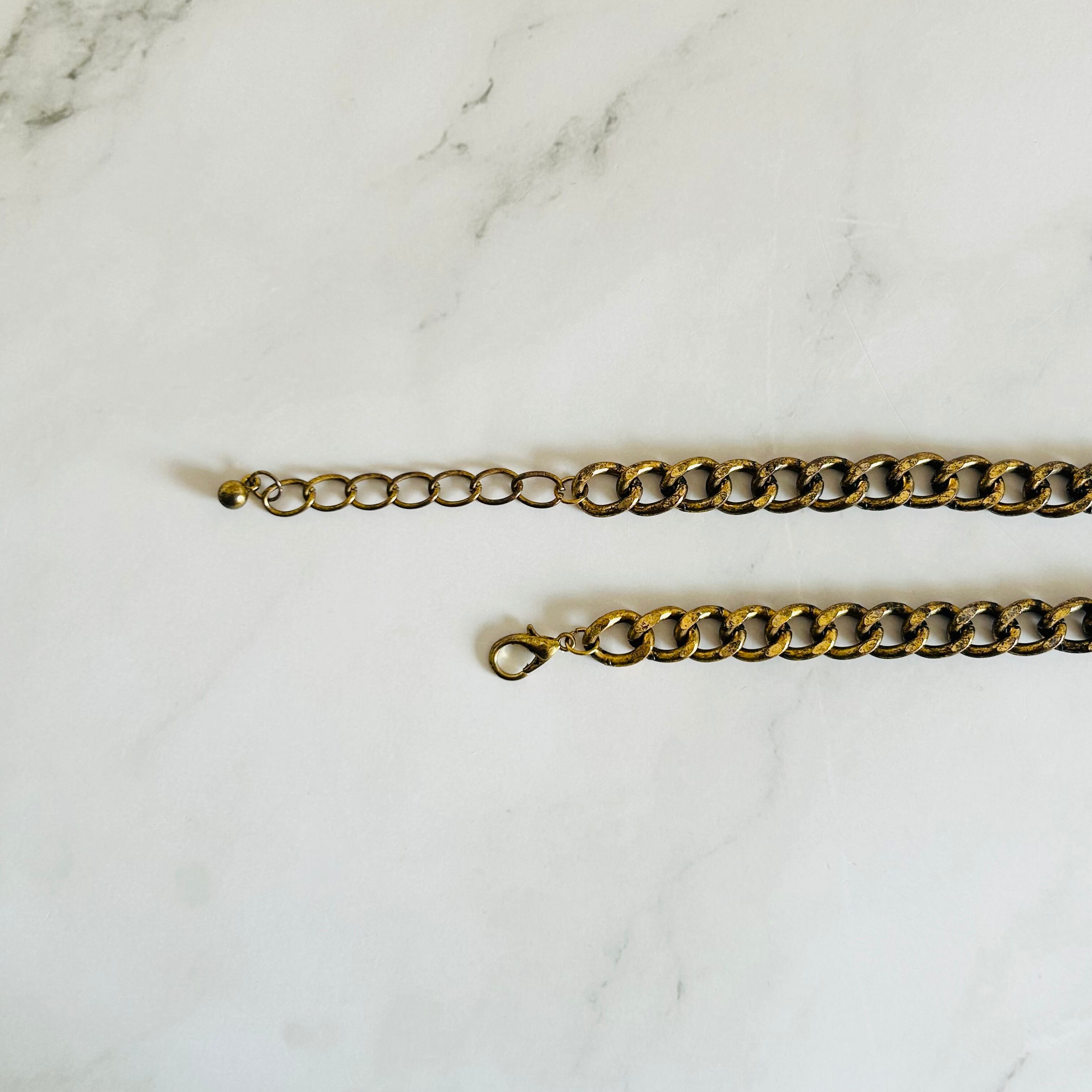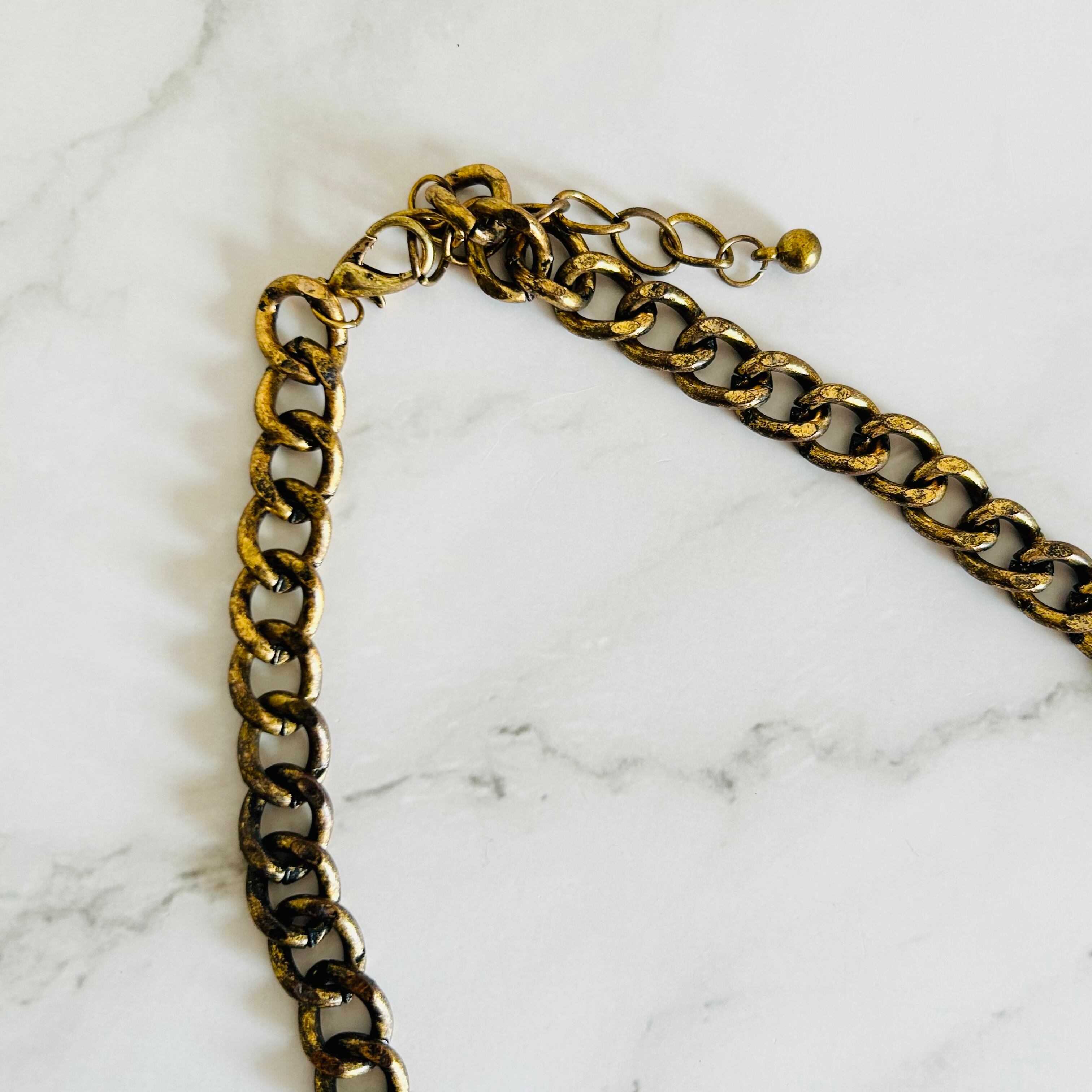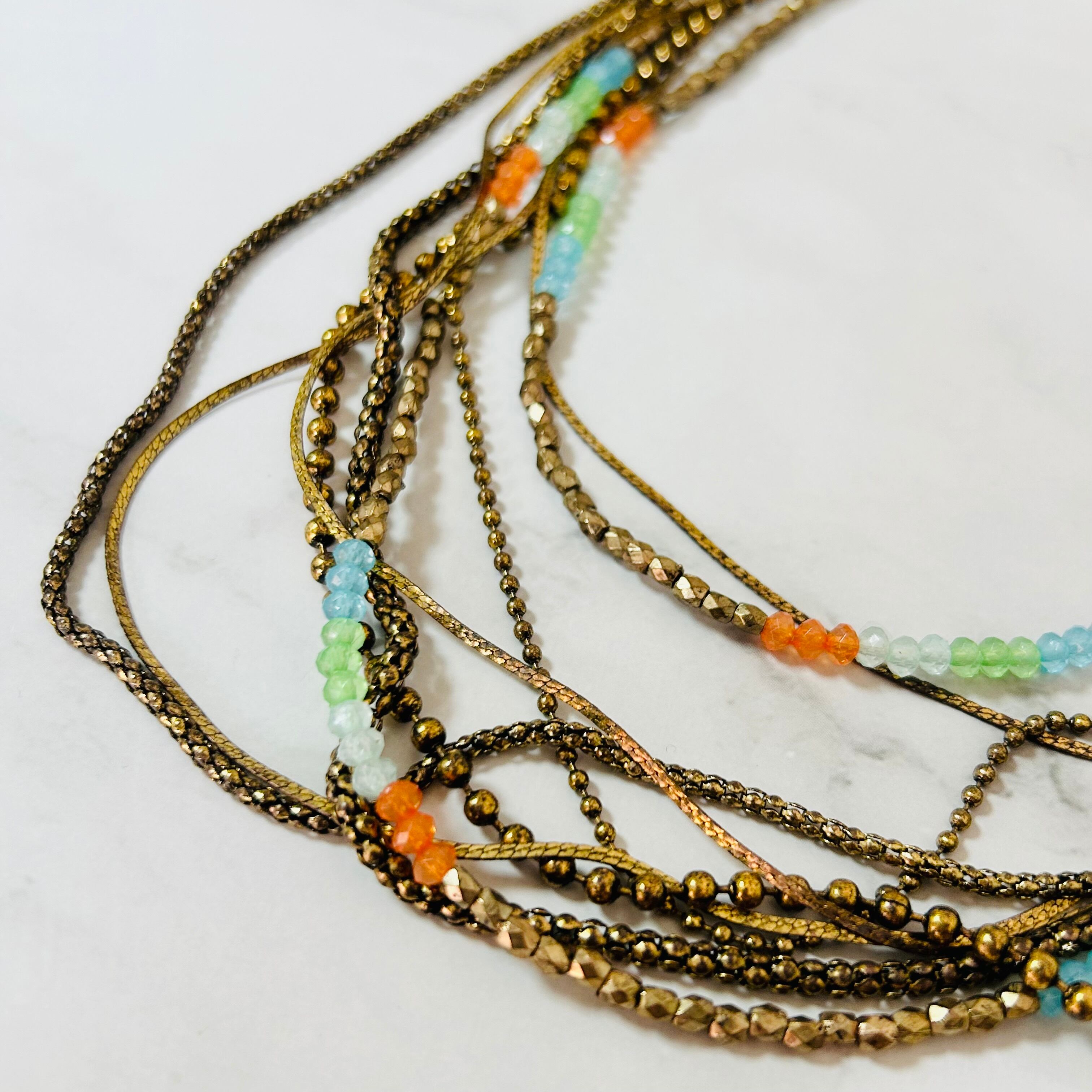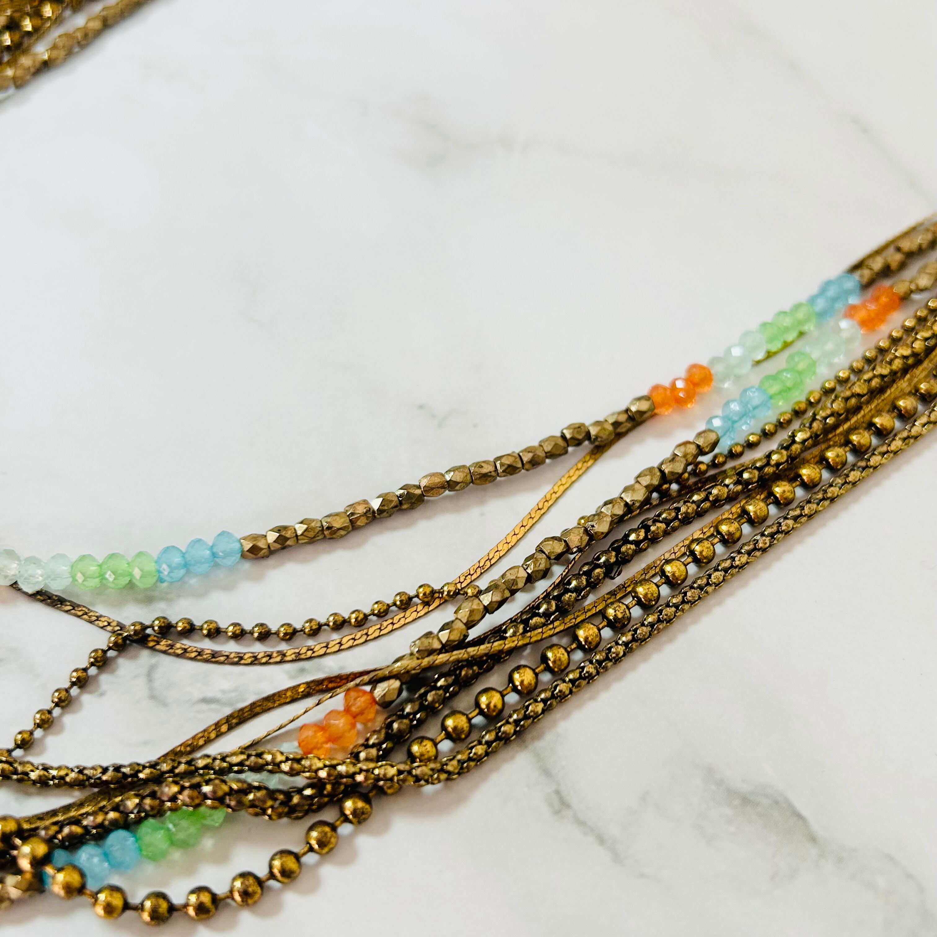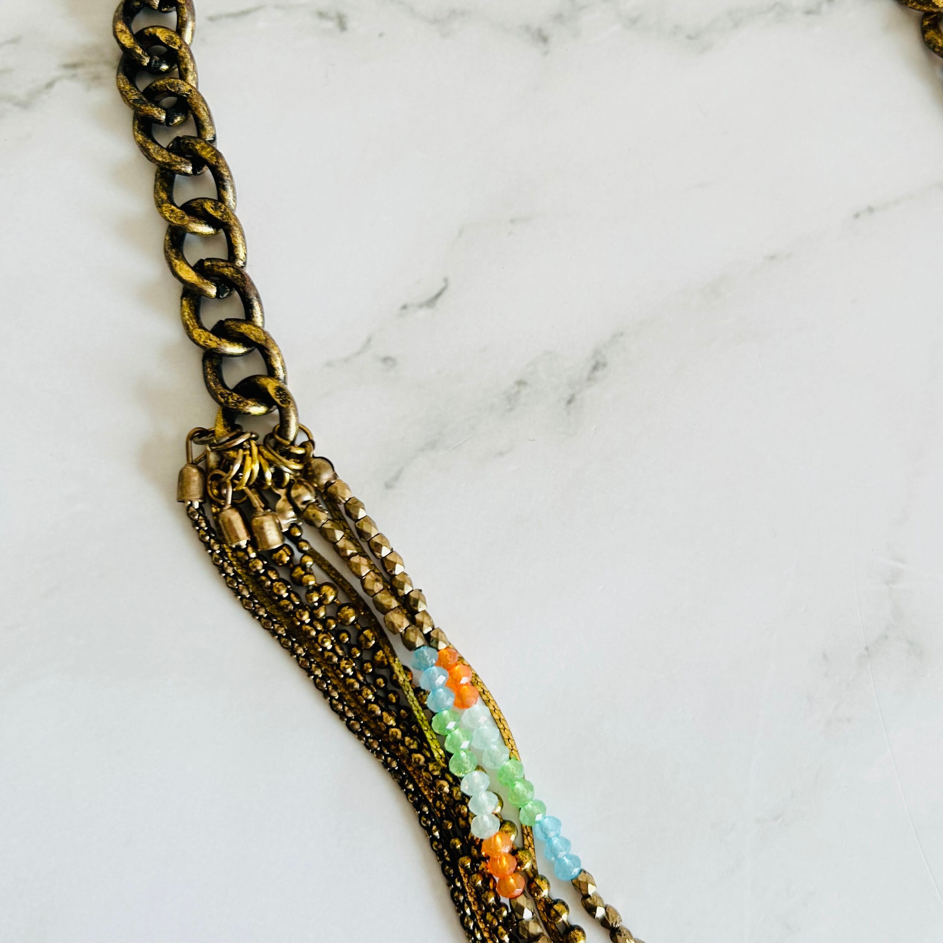 燻したようなアンティークゴールドのチェーンに、オレンジ・グリーン・ブルーのビーズがほどよい彩りを添えた、遊び心と上品さを兼ね備えたロングネックレス。