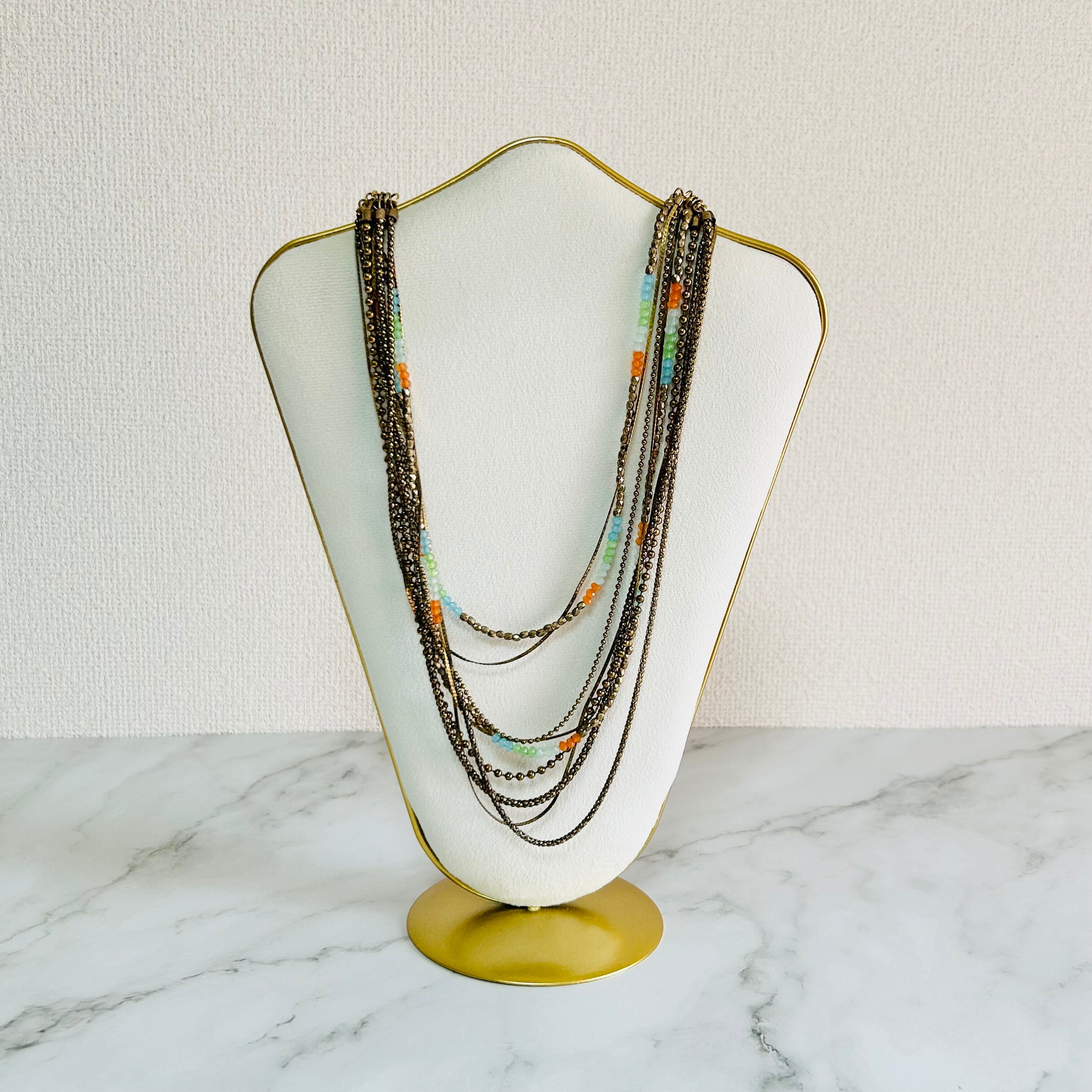 アンティーク調のチェーンにカラービーズがアクセントとなり、重なり合うデザインのロングネックレスです。