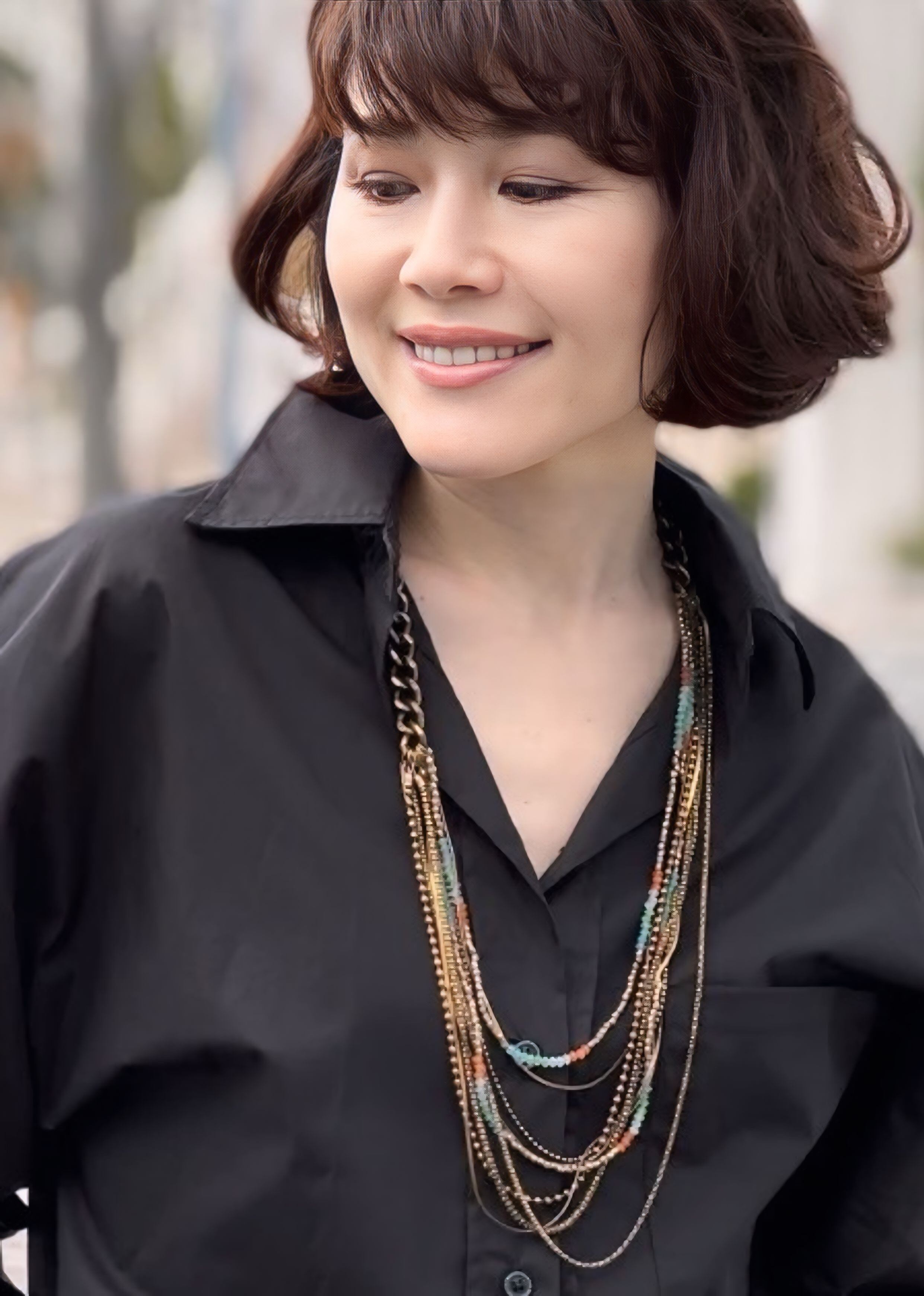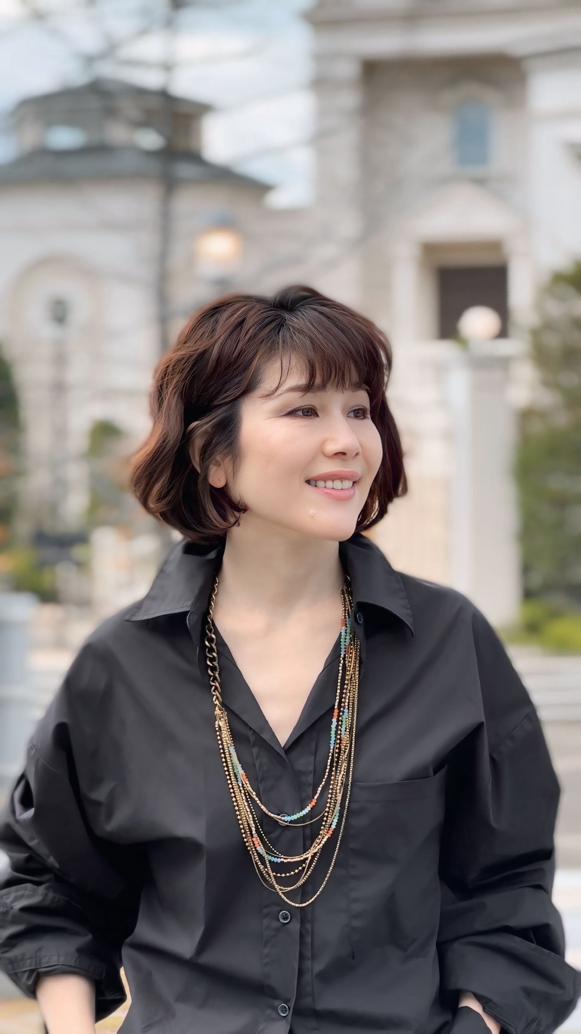 動きにあわせてゆれるチェーンのレイヤードが、コーディネートに抜け感と華やかさをプラスしてくれます。