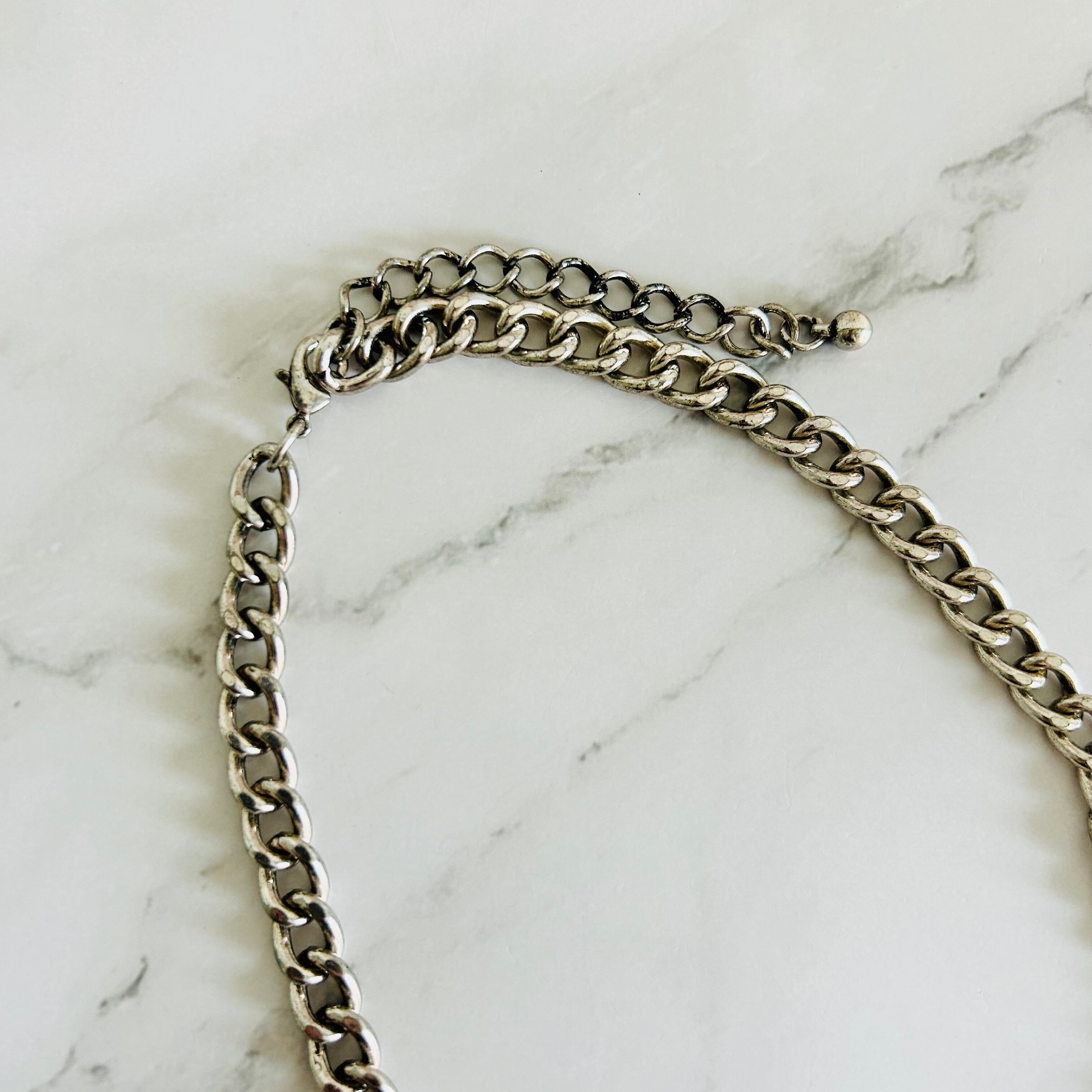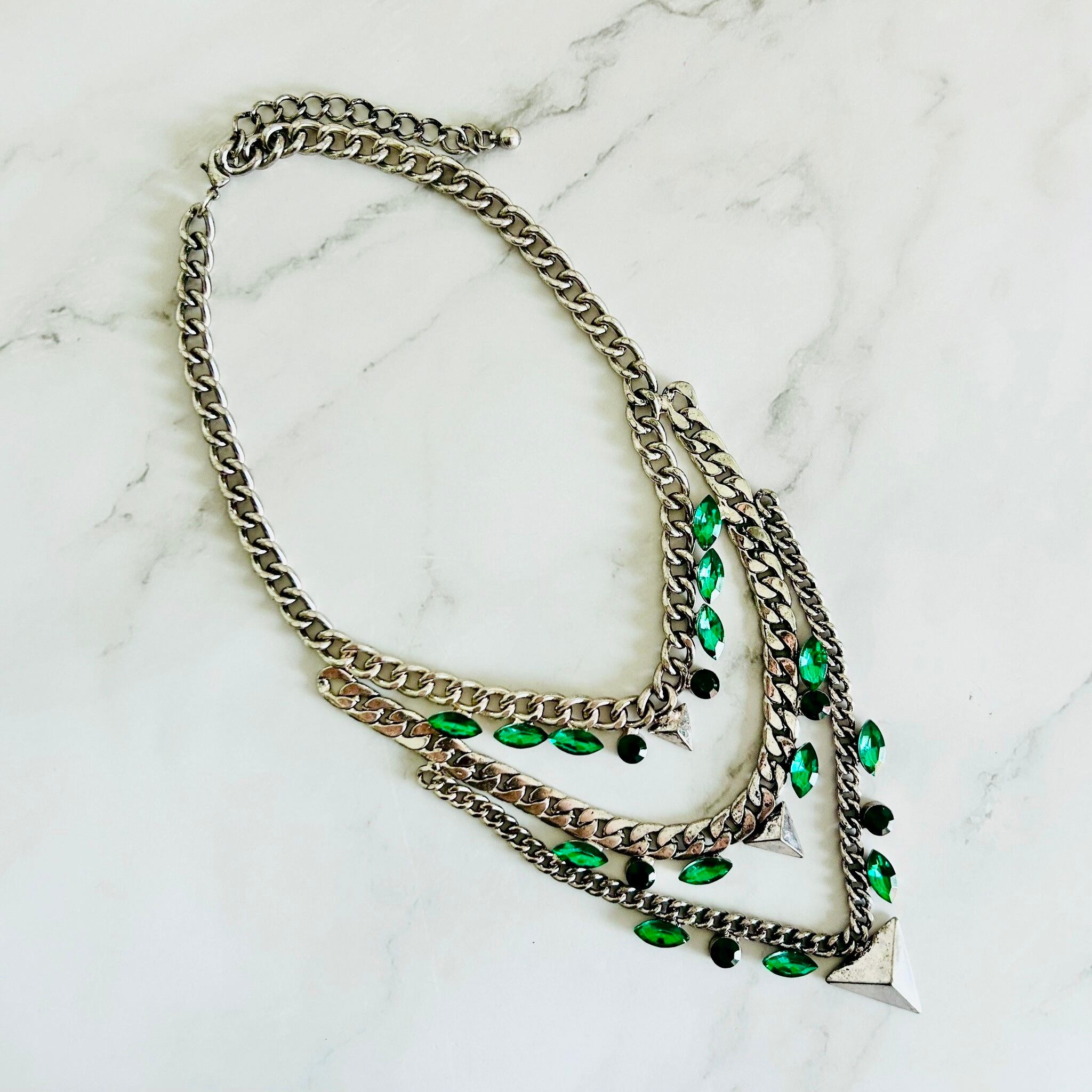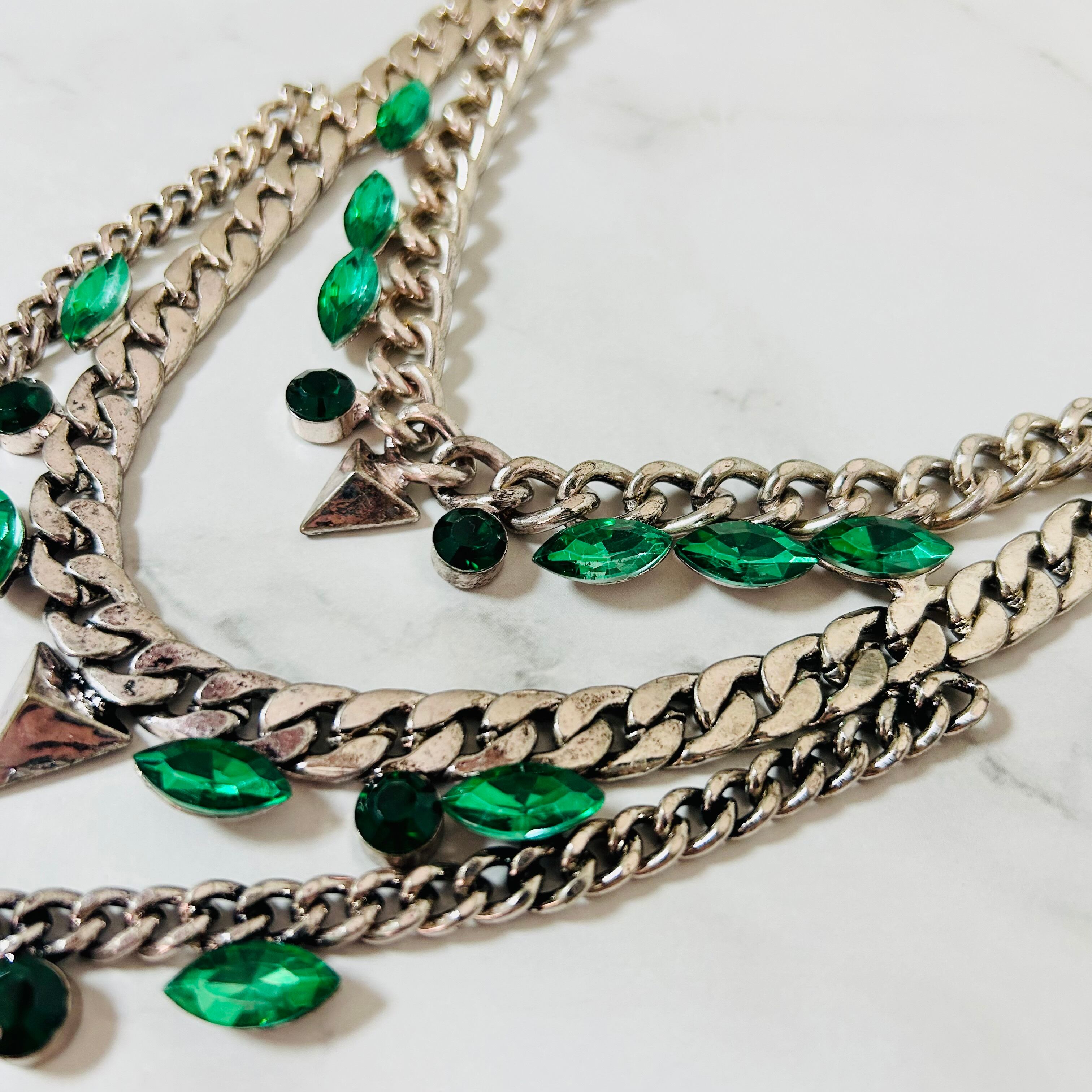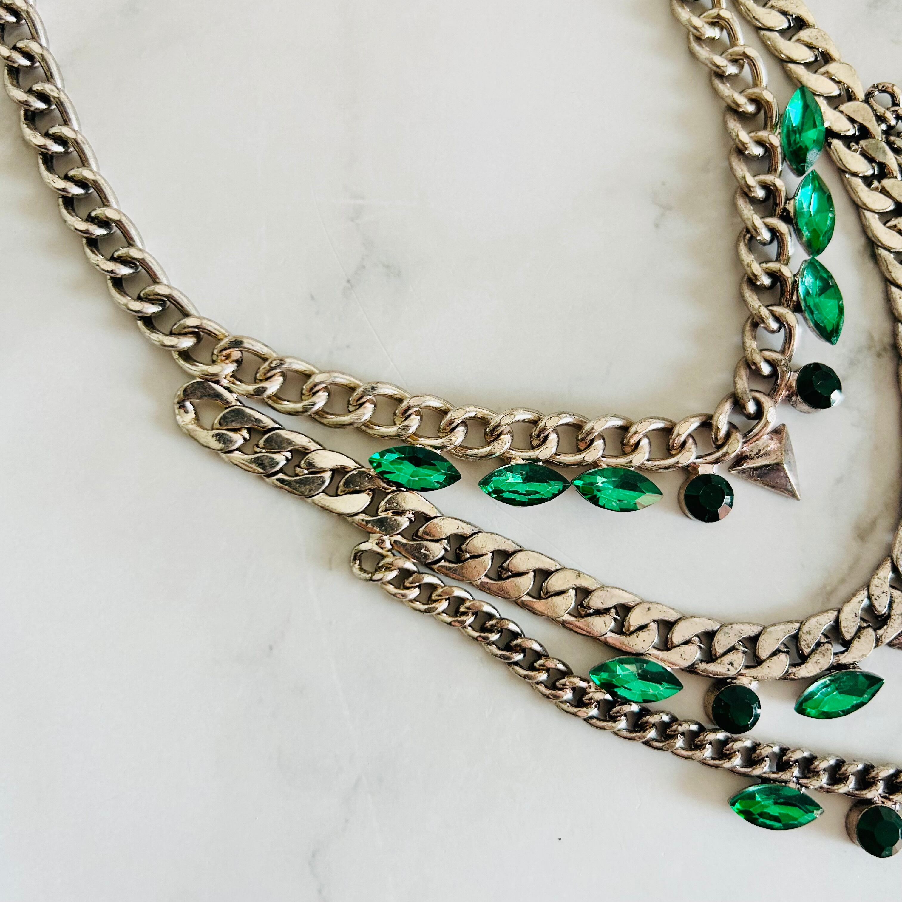 重厚感のあるアンティークシルバーカラーのチャンキーチェーンに深いグリーンのクリスタルビジューを合わせた、モード感漂うデザインのネックレスです。