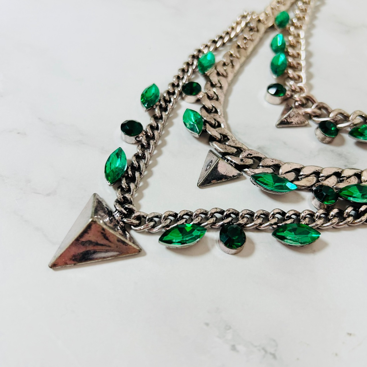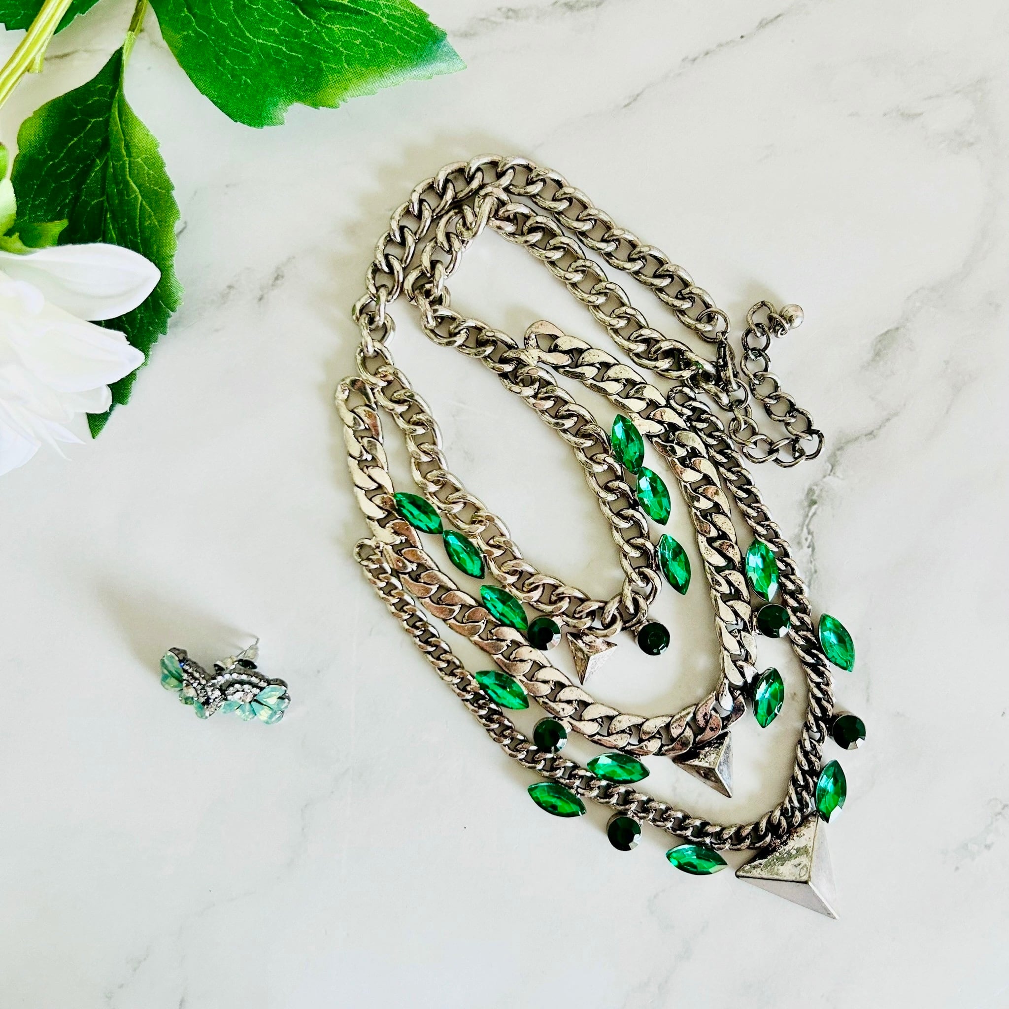 存在感のあるシルバーチェーンに、鮮やかなエメラルドグリーンのビジューが映える、クールな印象がワンランク上のおしゃれを演出します☆