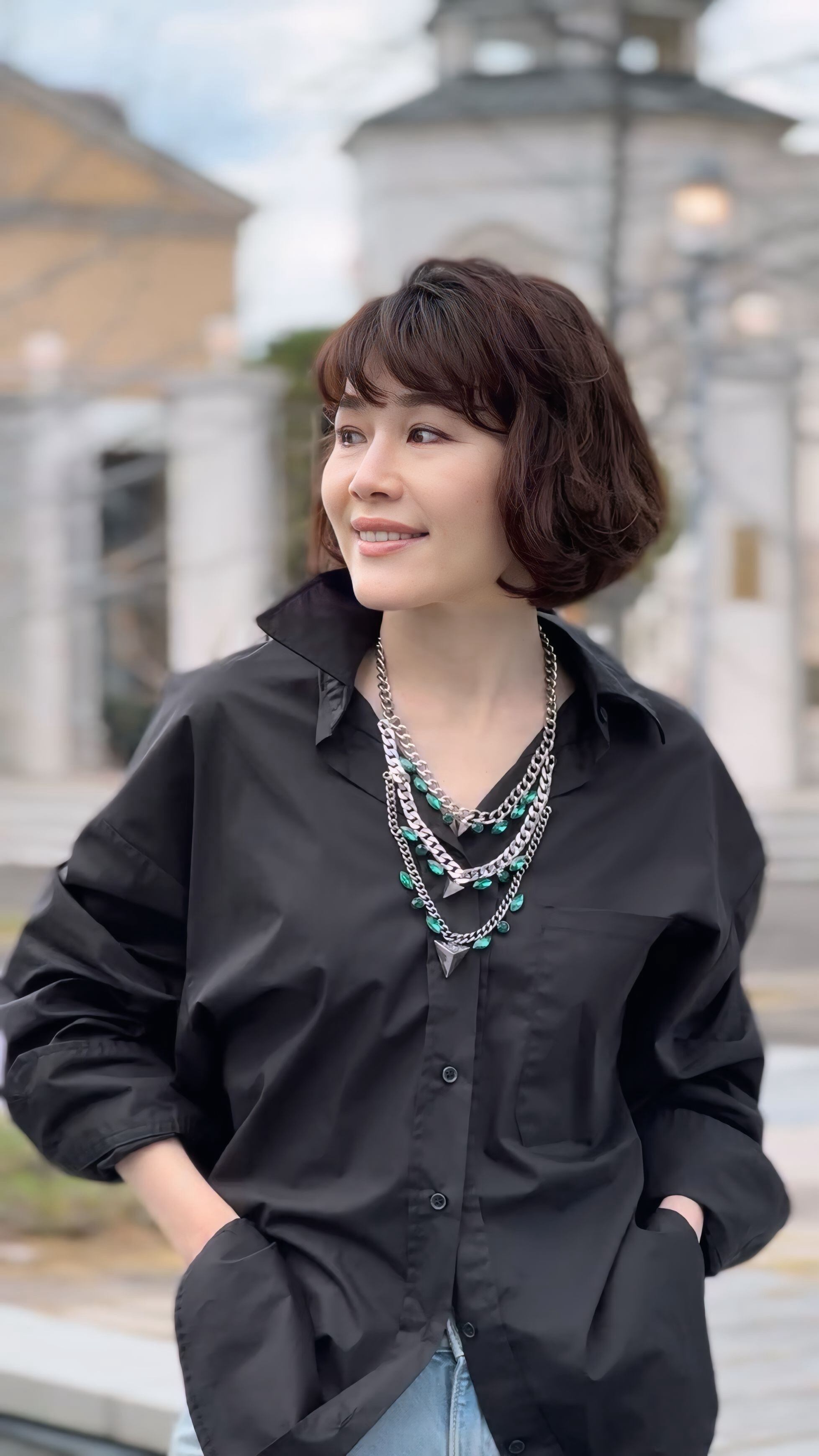 Vラインを描く3連チェーンがデコルテを美しく引き立て、顔まわりにスタイリッシュな華やぎを添えてくれます。