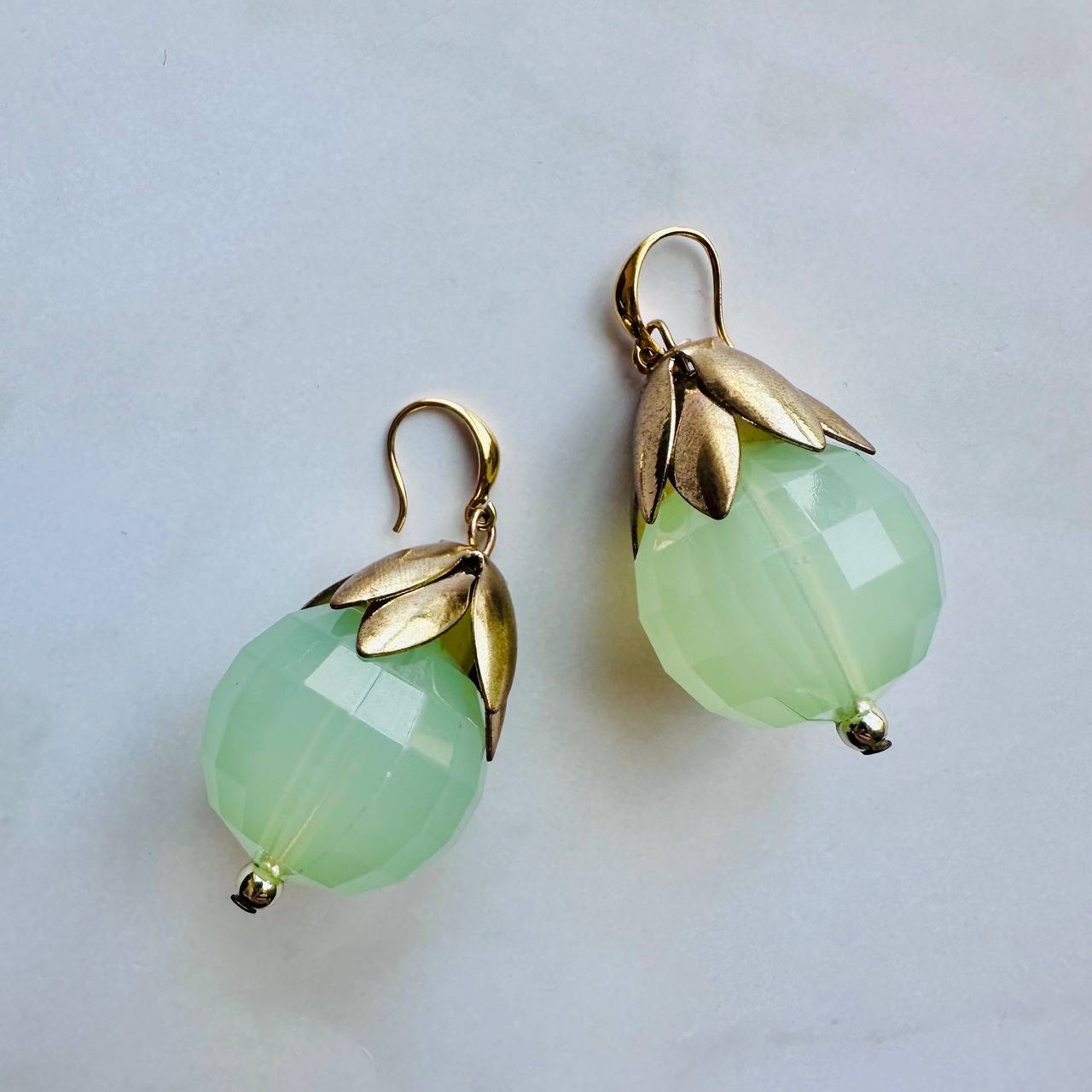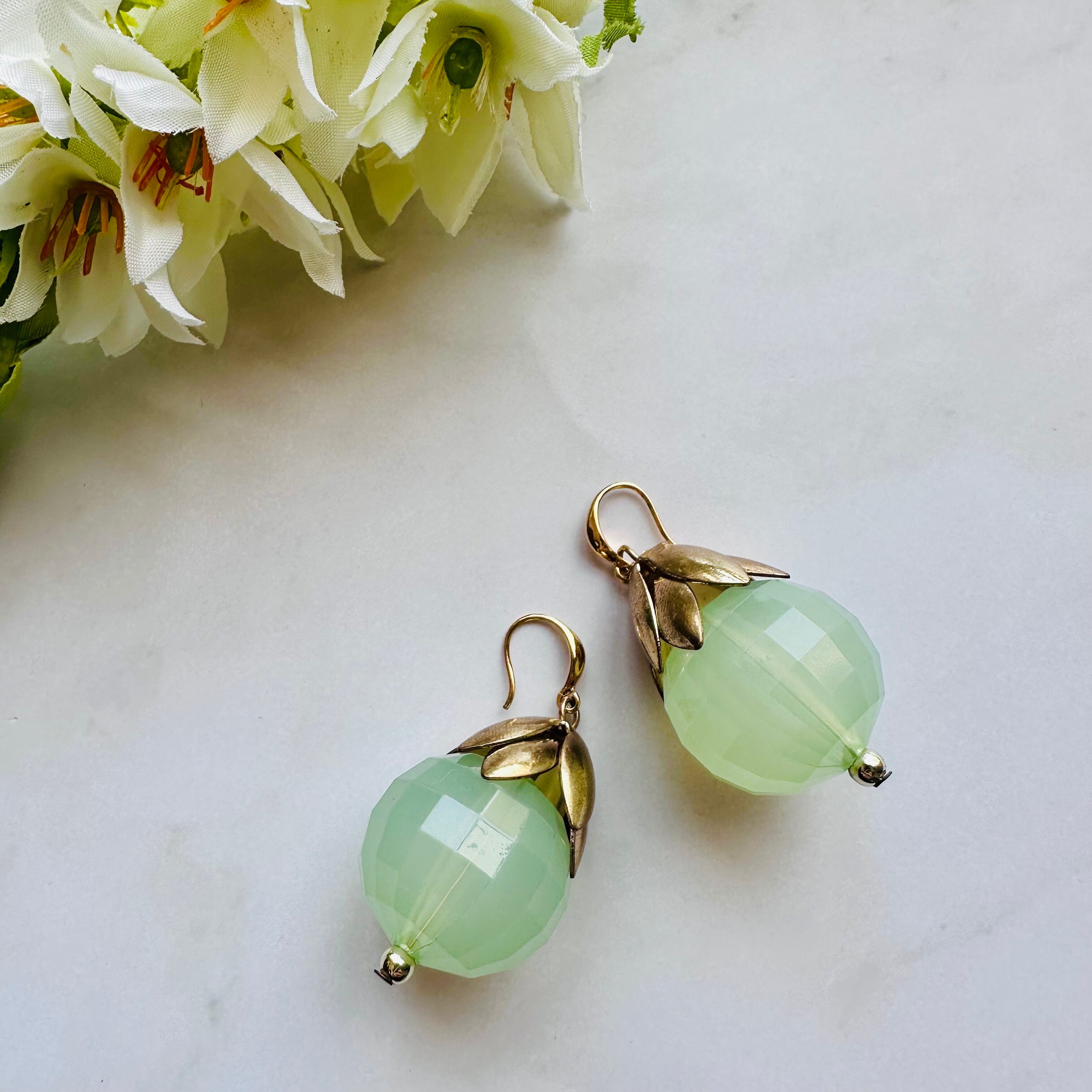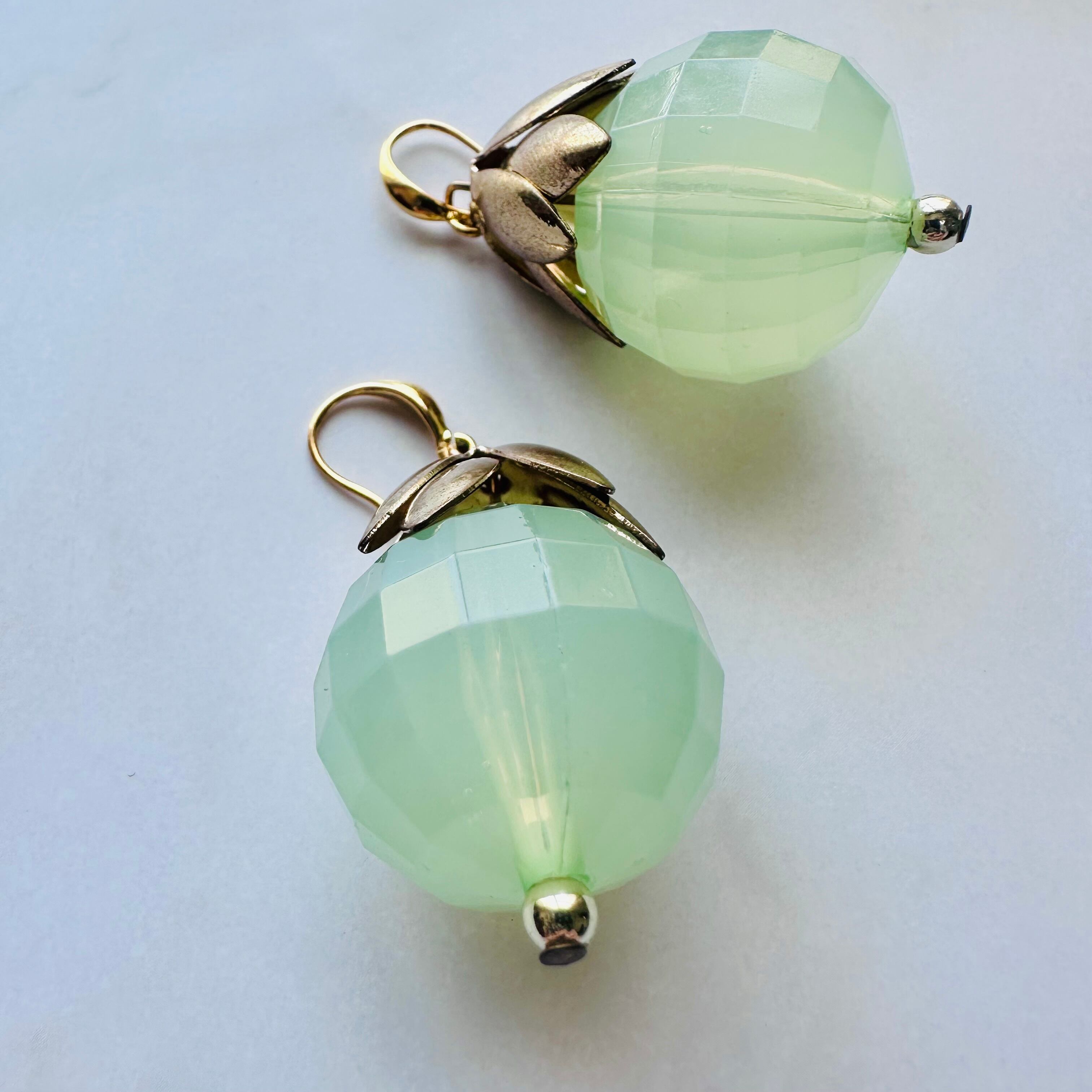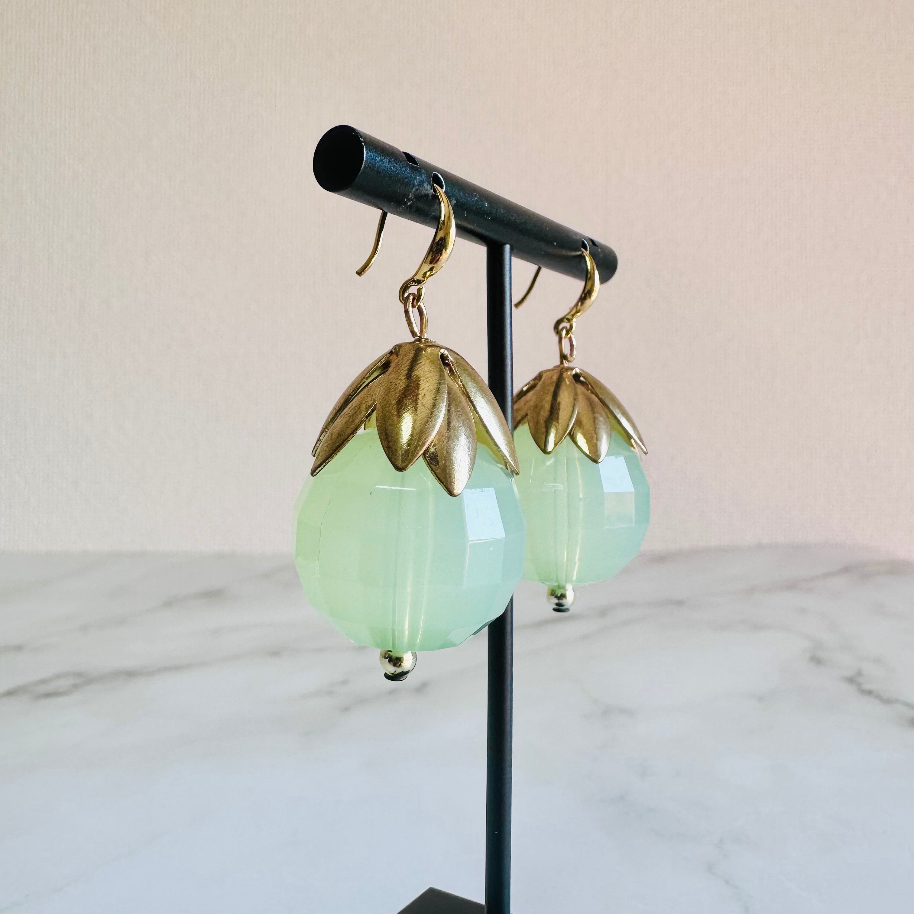 みずみずしいグリーンのアクリルボールと、アンティーク調のリーフパーツが組み合わさった、ナチュラルで上品なデザインです。