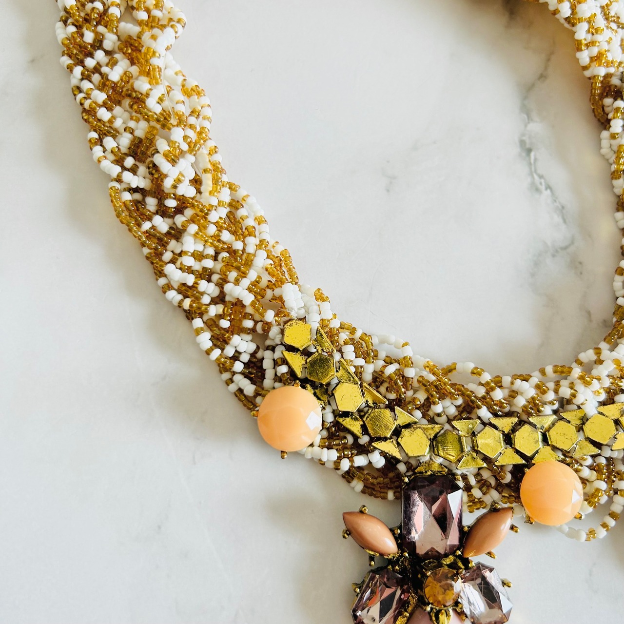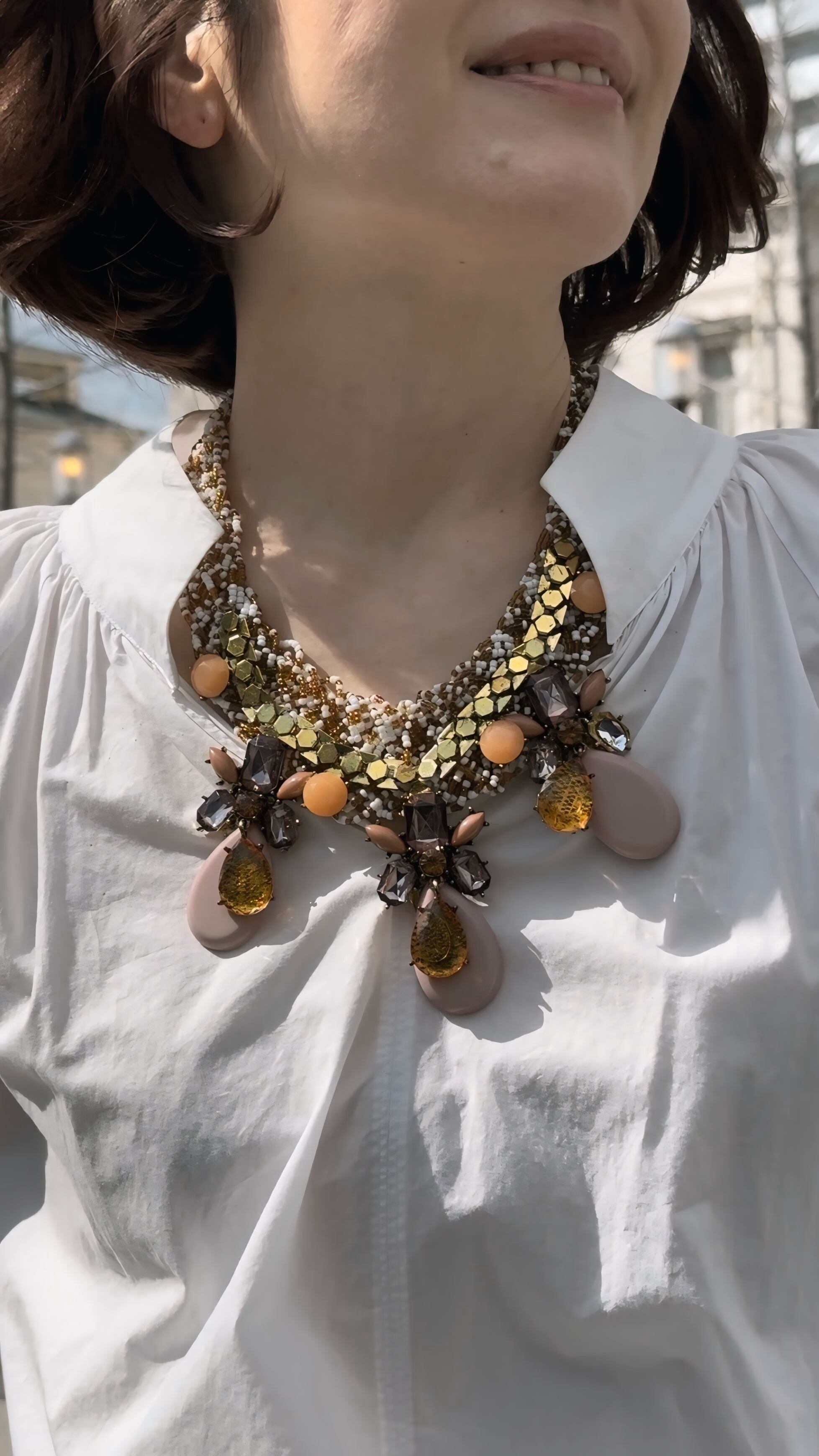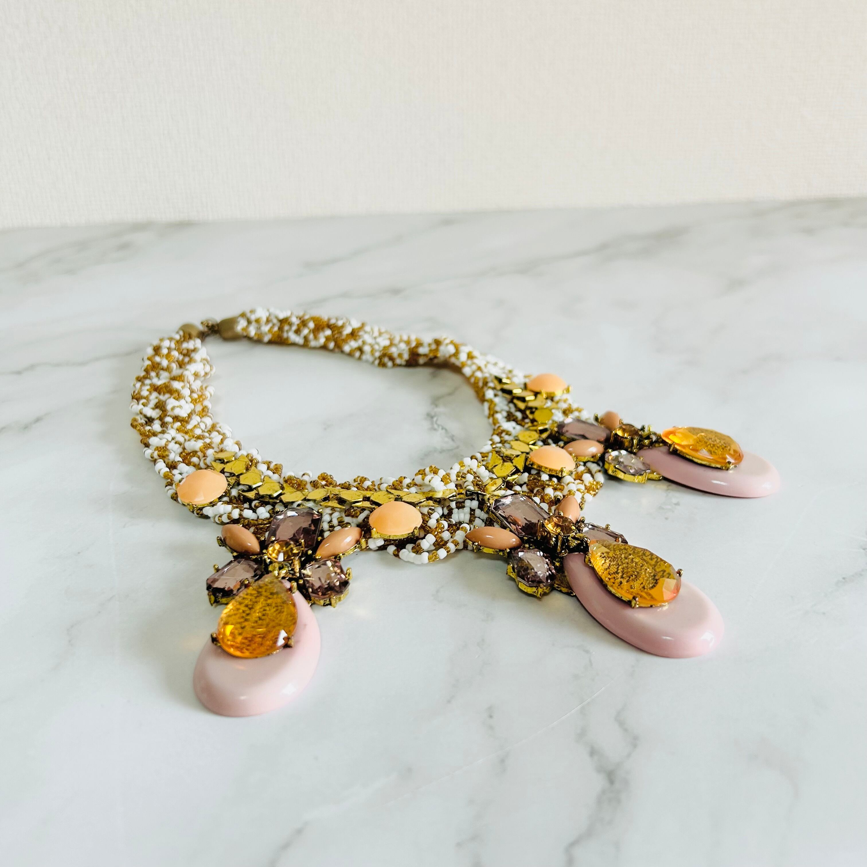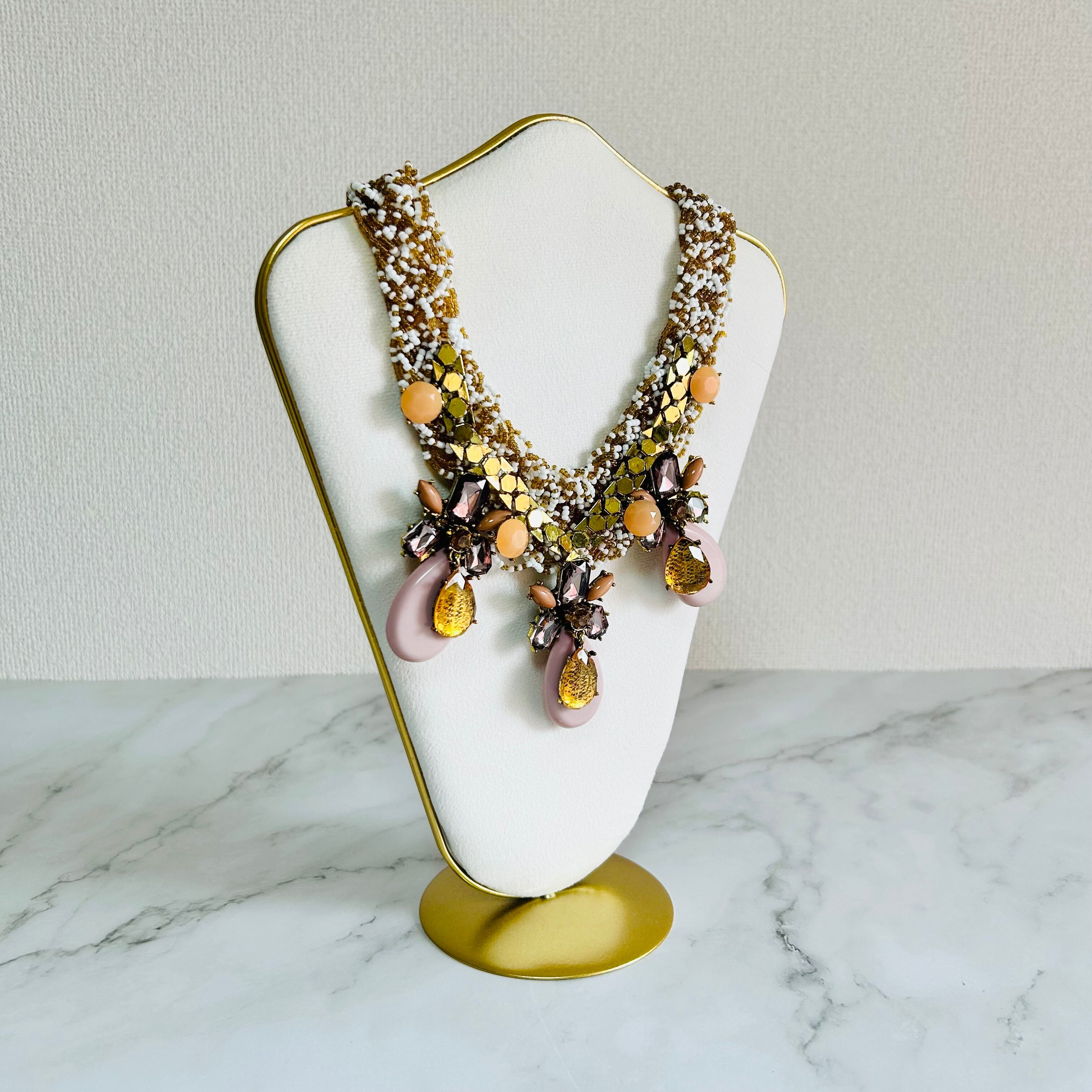 編み上げたホワイトとゴールドのビーズにカラフルなビジューを取り付け、アンティークゴールドと組み合わせたデザインのネックレスです。