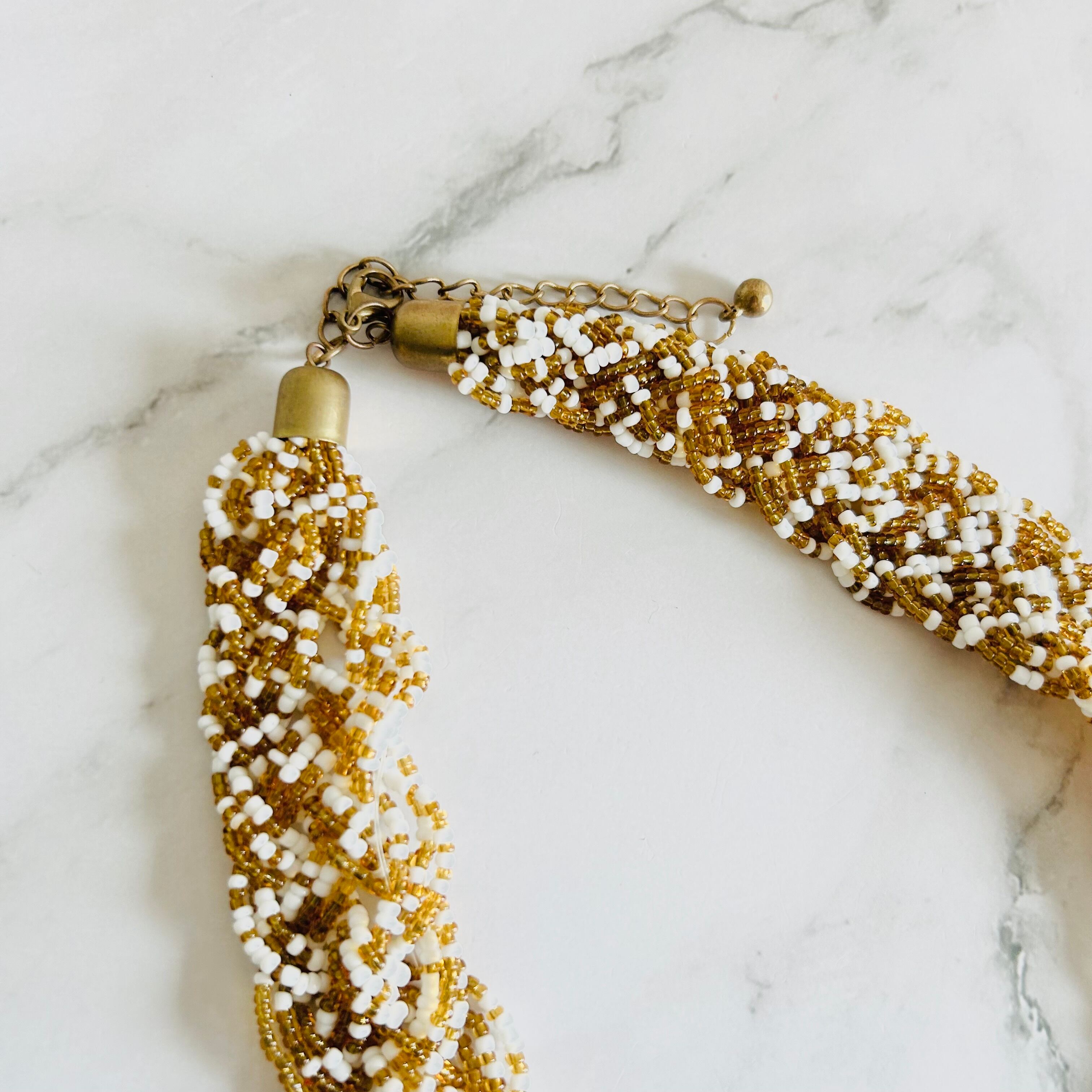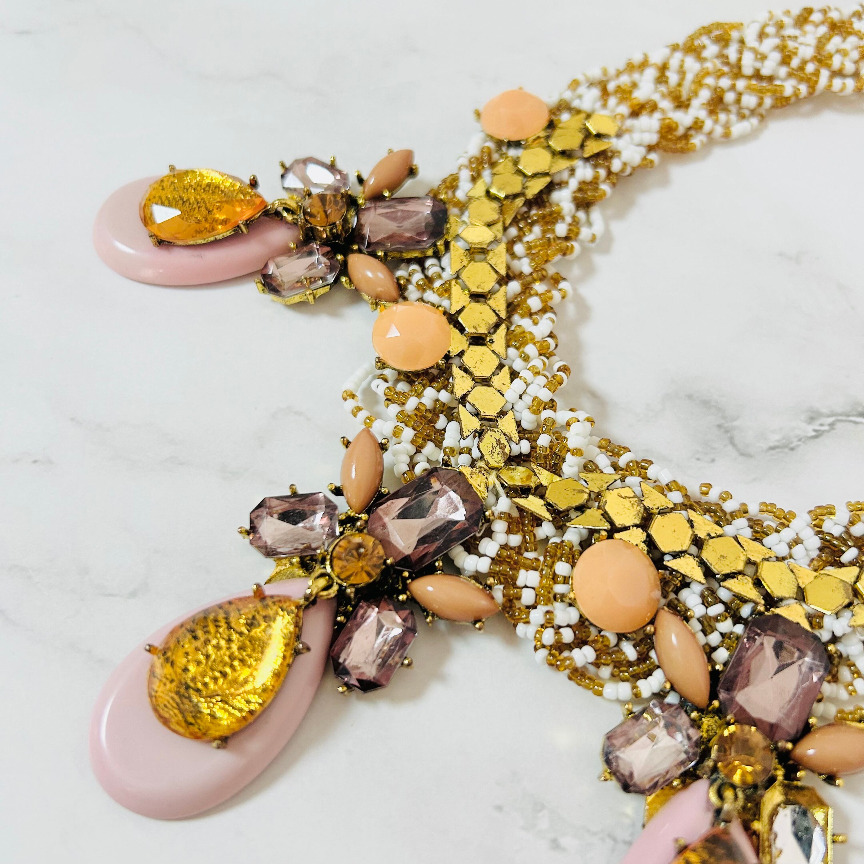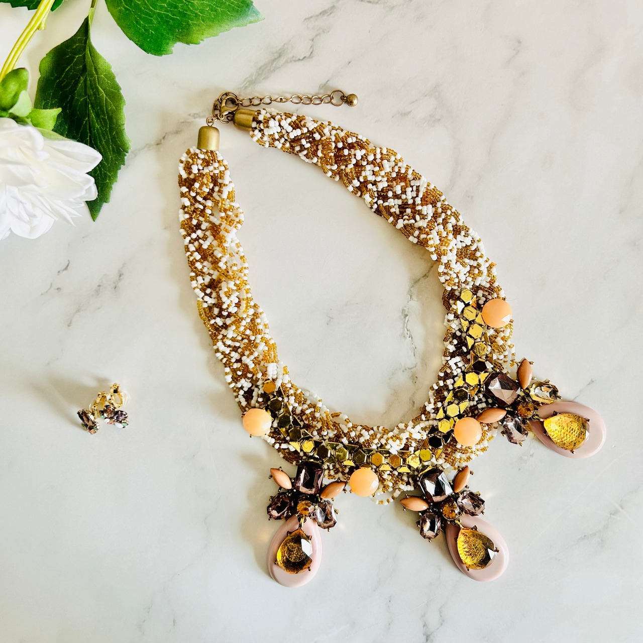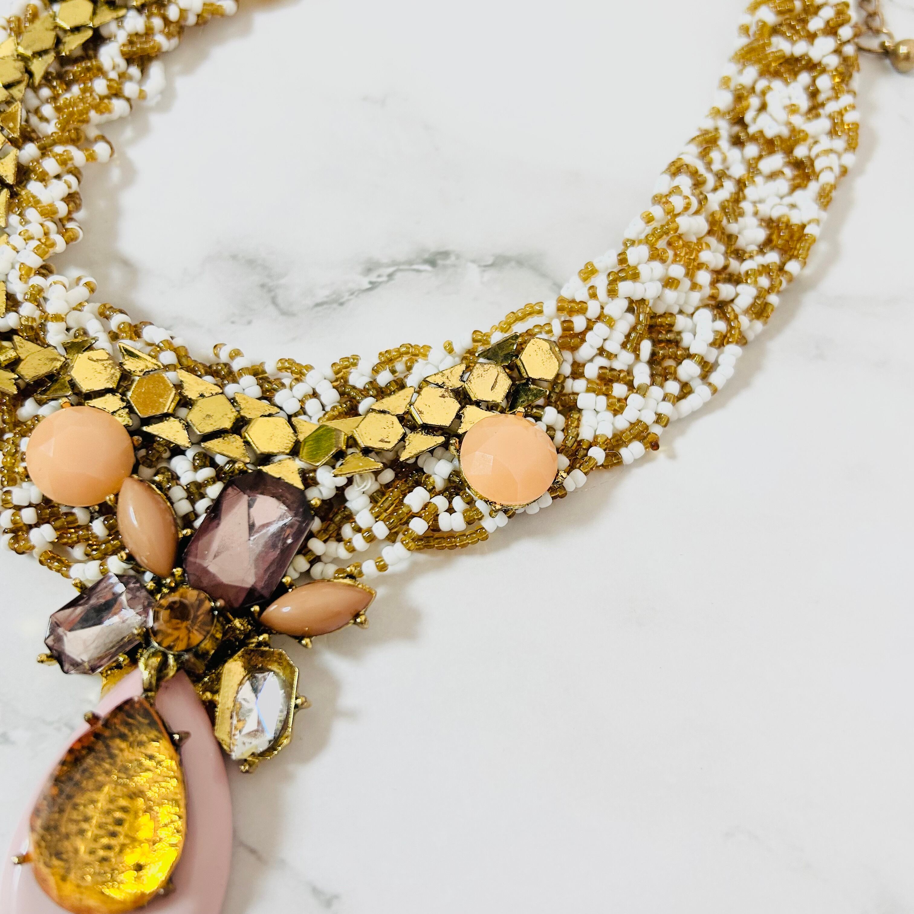 編み上げたホワイトとゴールドのビーズにカラフルなビジューを取り付け、アンティークゴールドと組み合わせたデザインのネックレスです。