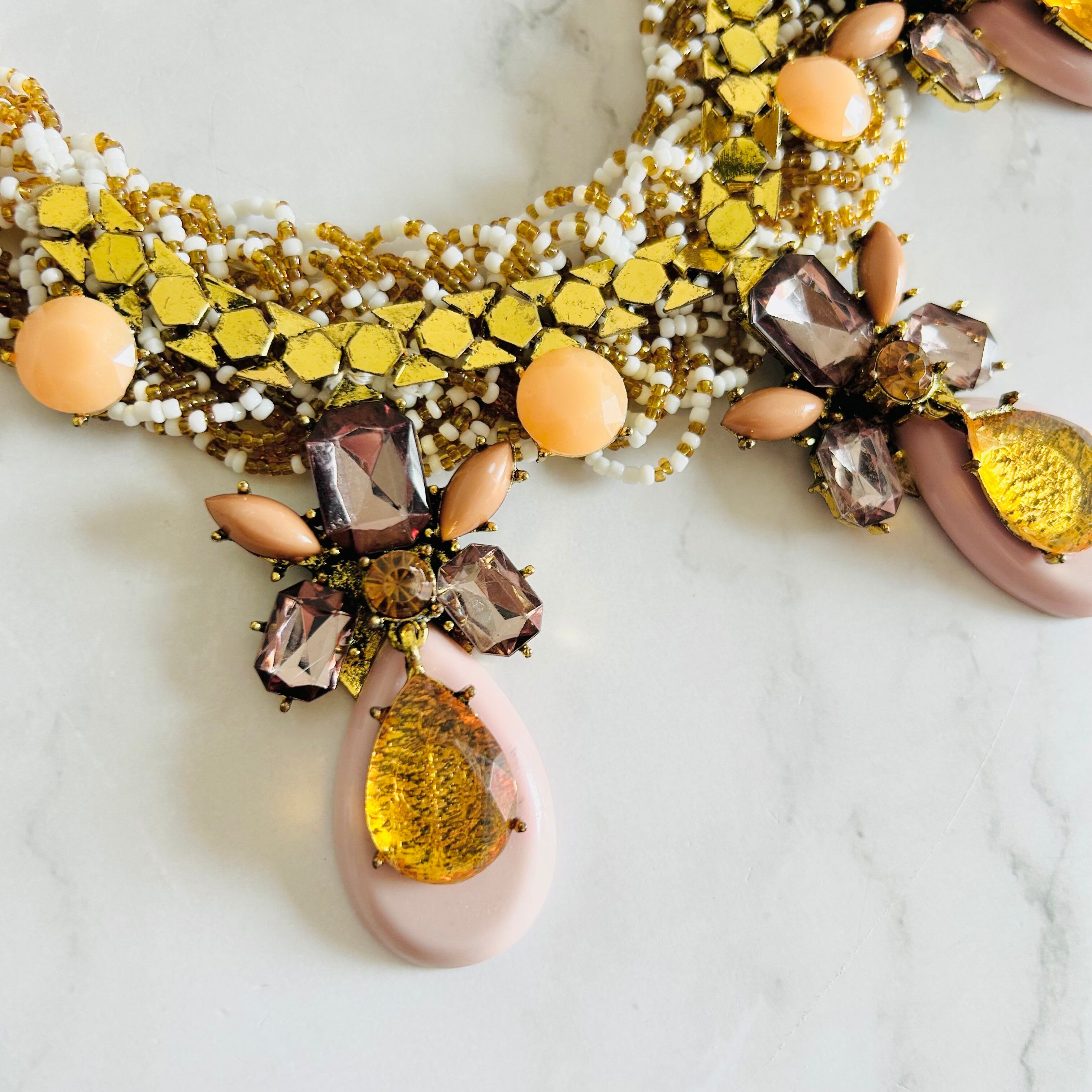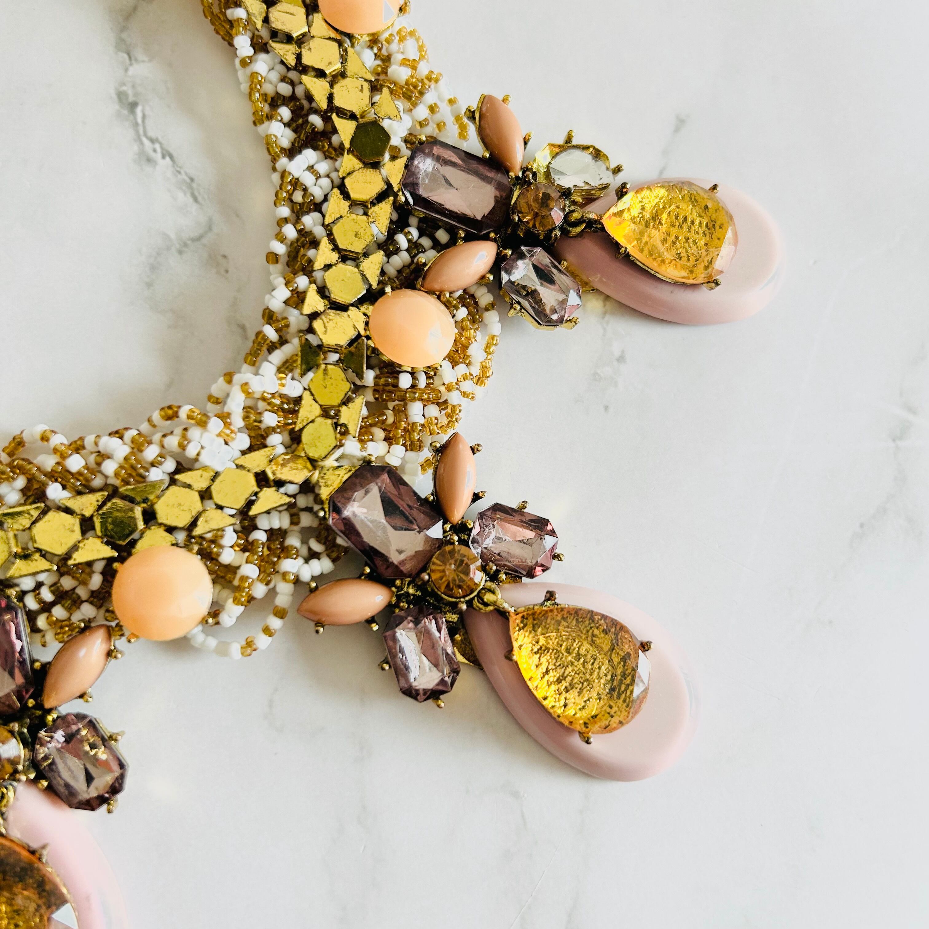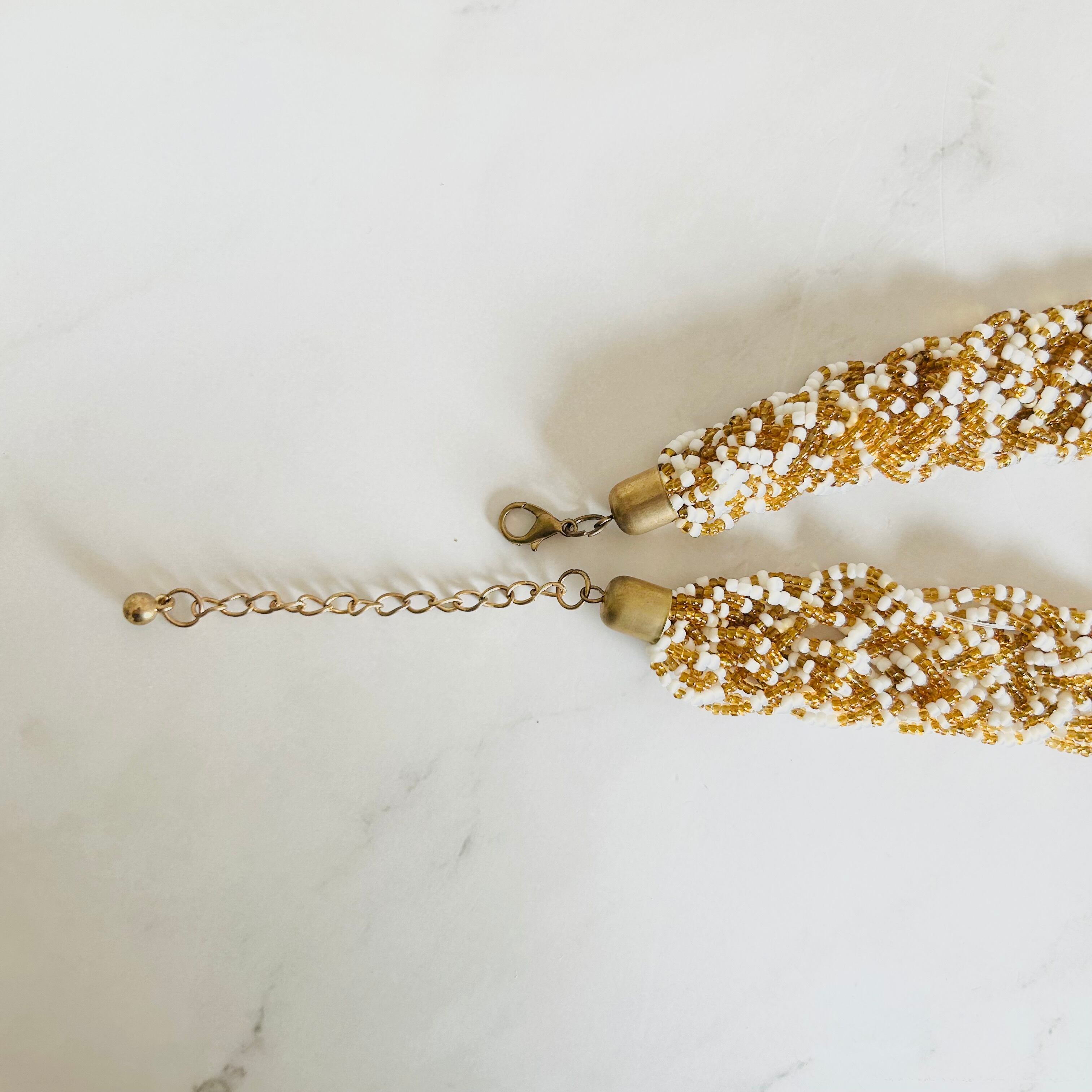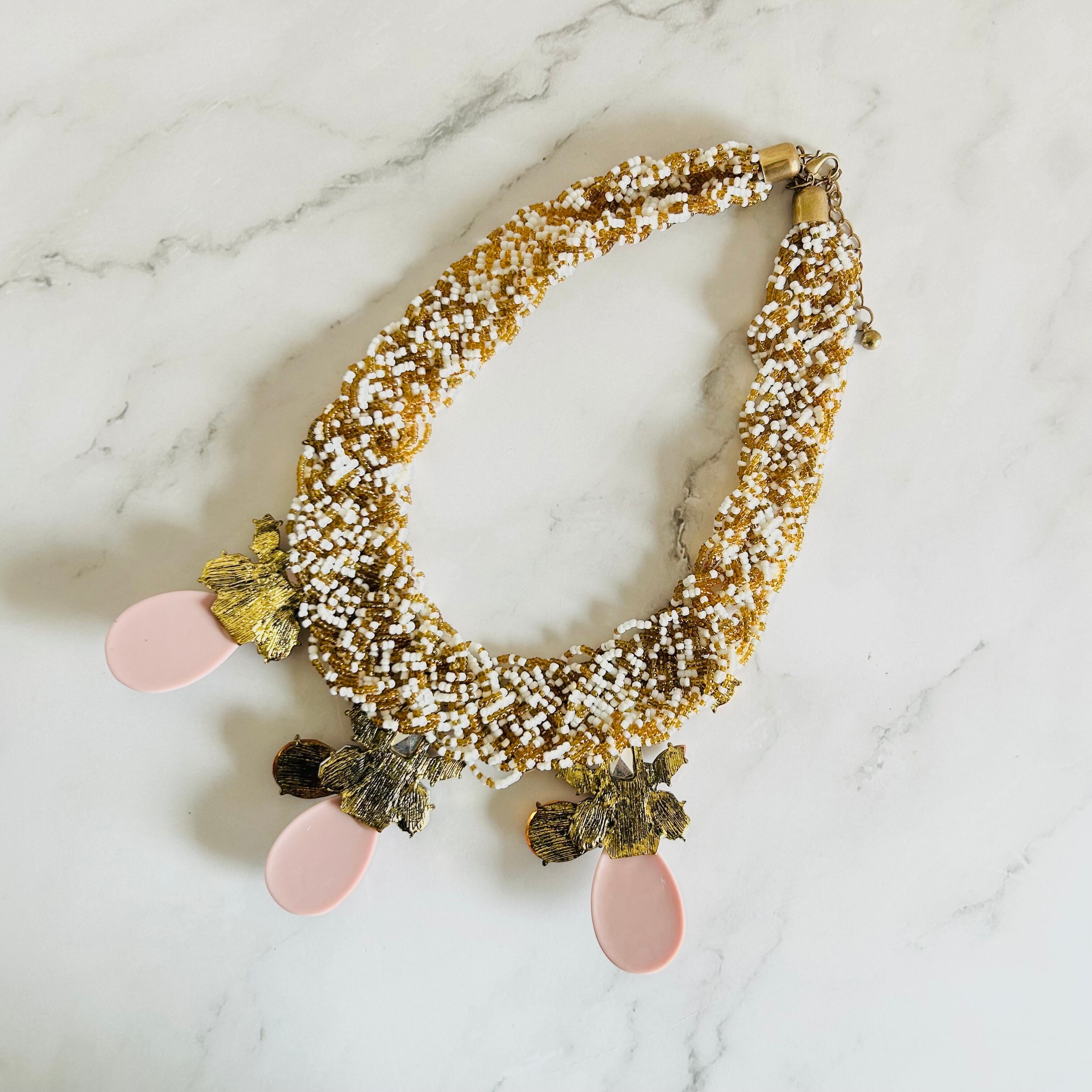 編み上げたホワイトとゴールドのビーズにカラフルなビジューを取り付け、アンティークゴールドと組み合わせたデザインのネックレスです。