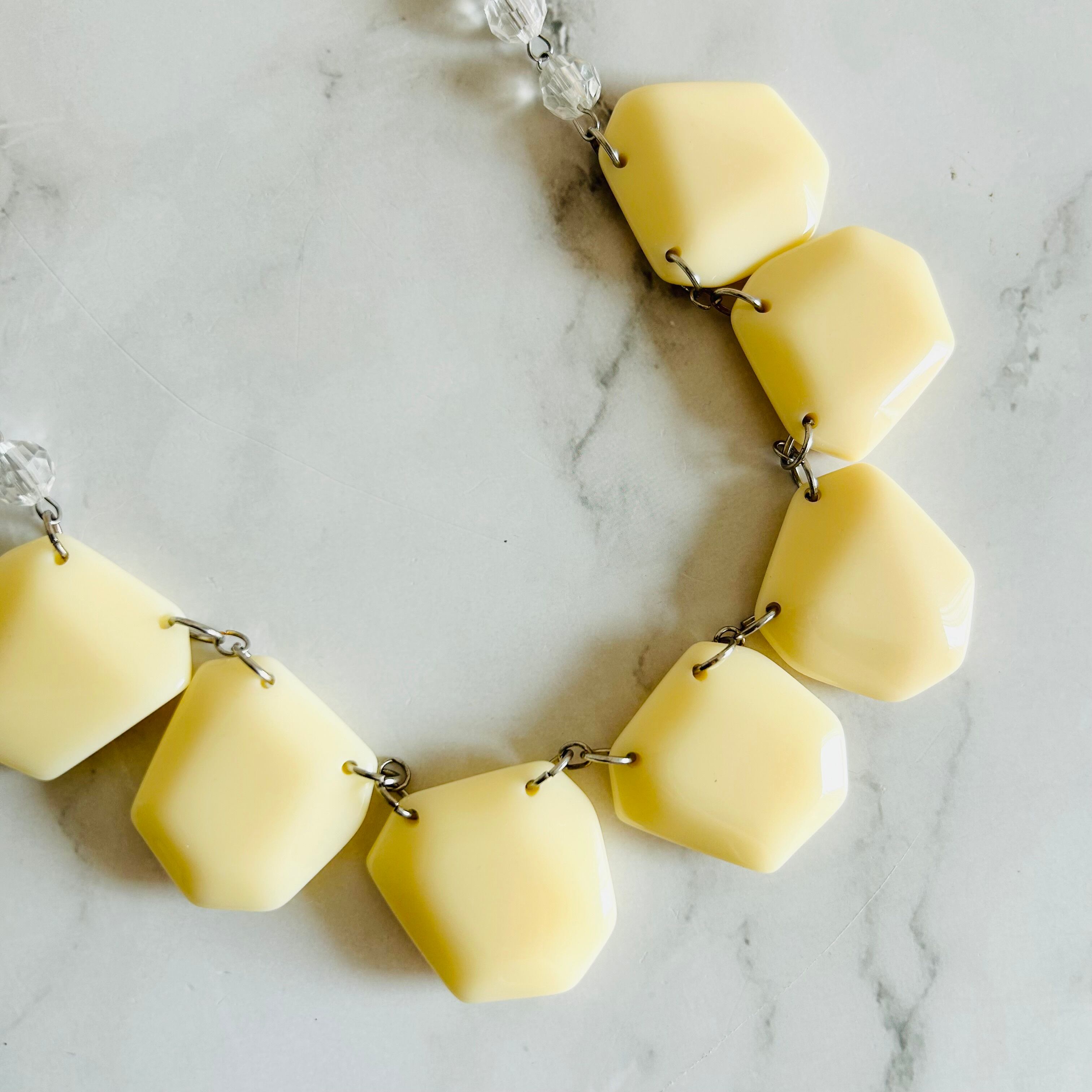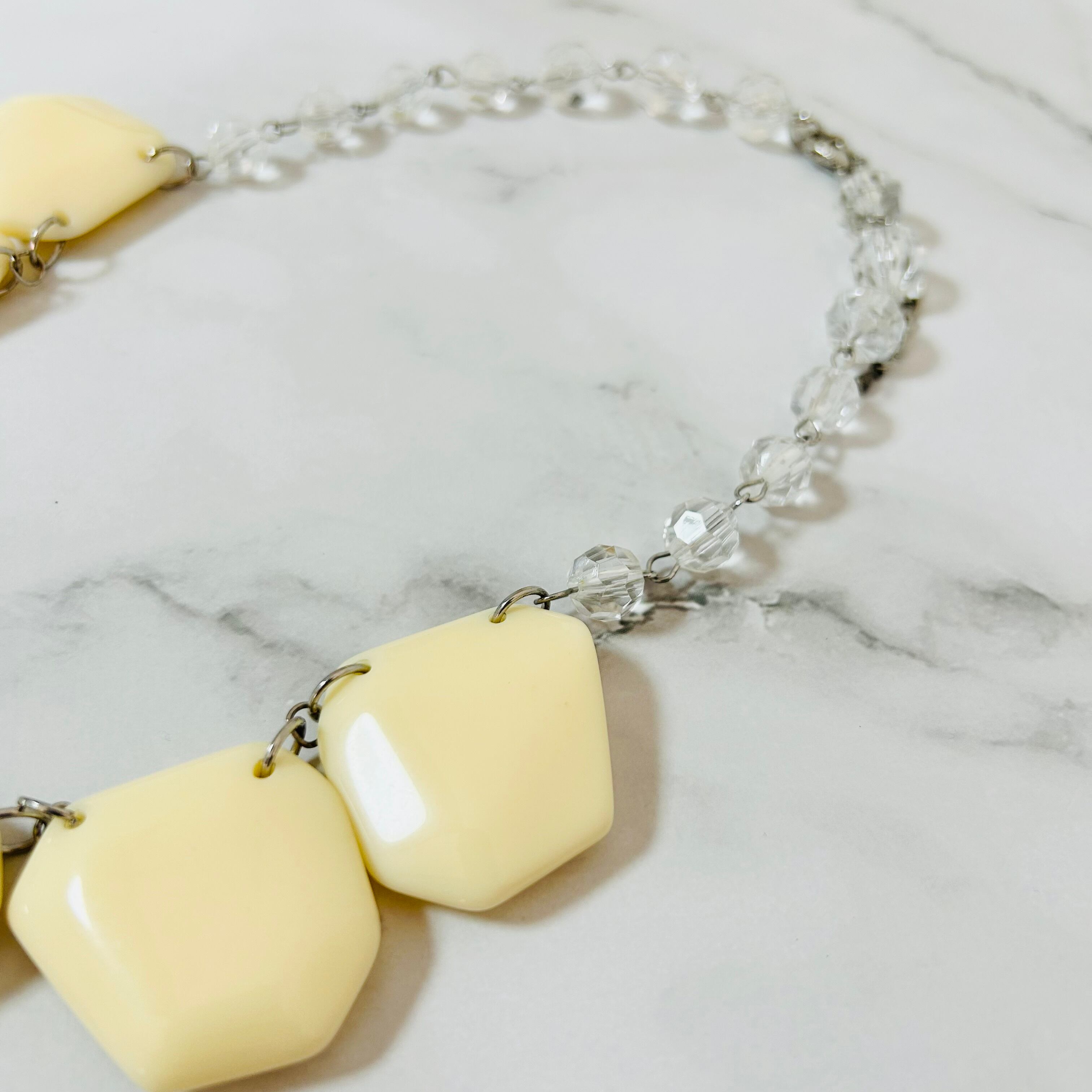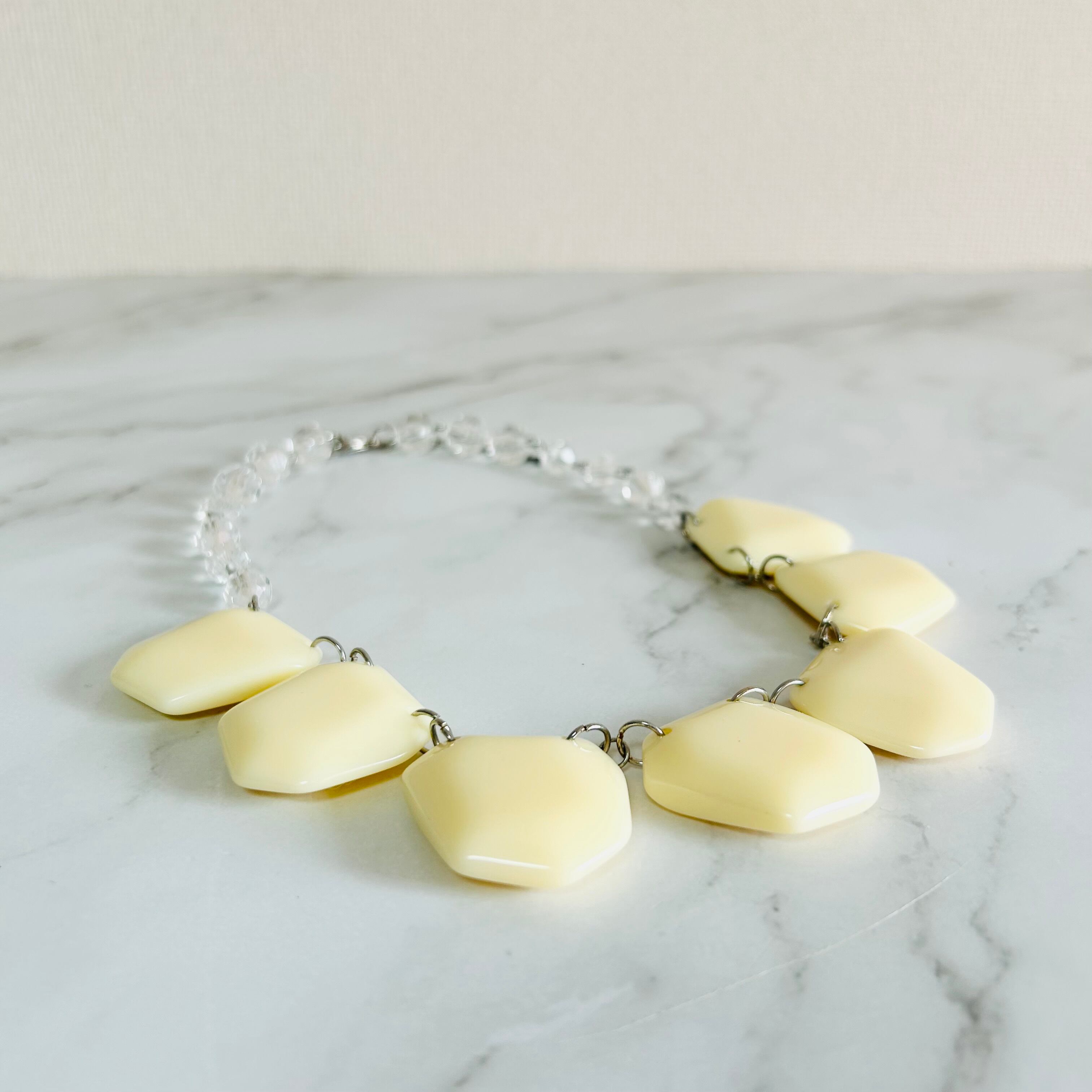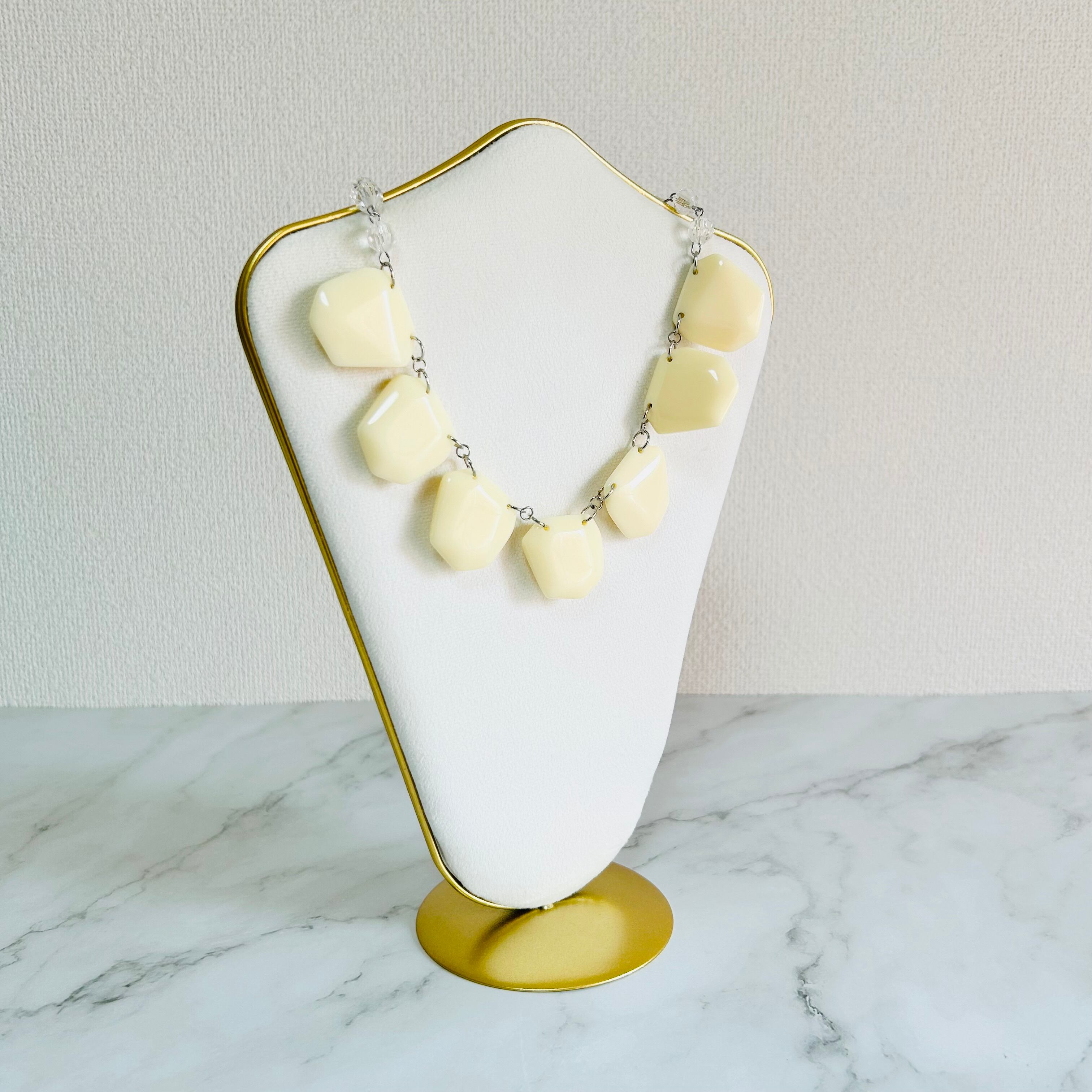 柔らかなバニラカラーの幾何学的なアクリルパーツが並ぶ、おしゃれで洗練されたデザインのネックレスです。
