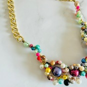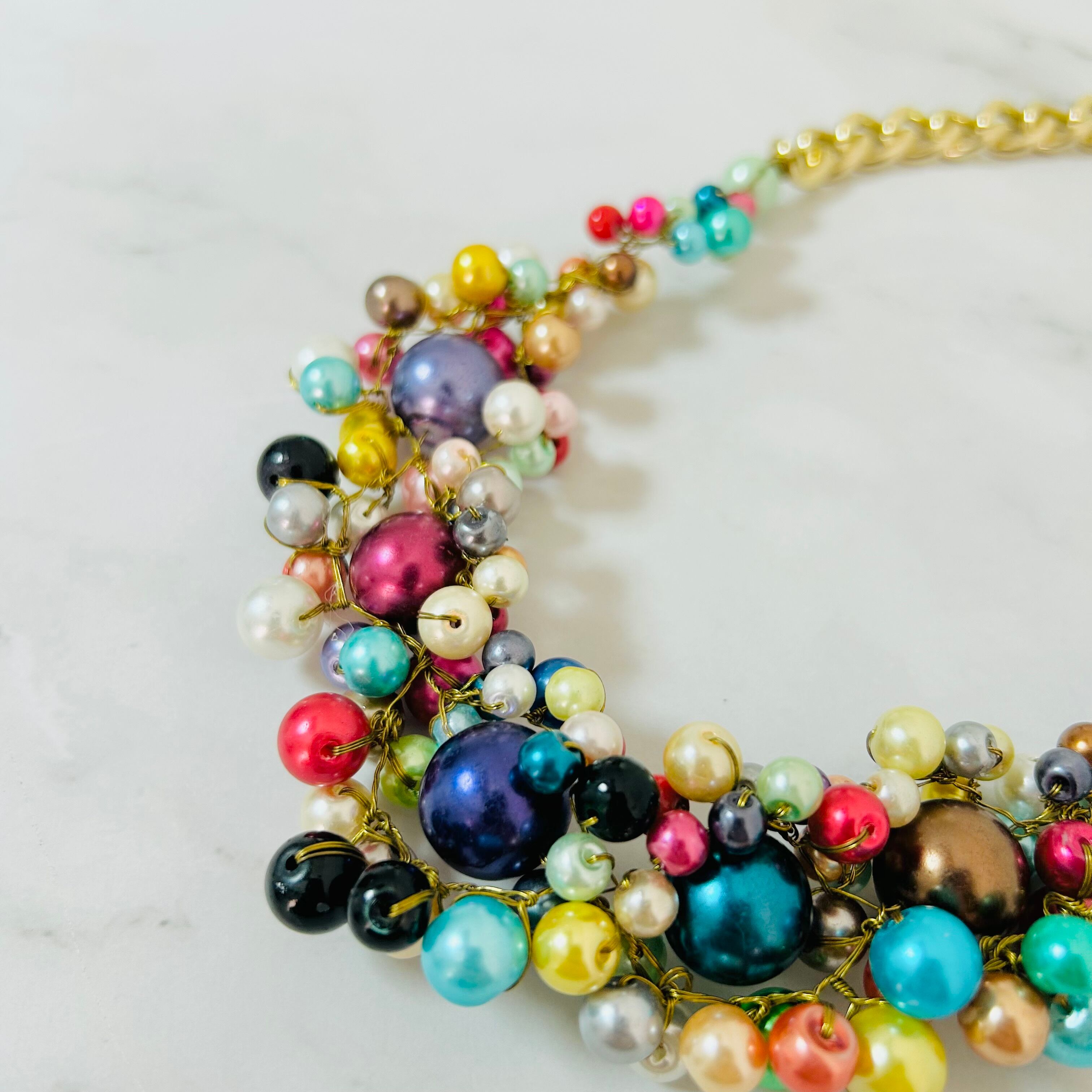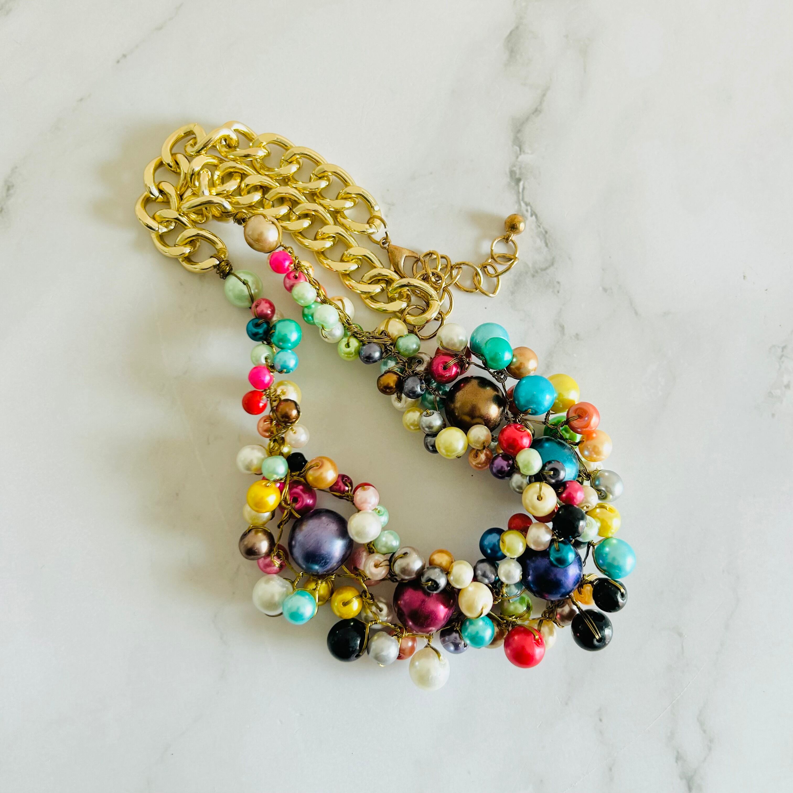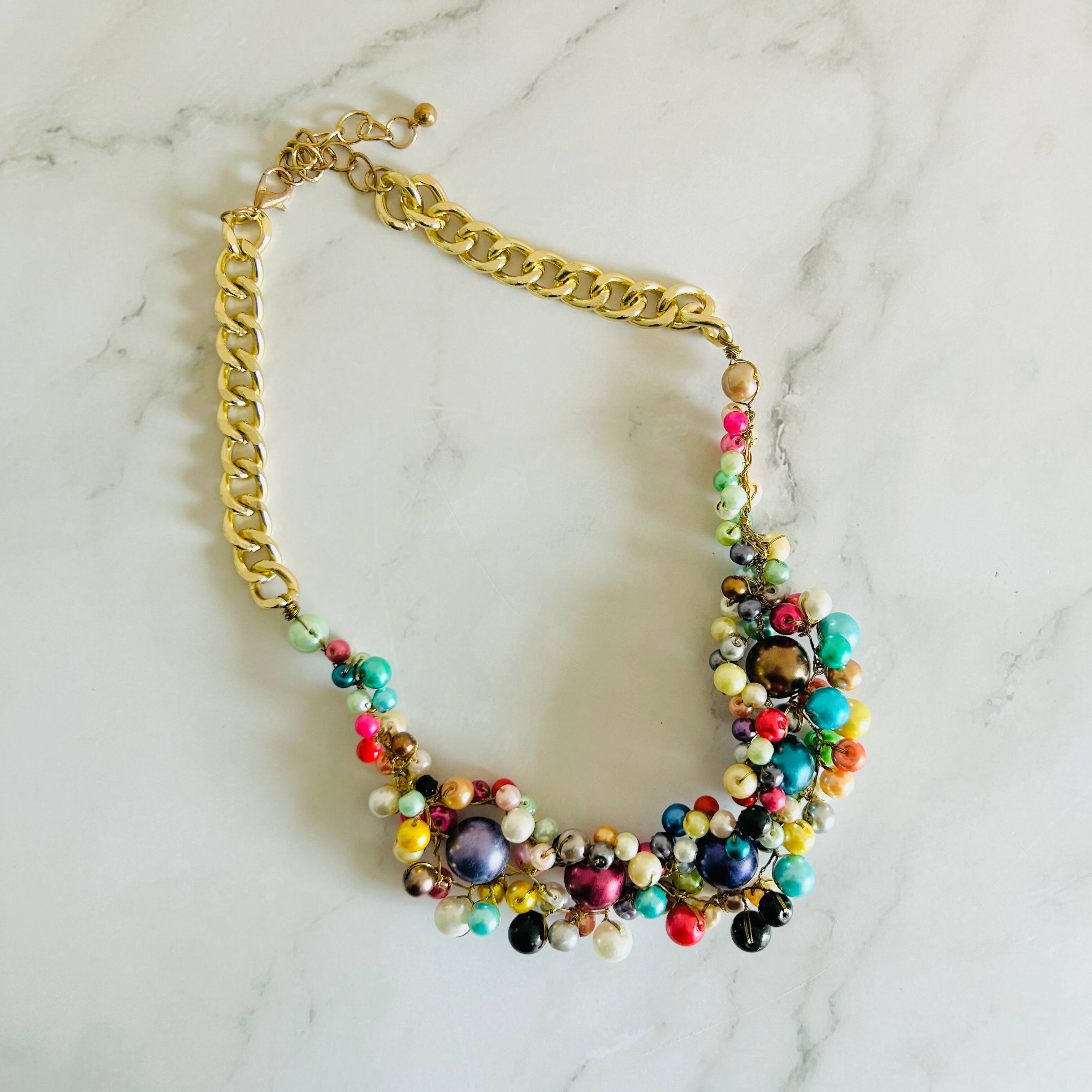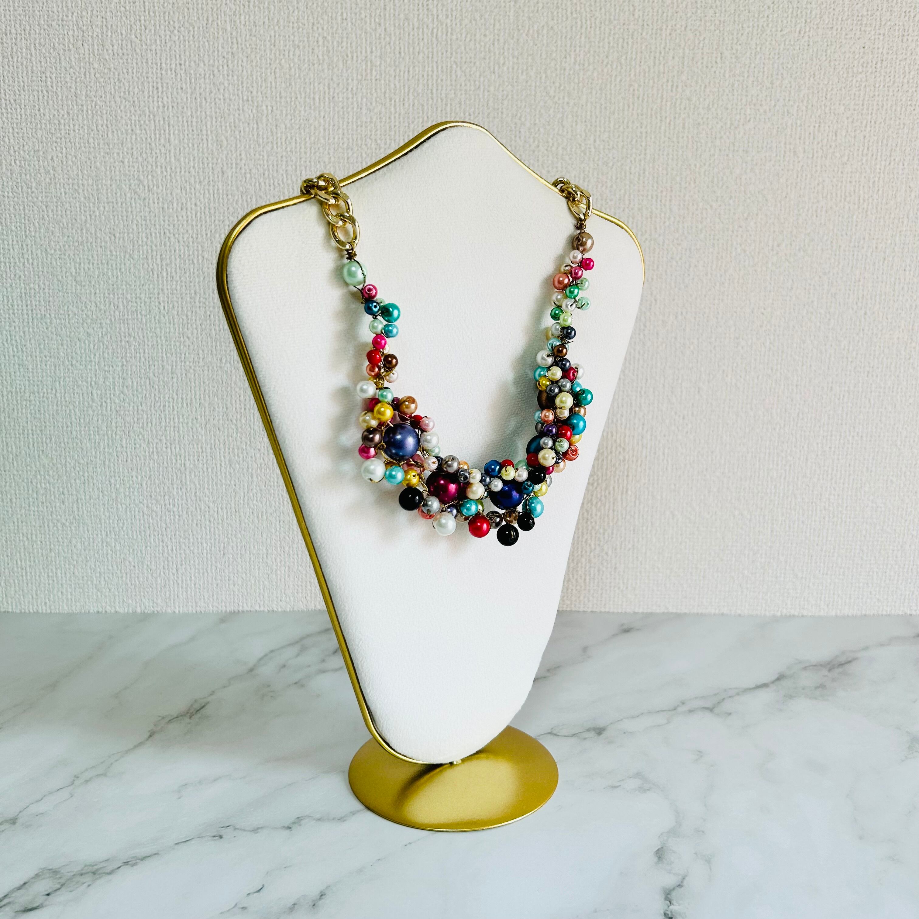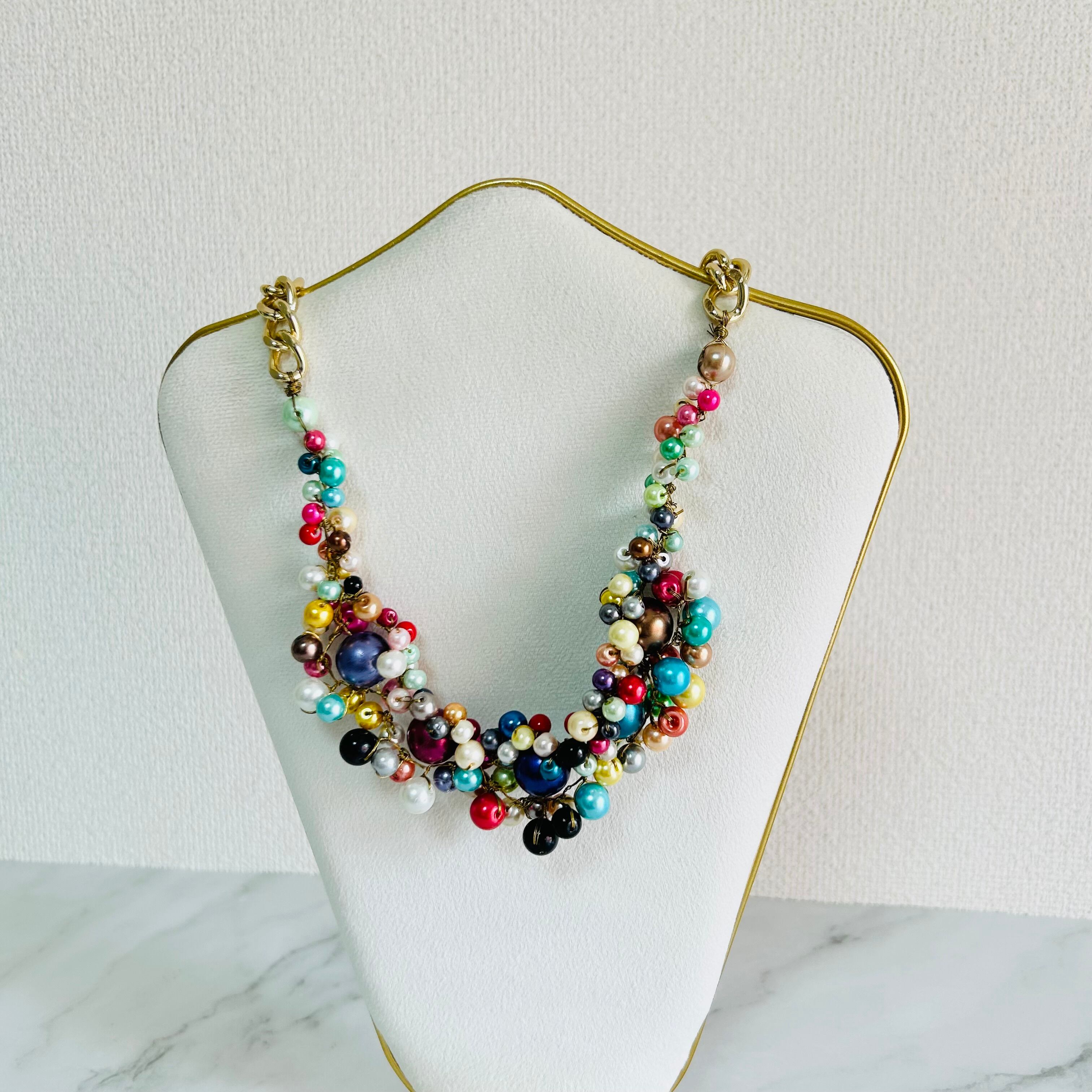 ゴールドのチェーンに、大小様々なカラフルなパールが贅沢に並んだネックレスです。