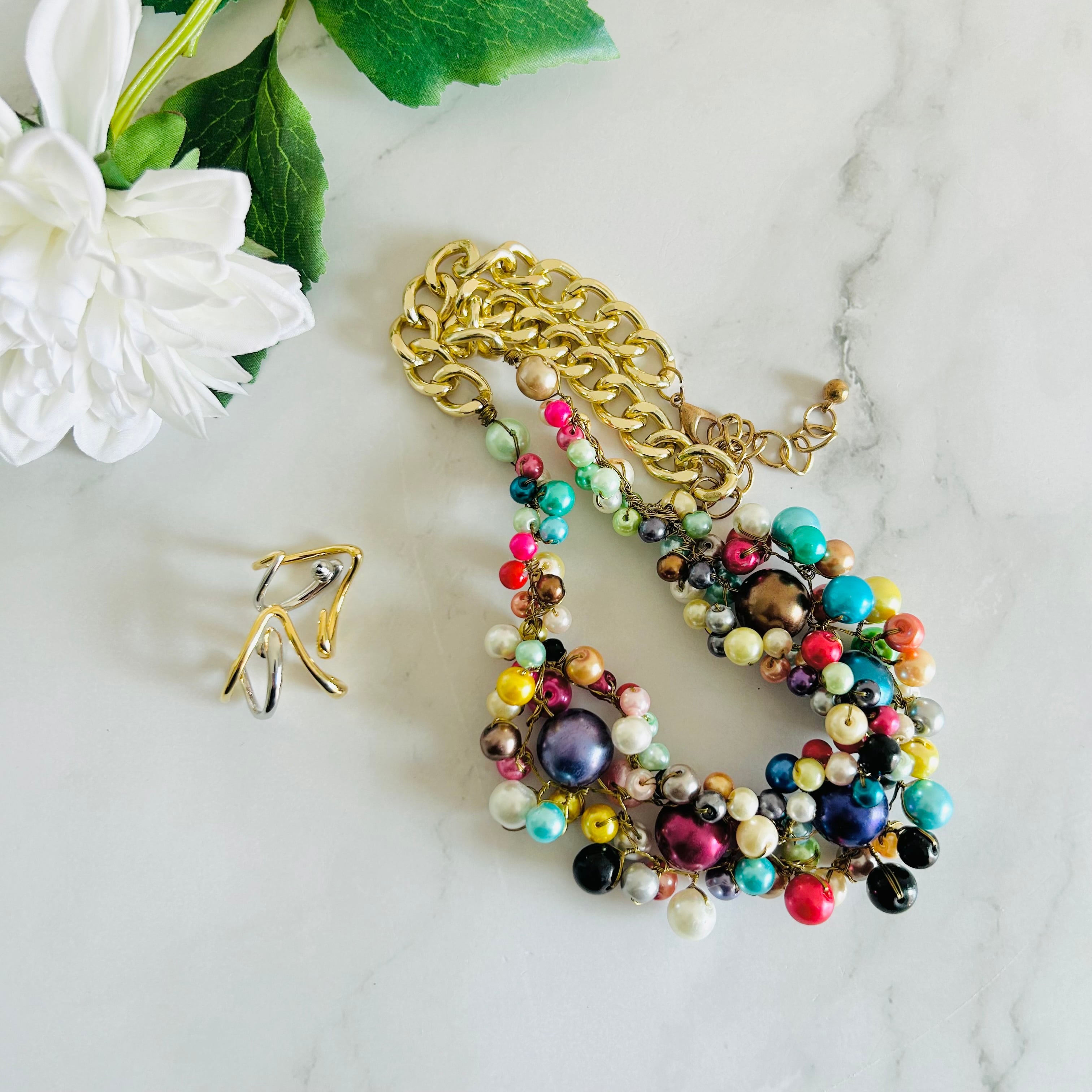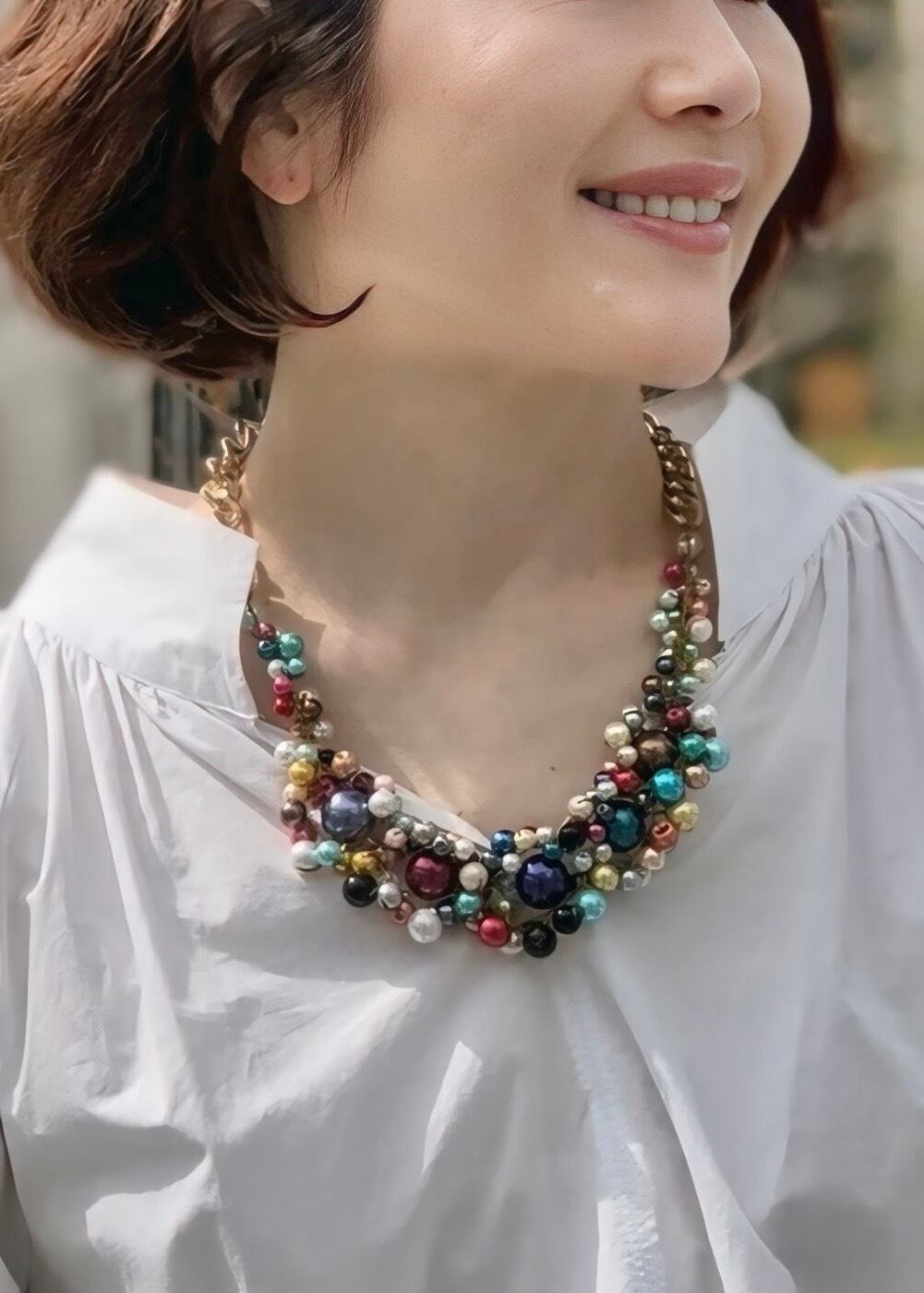 ゴールドのチェーンとカラフルなパールが織りなす明るい印象は、日常のコーディネートに元気を与え、特別な日をより華やかに演出してくれます☆