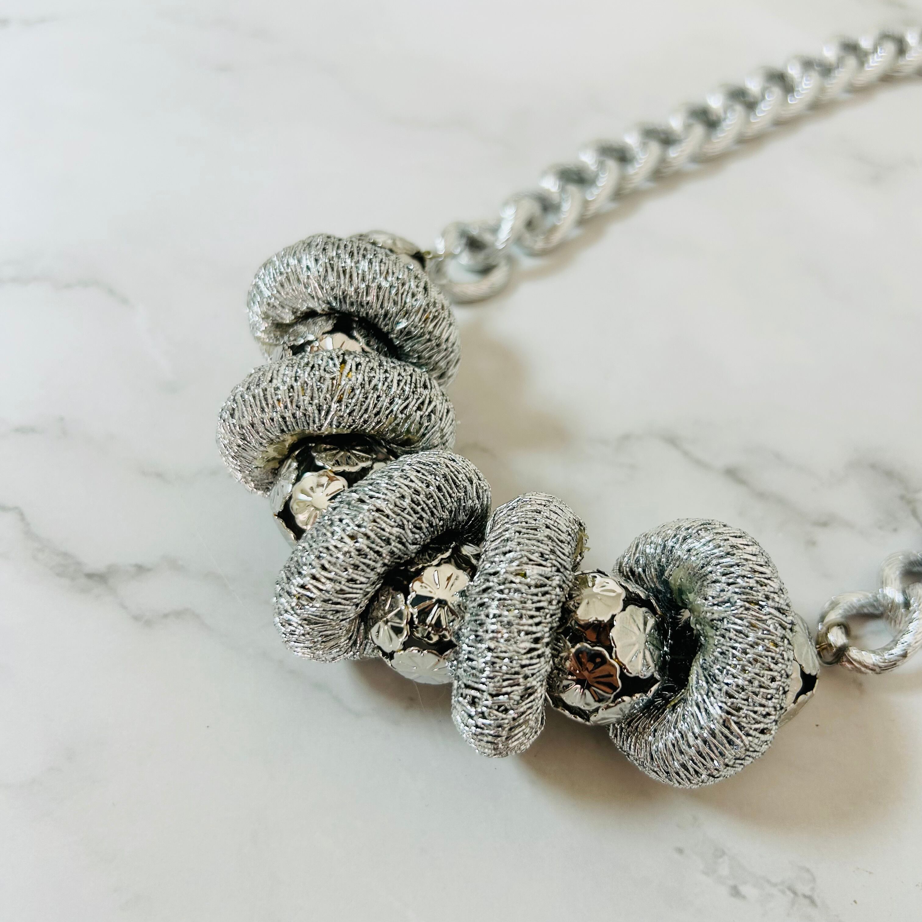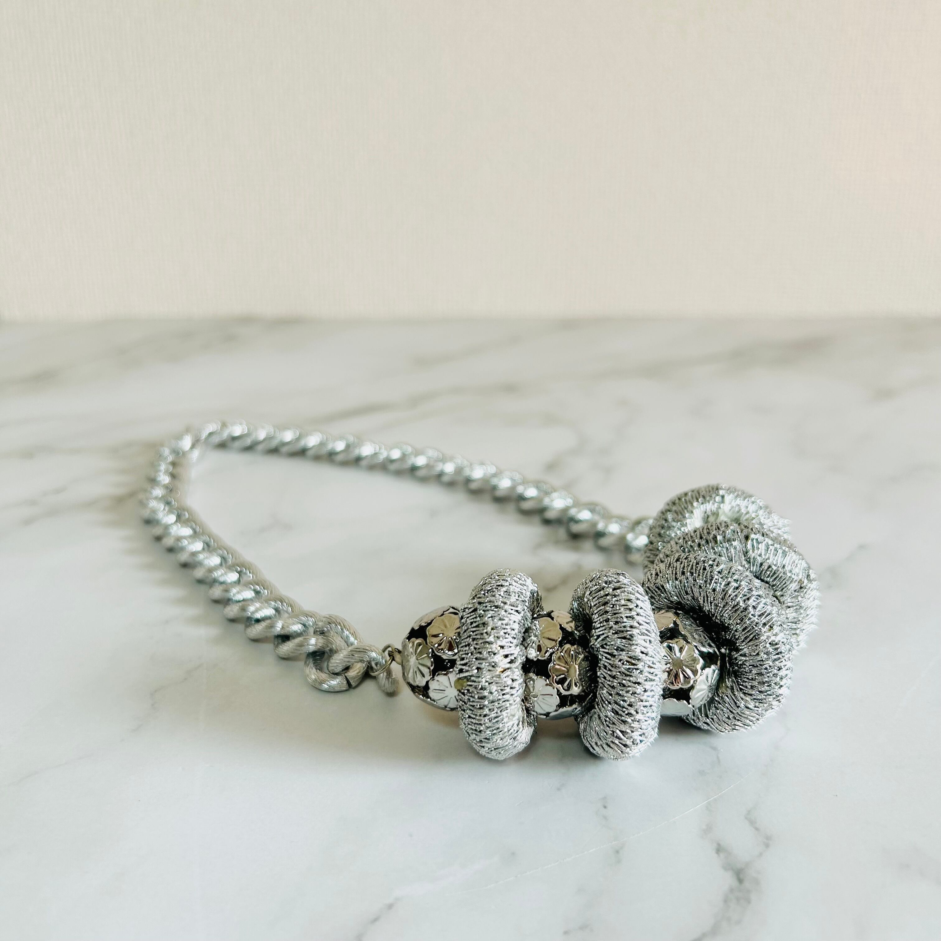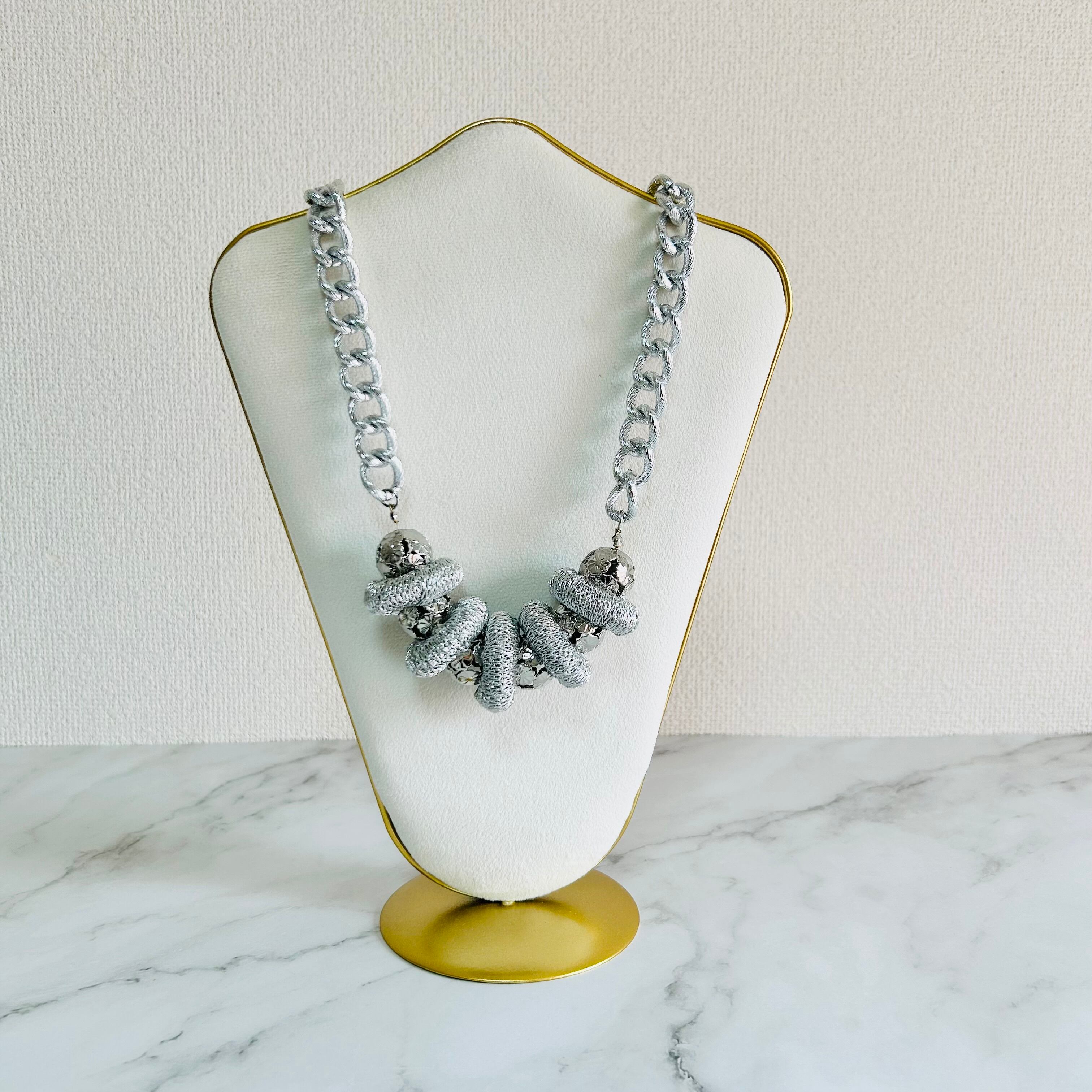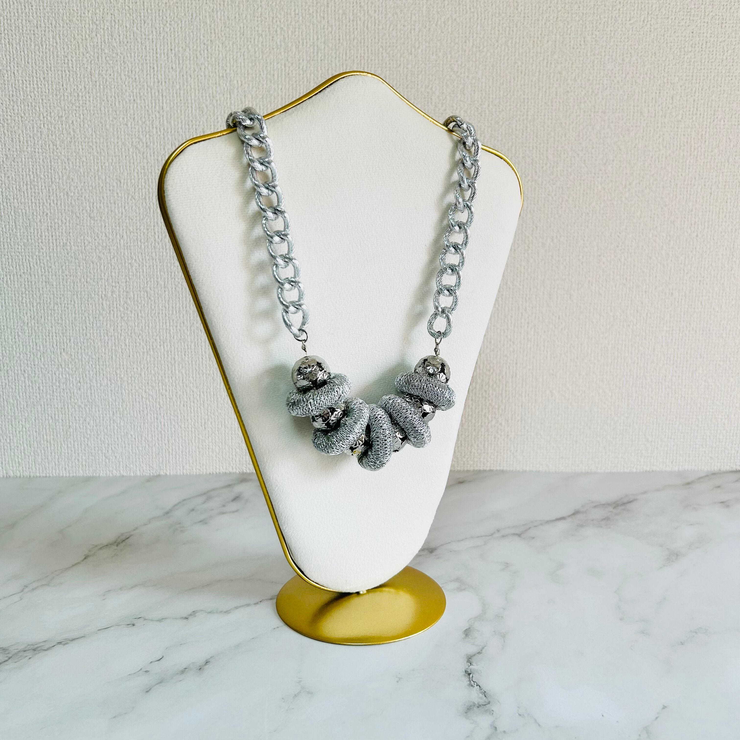 シルバーコードを巻き付けた輪っかパーツが、ネックレスに立体感と遊び心を加え、人とは違う個性を感じさせてくれます☆