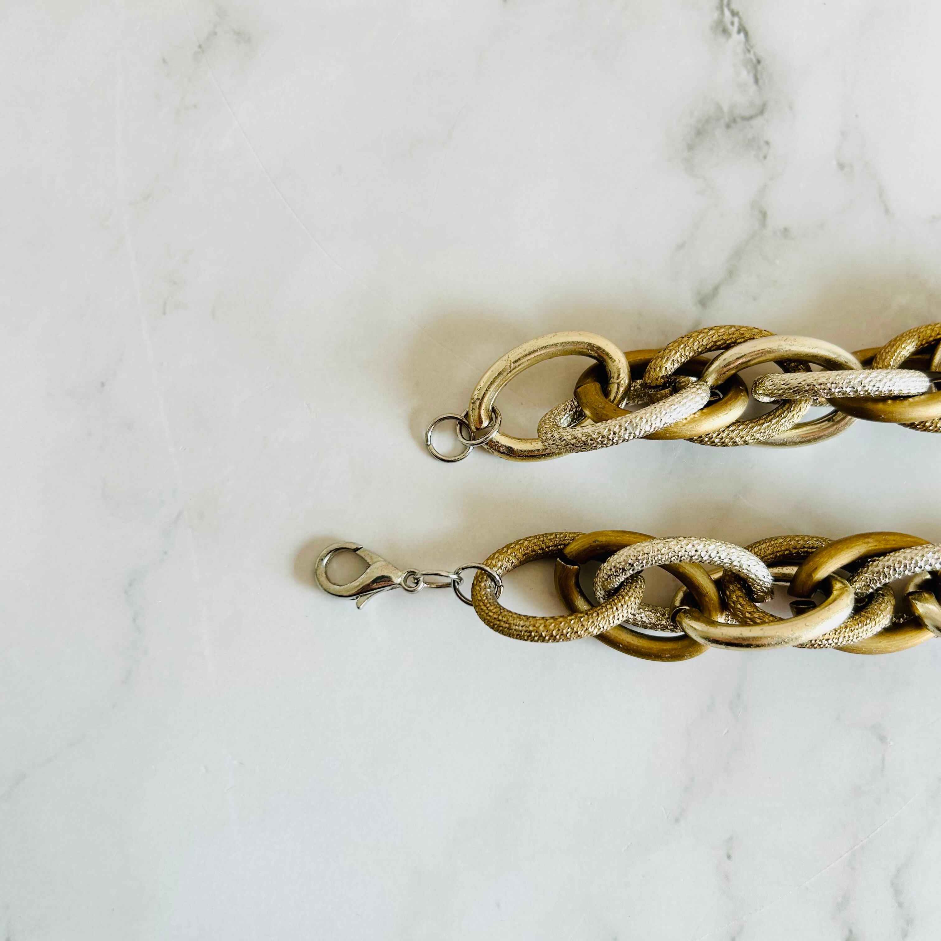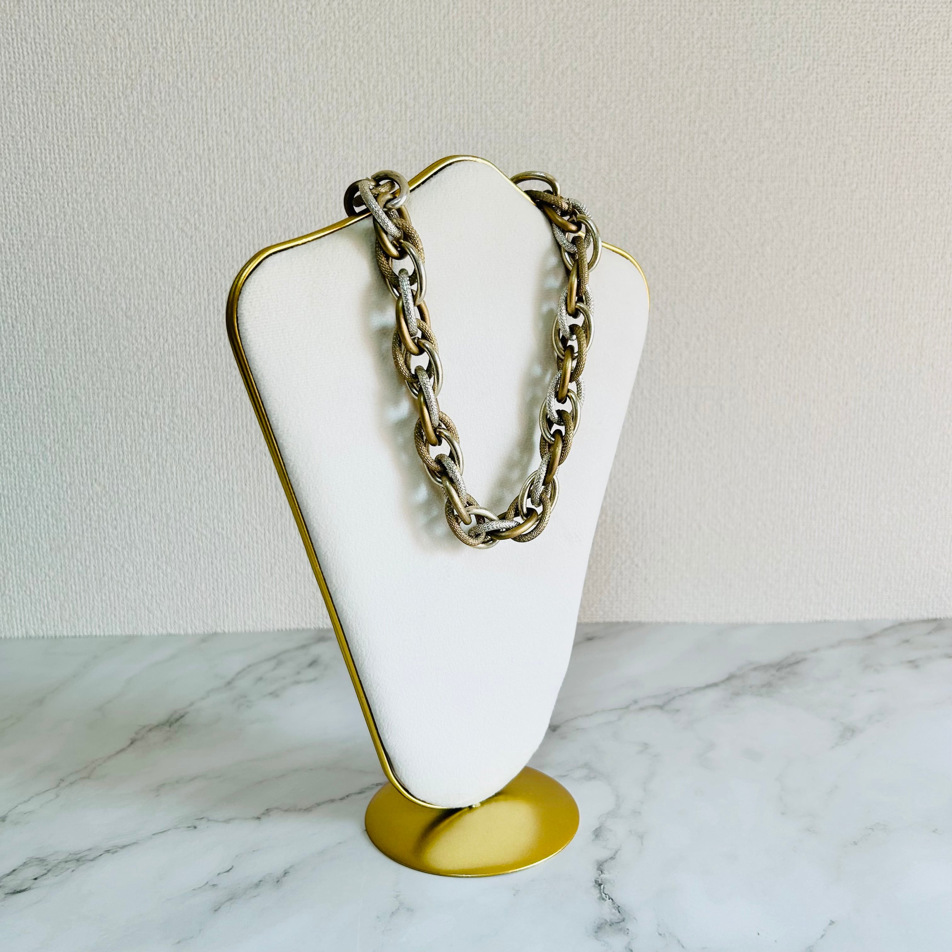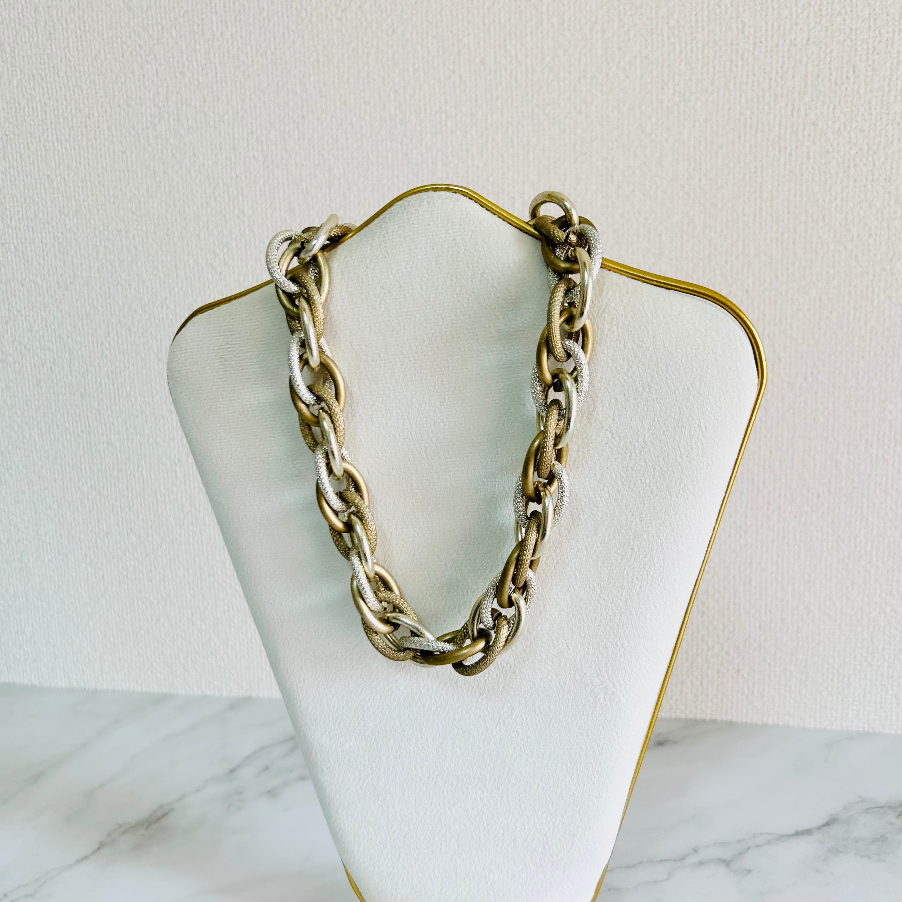 マットゴールドと2種類のシルバーのチェーンが交互に織り交ぜられた、シンプルながらも存在感のあるデザインです。