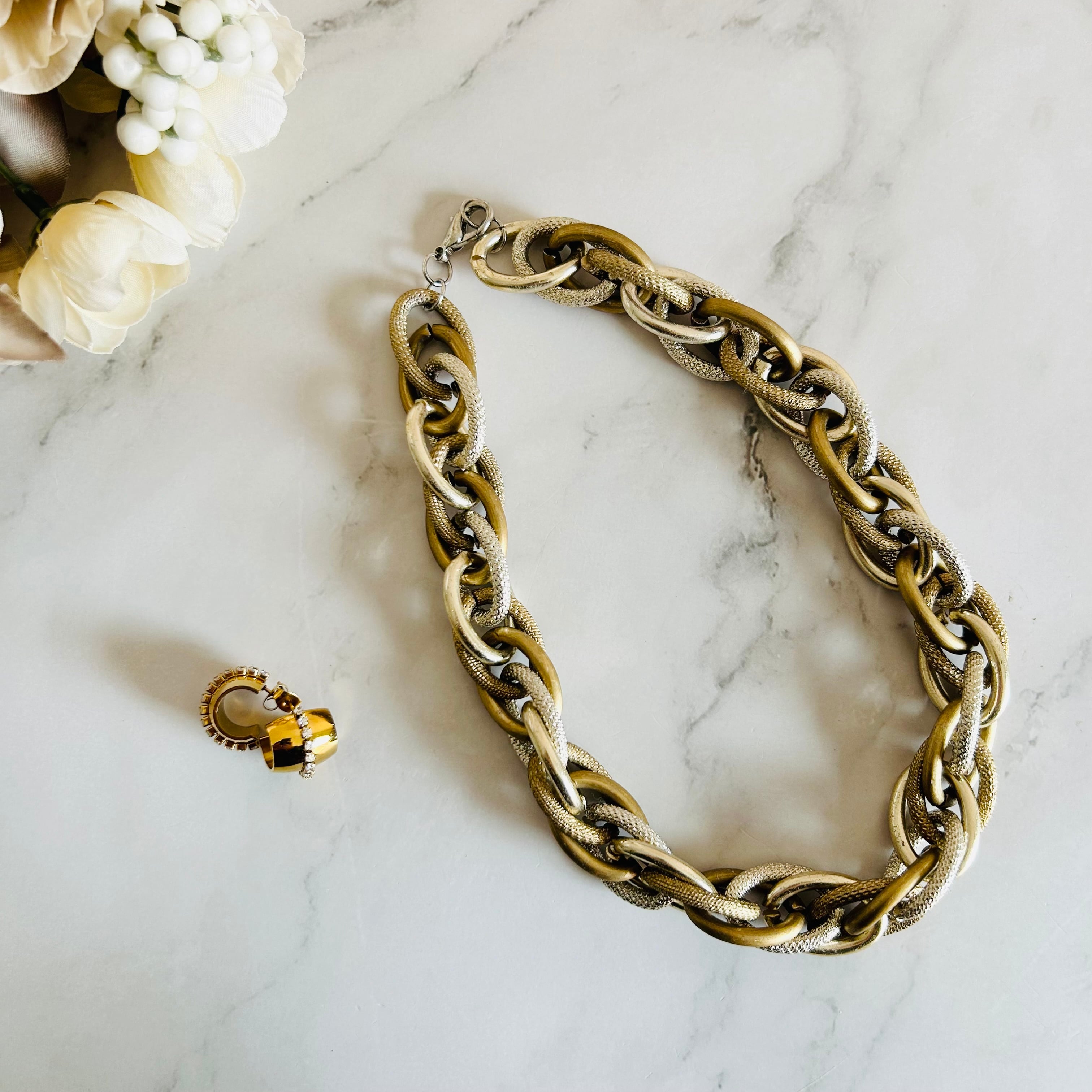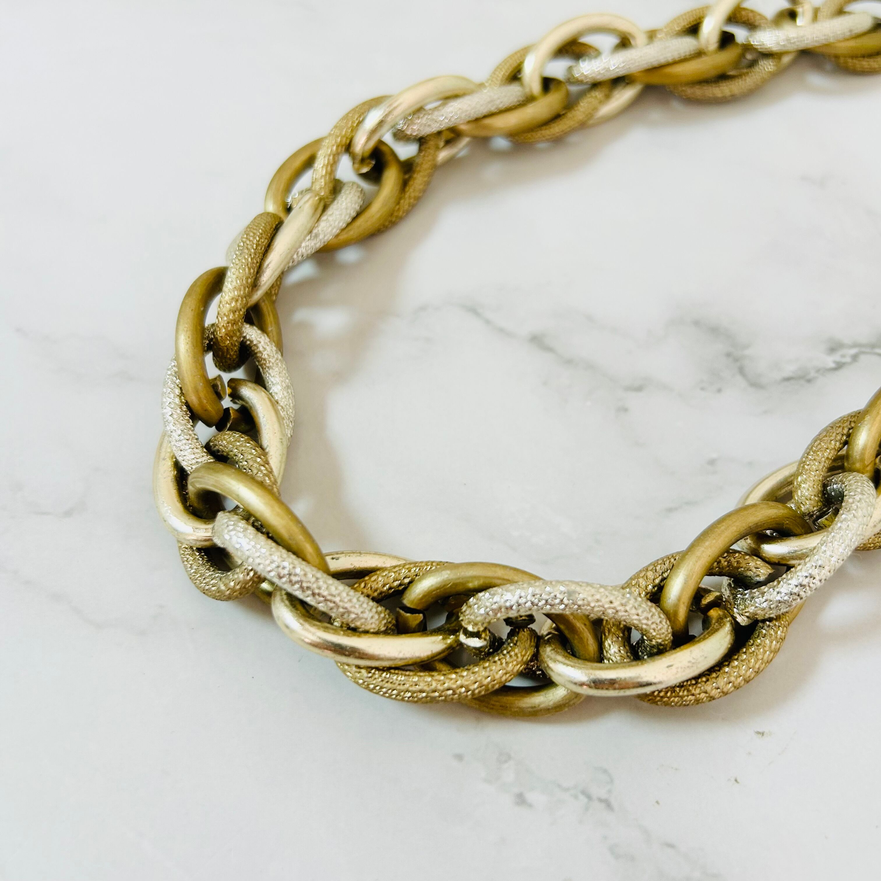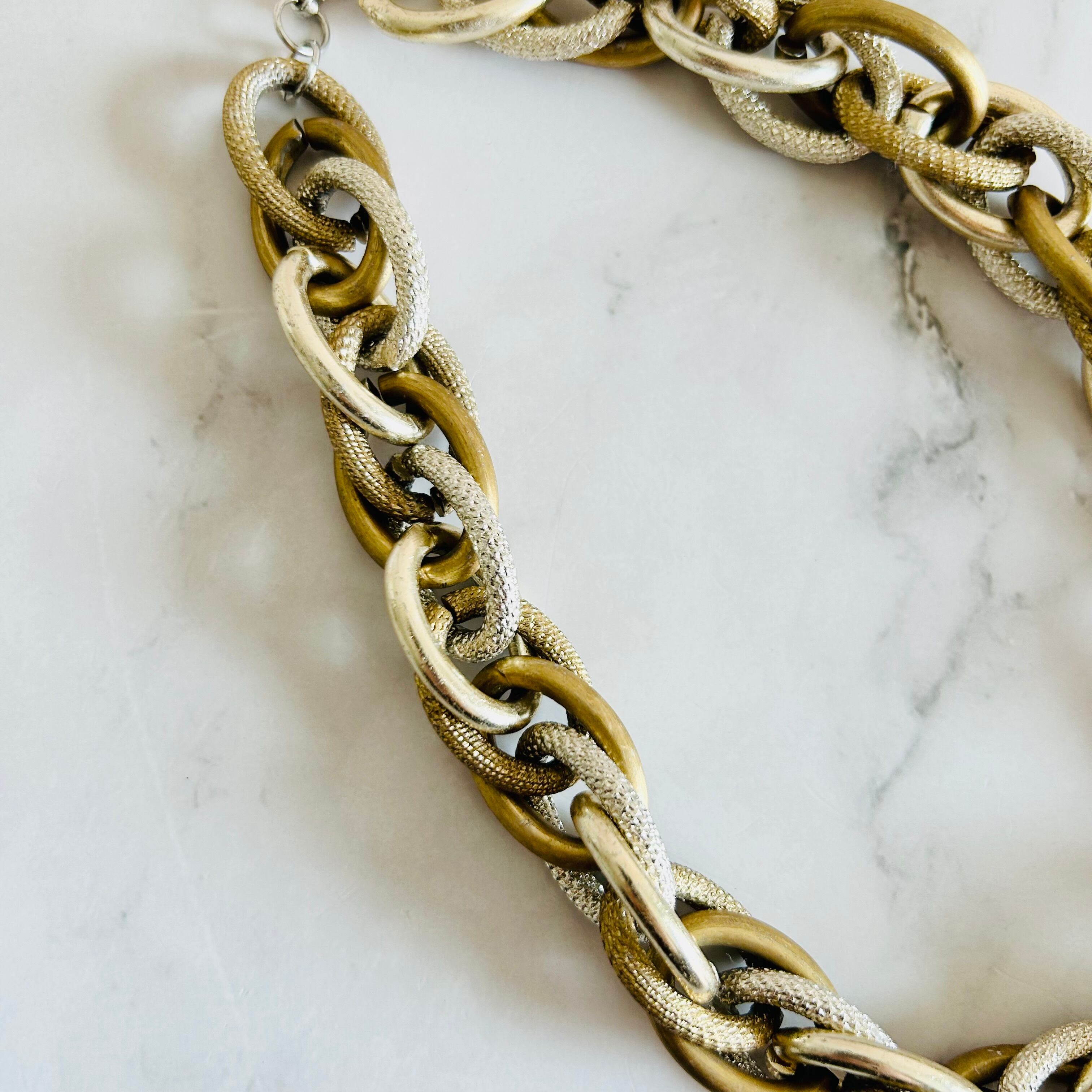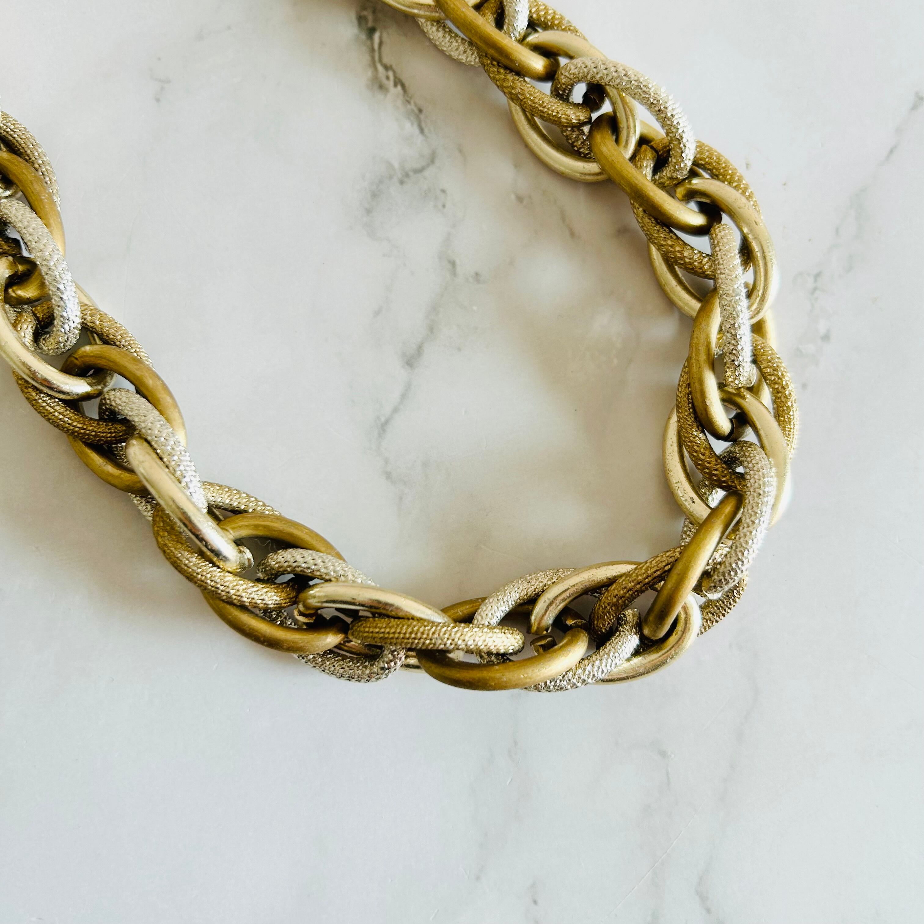 マットゴールドと2種類のシルバーのチェーンが交互に織り交ぜられた、シンプルながらも存在感のあるデザインです。