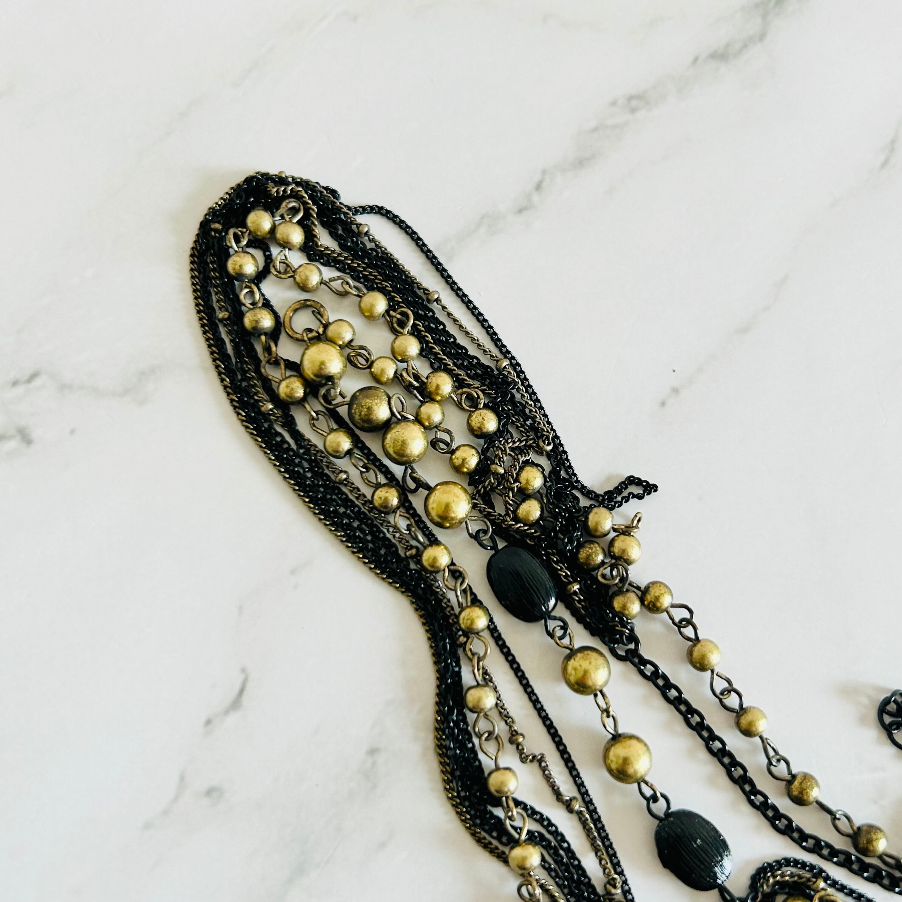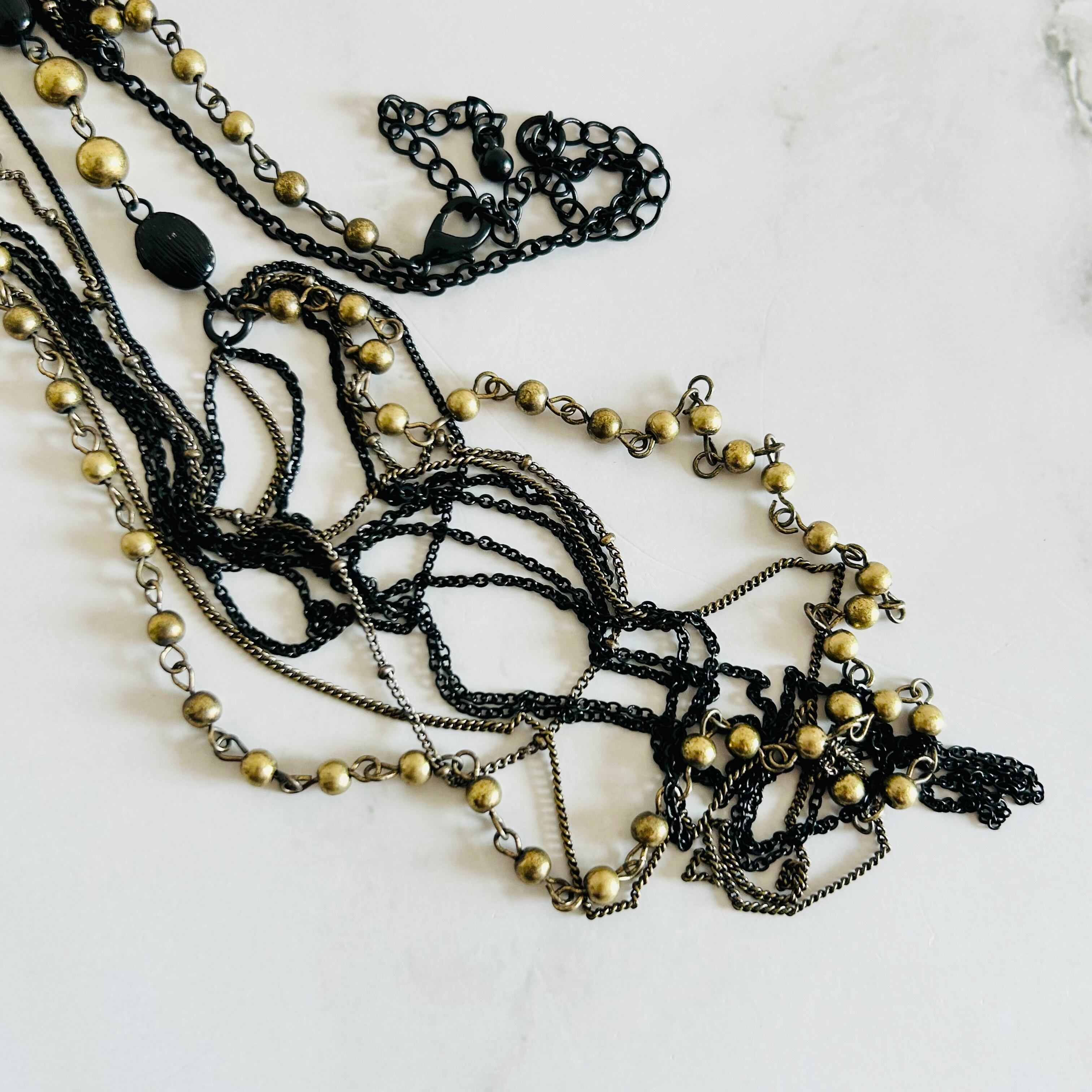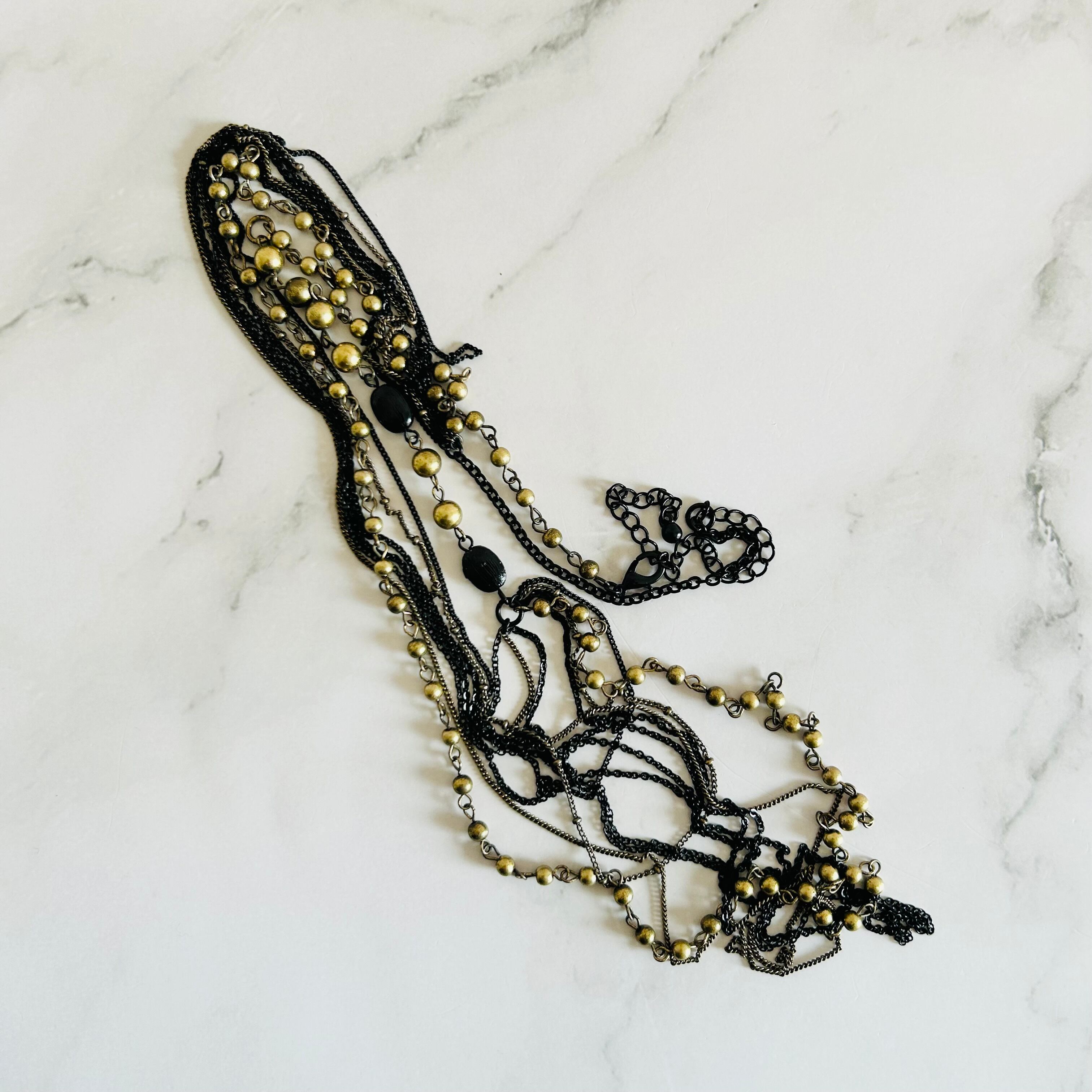 ブラックとアンティークゴールドカラーのさまざまなチェーンが織りなす、流れるようなデザインが目を引くロングネックレスです。