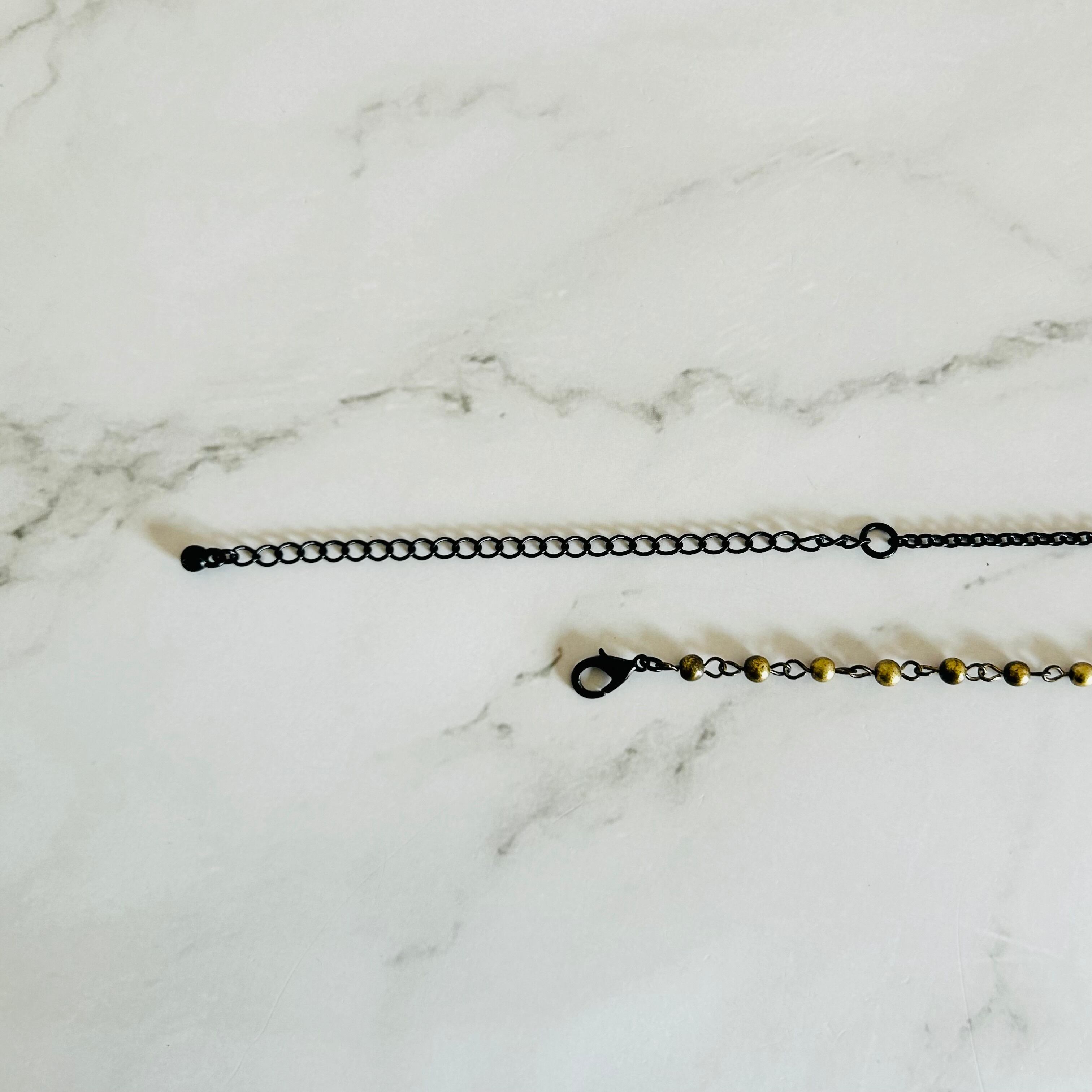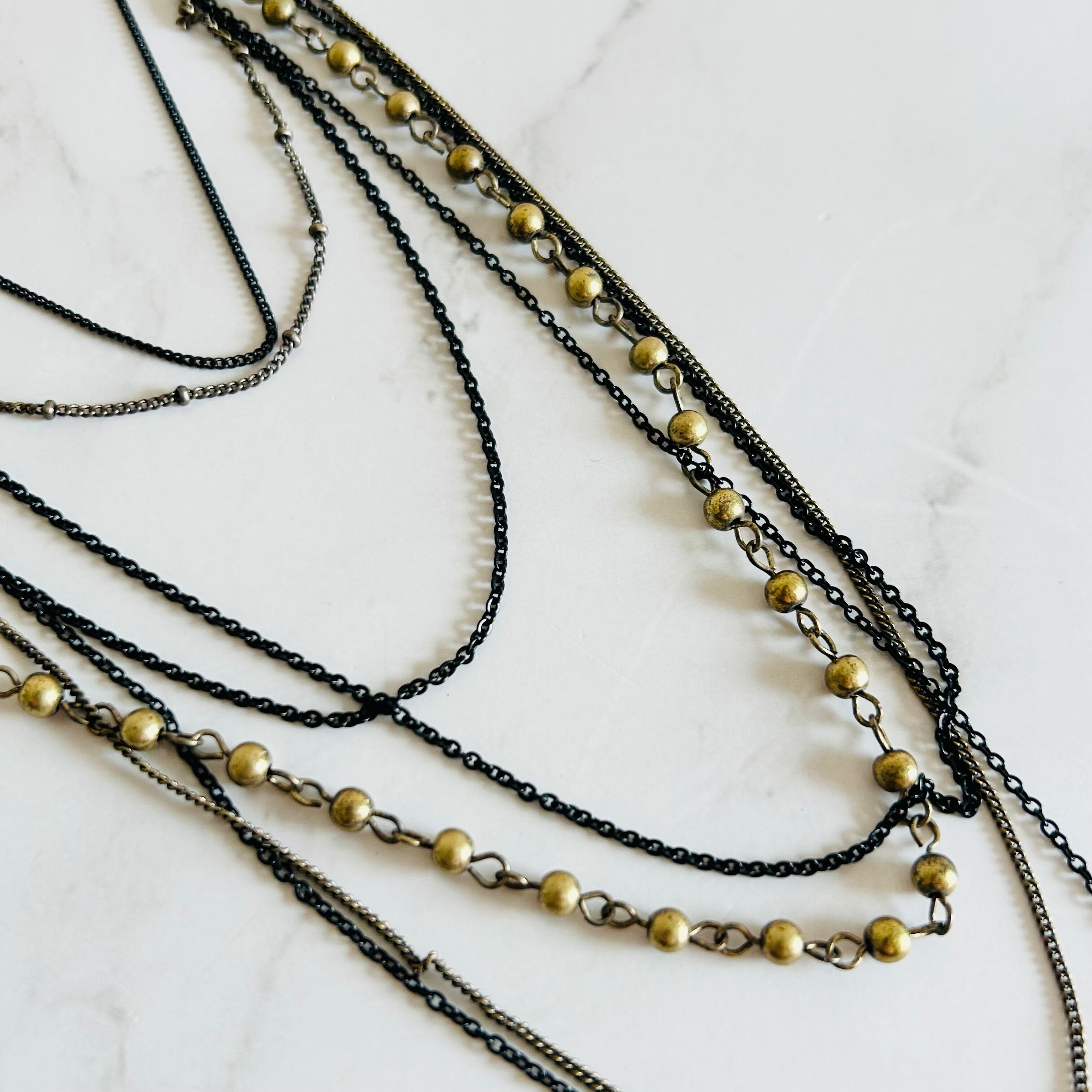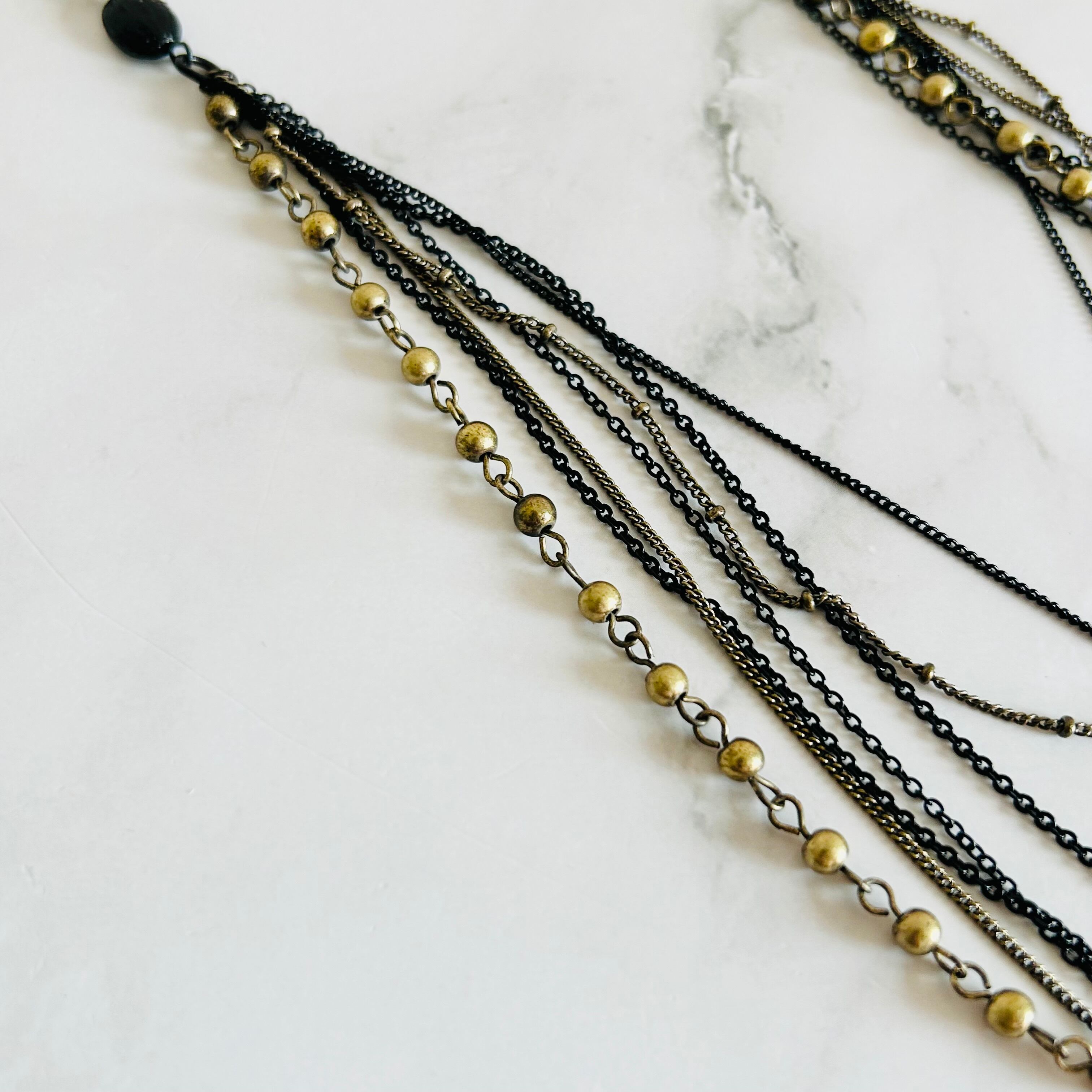 ブラックとアンティークゴールドカラーのさまざまなチェーンが織りなす、流れるようなデザインが目を引くロングネックレスです。