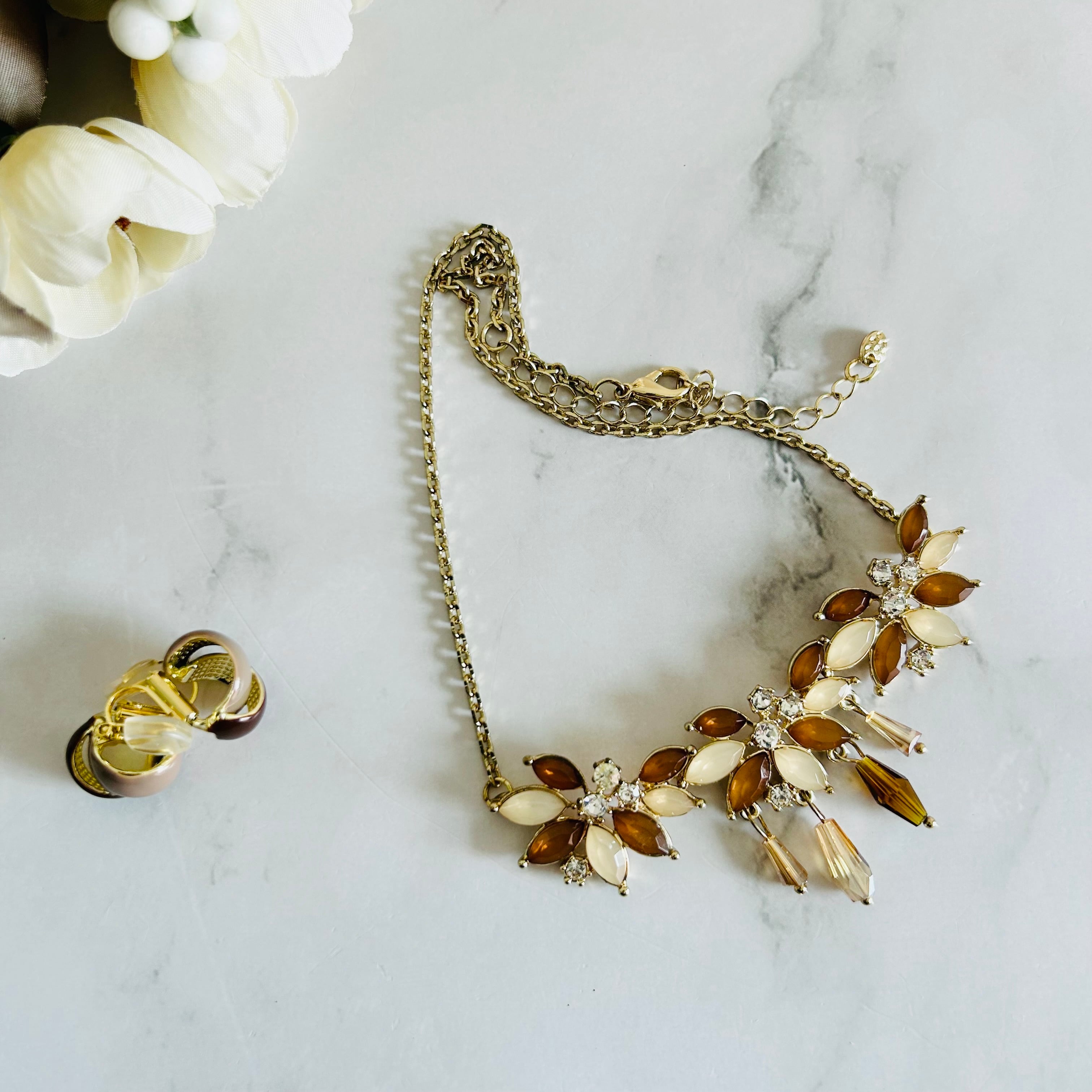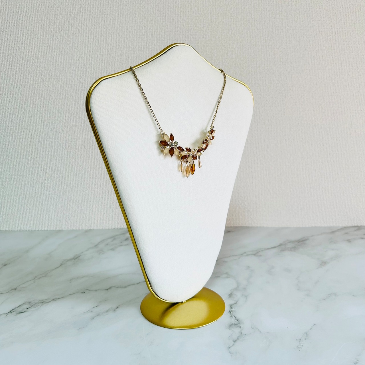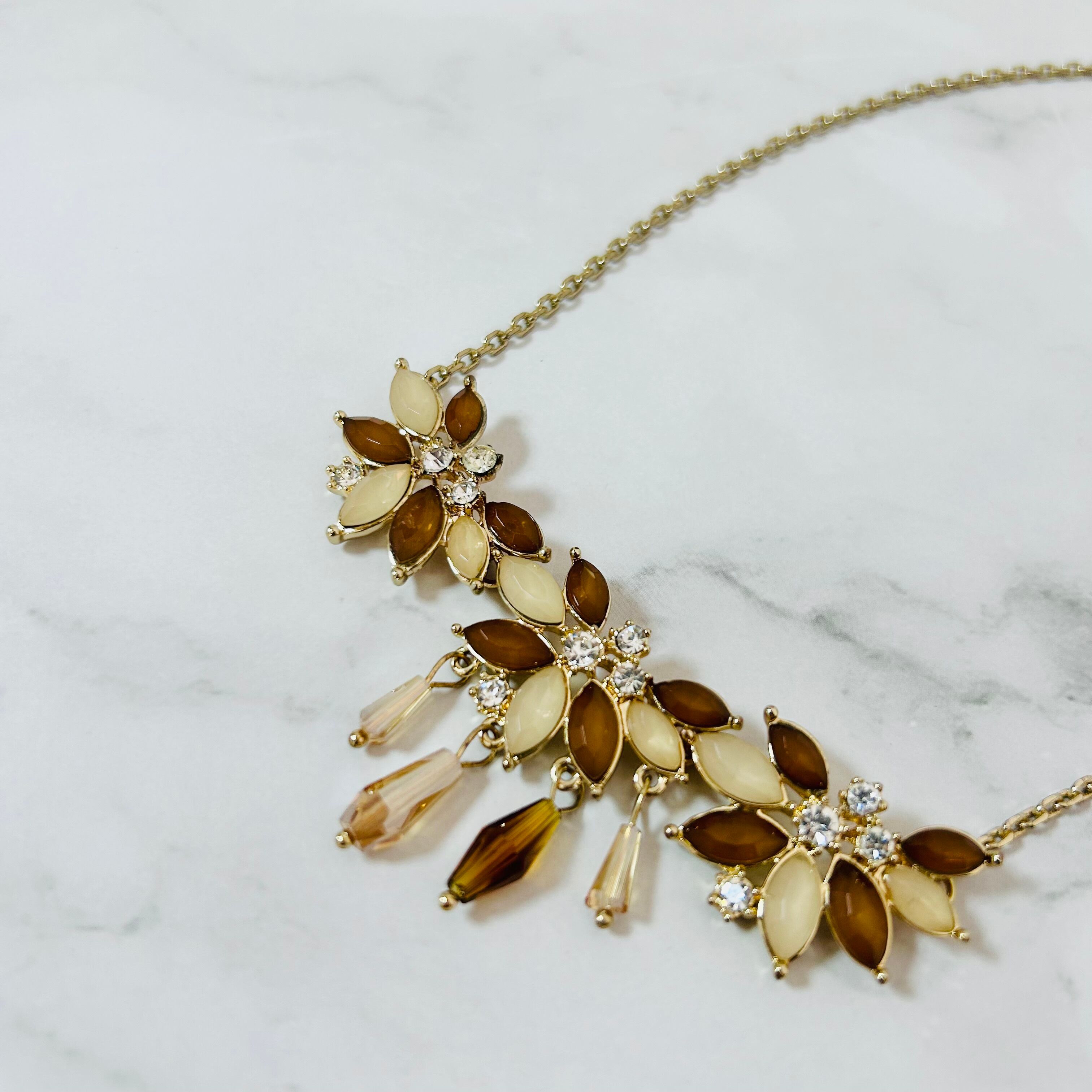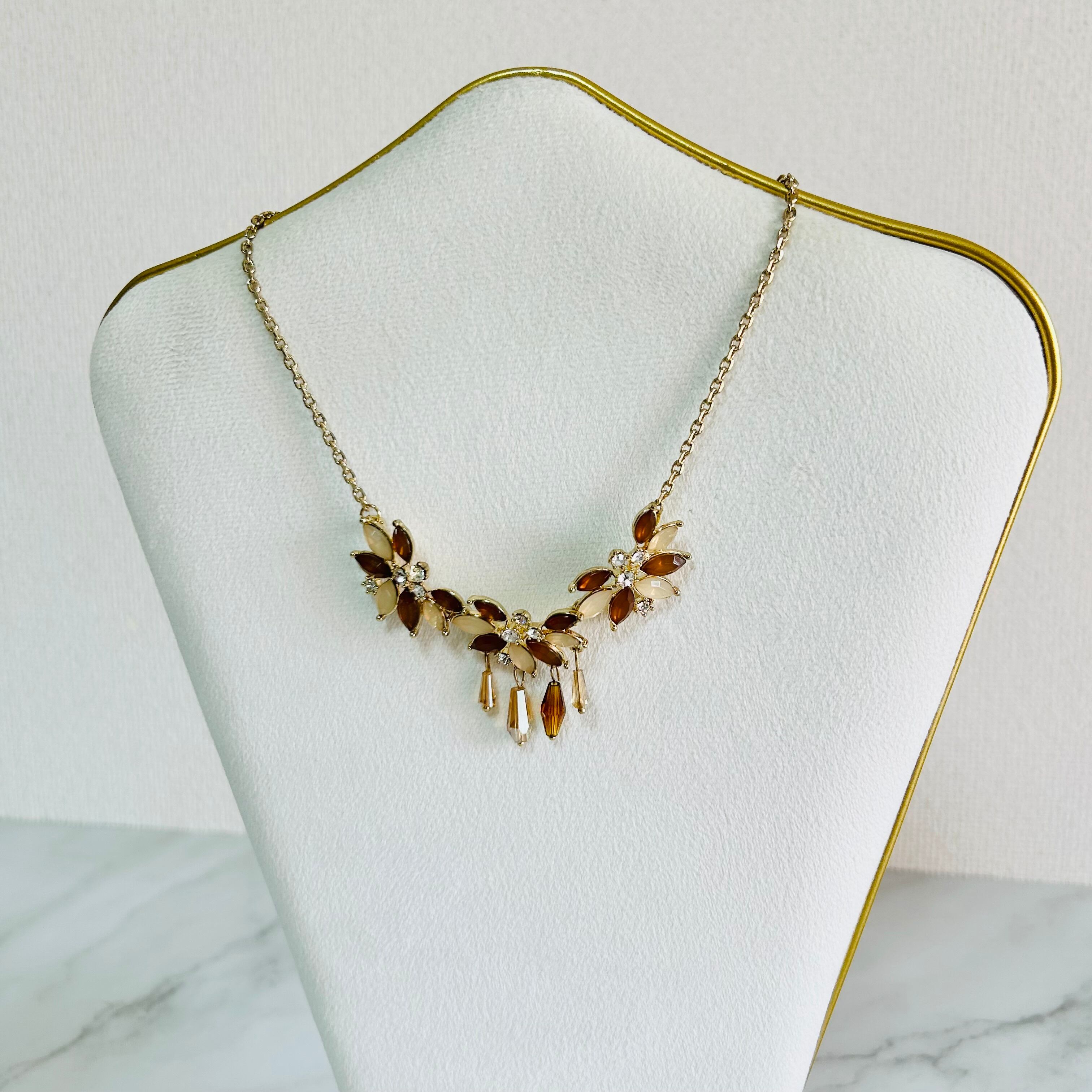 ゴールドのチェーンにブラウンとアイボリーのビジューを使用したフラワーモチーフが並び、エレガントで華やかな印象を与えます。