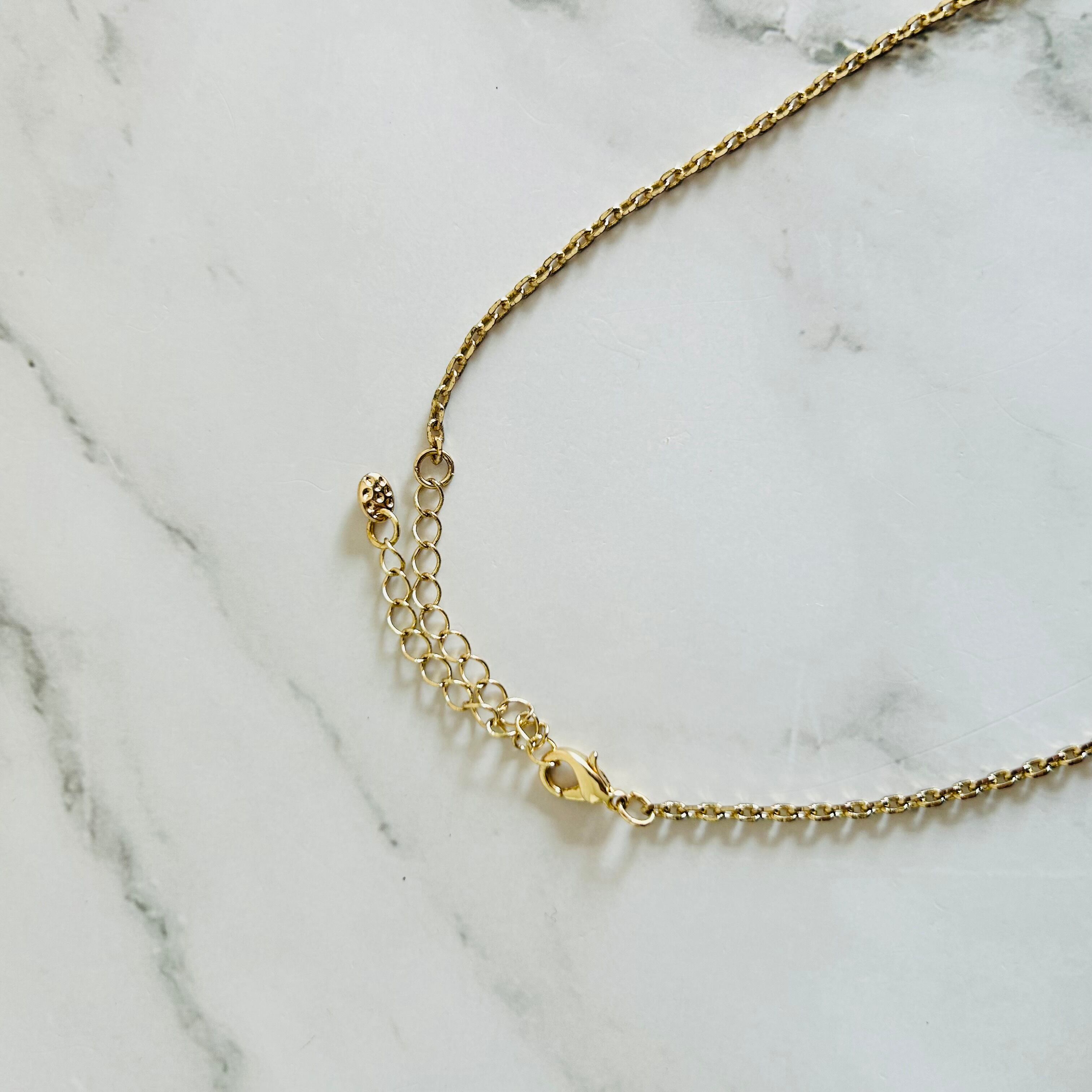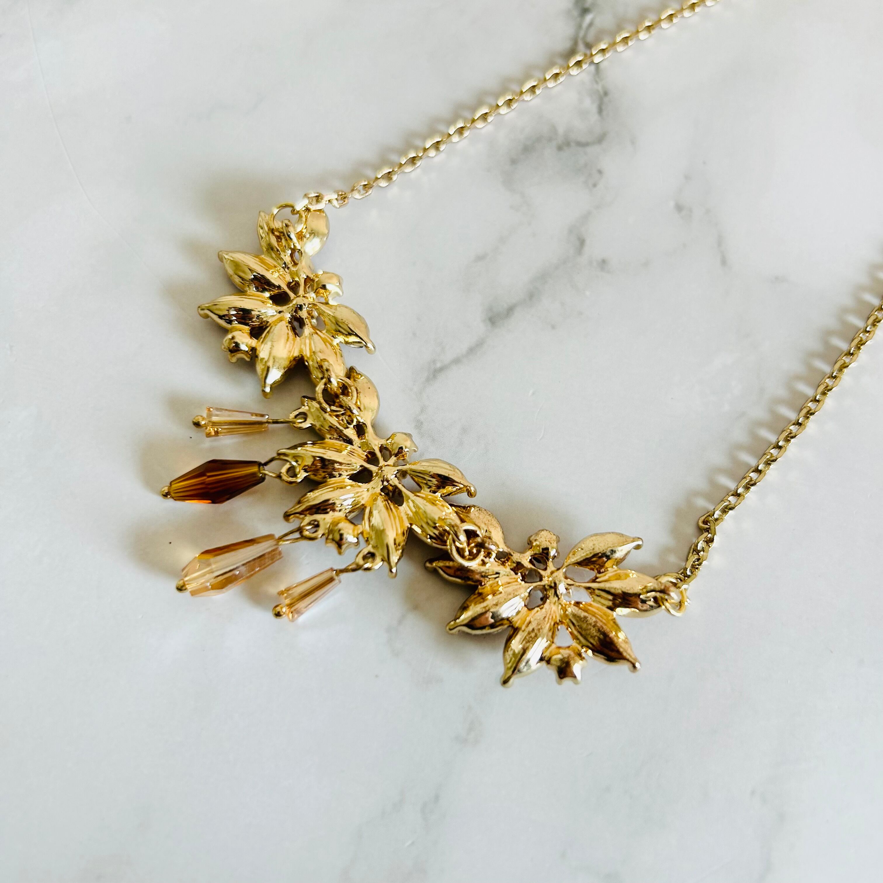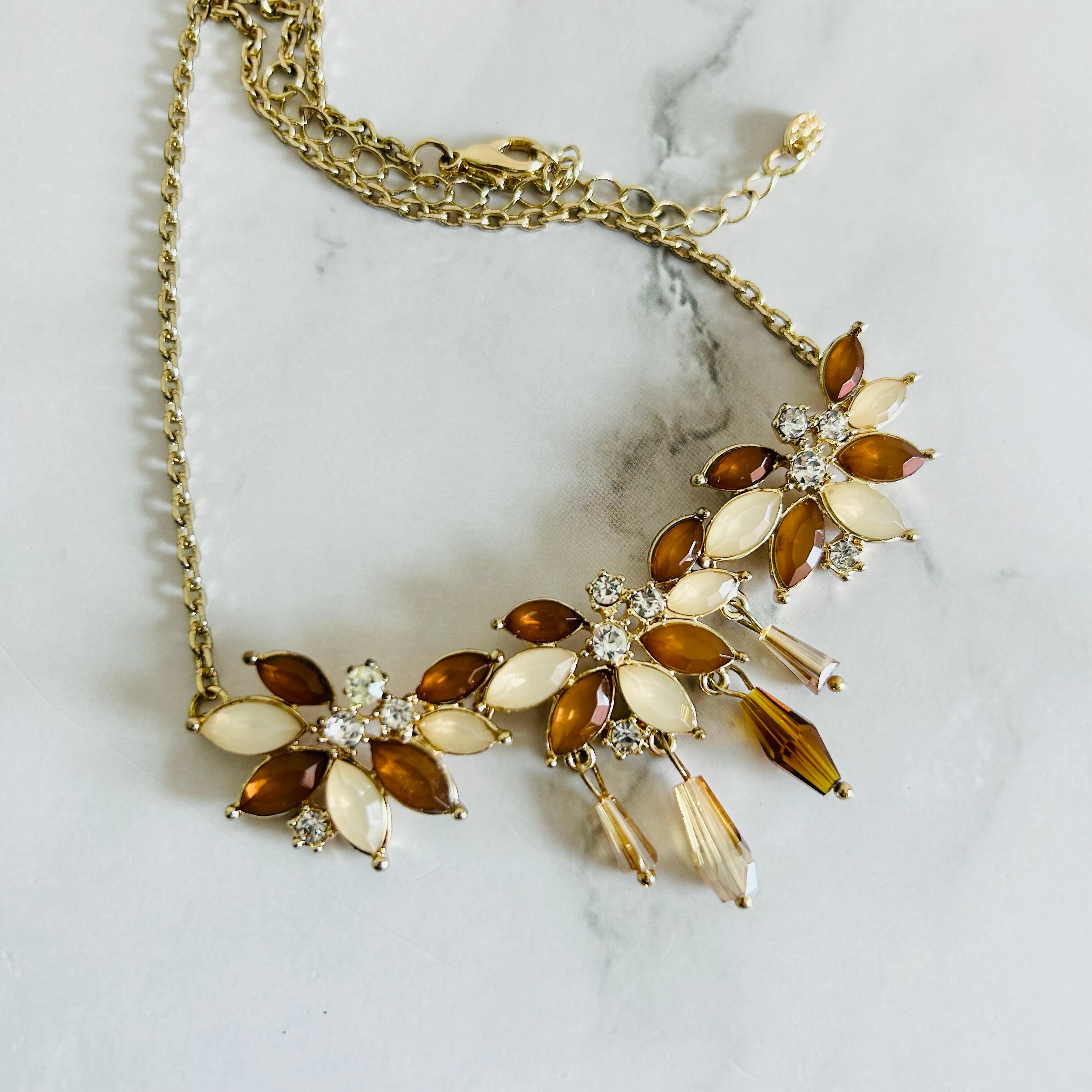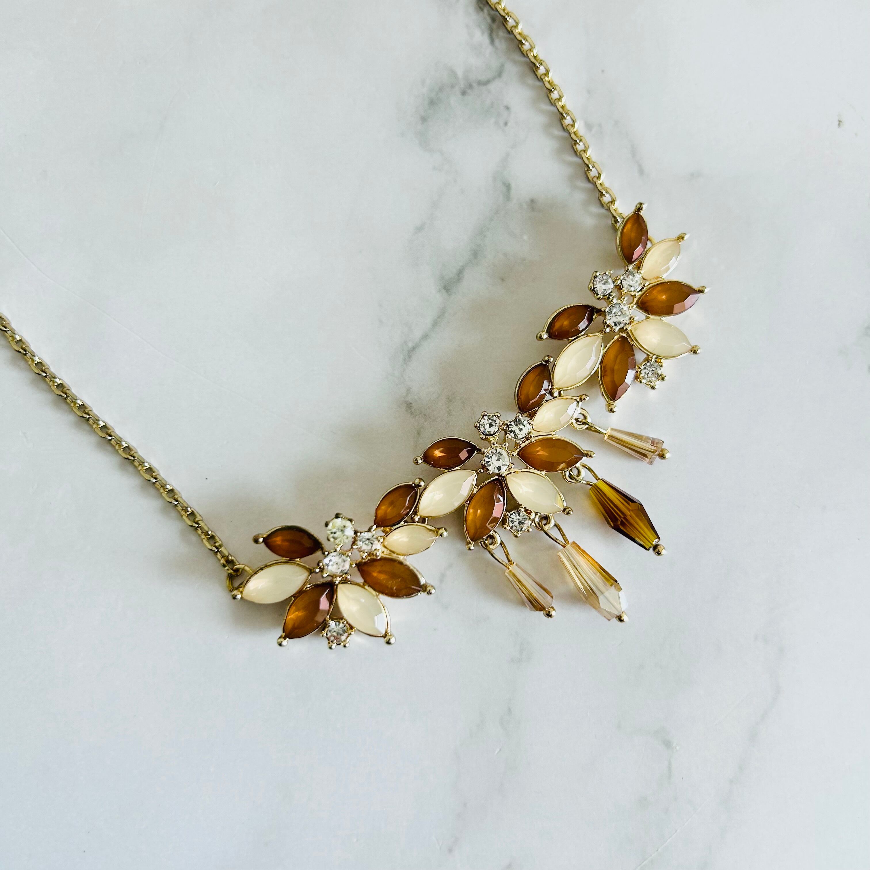 ゴールドのチェーンにブラウンとアイボリーのビジューを使用したフラワーモチーフが並び、エレガントで華やかな印象を与えます。