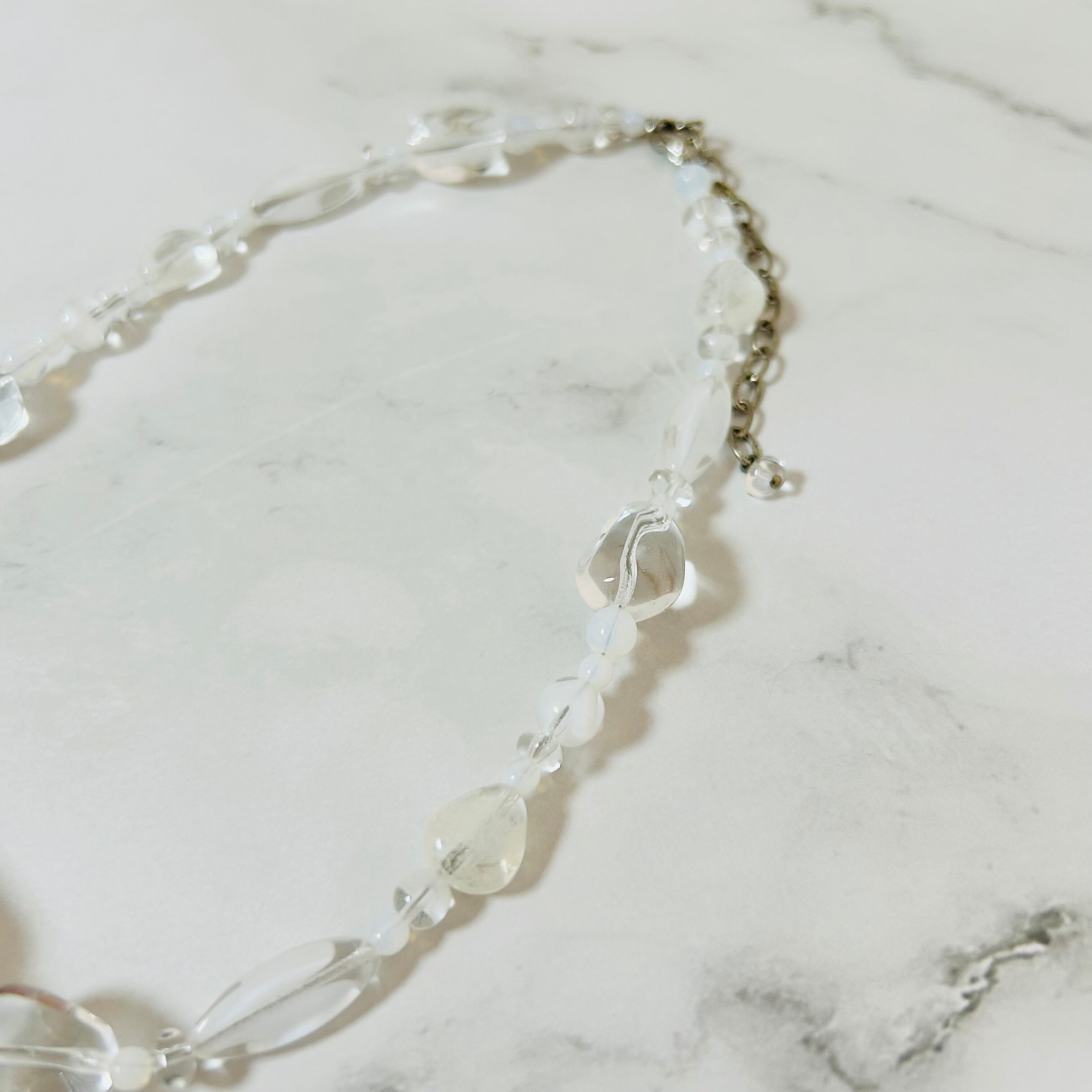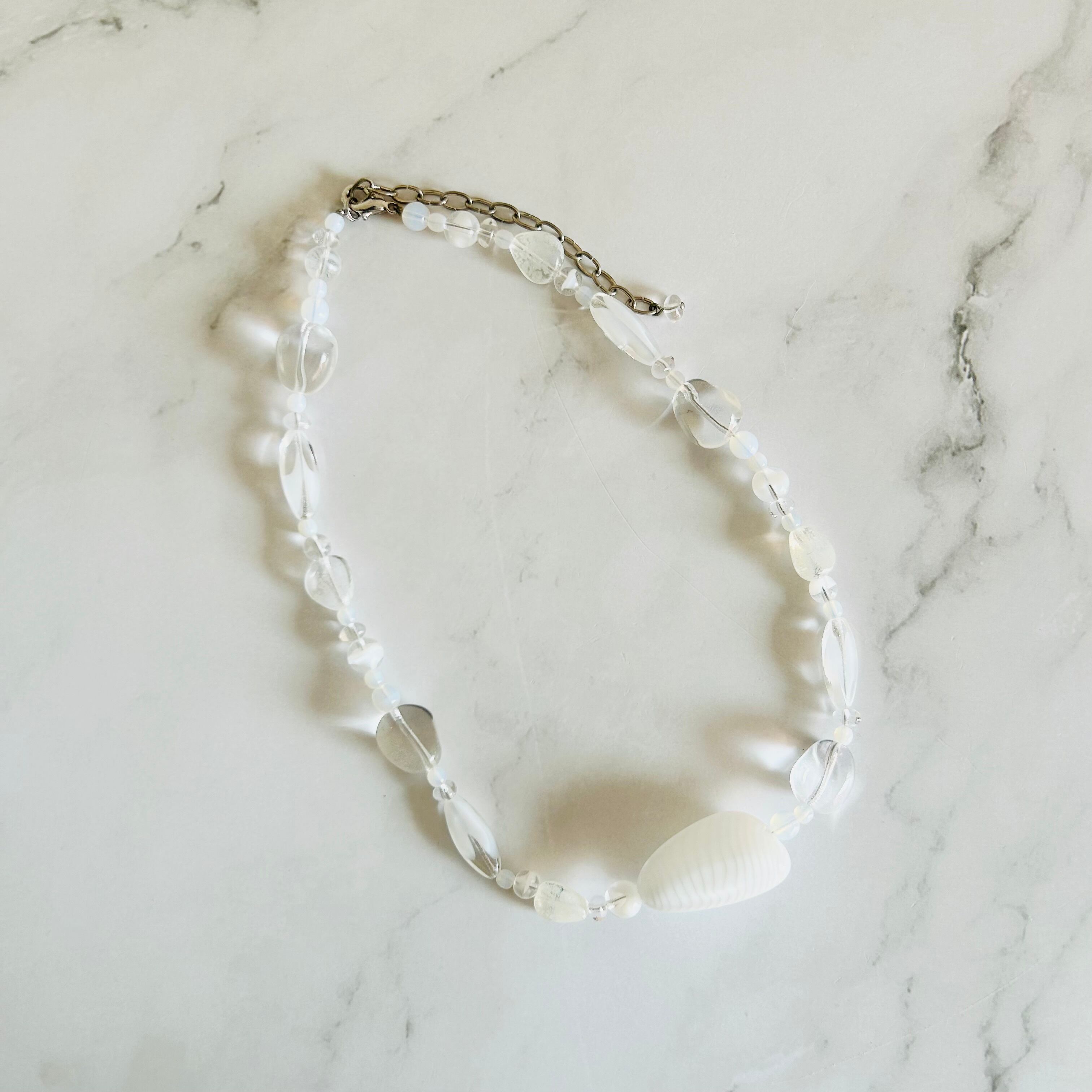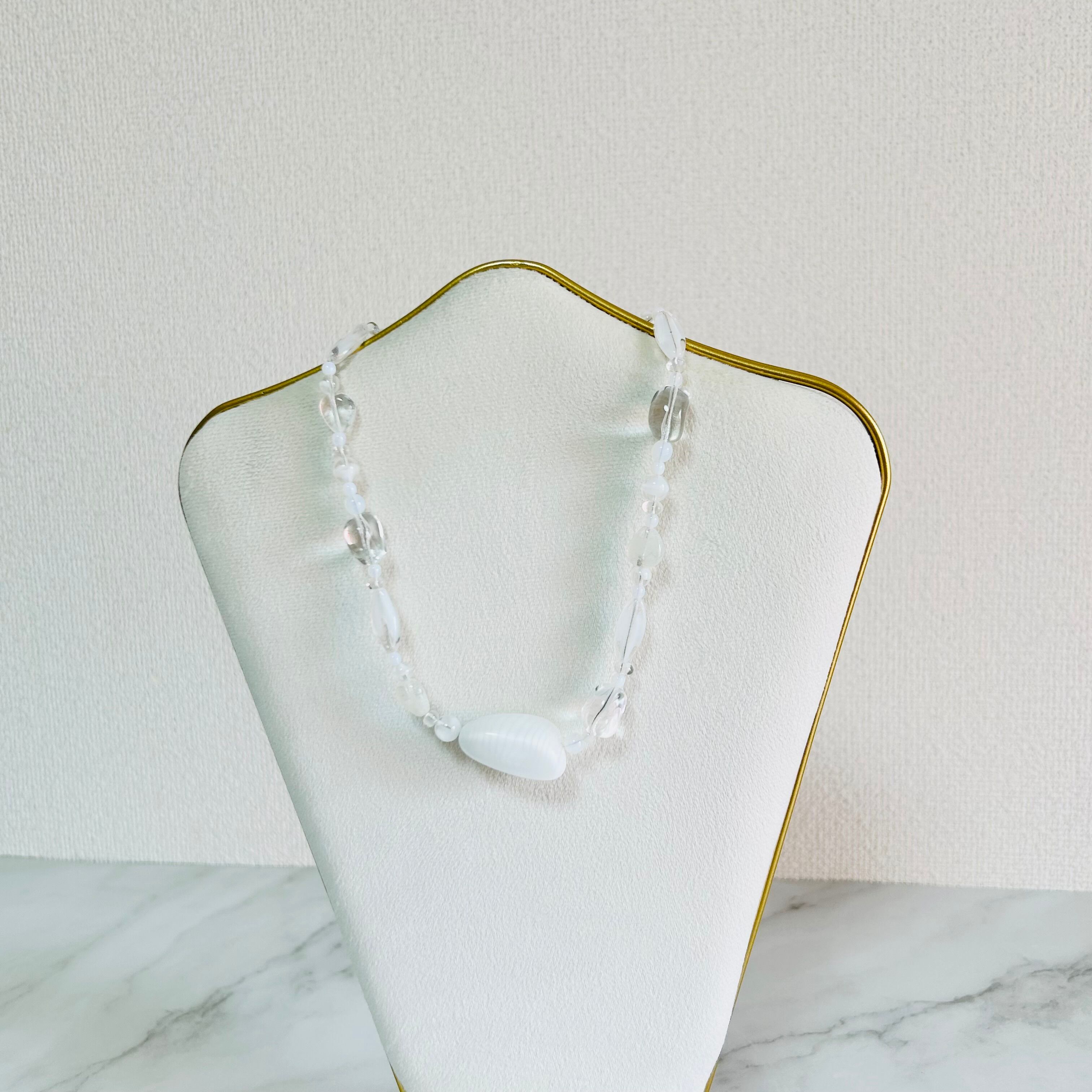 透明感のあるホワイトカラーを基調に、クリアストーンやオーロラのように光を含むストーンパーツを組み合わせ、アクセントに貝殻のようなニュアンスをもつセンターパーツをあしらったデザインのネックレスです。