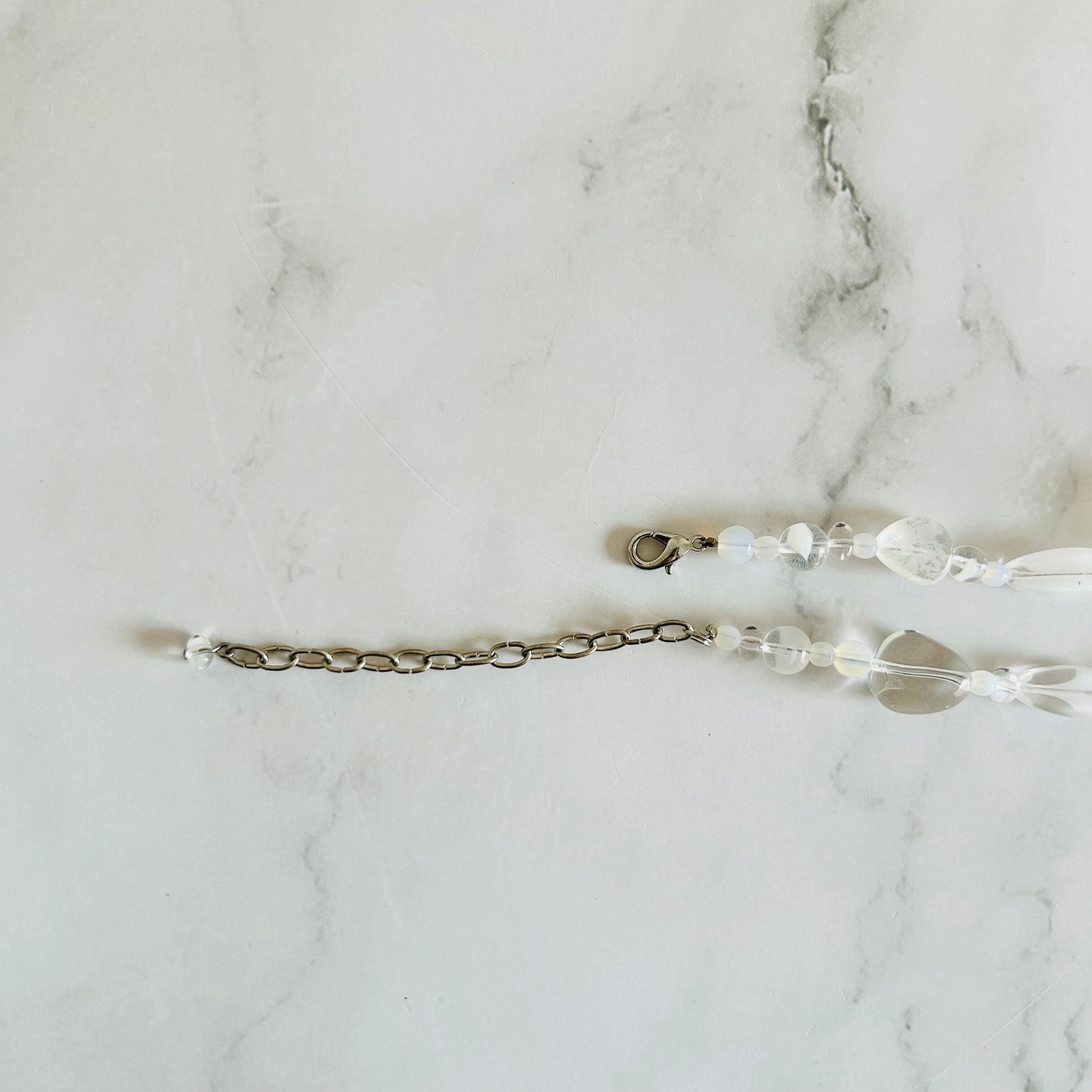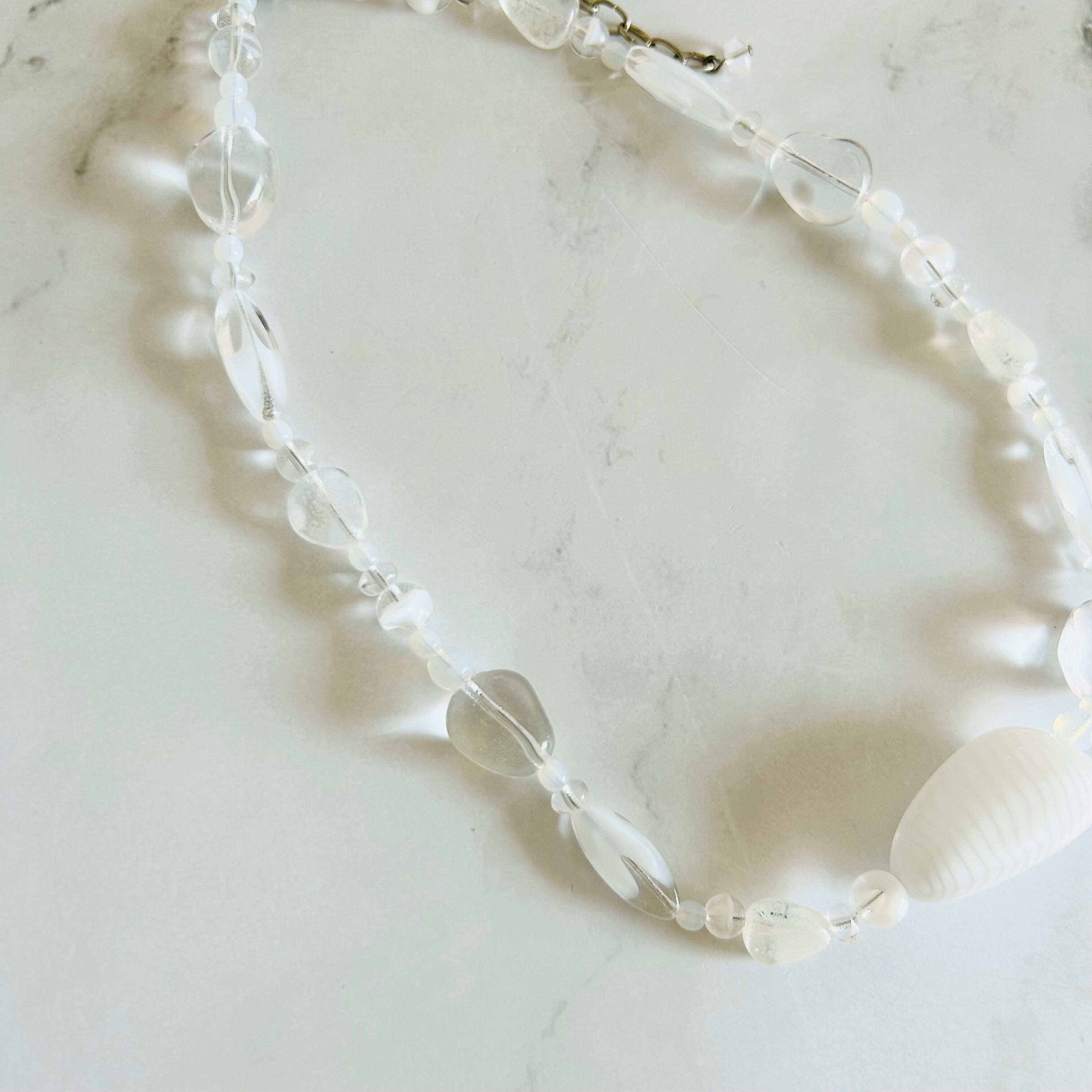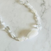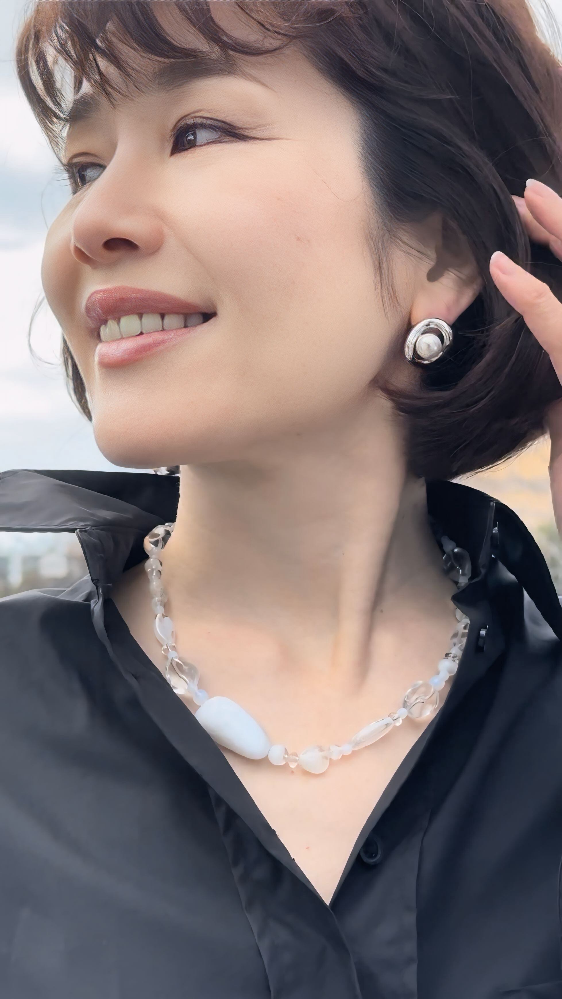 透明感のあるホワイトカラーを基調に、クリアストーンやオーロラのように光を含むストーンパーツを組み合わせ、アクセントに貝殻のようなニュアンスをもつセンターパーツをあしらったデザインのネックレスです。