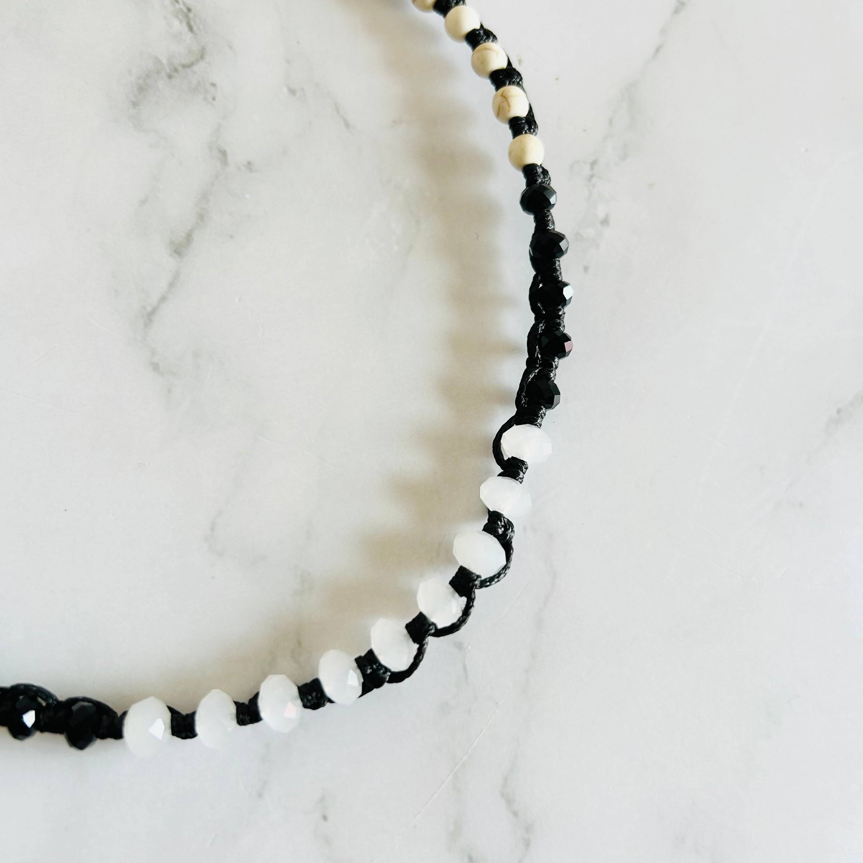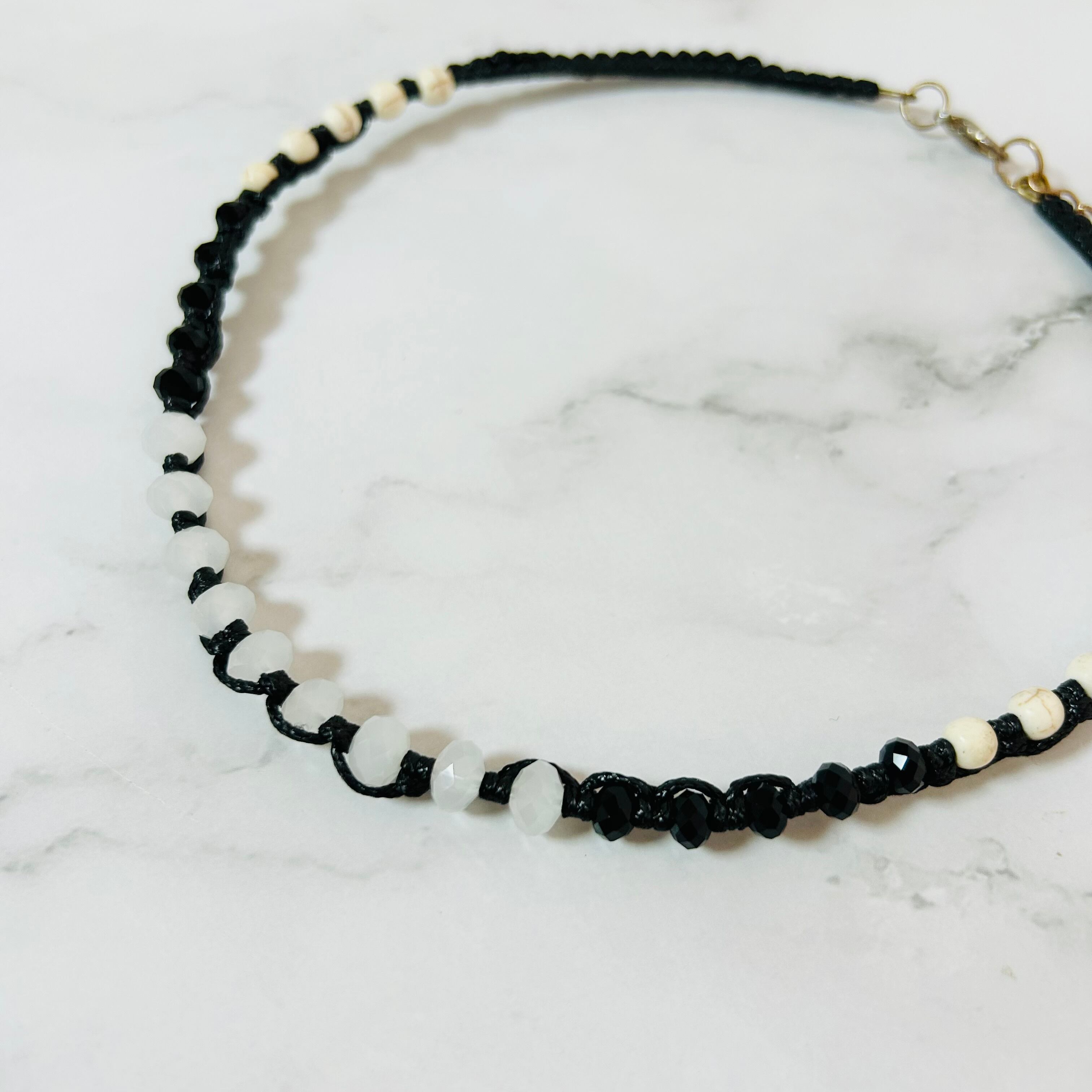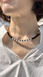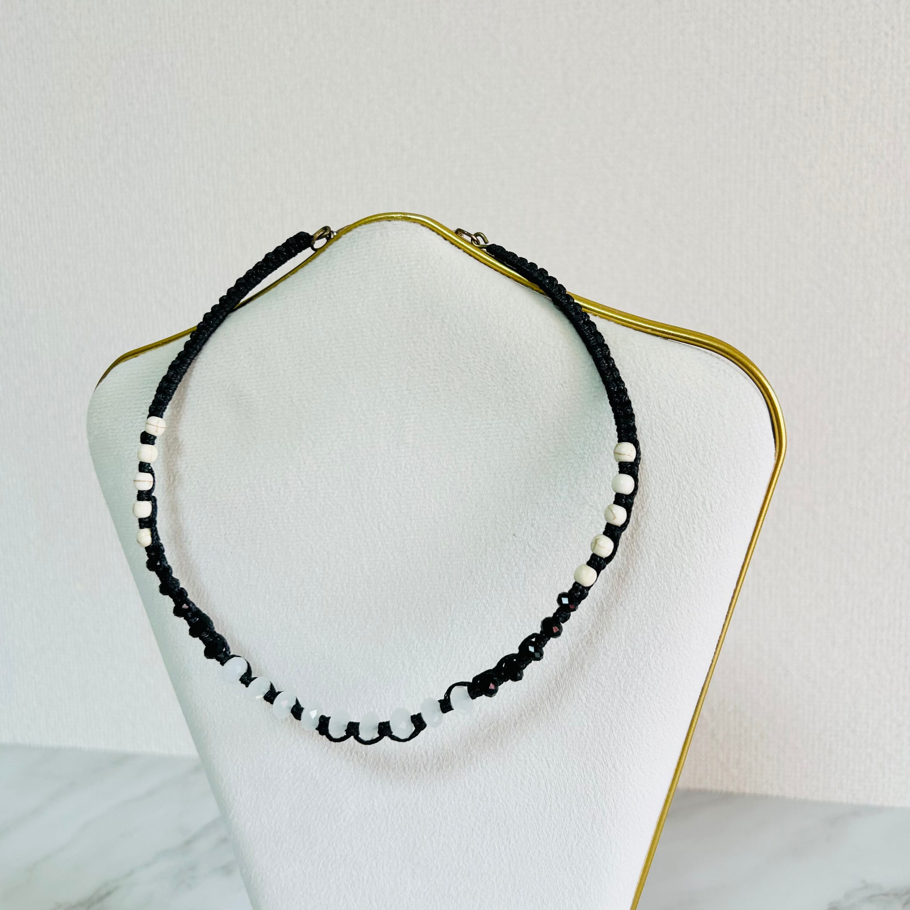マットなブラックコードをフープにデコレートし、クリアホワイトやブラックのクリスタルビーズやアイボリーのストーンを一粒ずつ丁寧に編み込んだデザインのネックレスです。