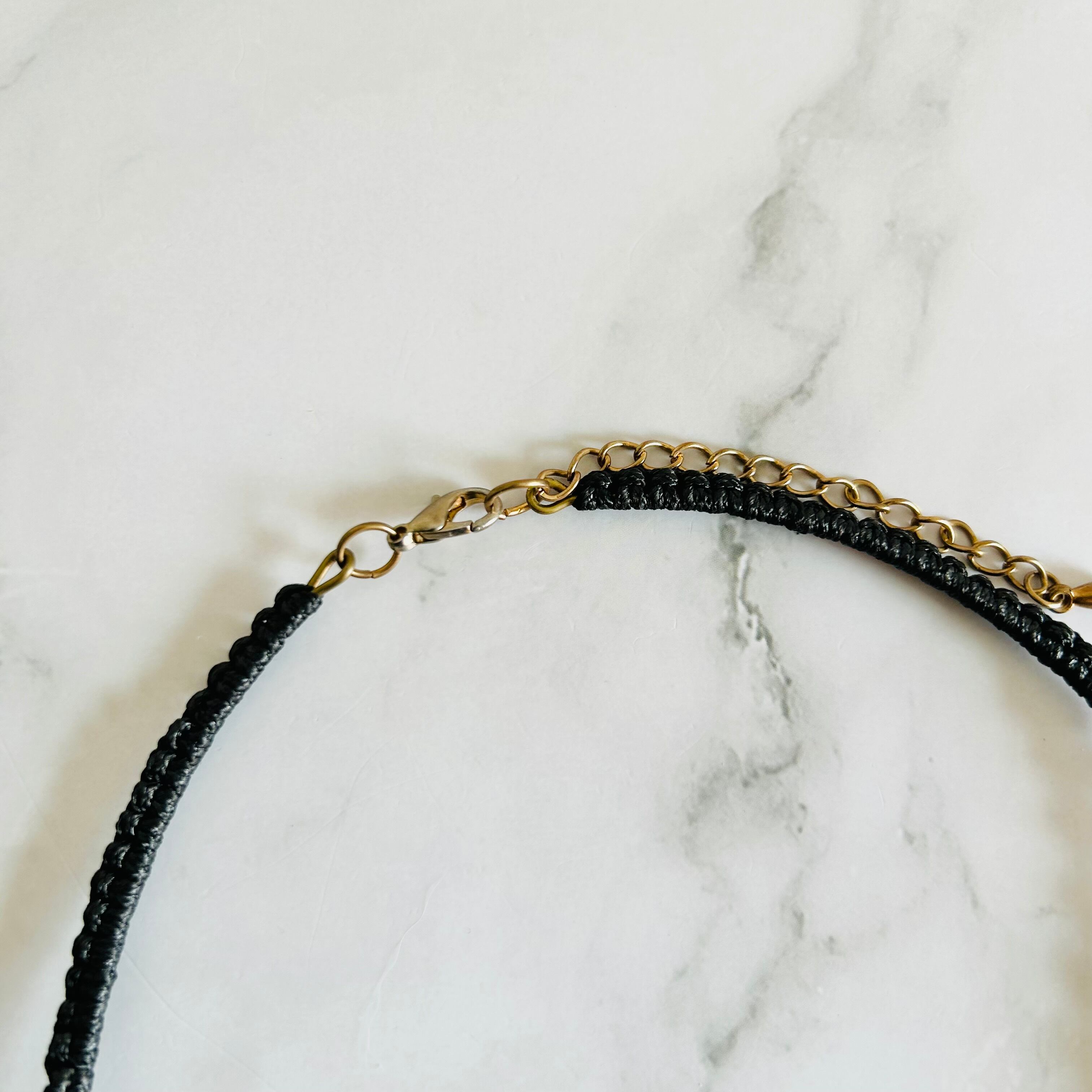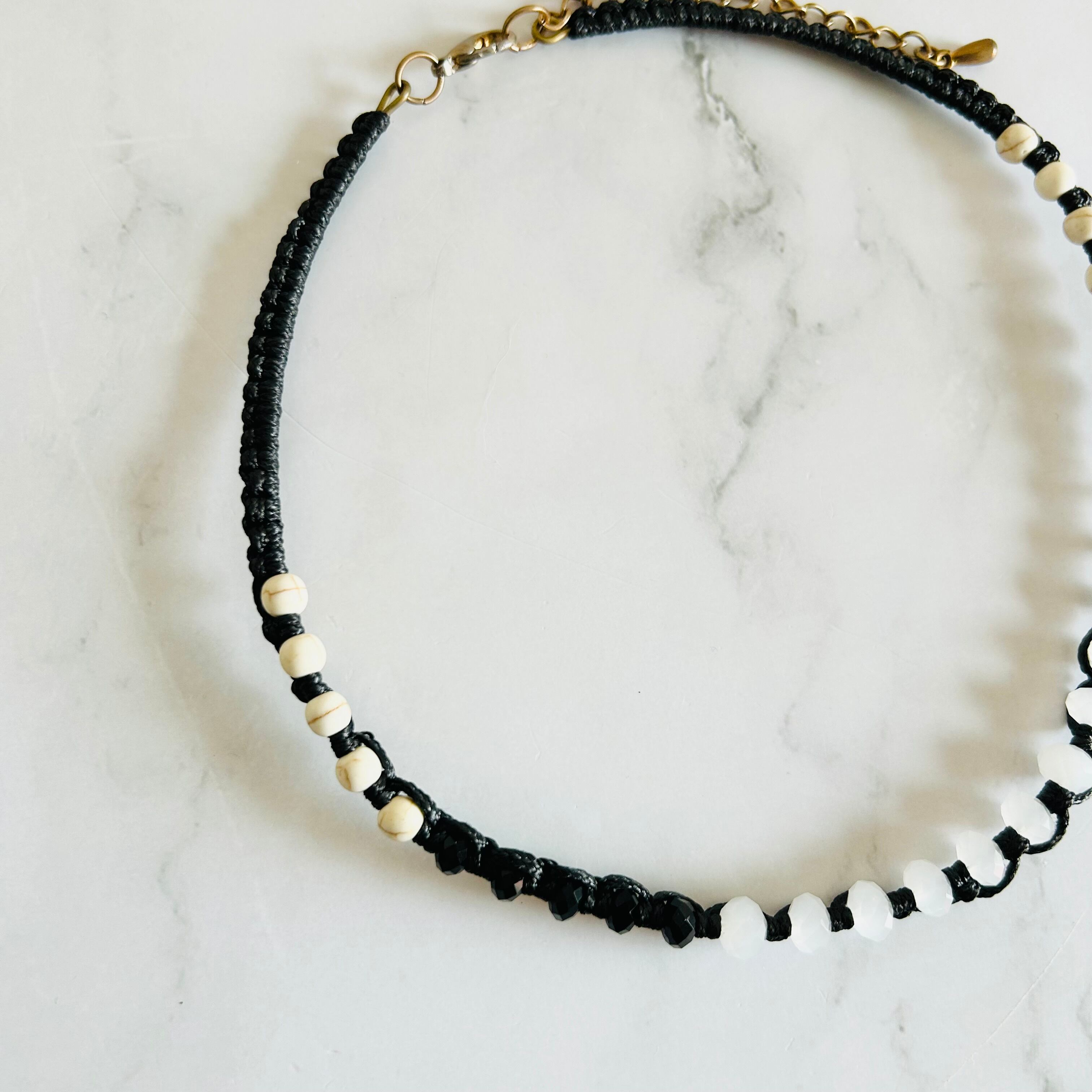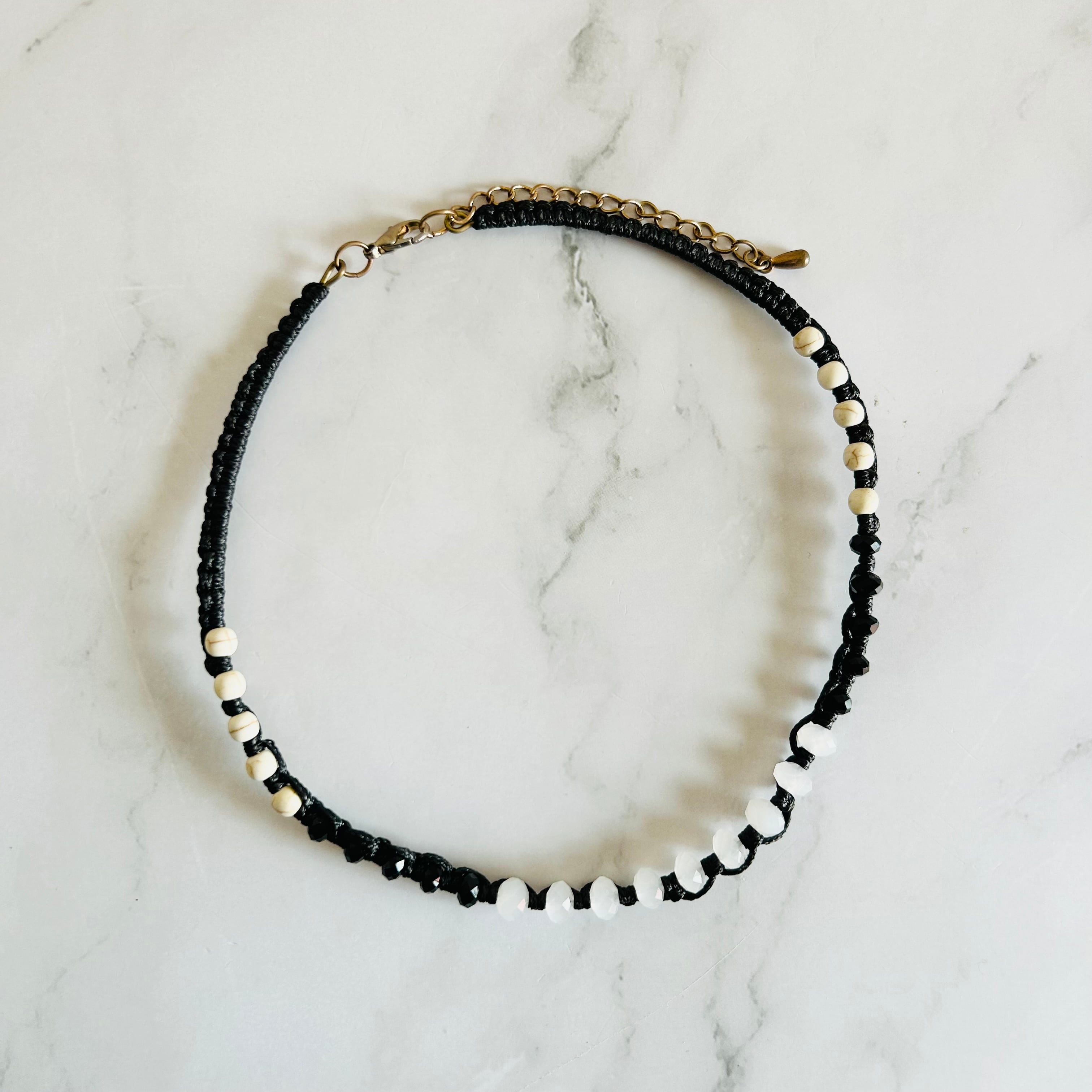 マットなブラックコードをフープにデコレートし、クリアホワイトやブラックのクリスタルビーズやアイボリーのストーンを一粒ずつ丁寧に編み込んだデザインのネックレスです。