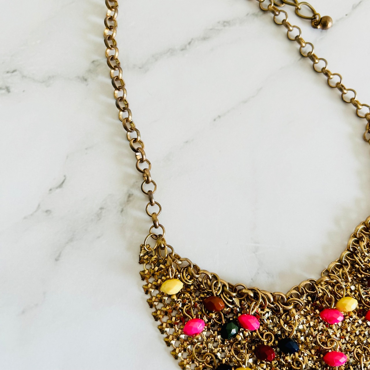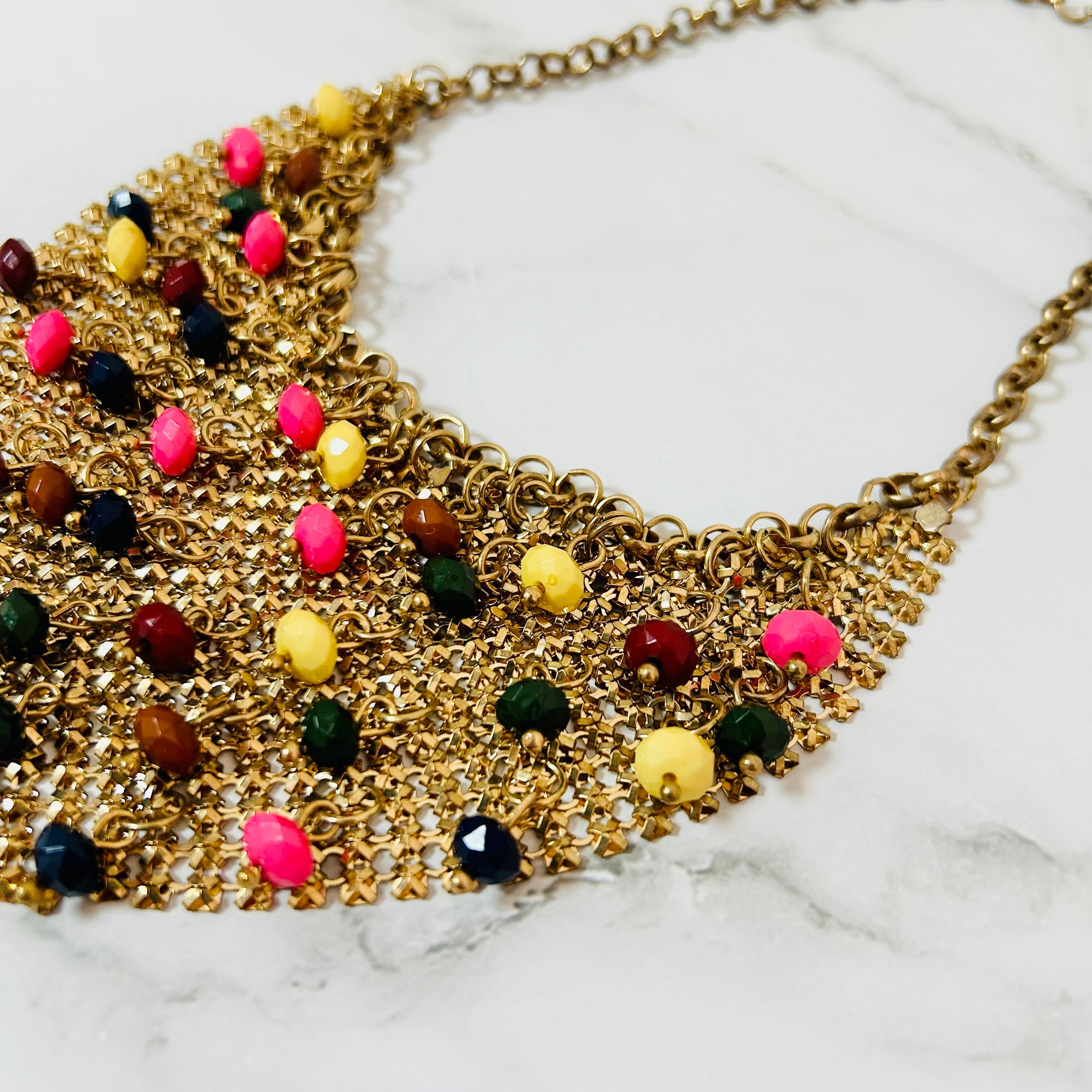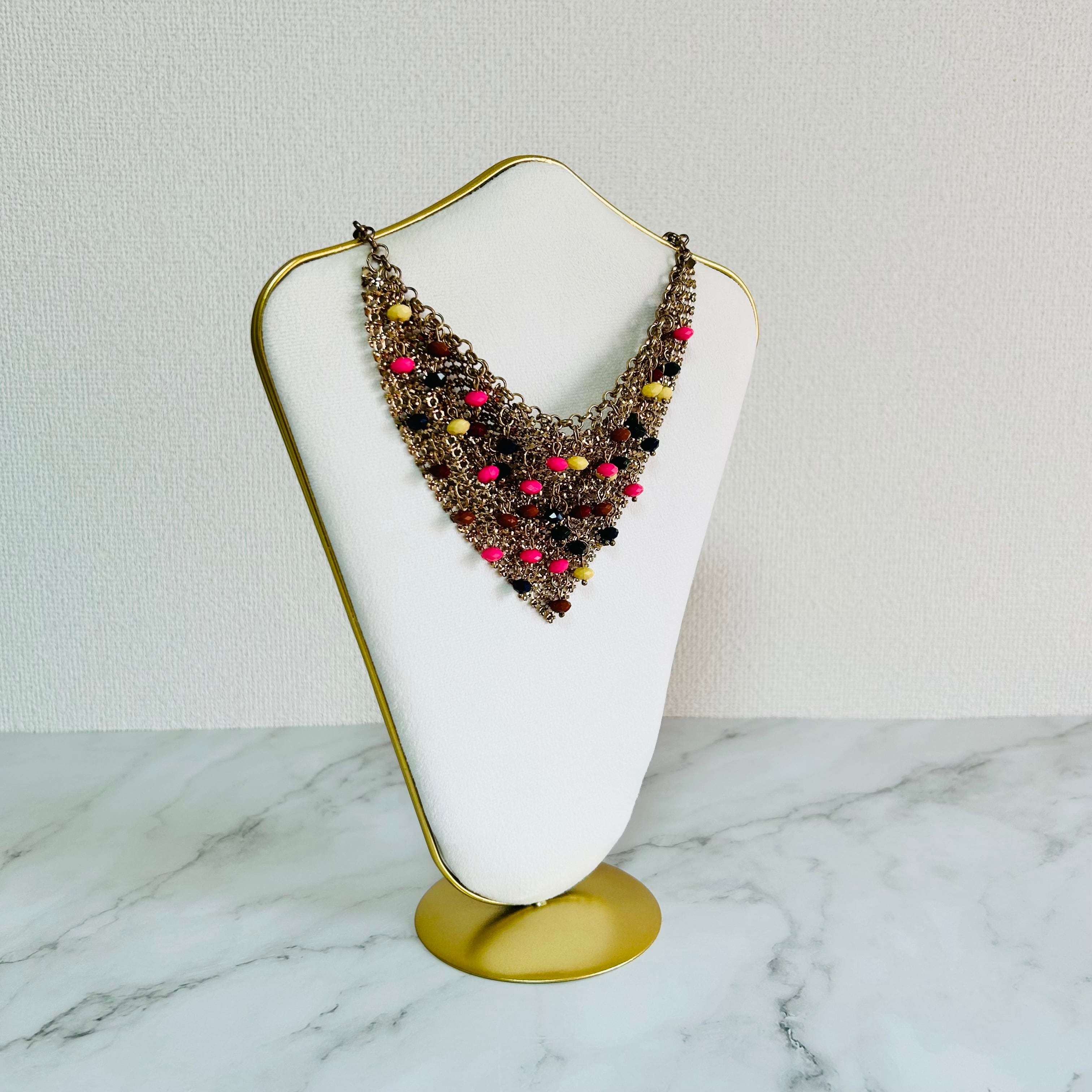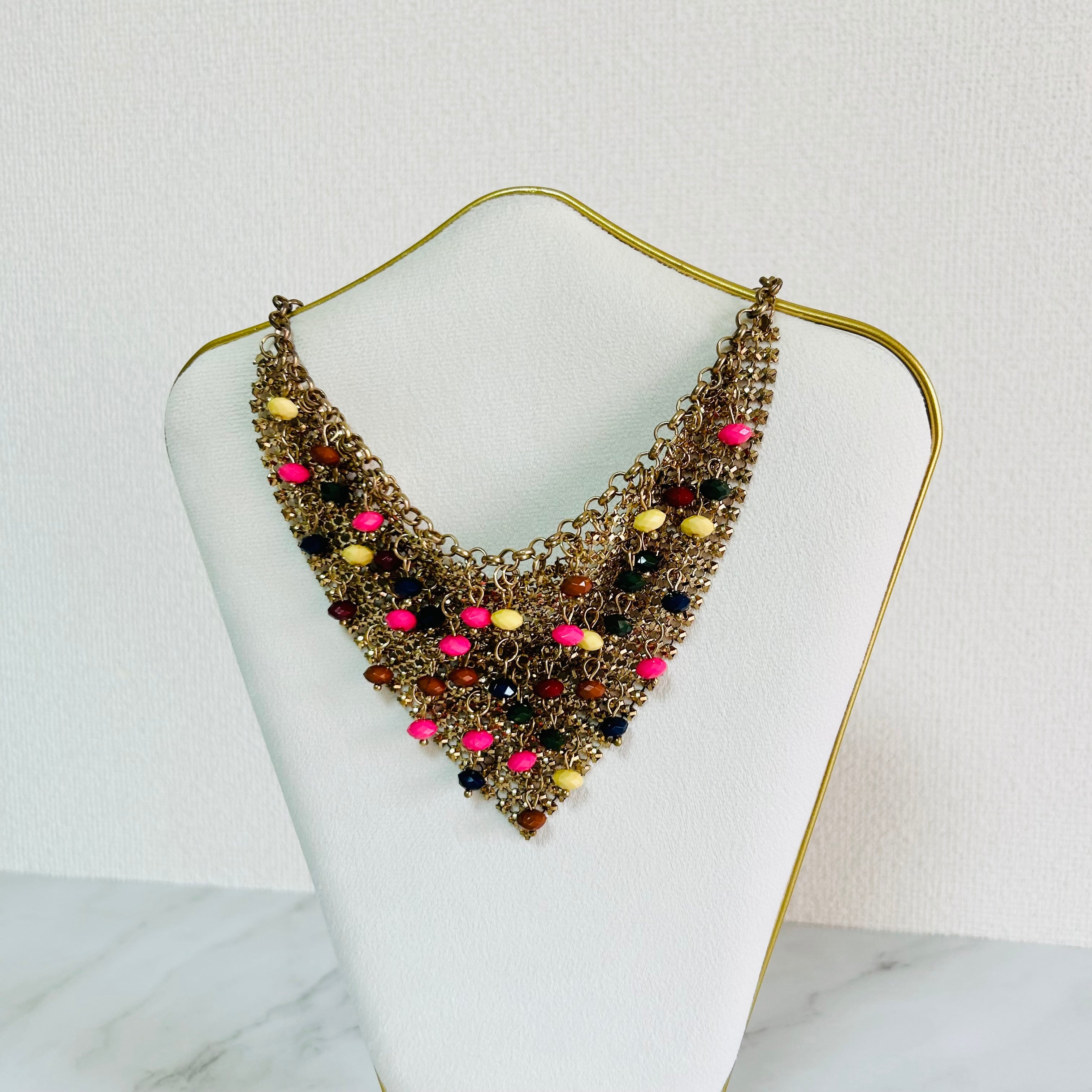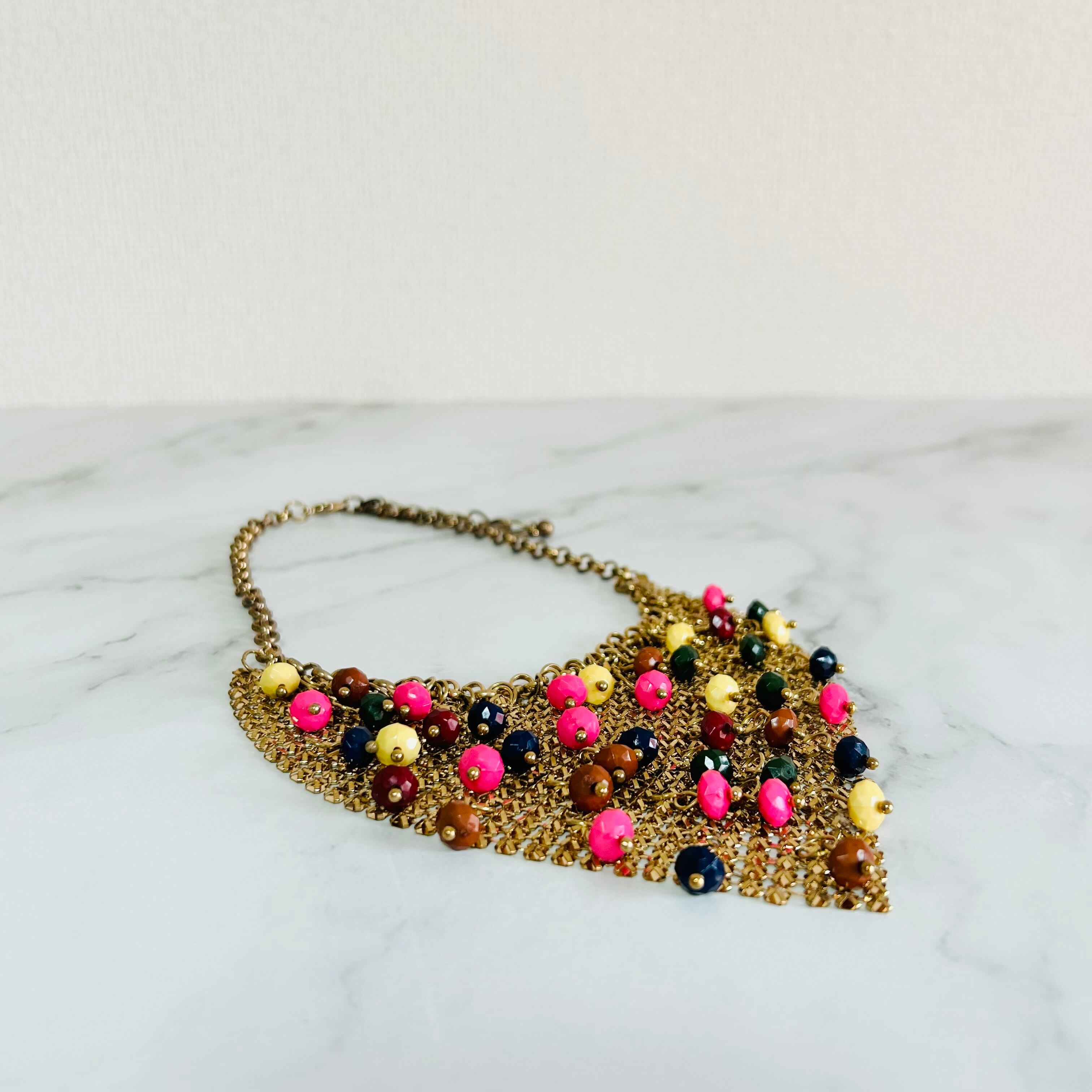 アンティークゴールドのメッシュチェーンに、ピンク・イエロー・ブラウン・グリーンなど多彩なビーズを丁寧に編み込んだ、華やかで存在感のあるネックレスです。