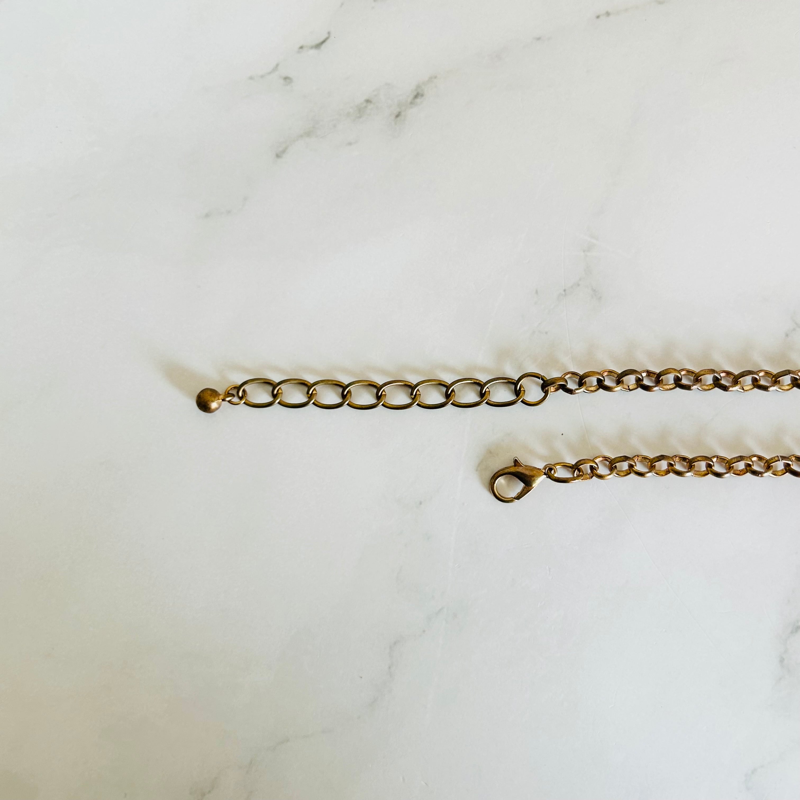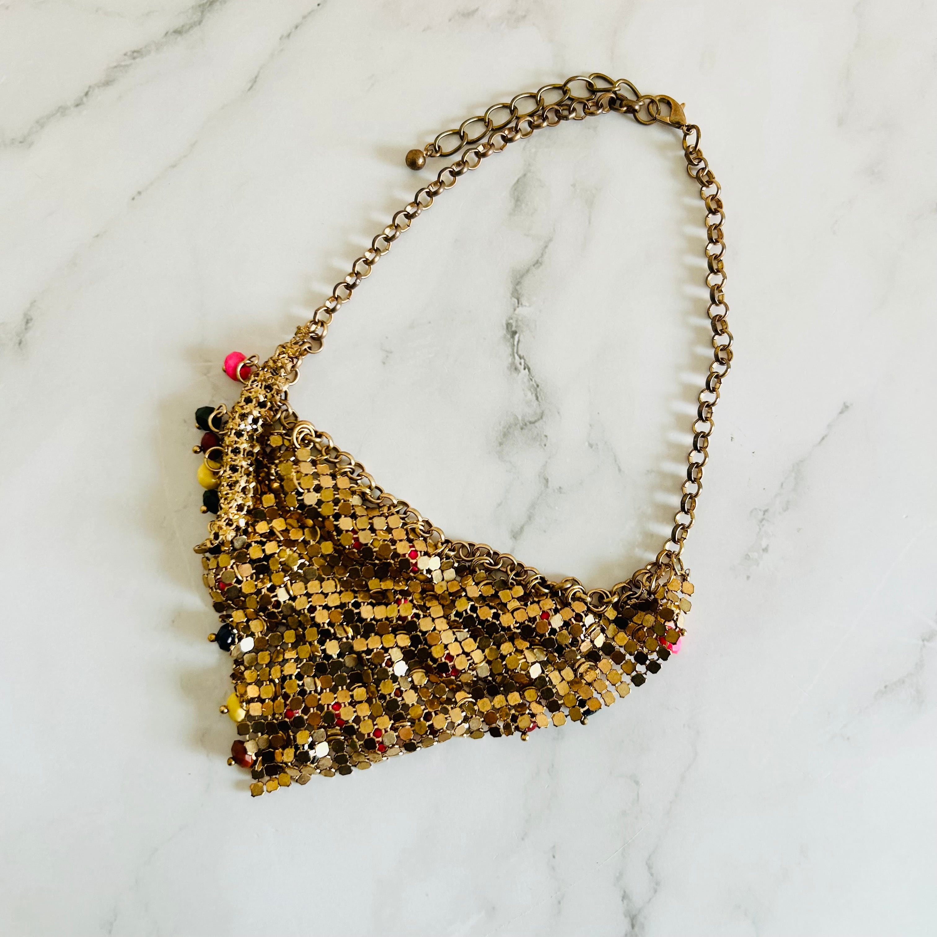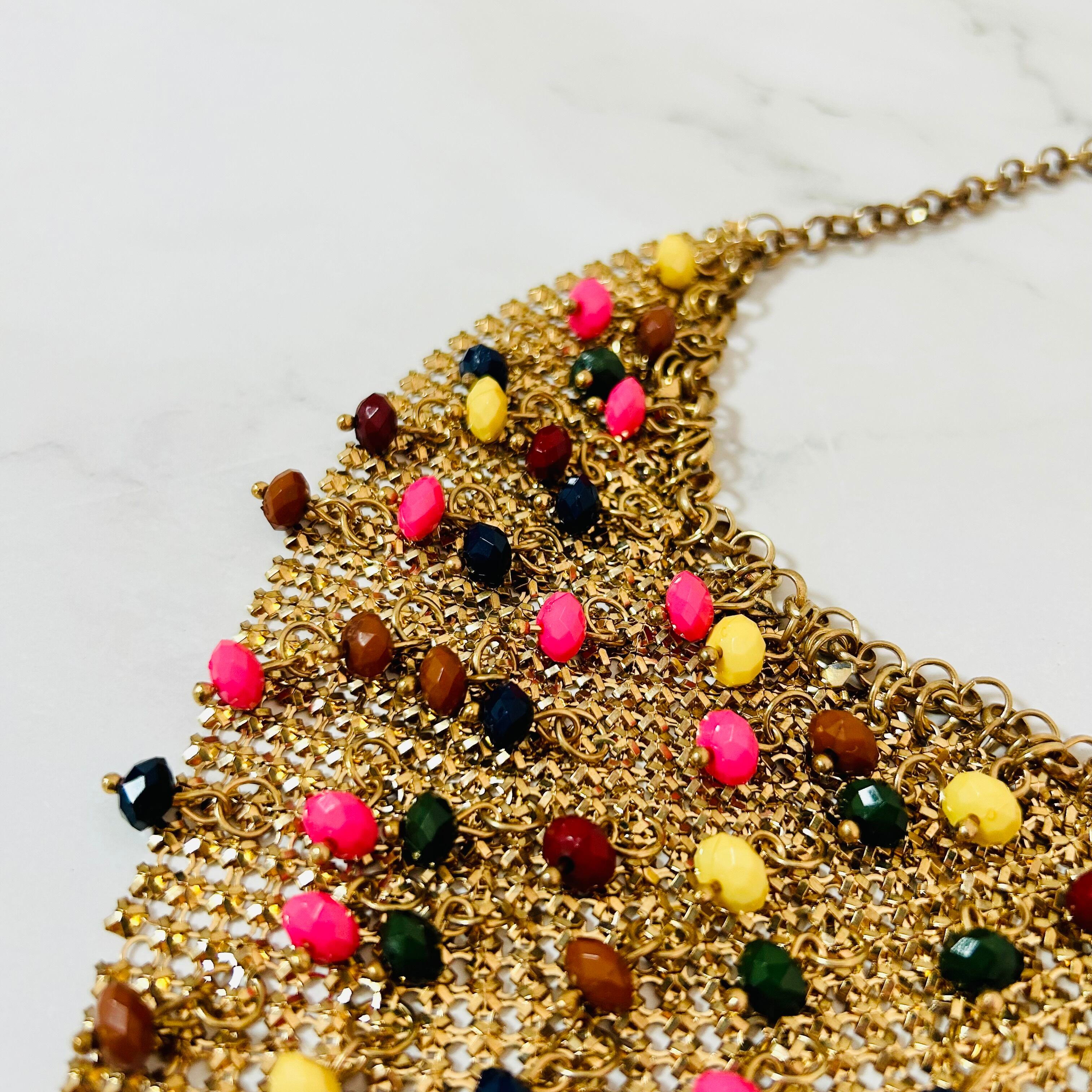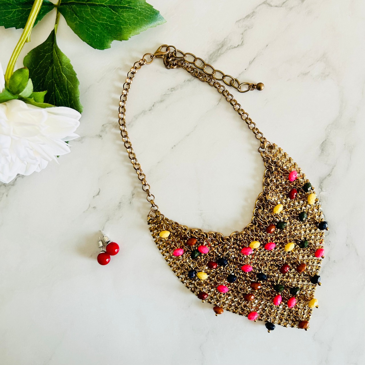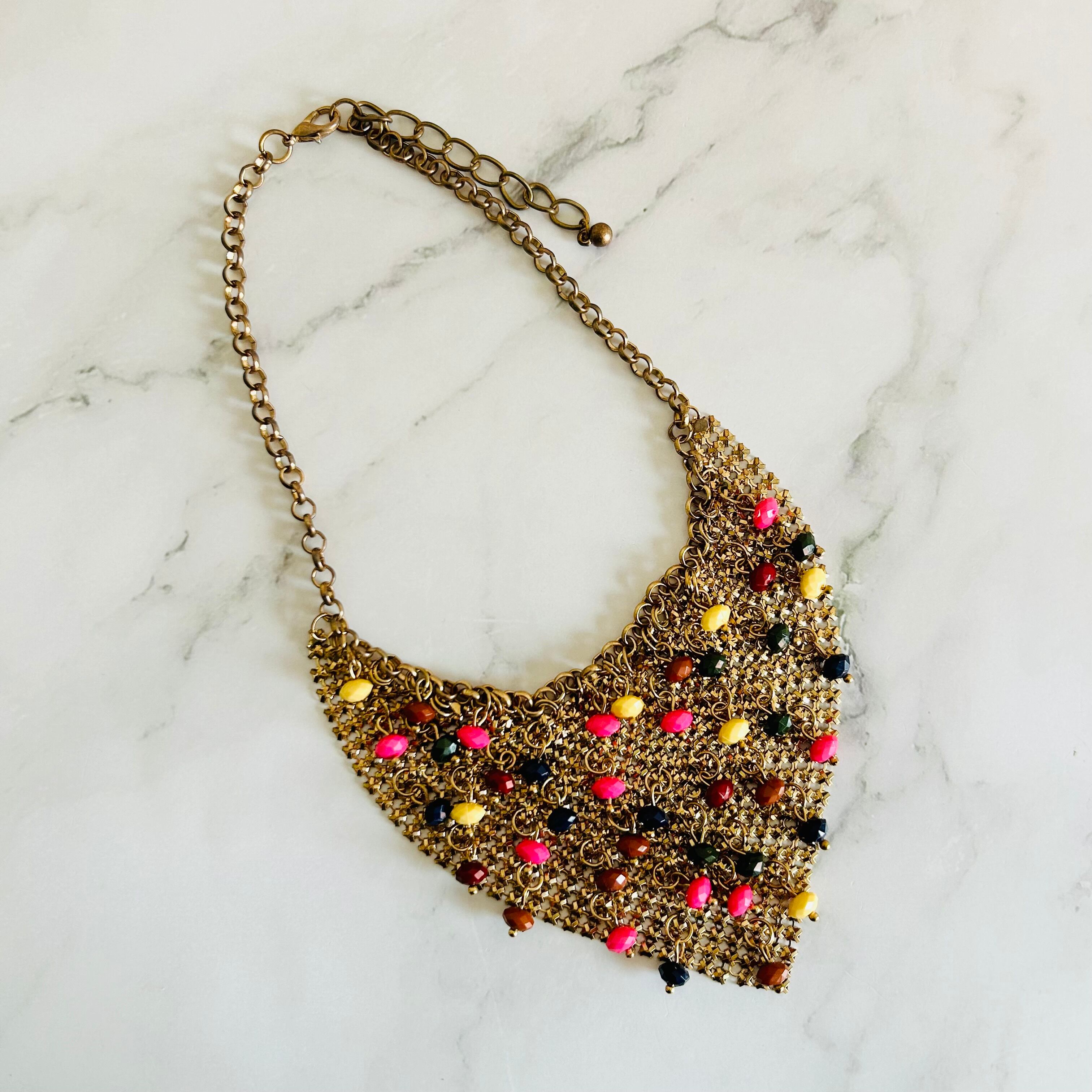 アンティークゴールドのメッシュチェーンに、ピンク・イエロー・ブラウン・グリーンなど多彩なビーズを丁寧に編み込んだ、華やかで存在感のあるネックレスです。