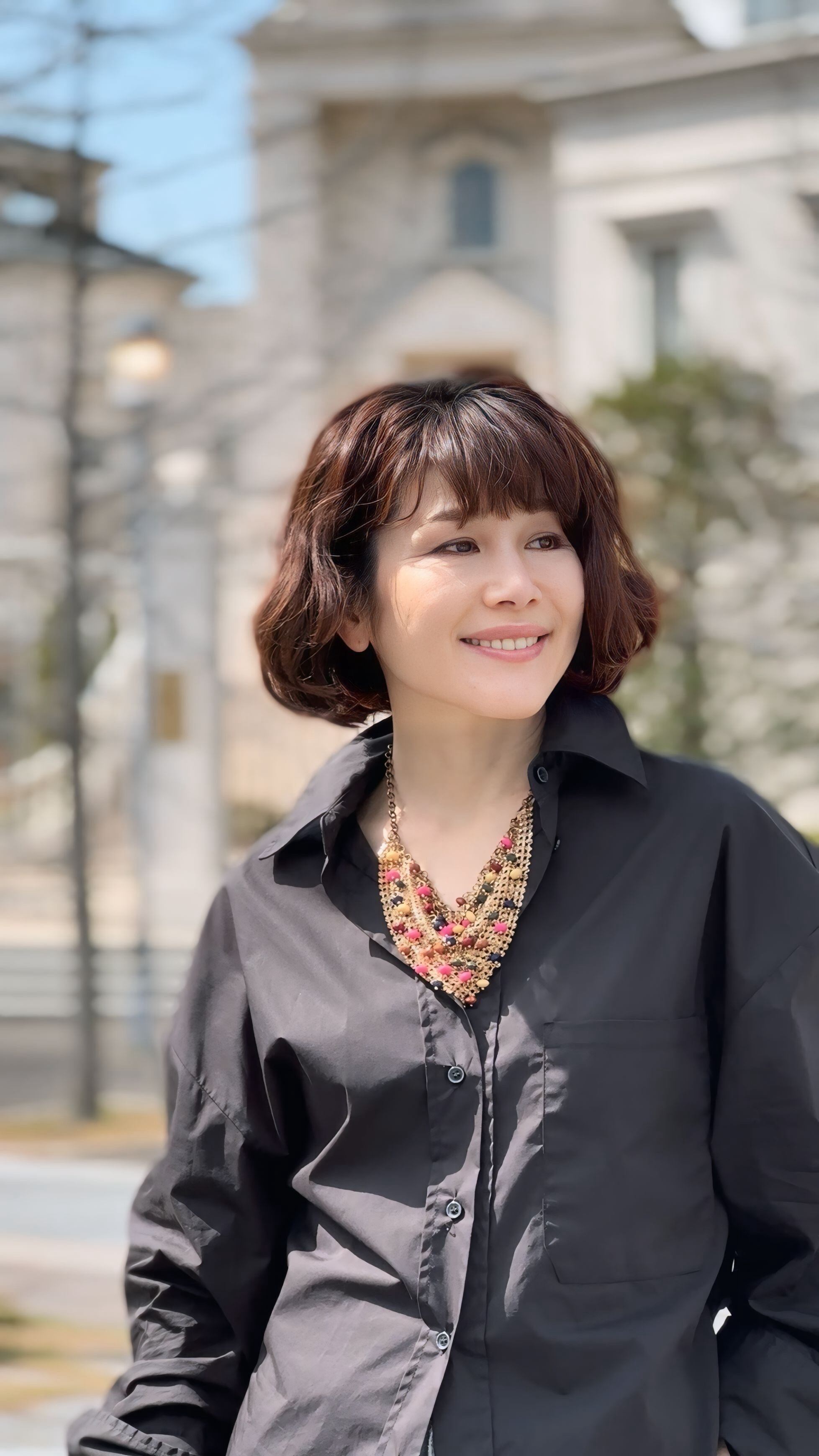 ブラックやネイビーなど落ち着いたカラーに合わせると、ネックレスの彩りが一層映えますヨ!