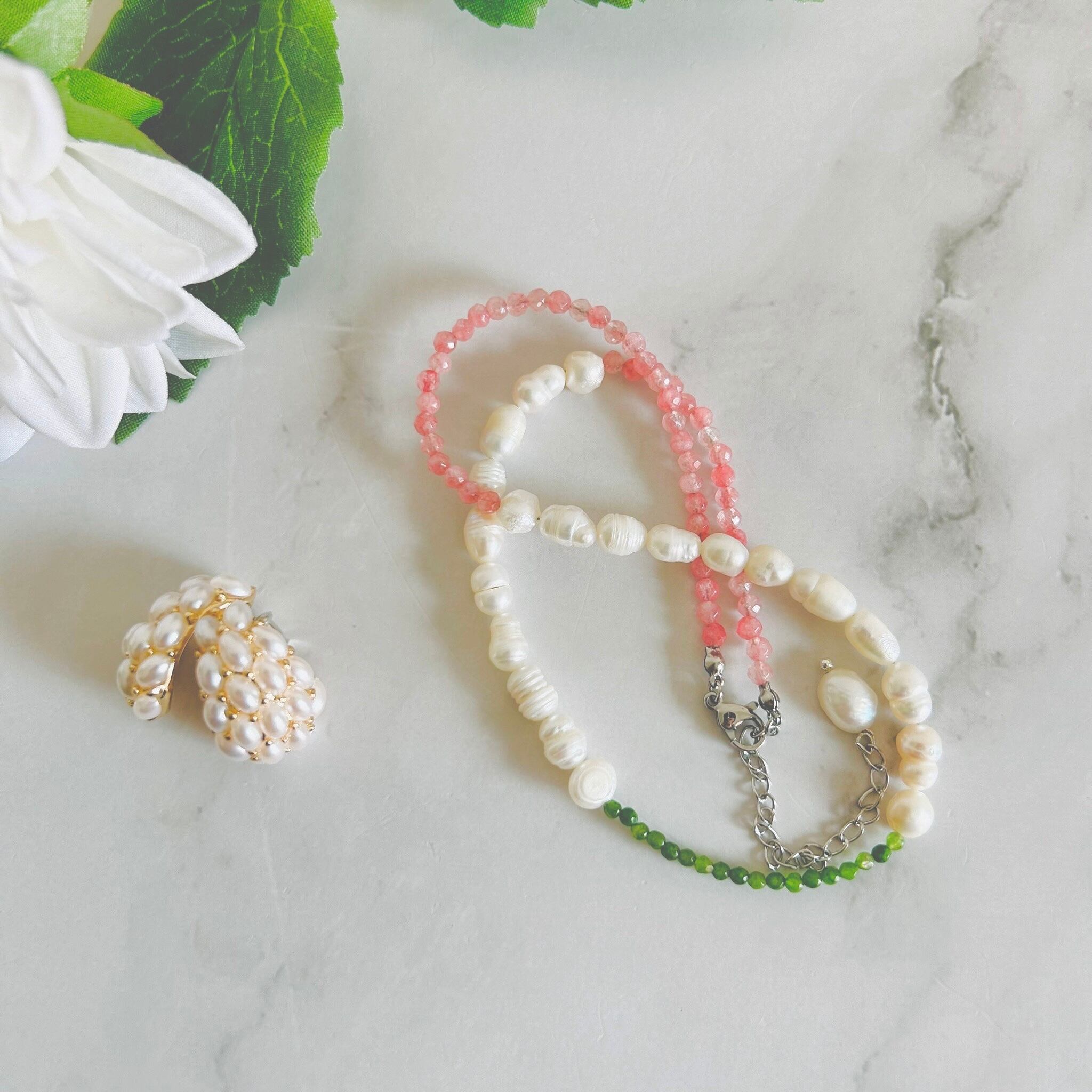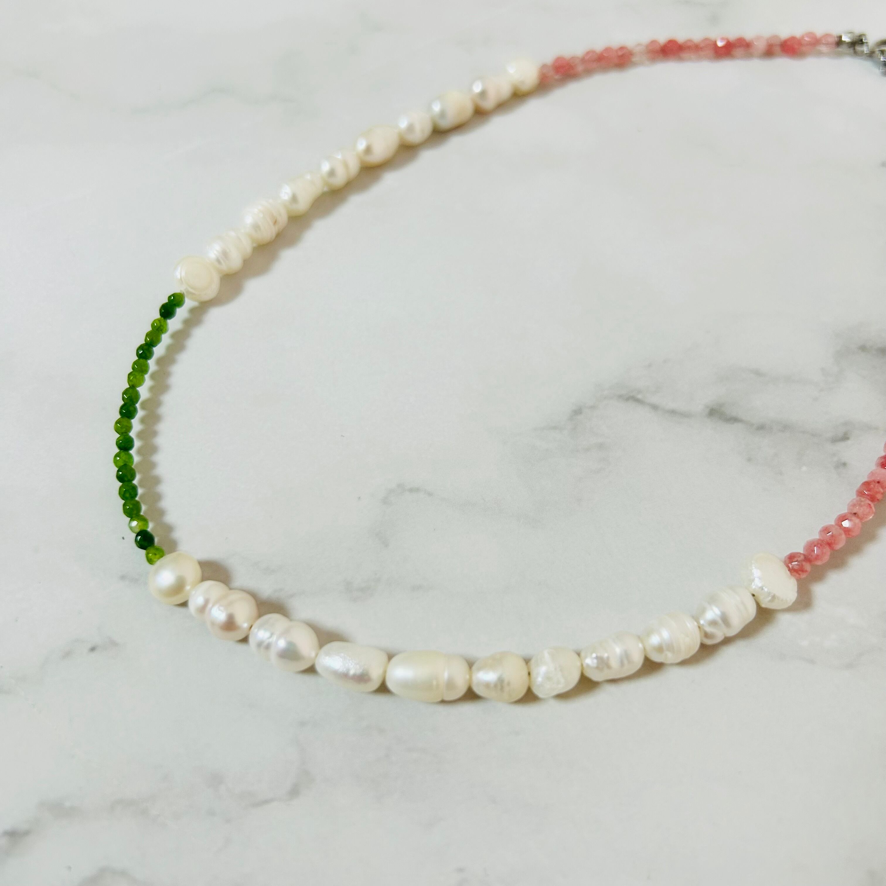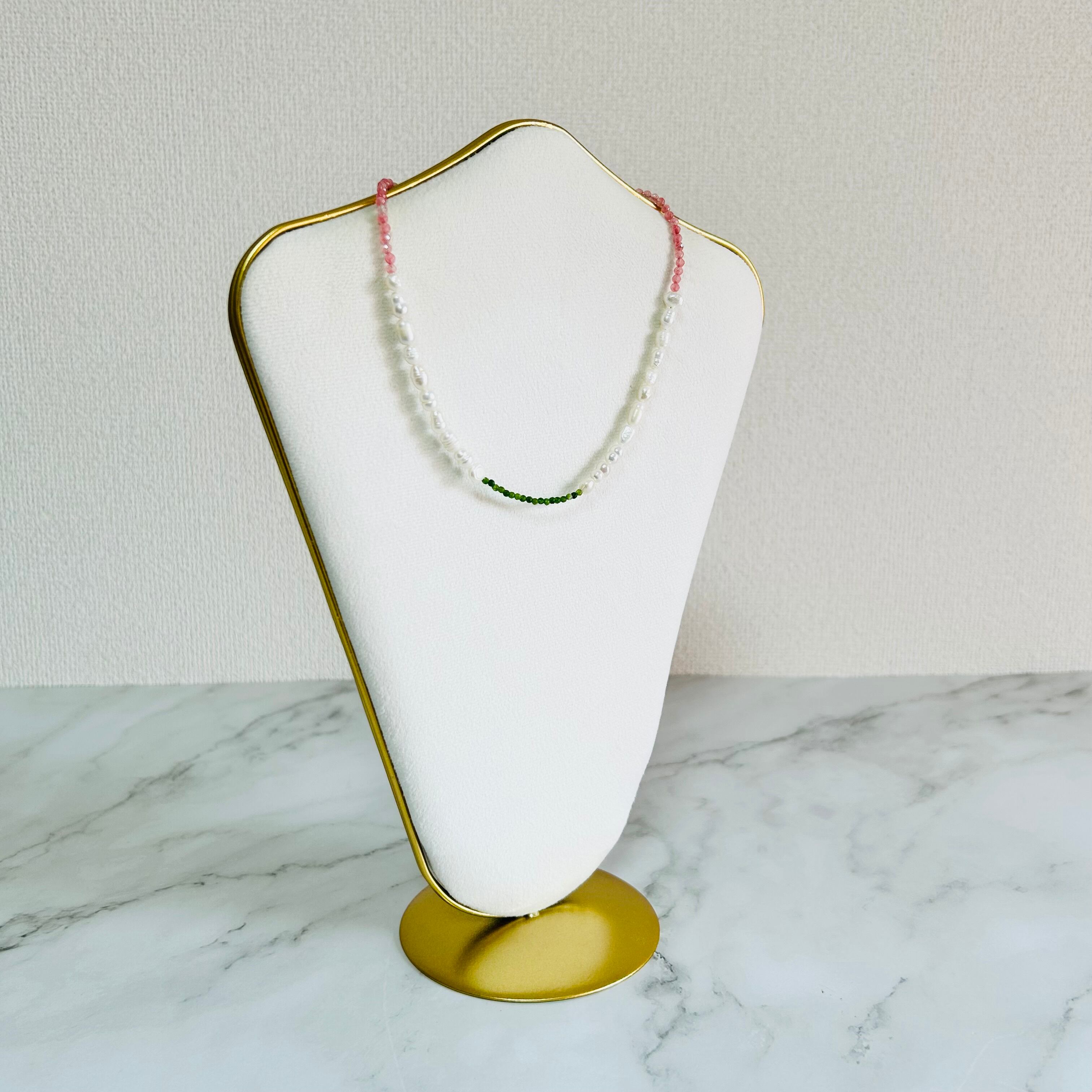 淡いピンクとグリーンの天然石ビーズ、そして上品な艶感をもつ天然淡水パールを組み合わせた、軽やかで可憐な印象のネックレスです。
