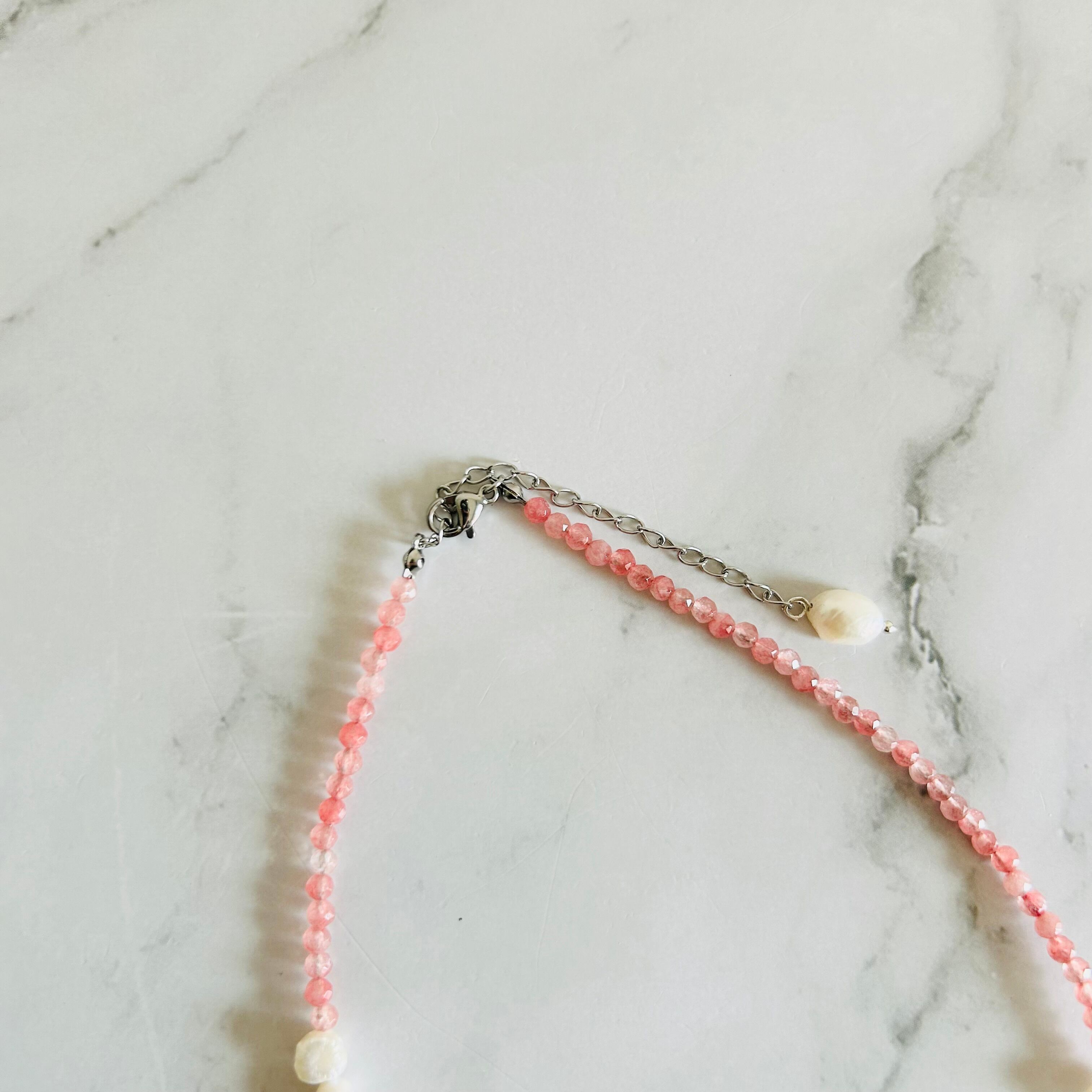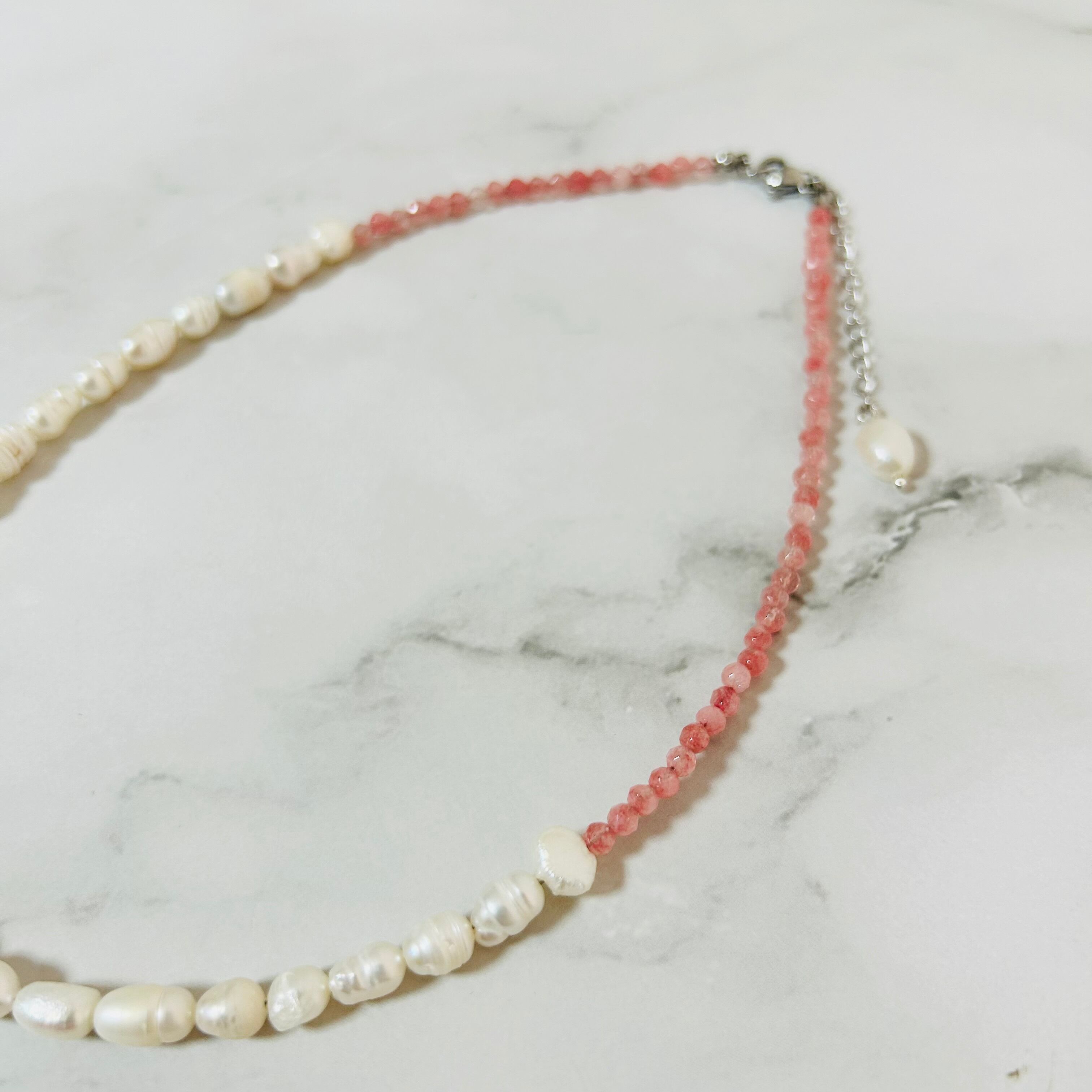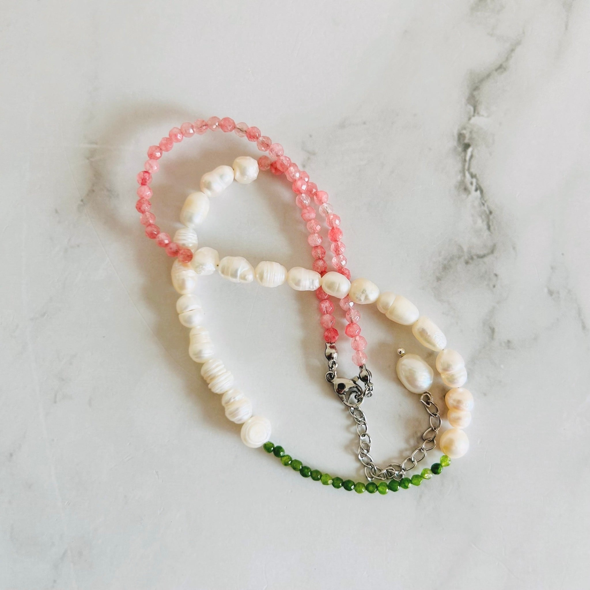 淡いピンクとグリーンの天然石ビーズ、そして上品な艶感をもつ天然淡水パールを組み合わせた、軽やかで可憐な印象のネックレスです。