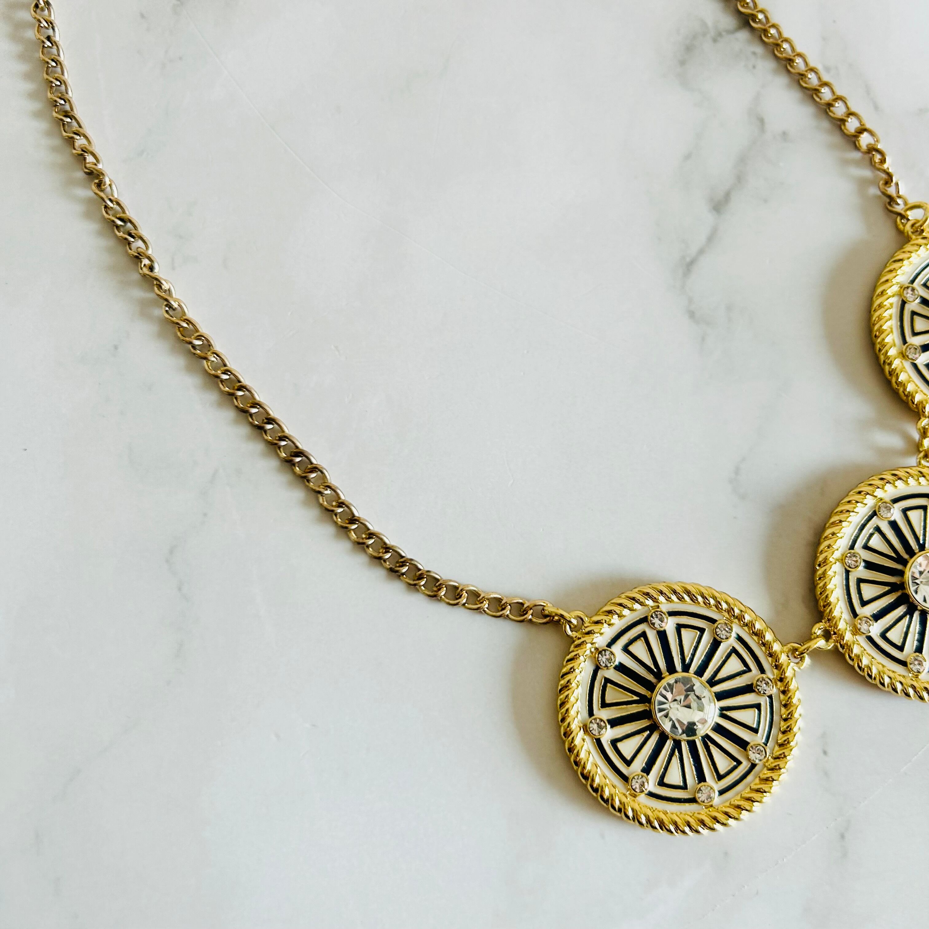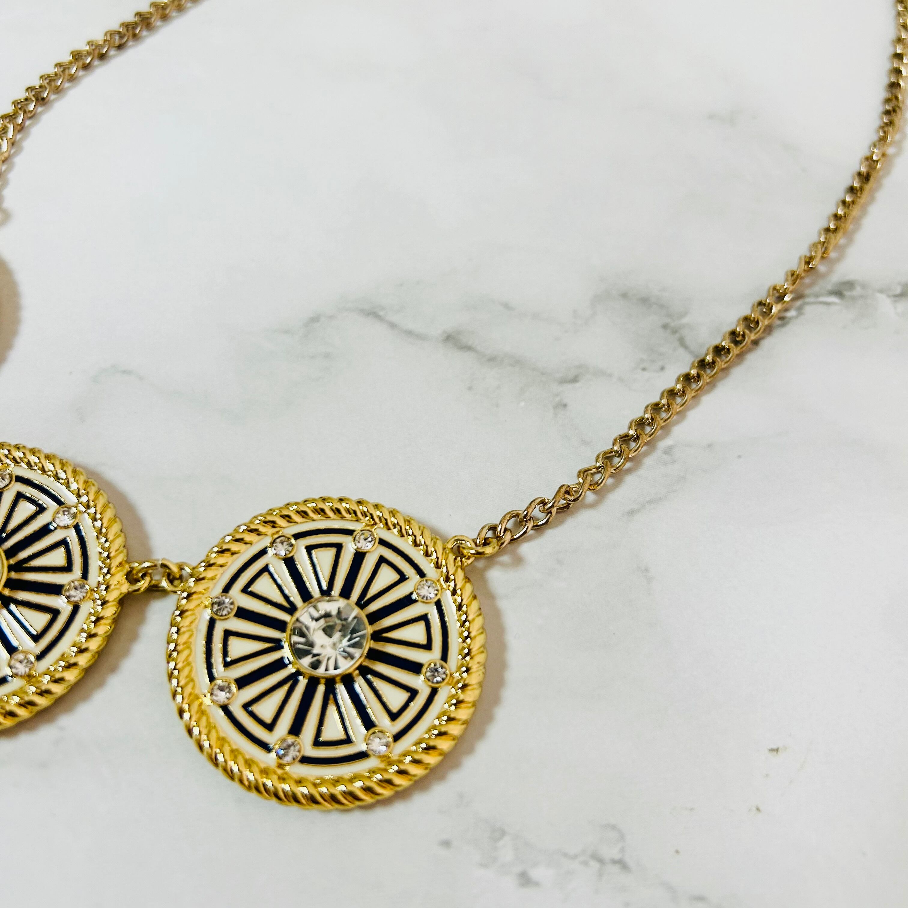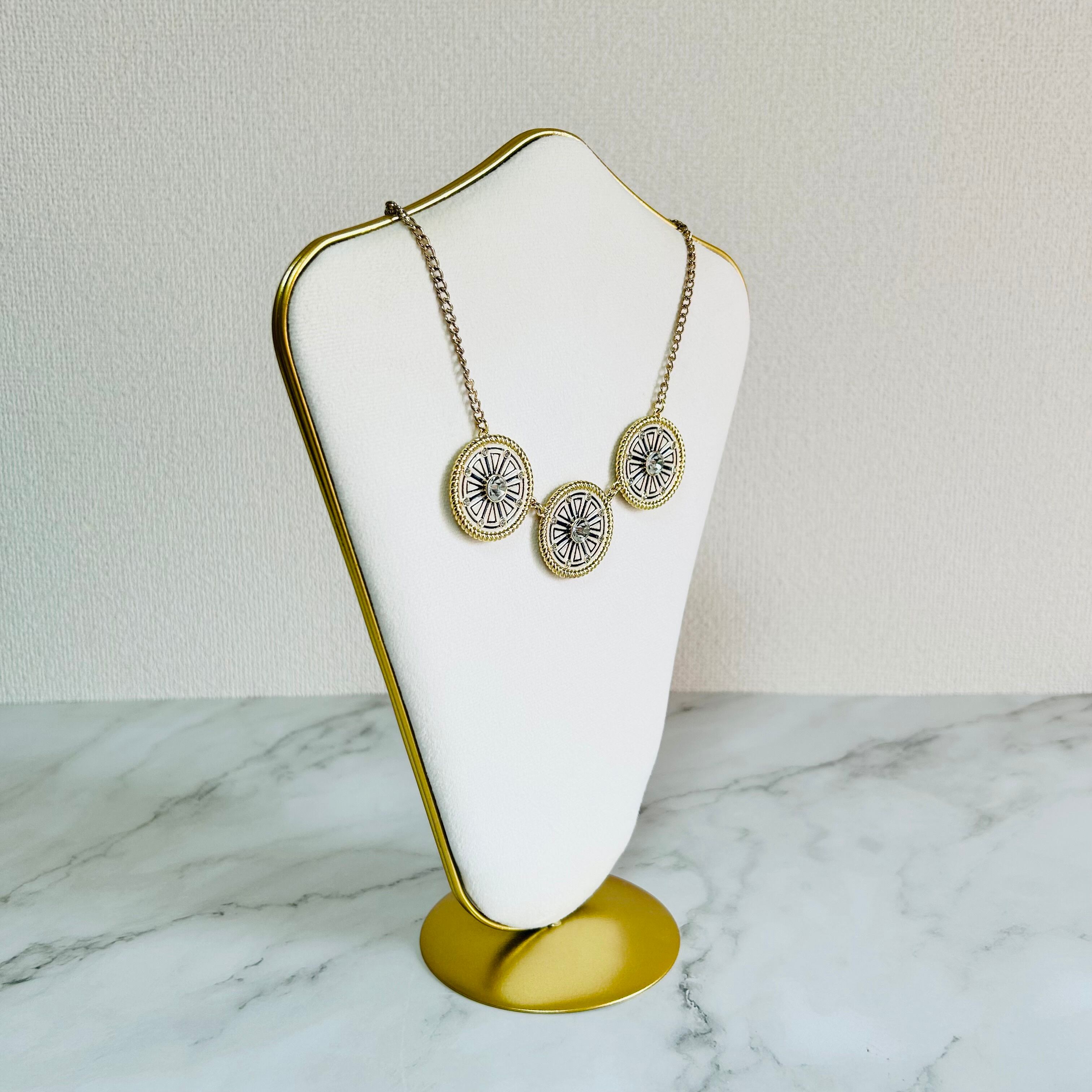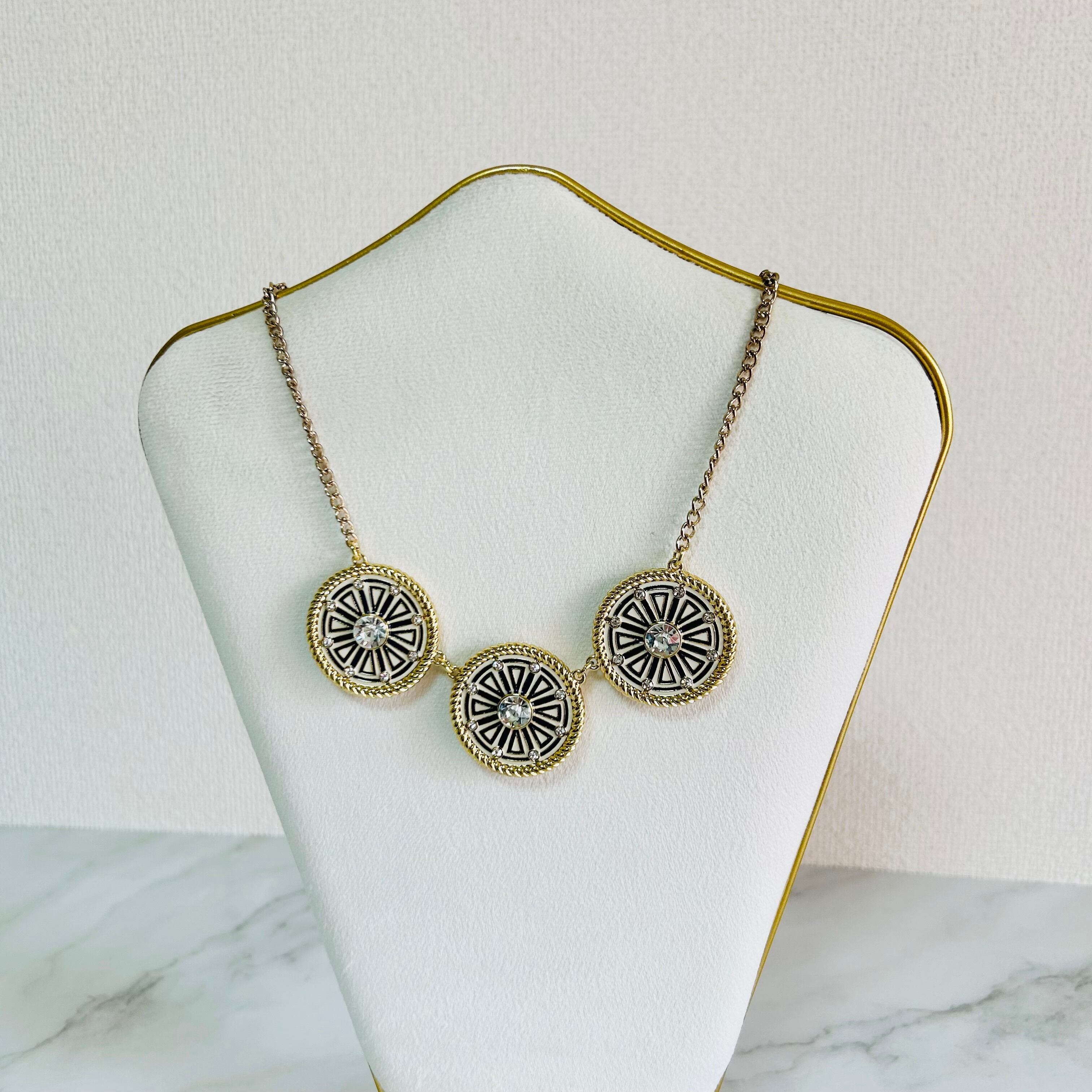 ゴールドのロープ風フレームとクリアストーンをあしらった、目を惹くサークル型パーツがクラシカルでインパクトのあるネックレスです。