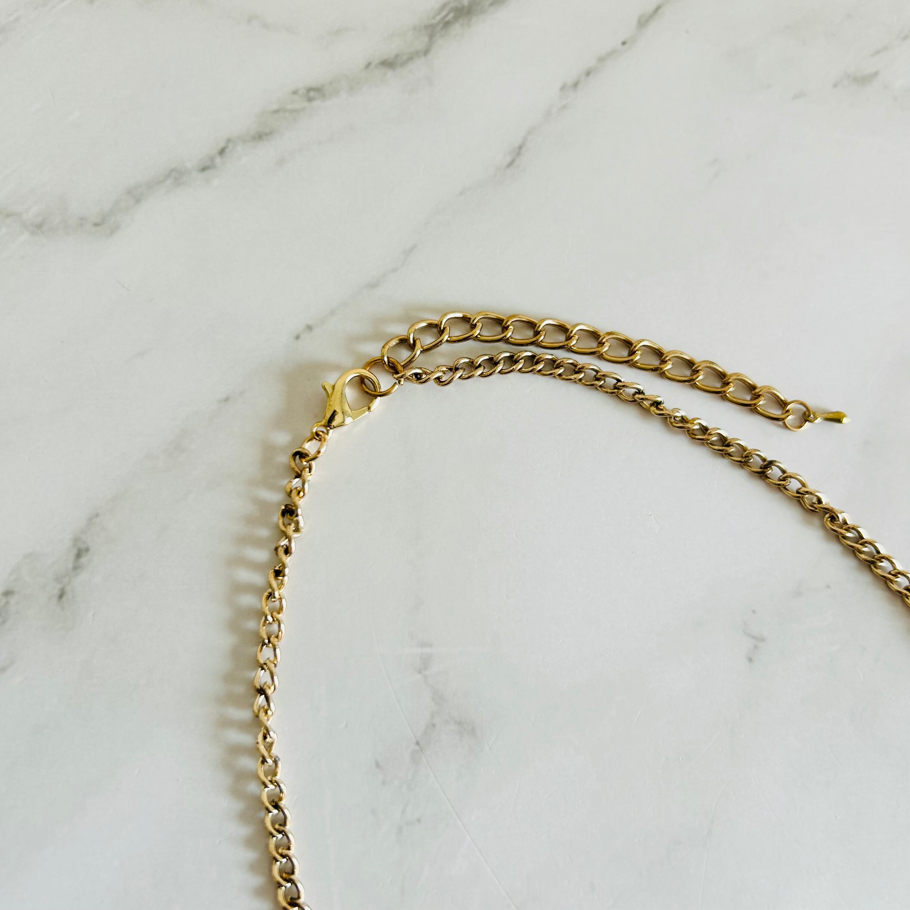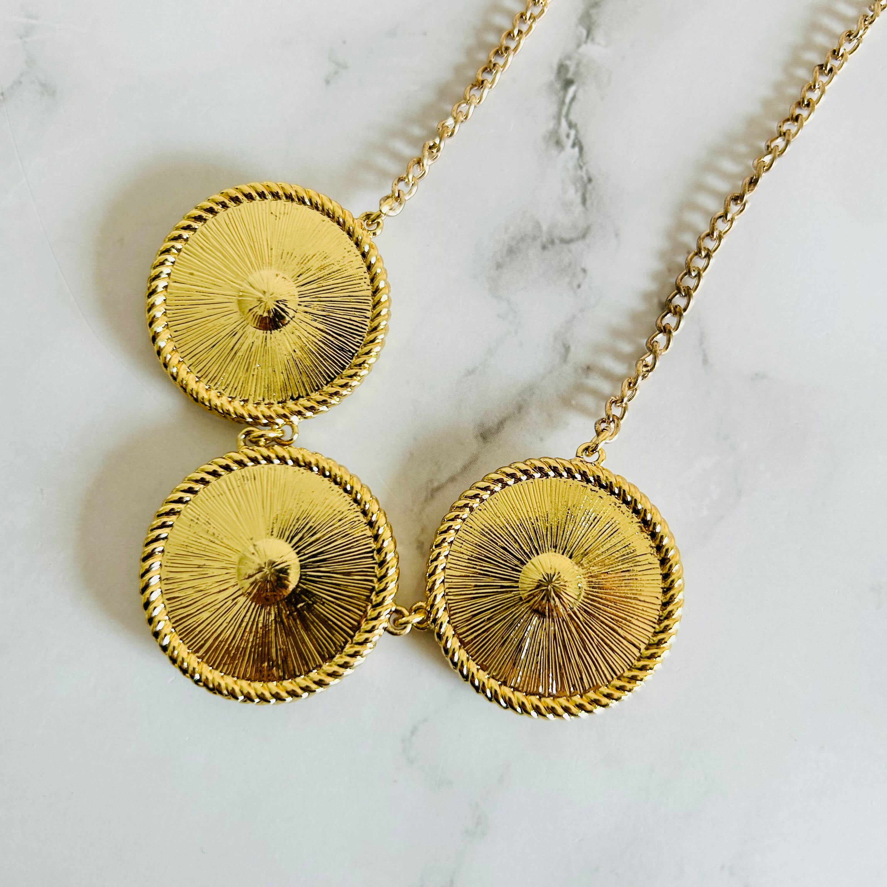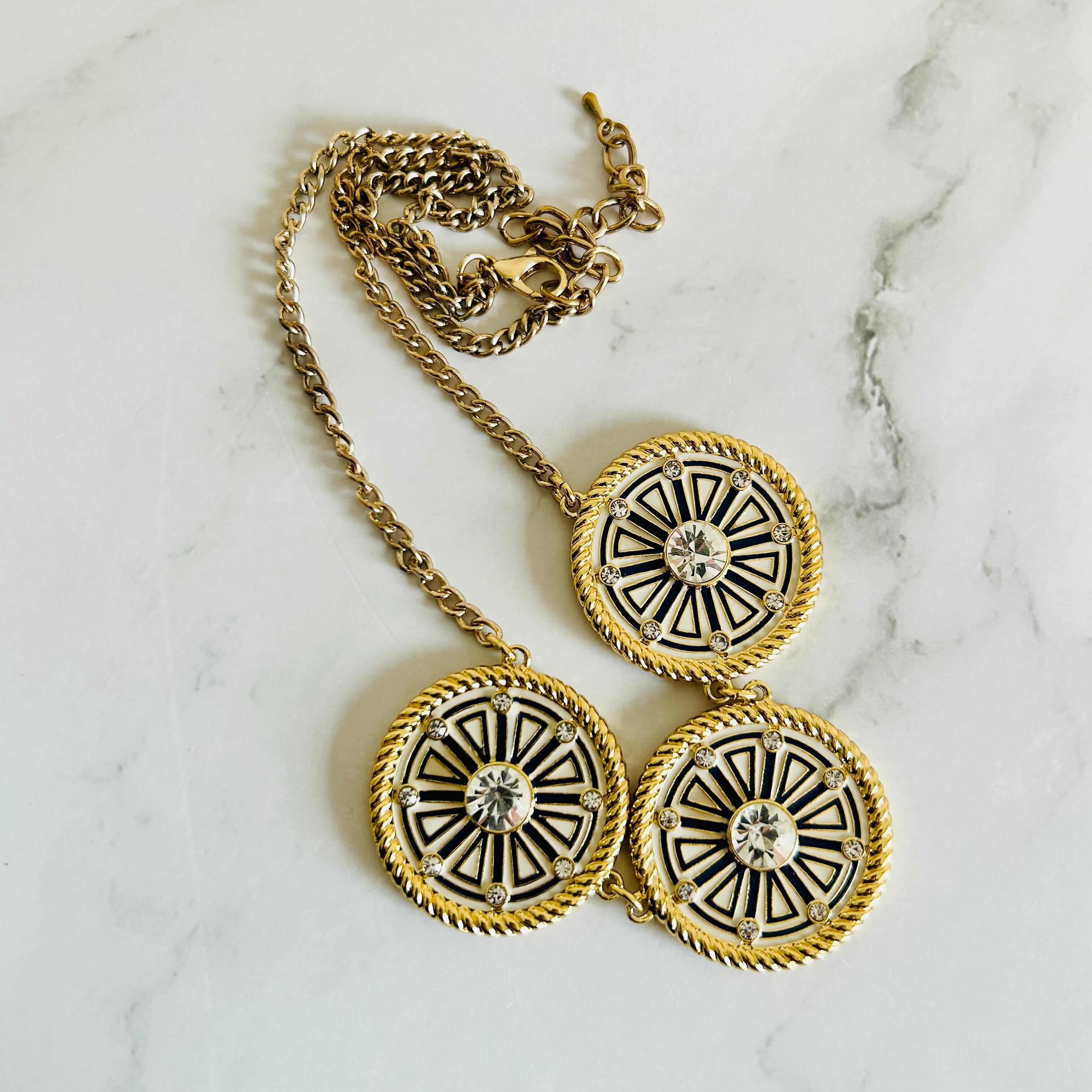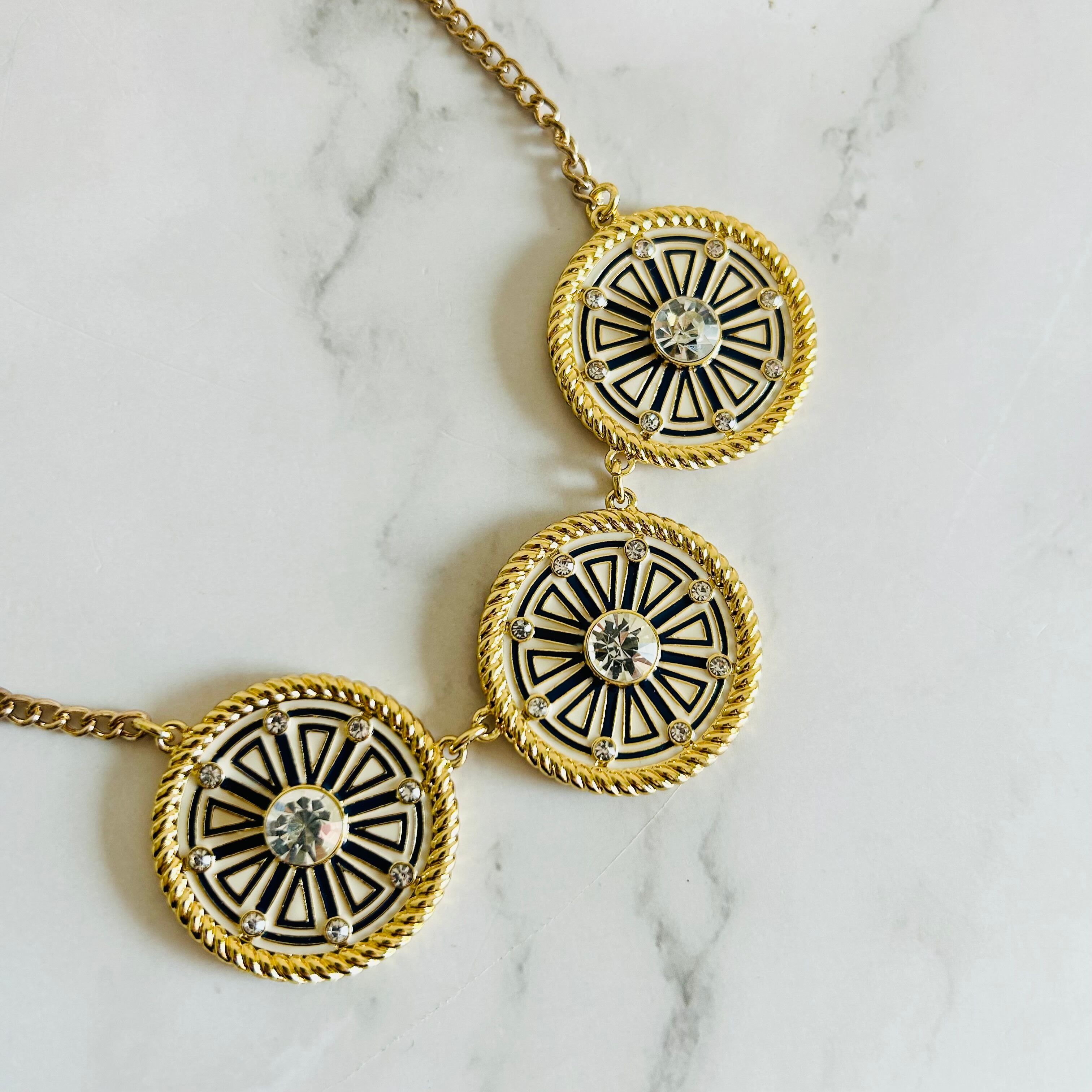 ゴールドのロープ風フレームとクリアストーンをあしらった、目を惹くサークル型パーツがクラシカルでインパクトのあるネックレスです。