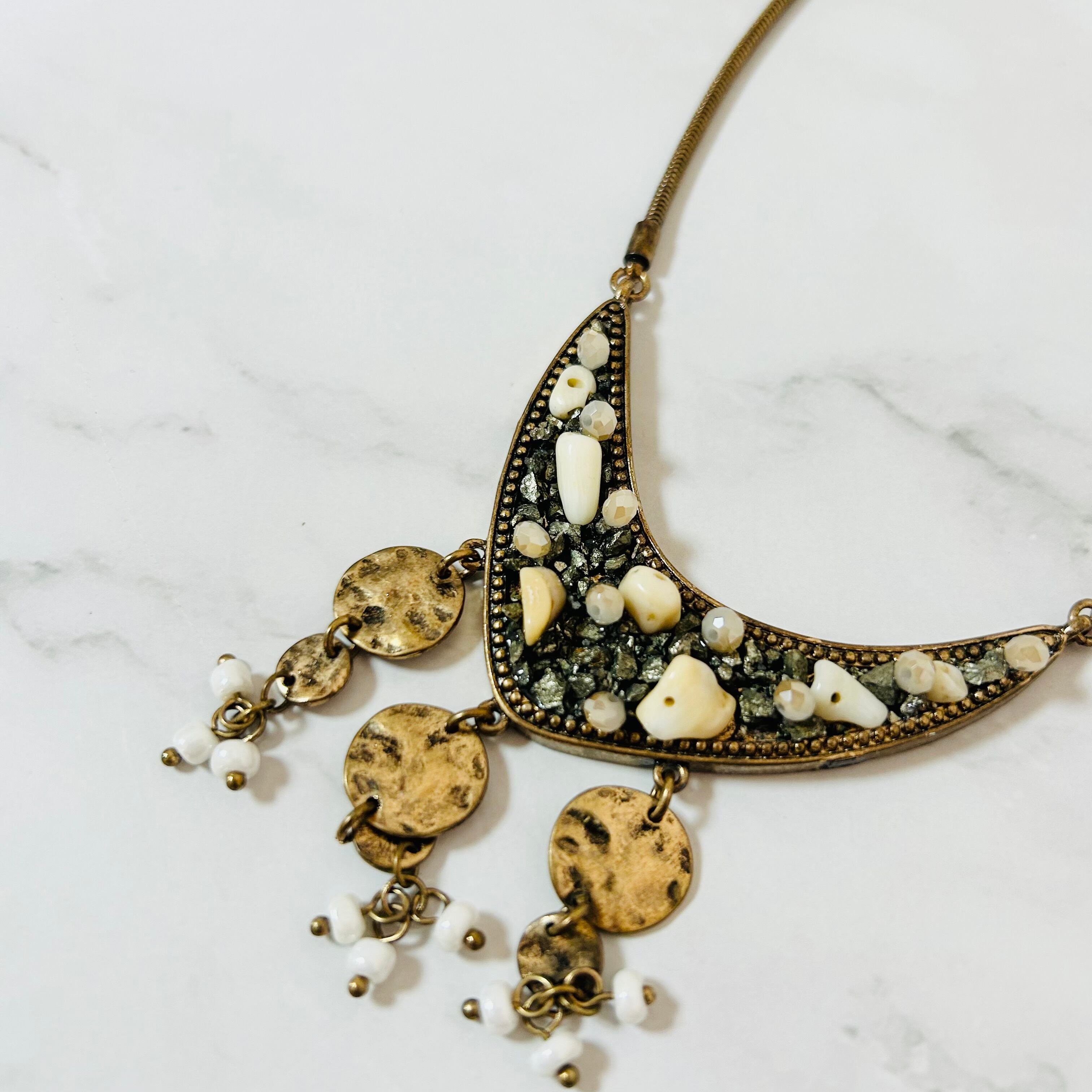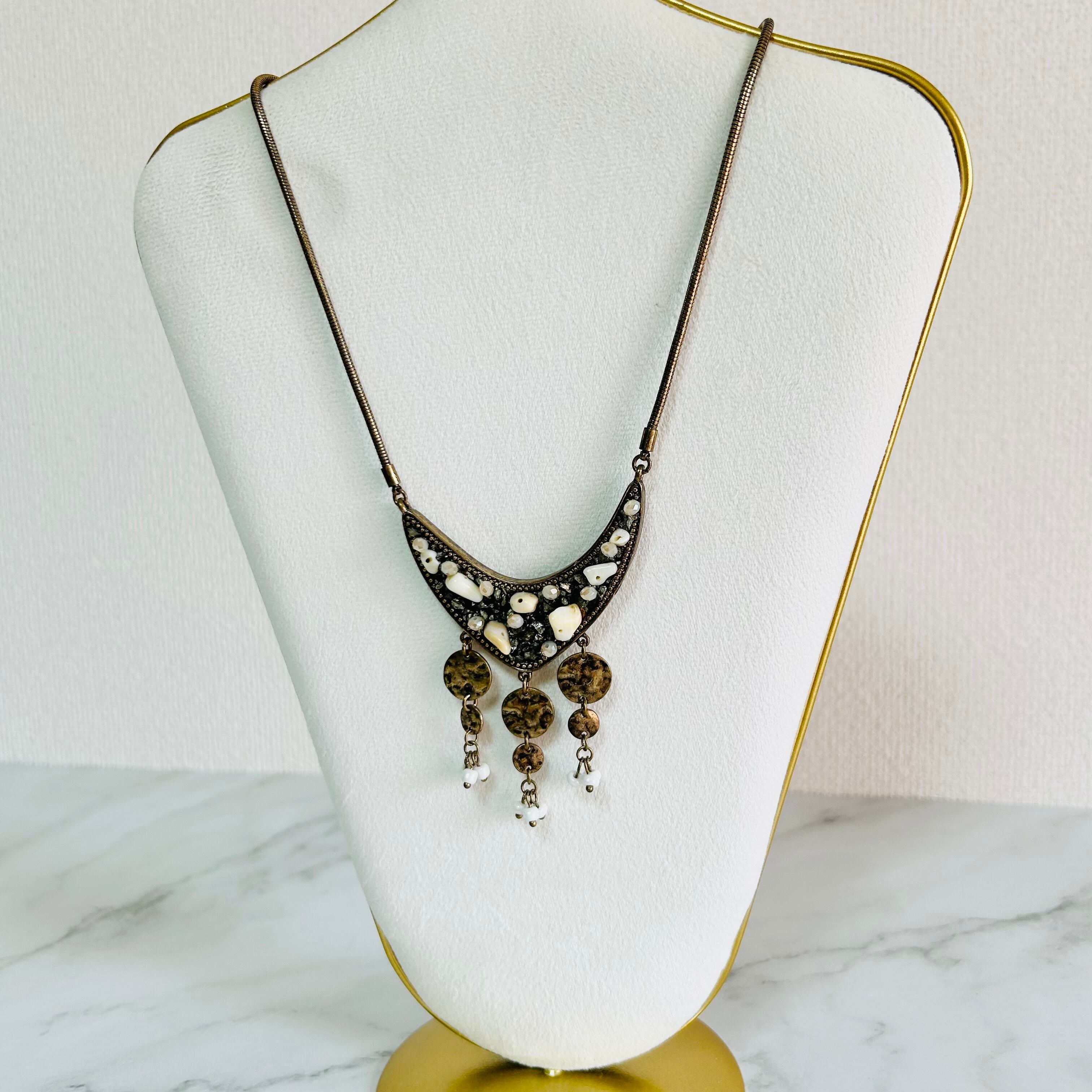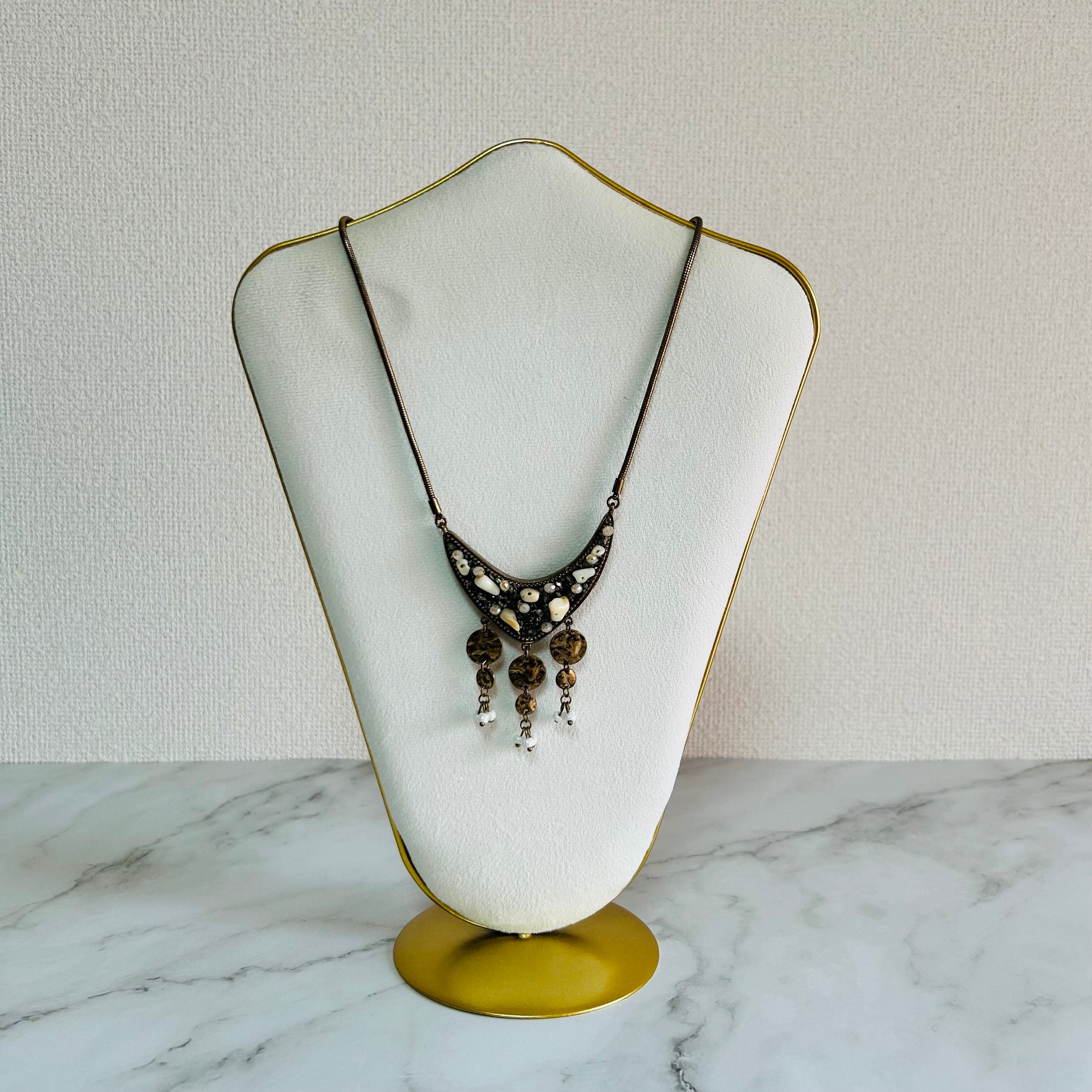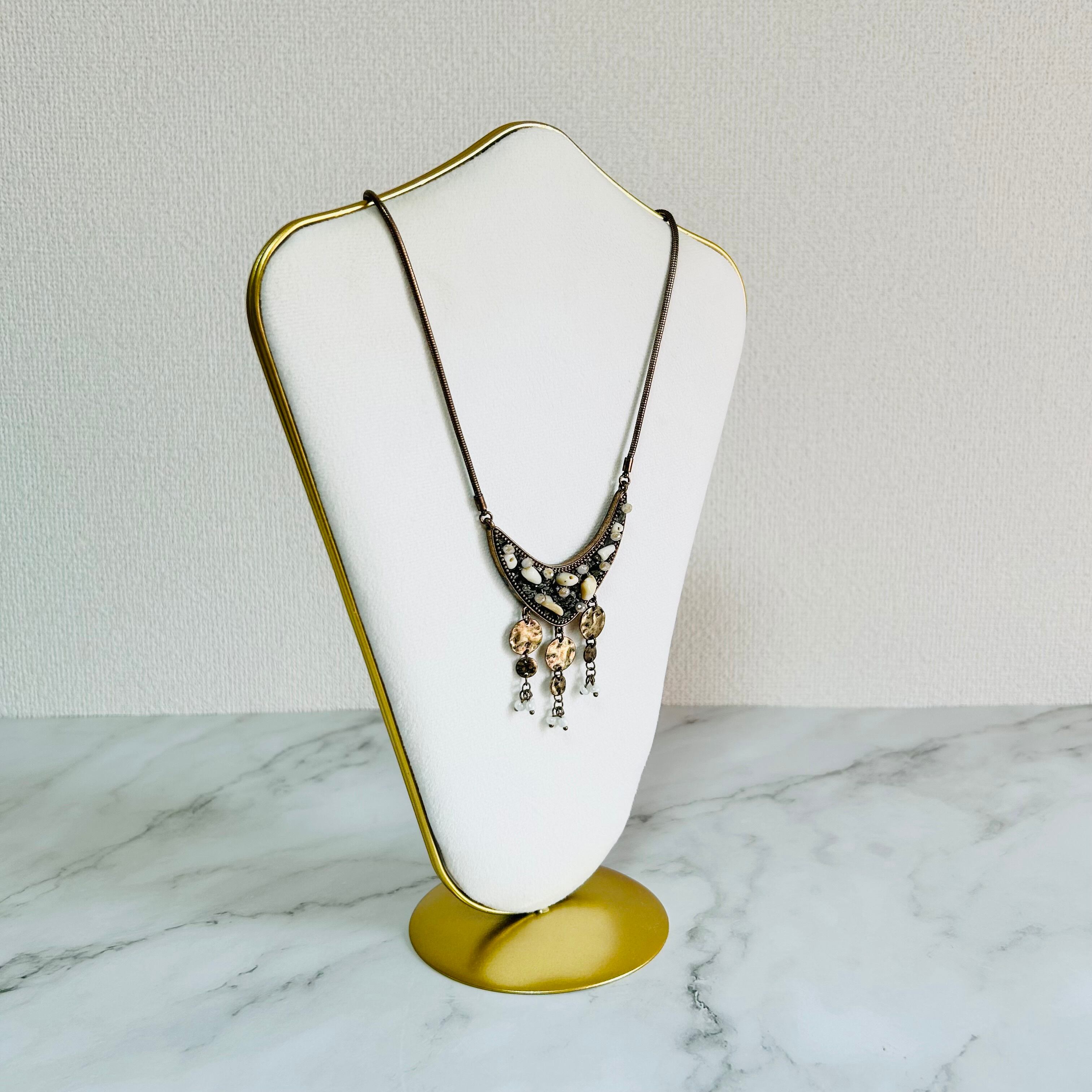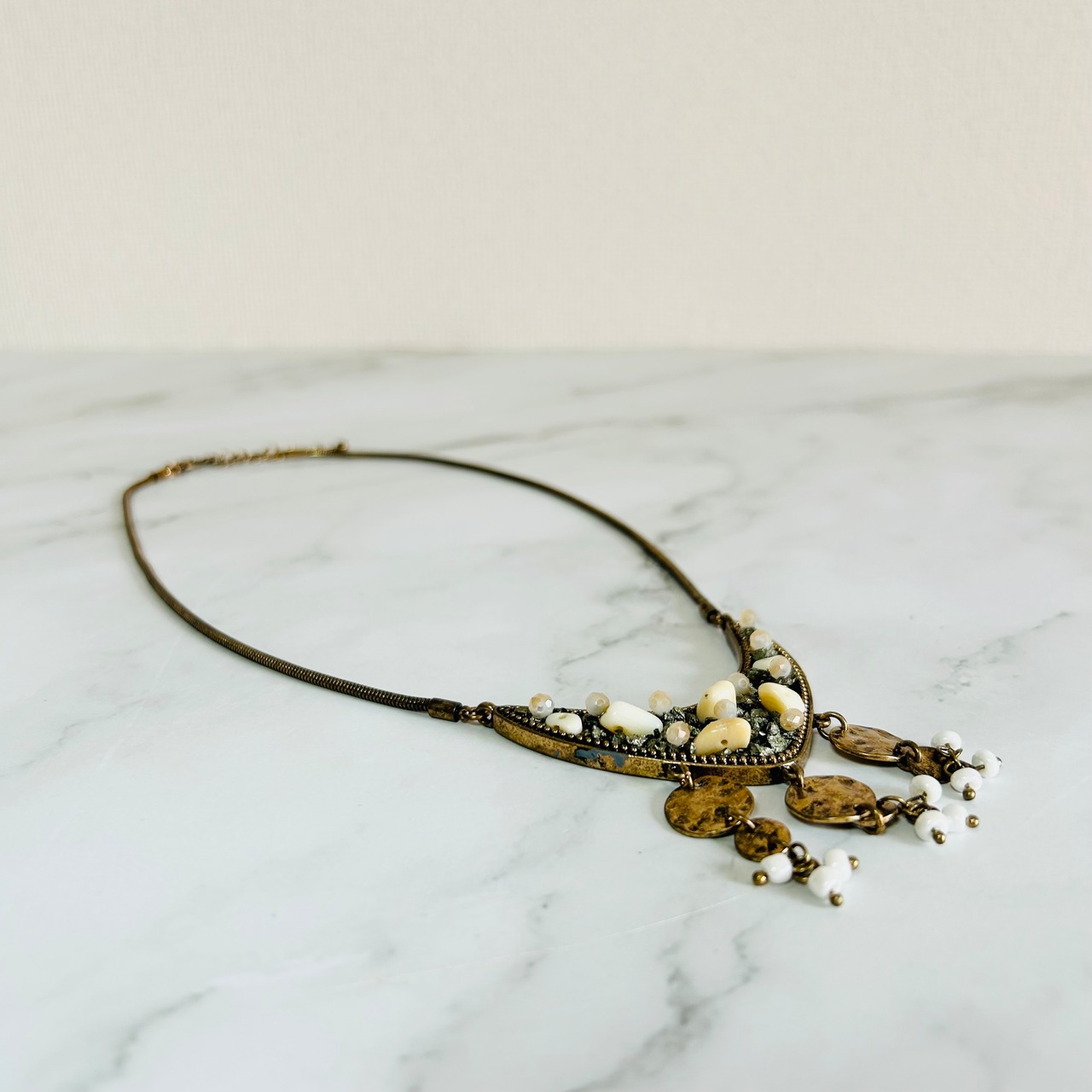 ブロンズ調のメタルフレームに、アイボリー系ストーンパーツやクリスタルパーツを散りばめた立体的なデザインで、下部にはテクスチャー感のあるゴールドメタルのチャームが揺れ動き、表情豊かに仕上げたネックレスです。