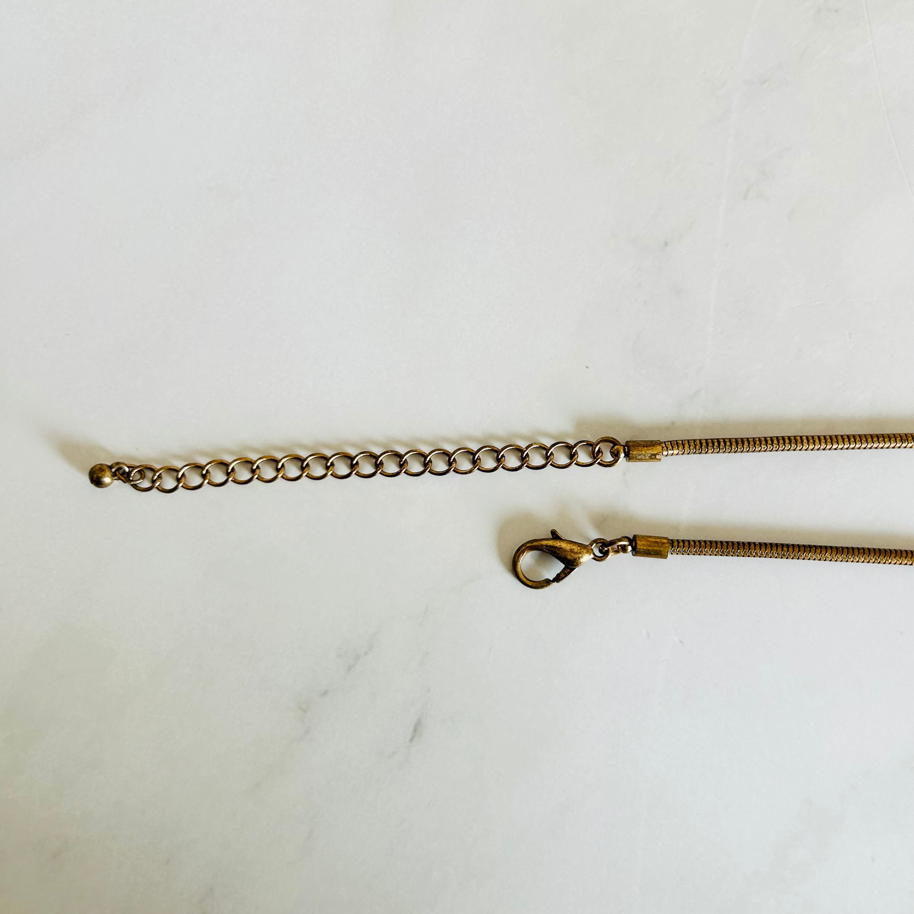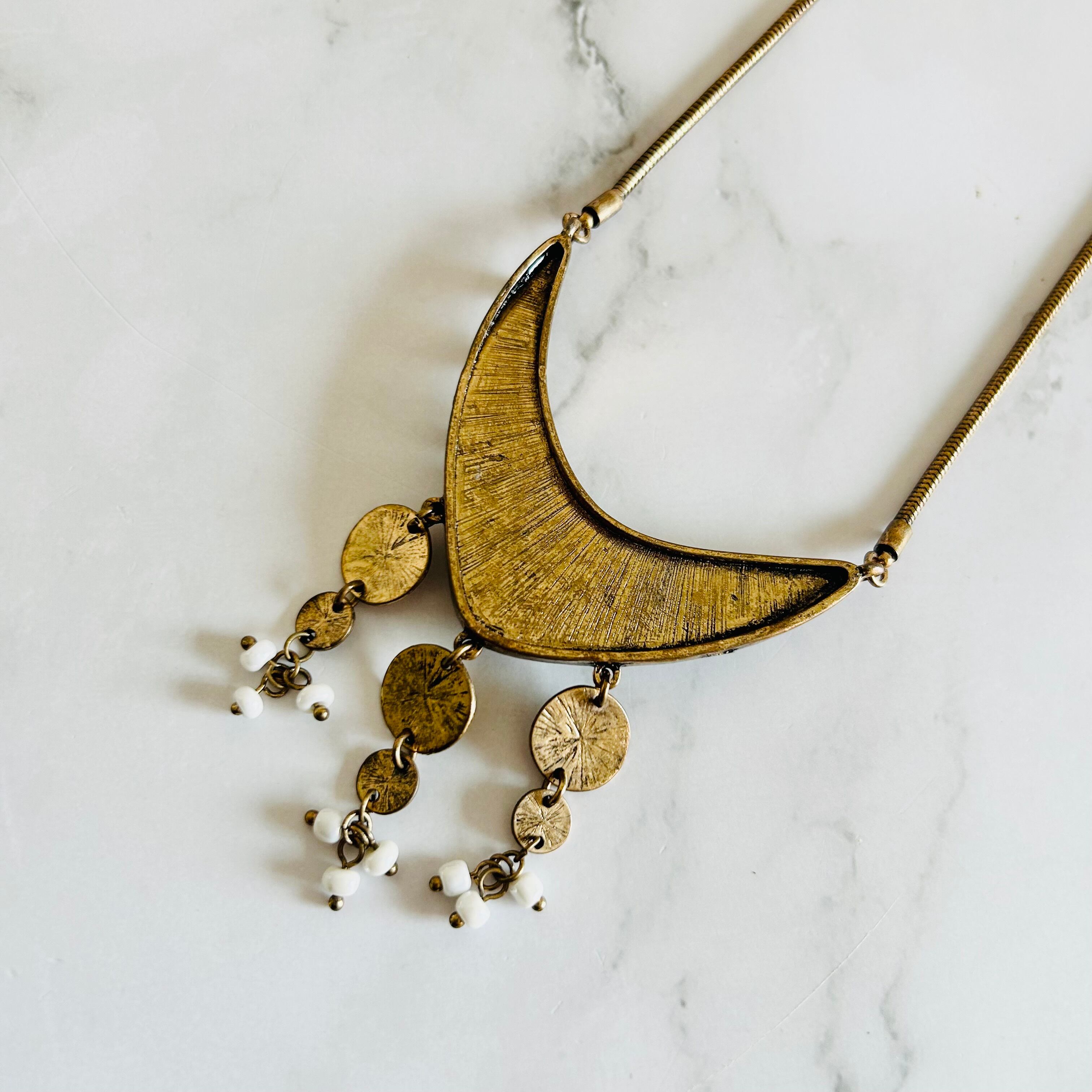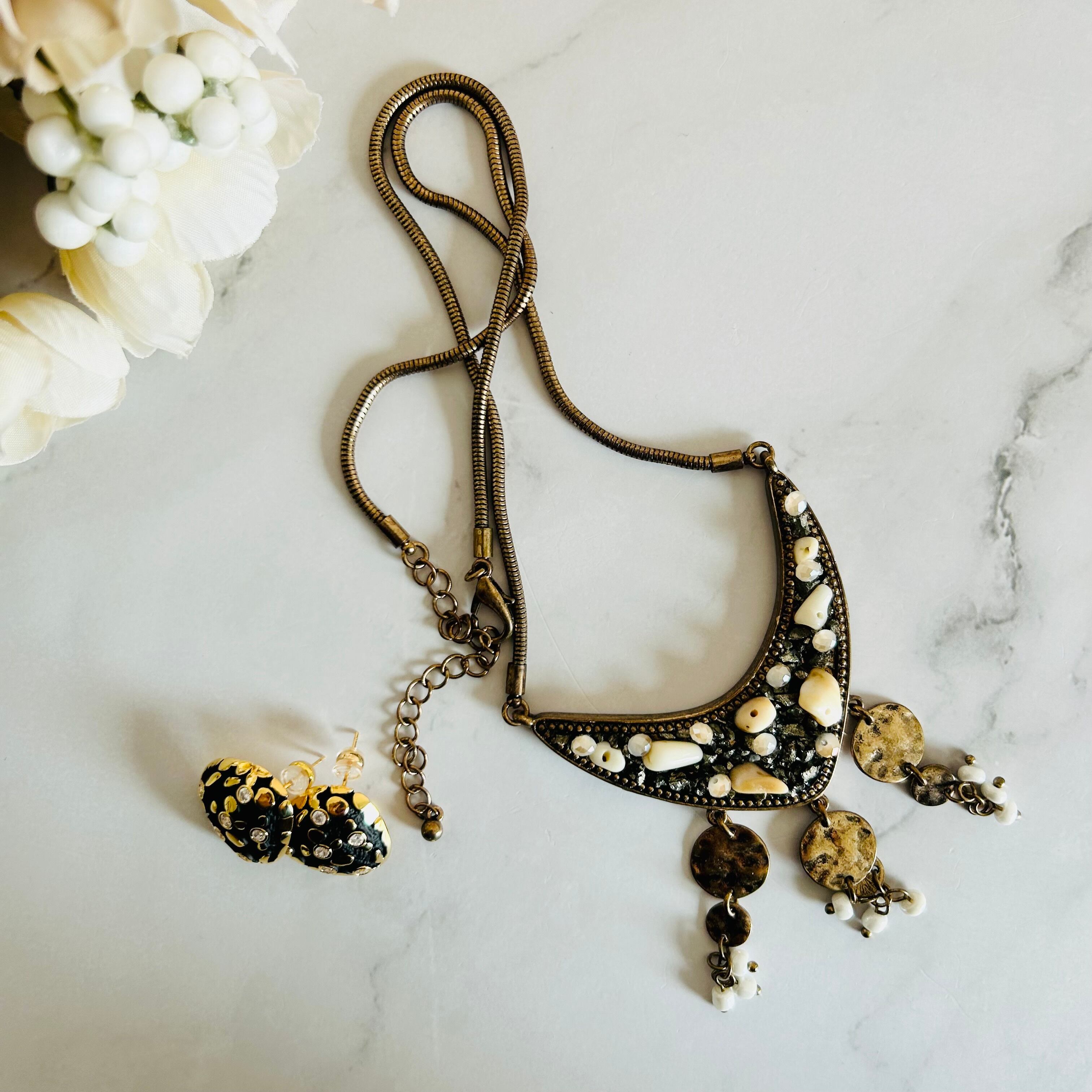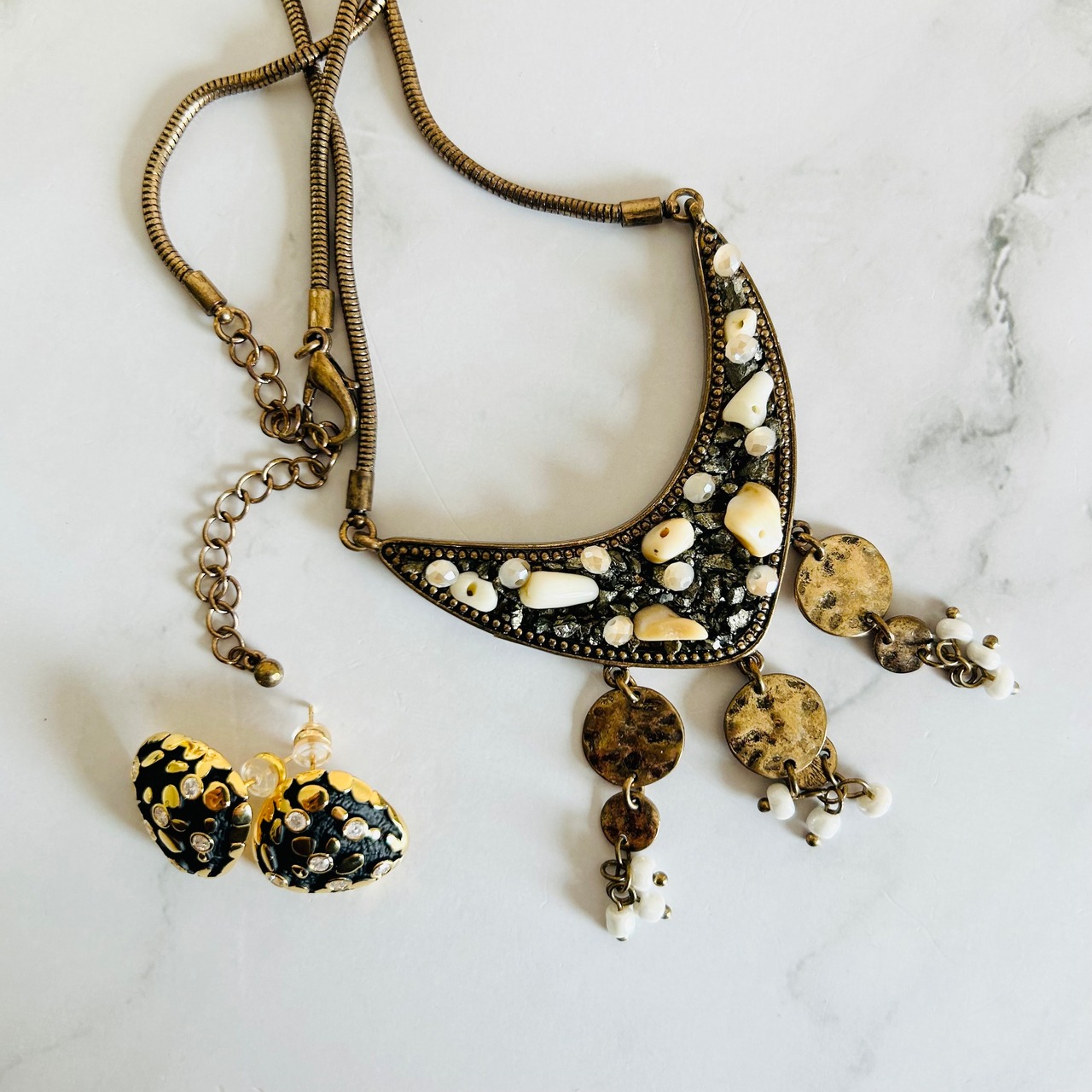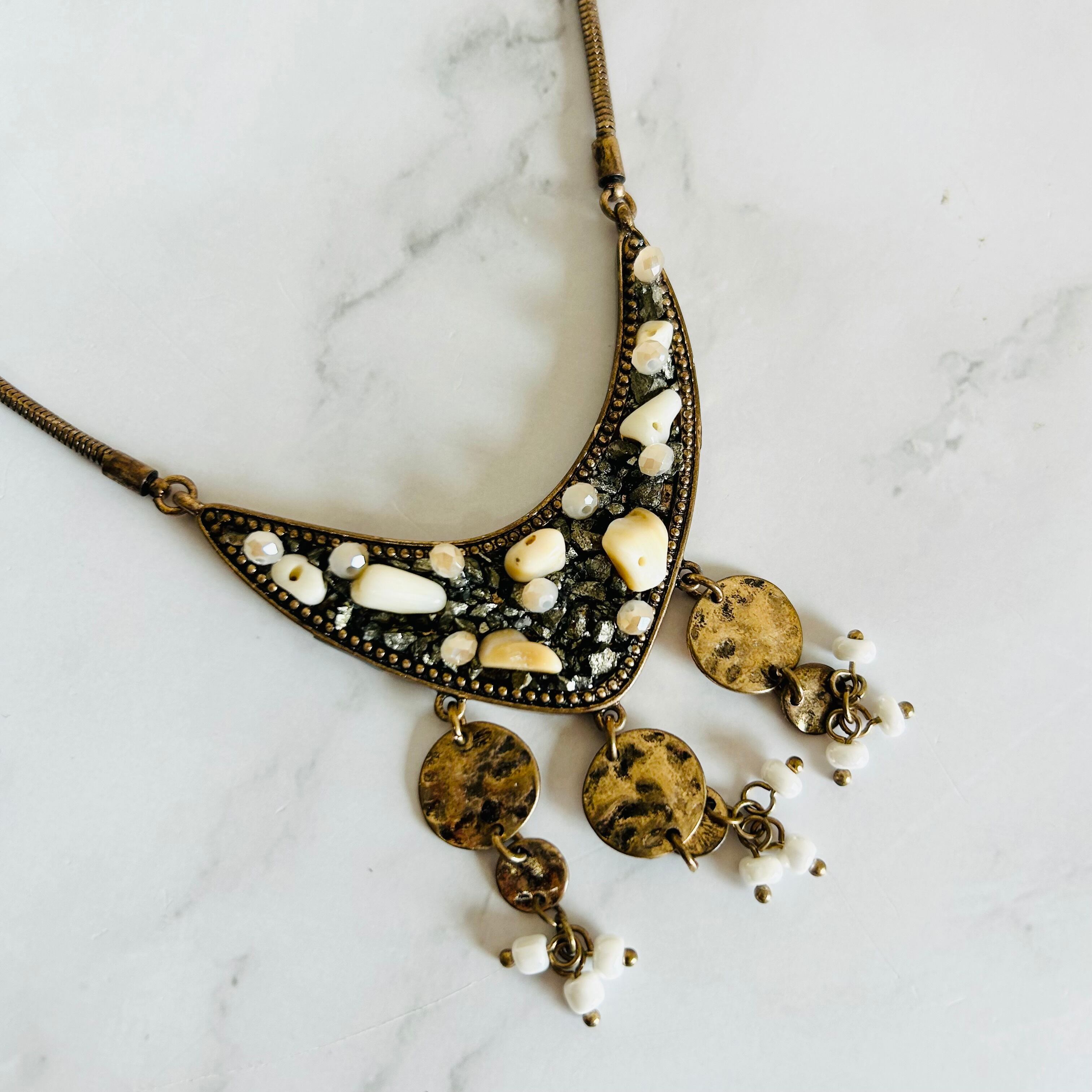 ブロンズ調のメタルフレームに、アイボリー系ストーンパーツやクリスタルパーツを散りばめた立体的なデザインで、下部にはテクスチャー感のあるゴールドメタルのチャームが揺れ動き、表情豊かに仕上げたネックレスです。