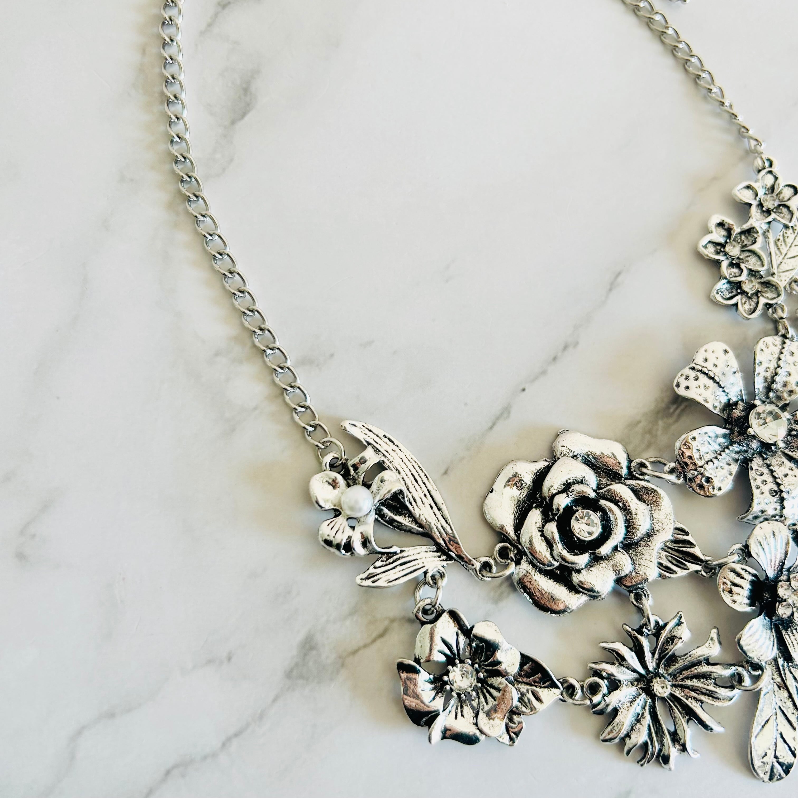 さまざまなデザインのお花モチーフを立体的にあしらった、アンティークシルバーカラーのフラワーネックレスです。