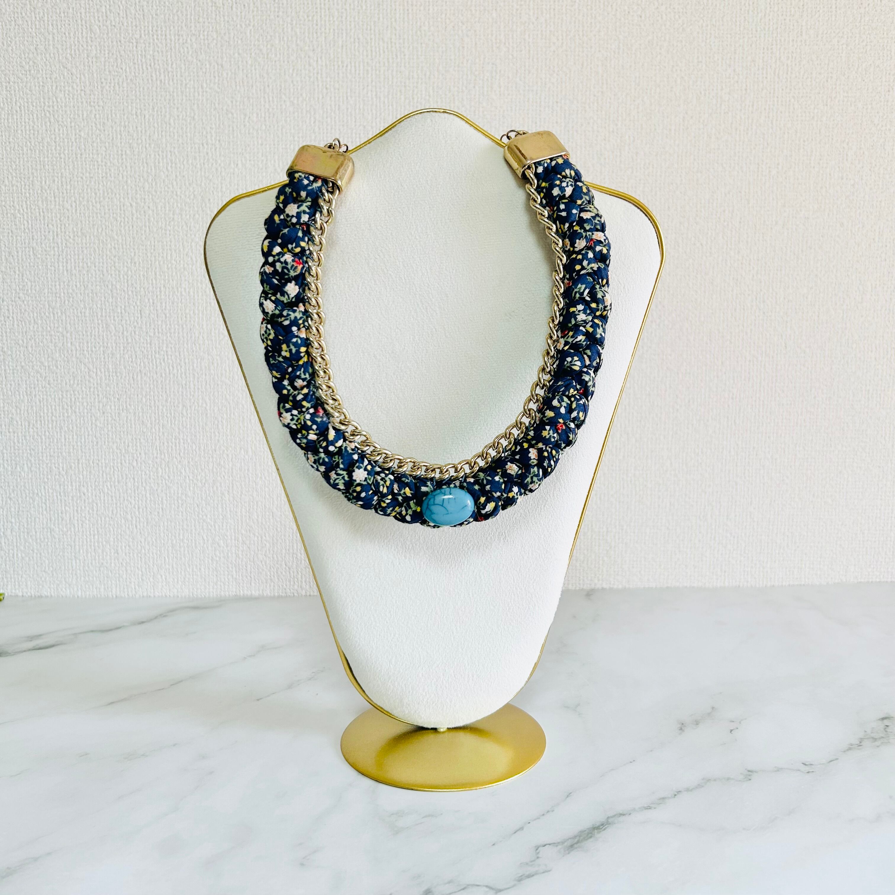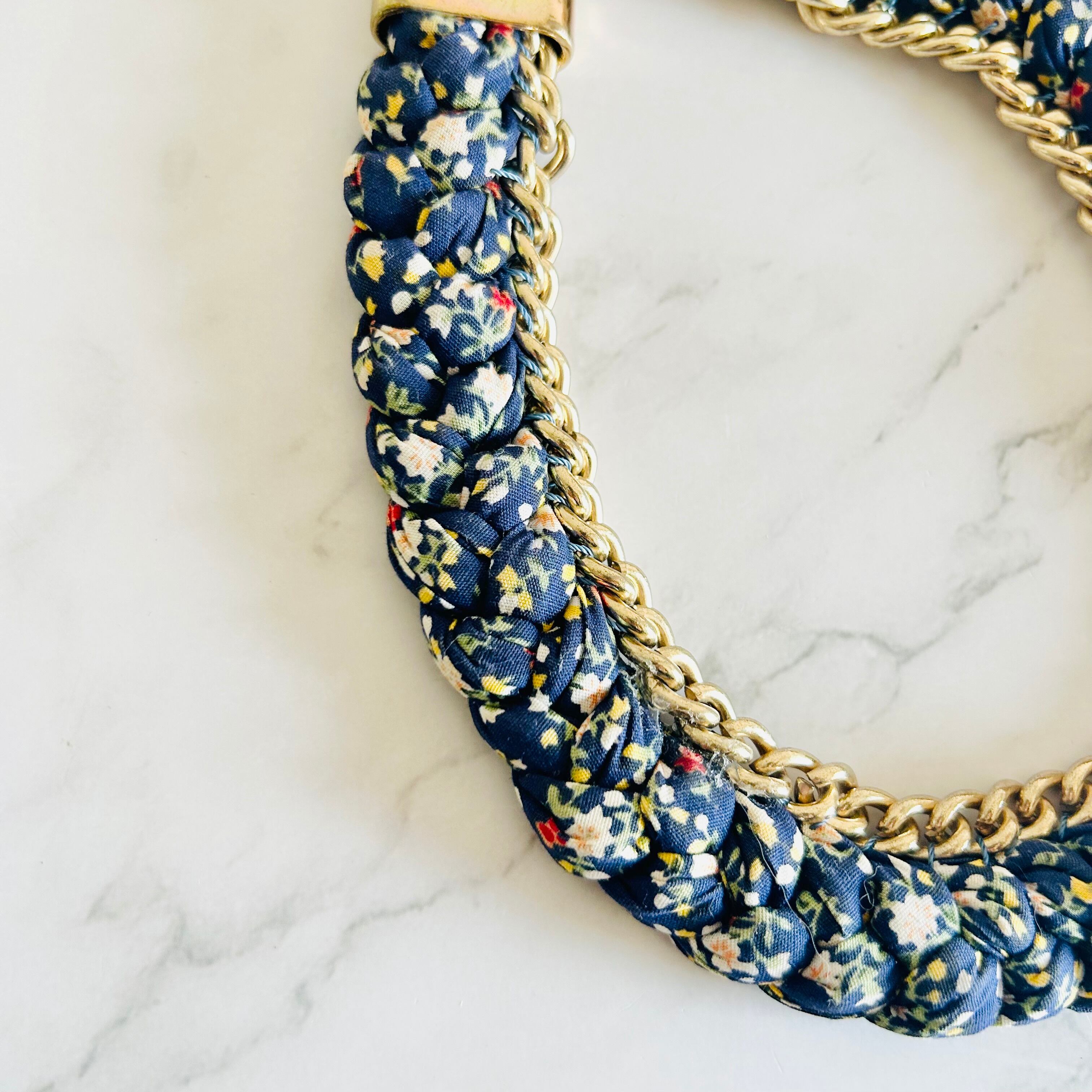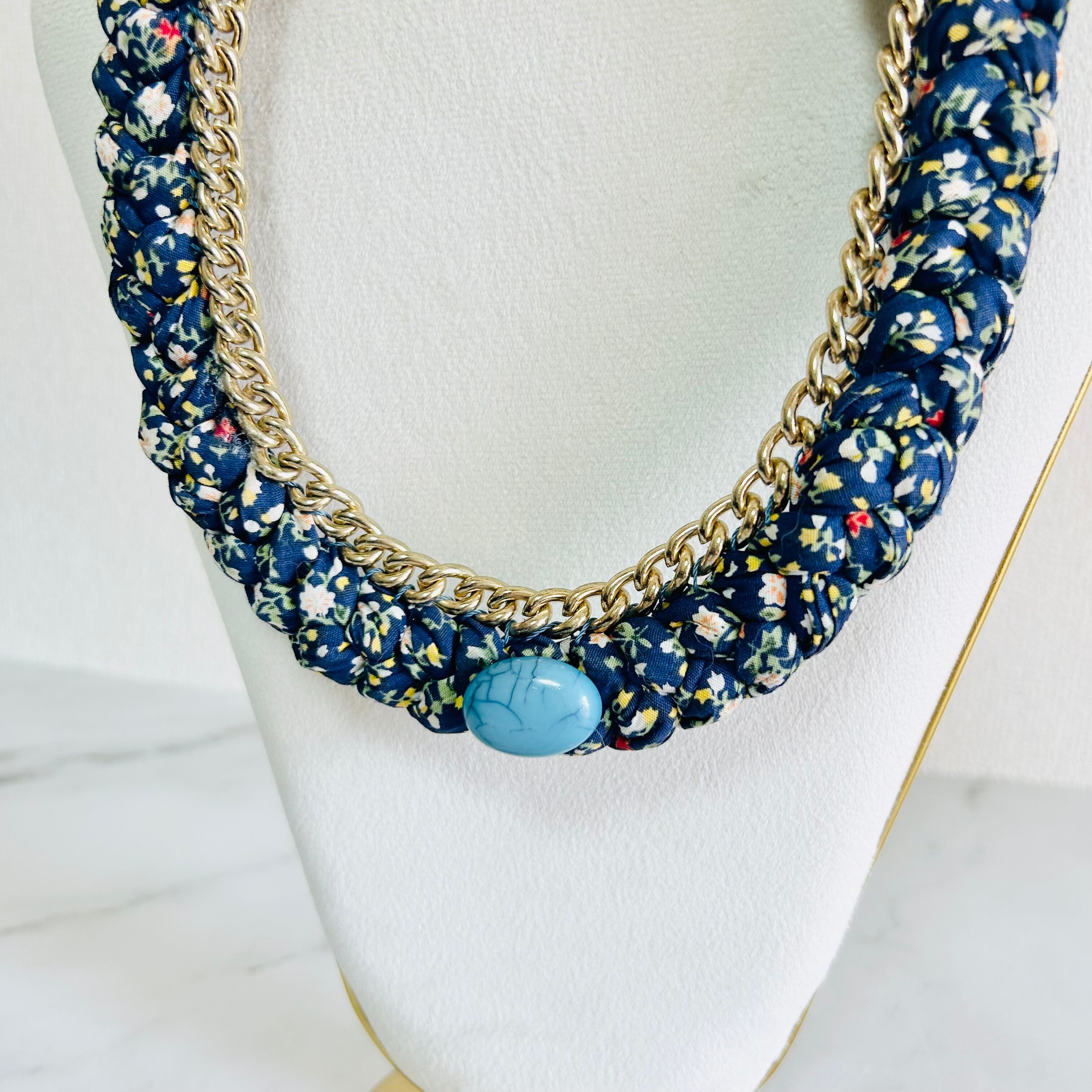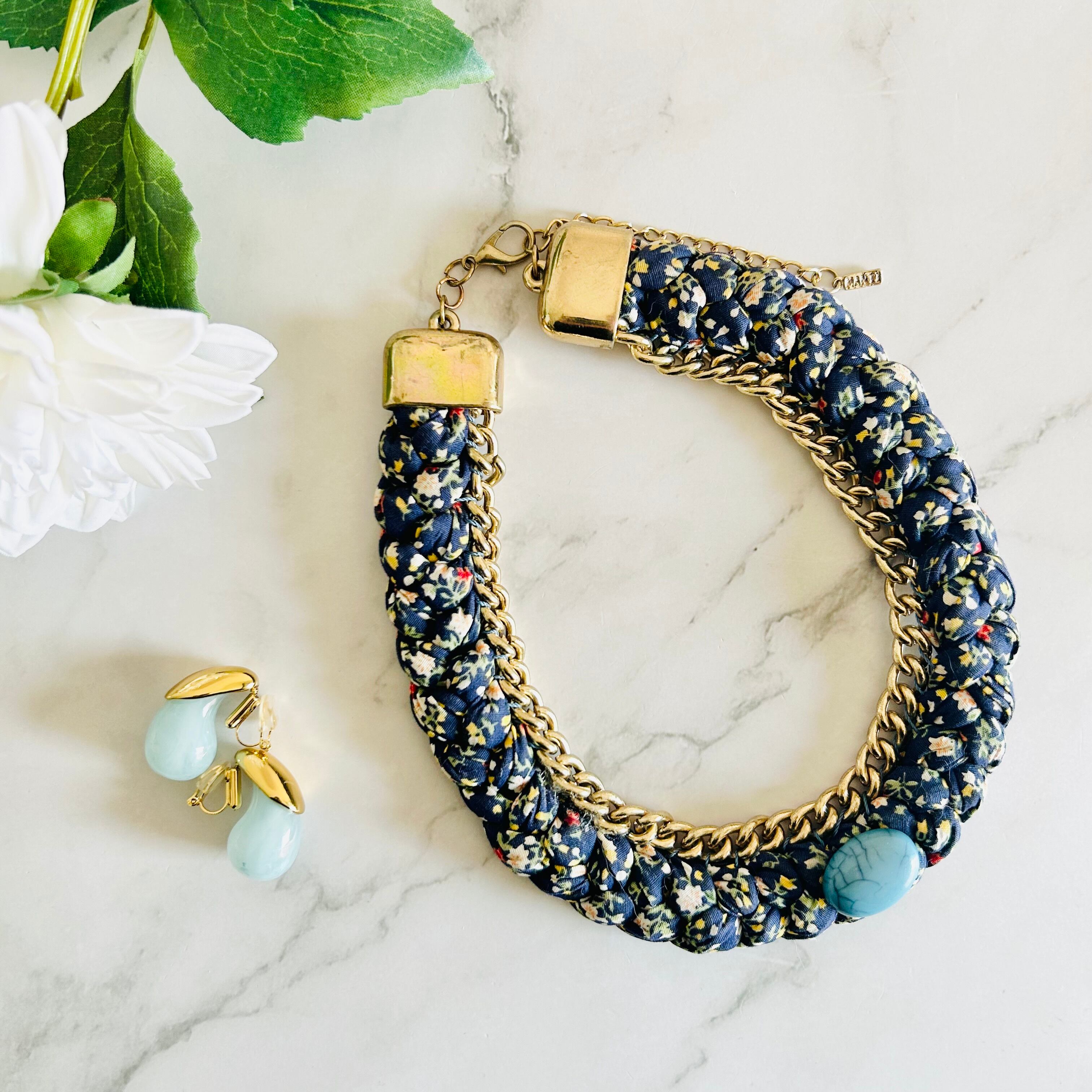 小花柄のファブリックコードを丁寧に編み込み、アンティークゴールドチェーンと組み合わせた、遊び心あふれる他にはないデザインが魅力のネックレスです。