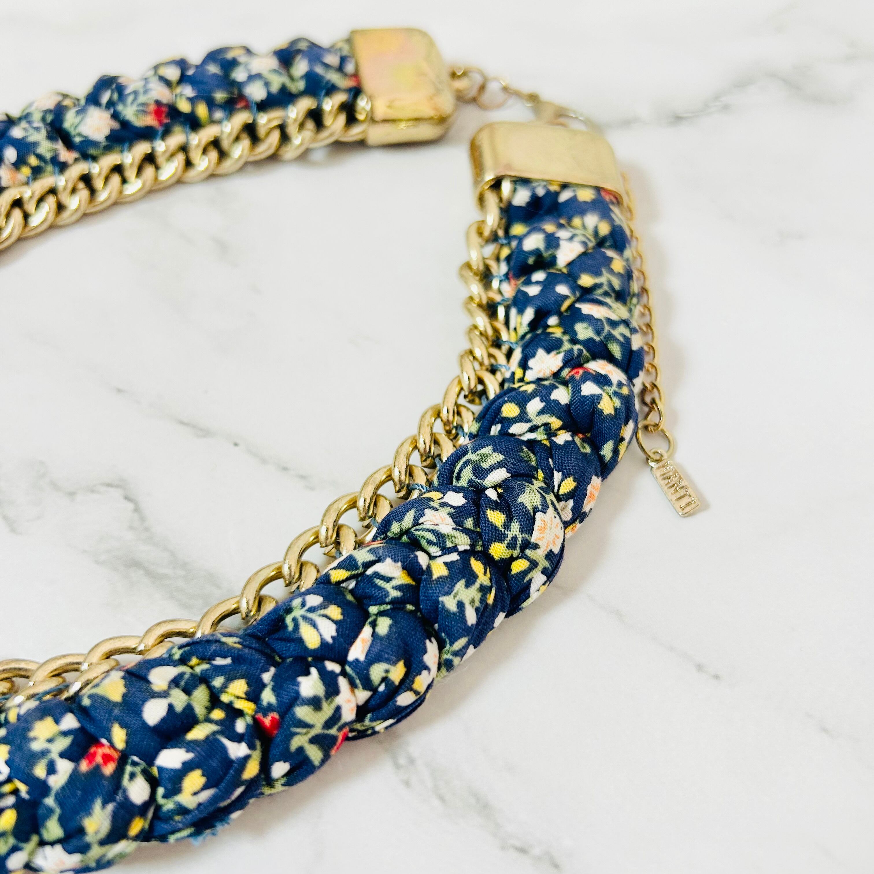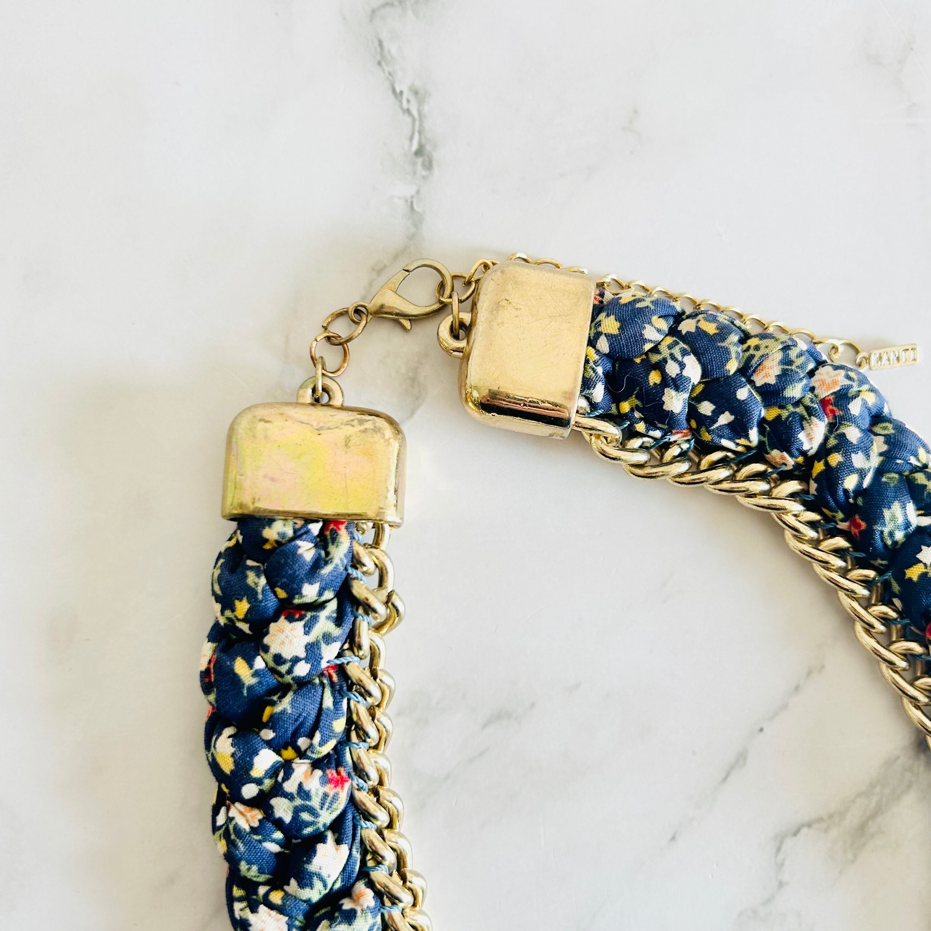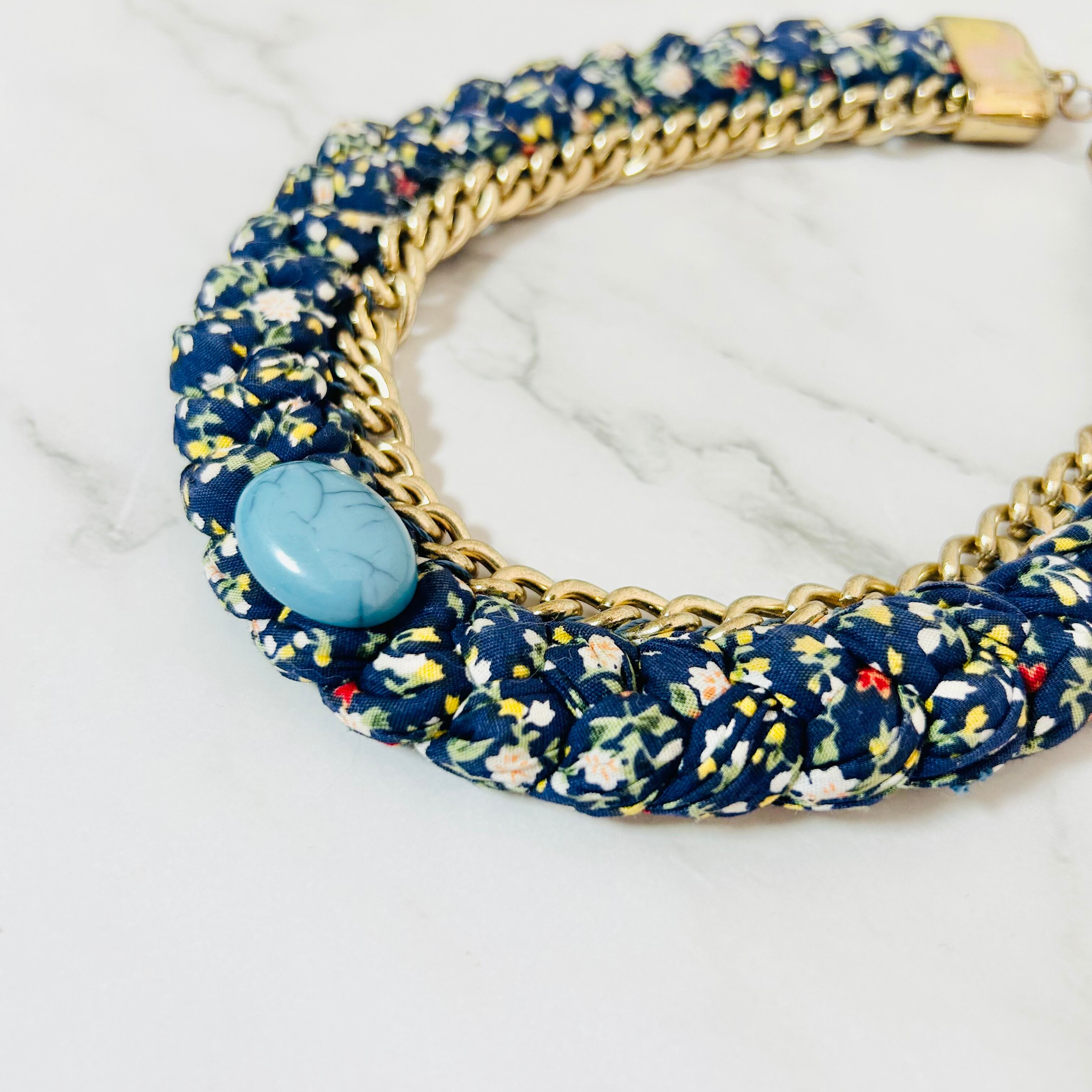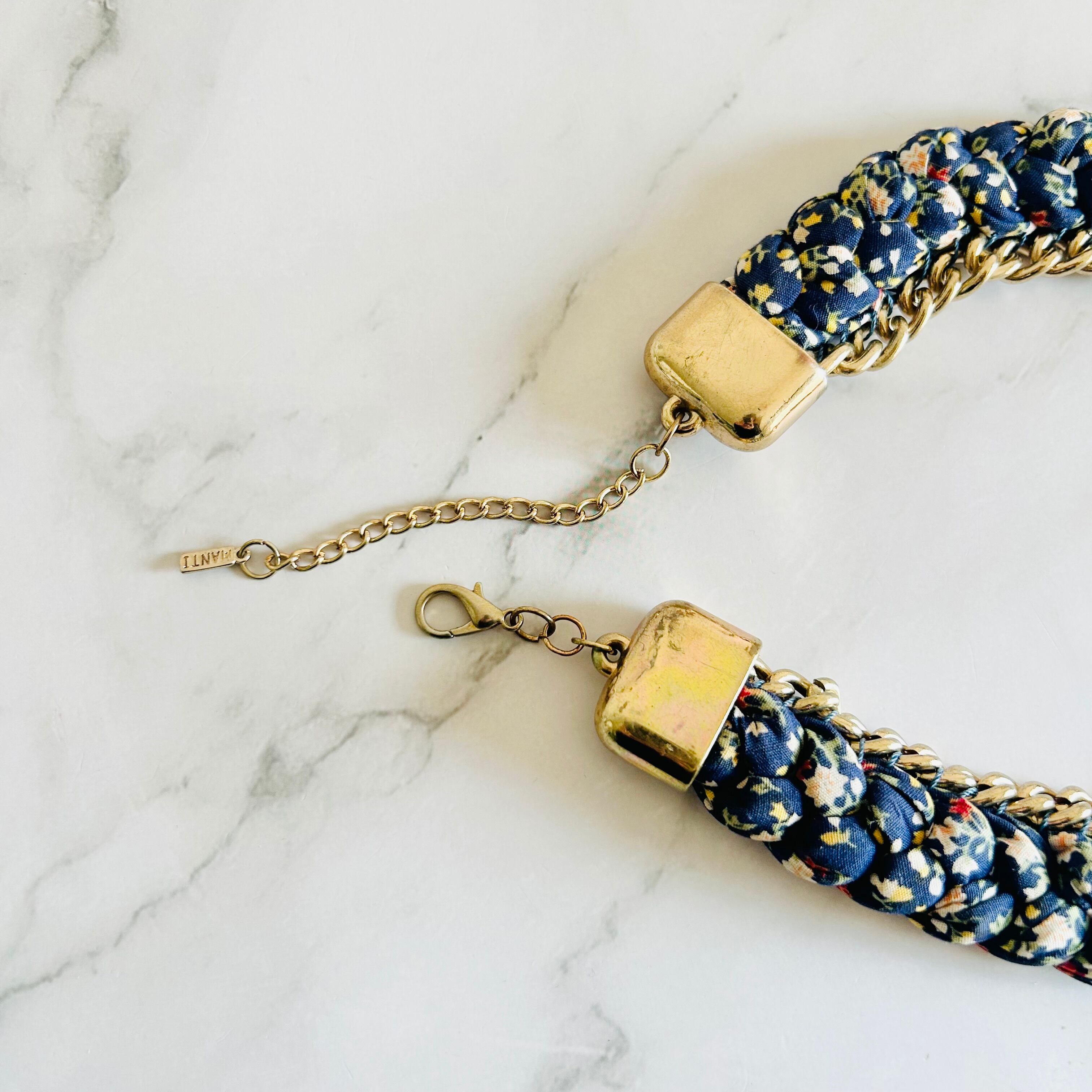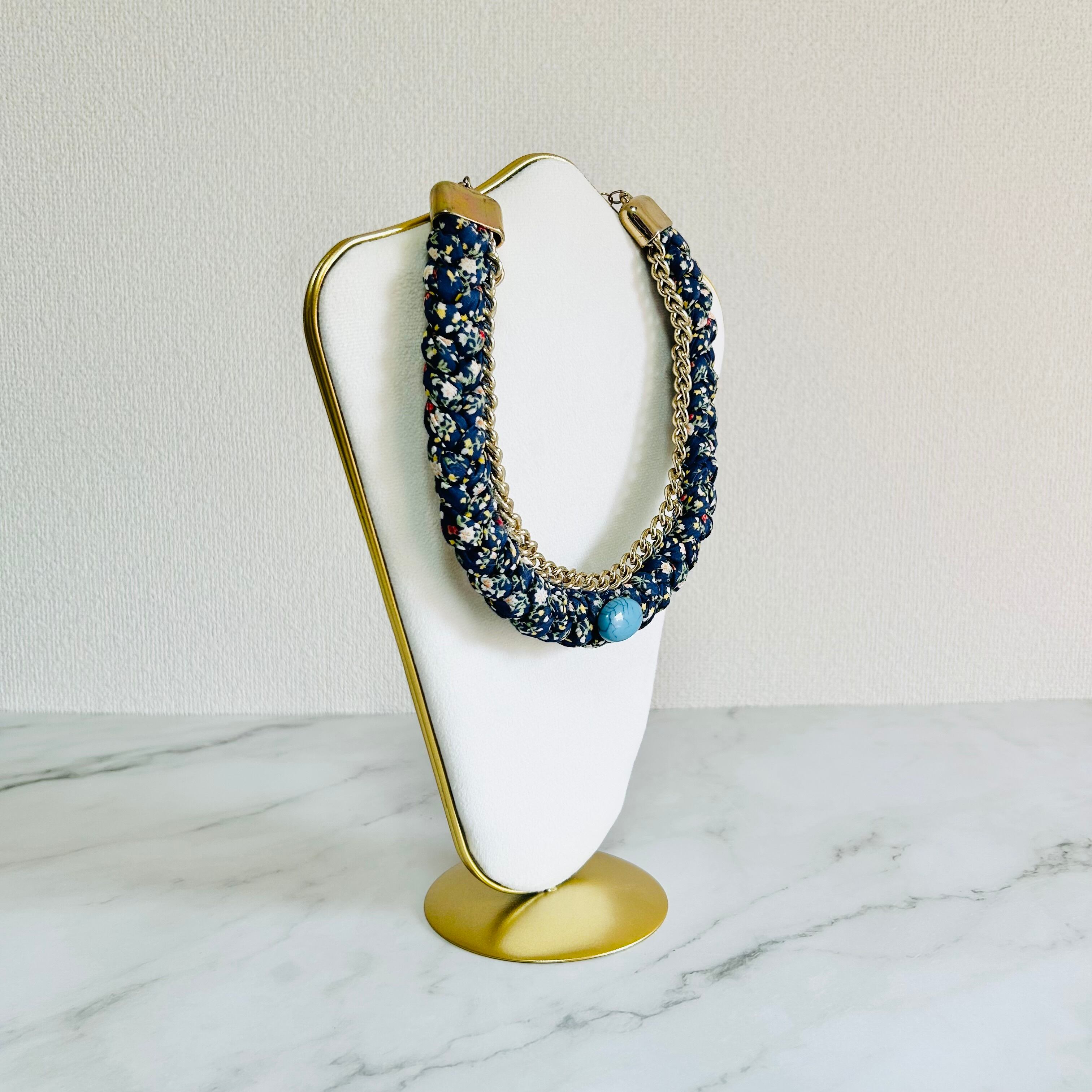 小花柄のファブリックコードを丁寧に編み込み、アンティークゴールドチェーンと組み合わせた、遊び心あふれる他にはないデザインが魅力のネックレスです。