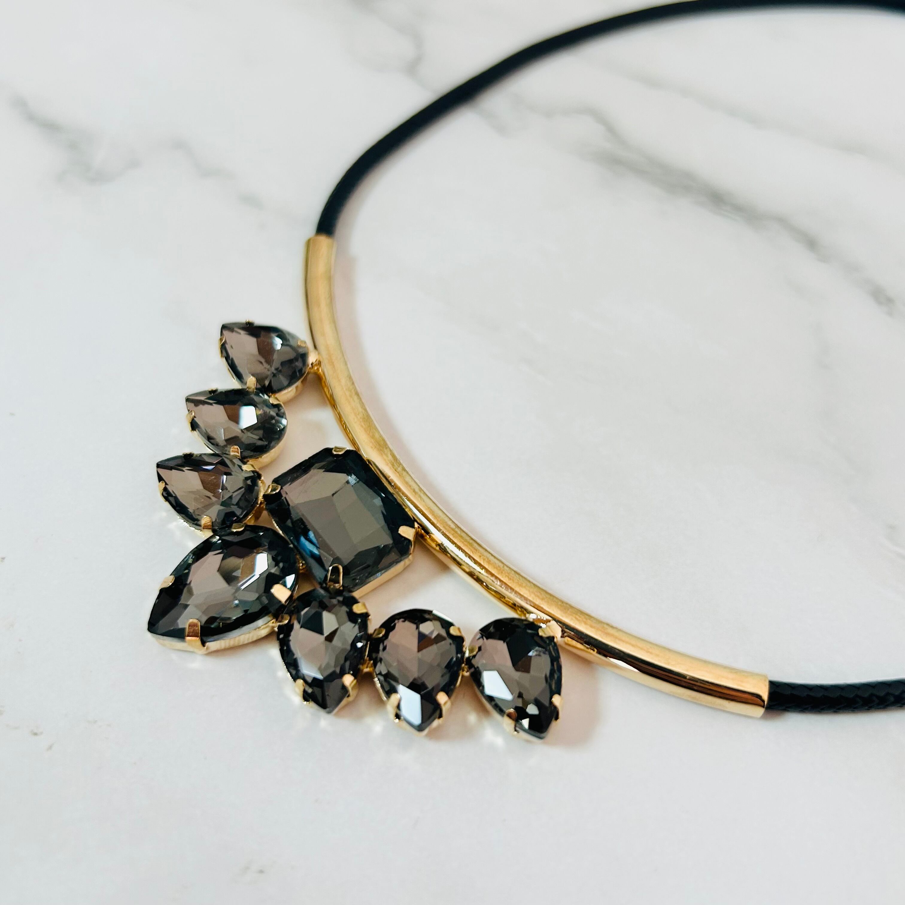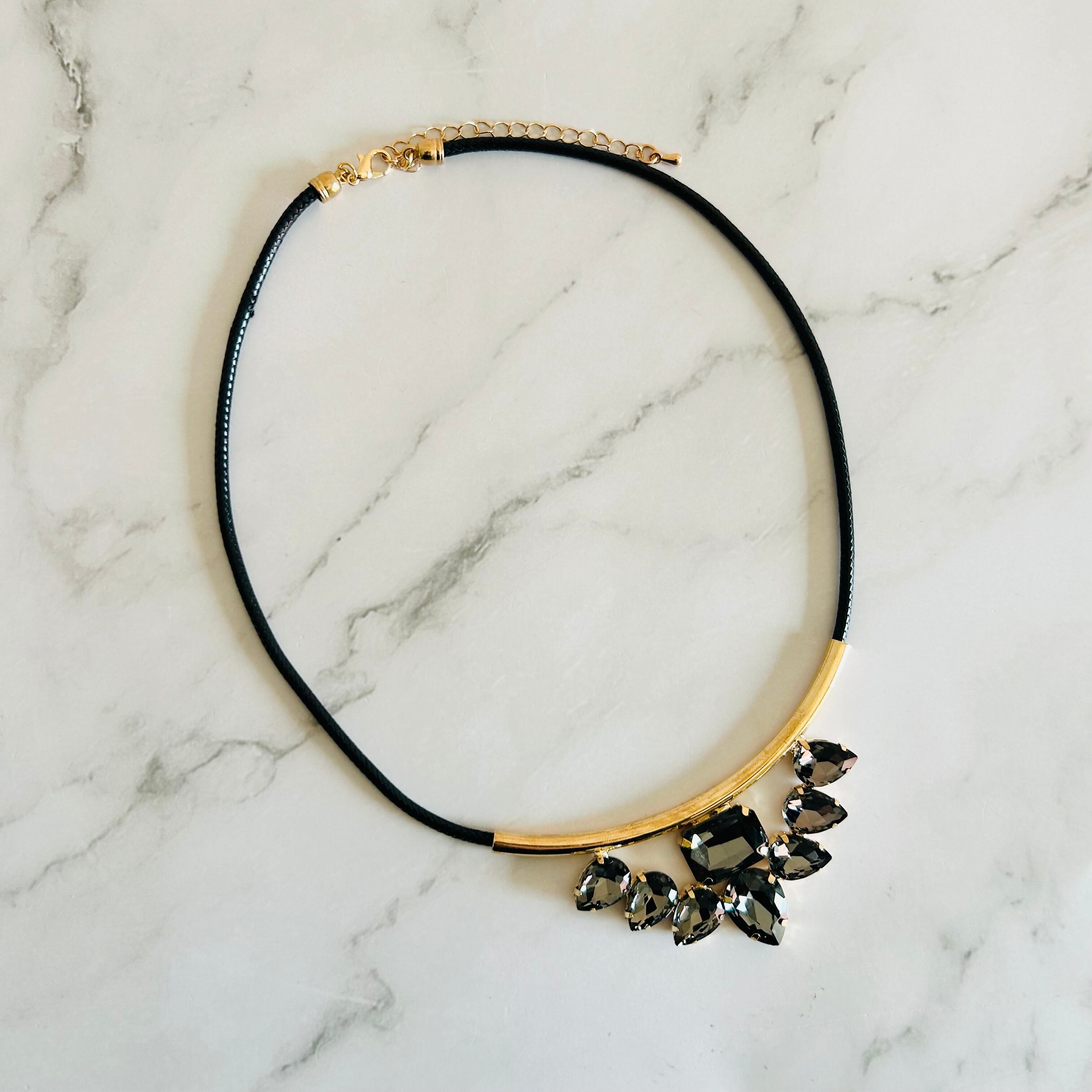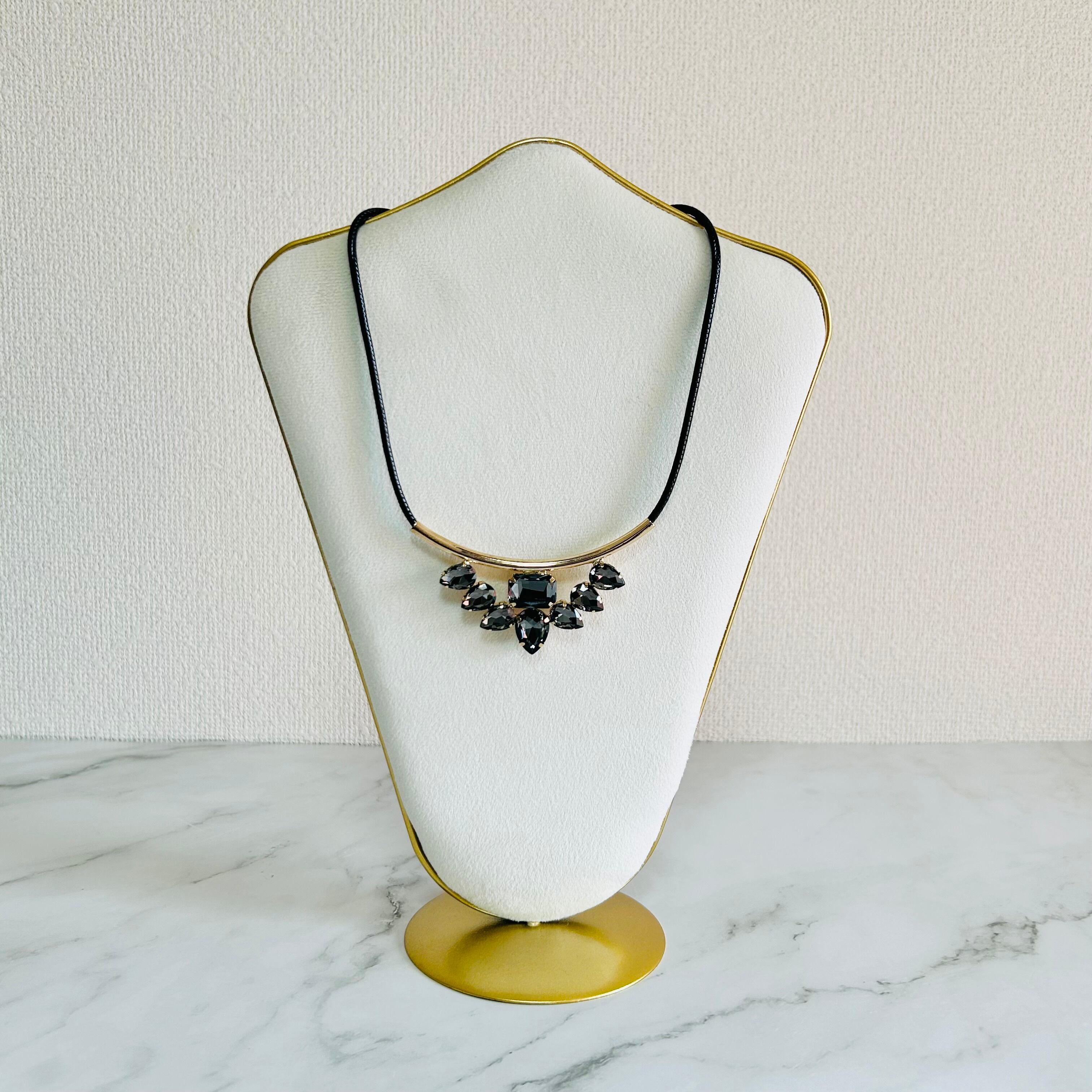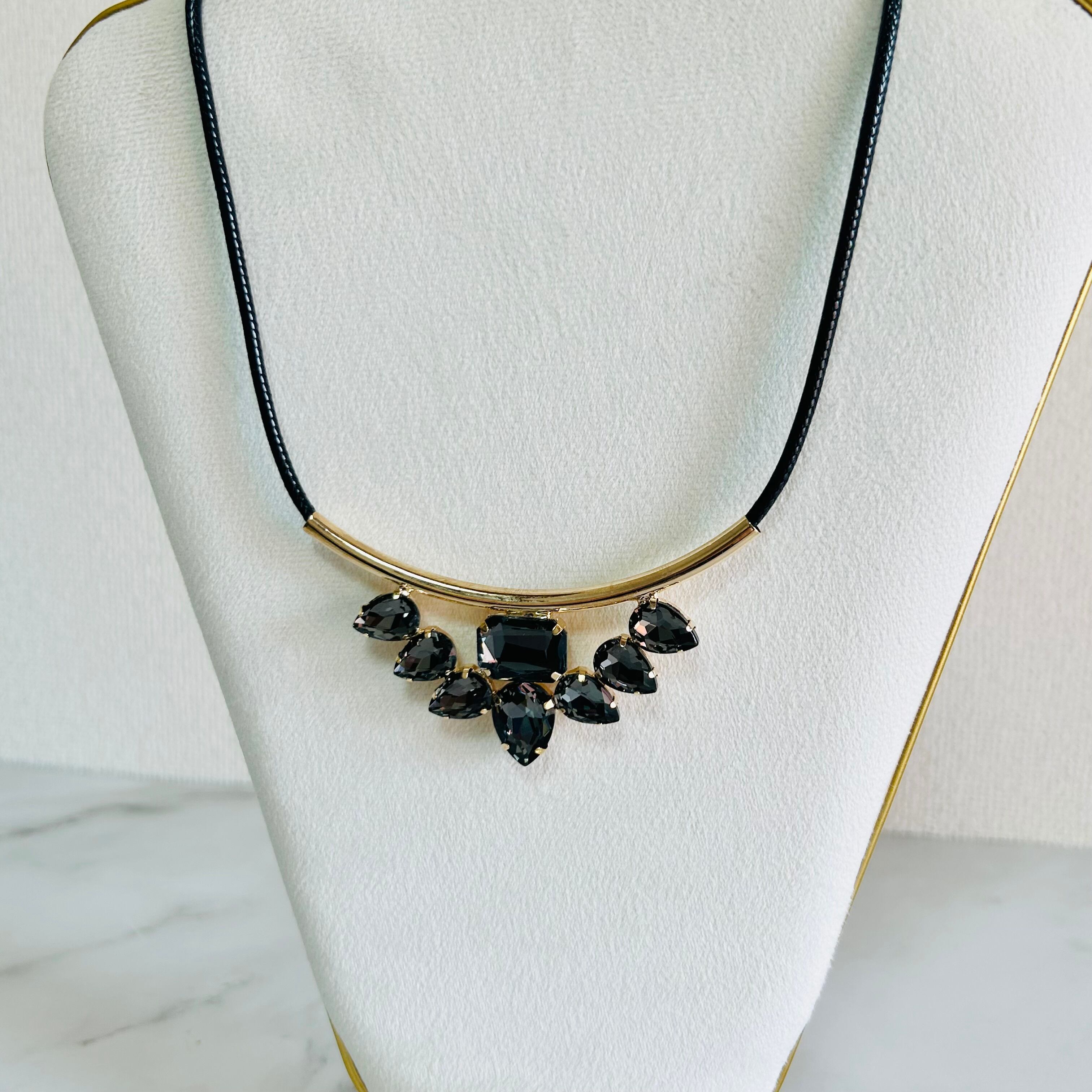 艶のあるブラックコードに、ゴールドのバーとクリスタルストーンを組み合わせた、洗練されたデザインのネックレスです。