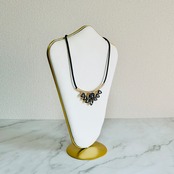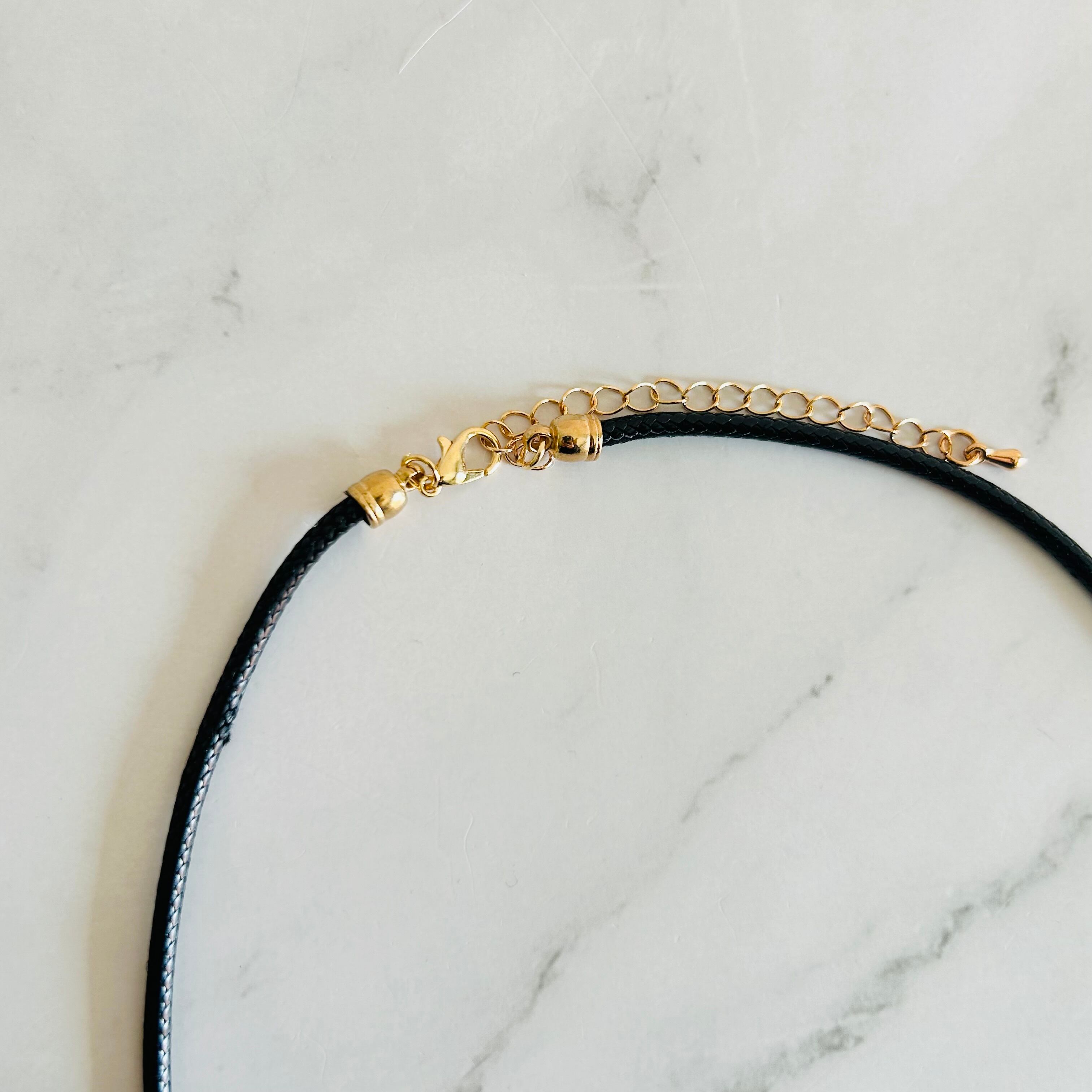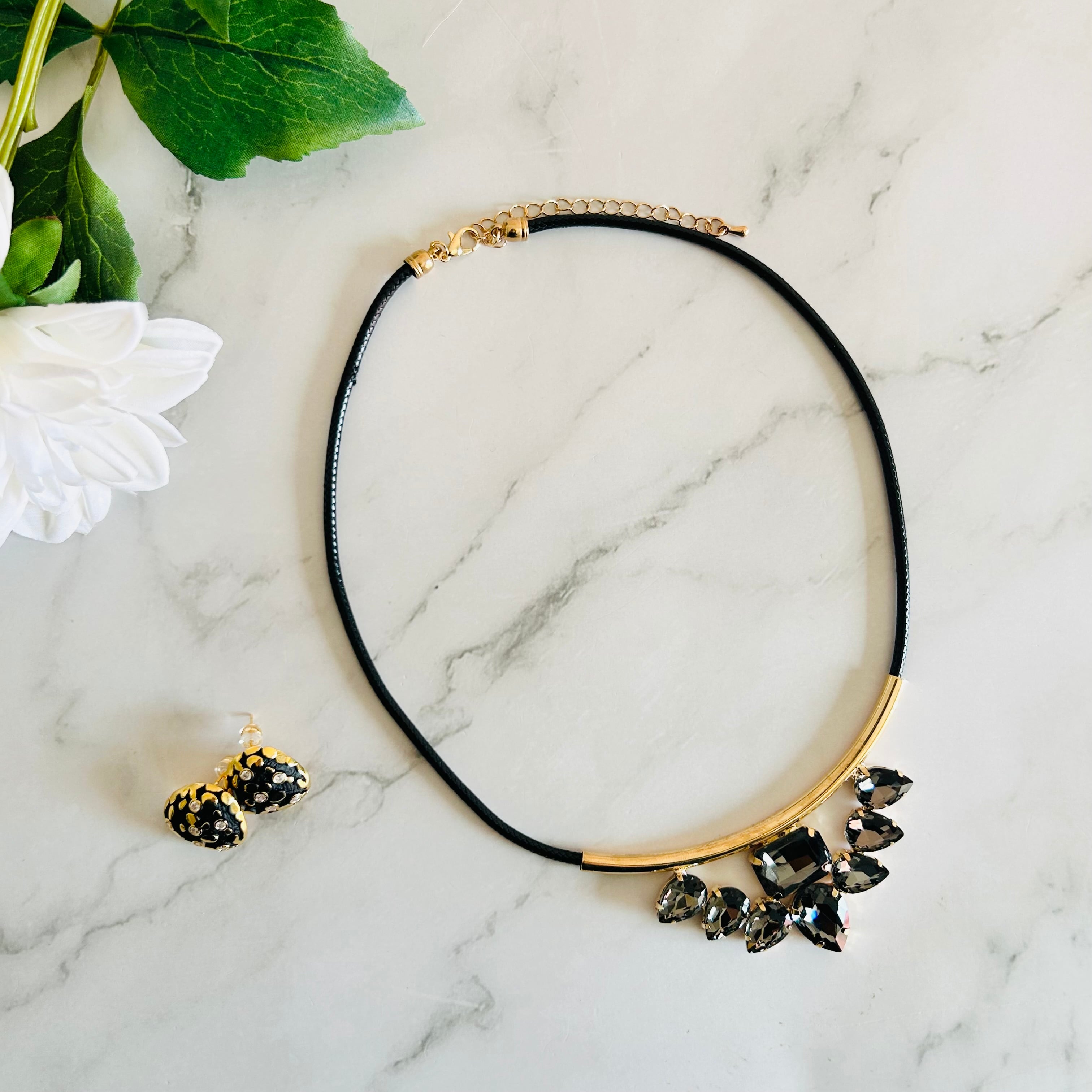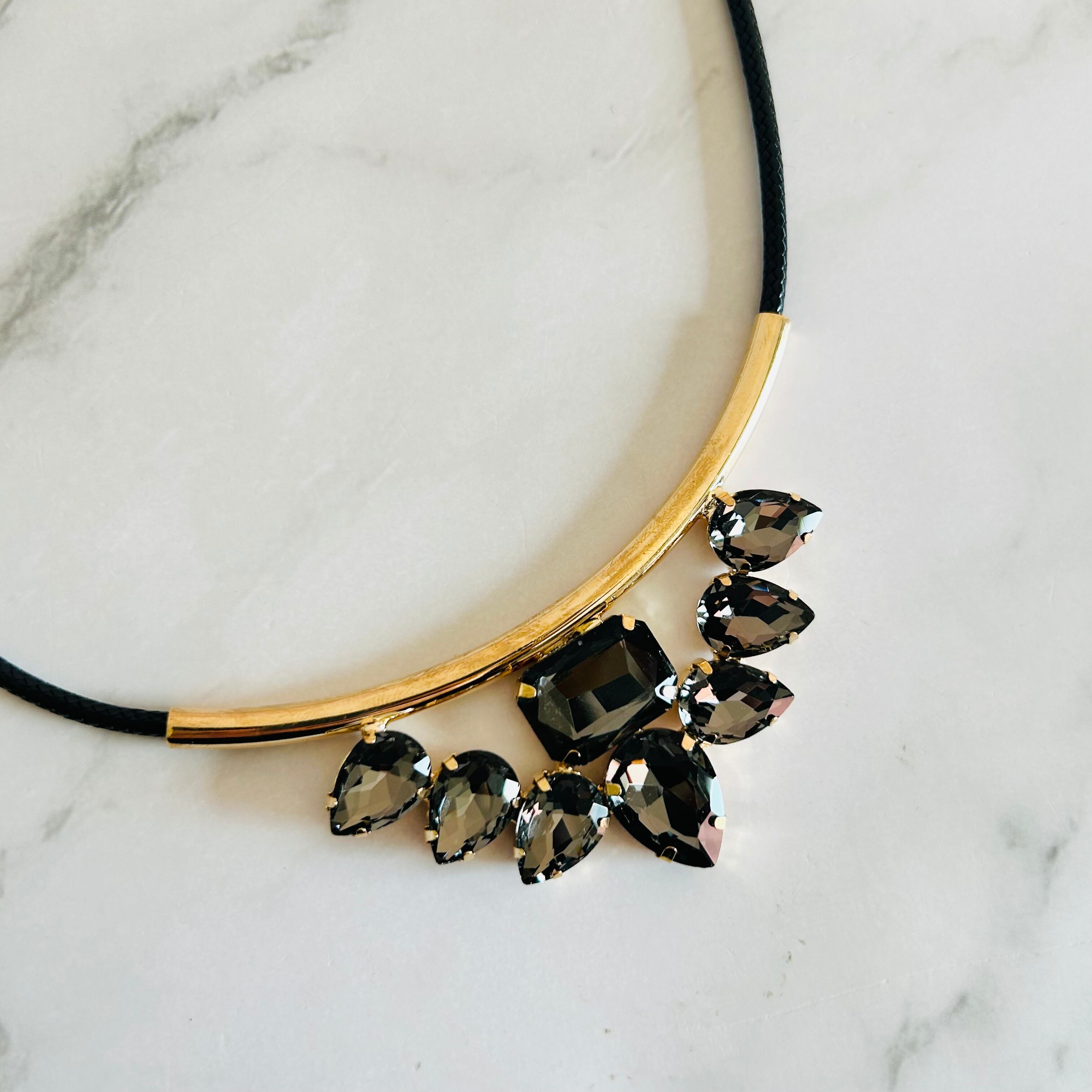 艶のあるブラックコードに、ゴールドのバーとクリスタルストーンを組み合わせた、洗練されたデザインのネックレスです。
