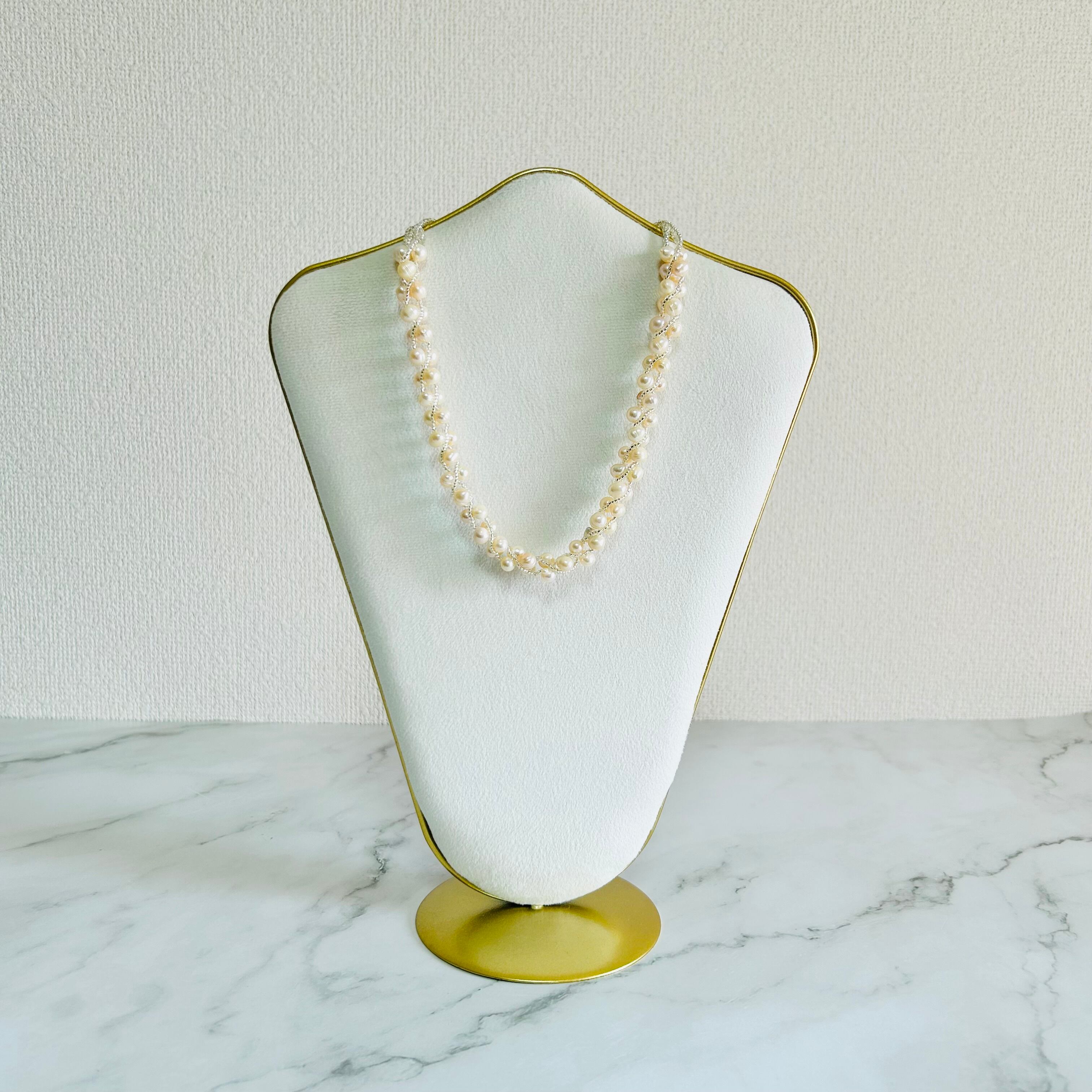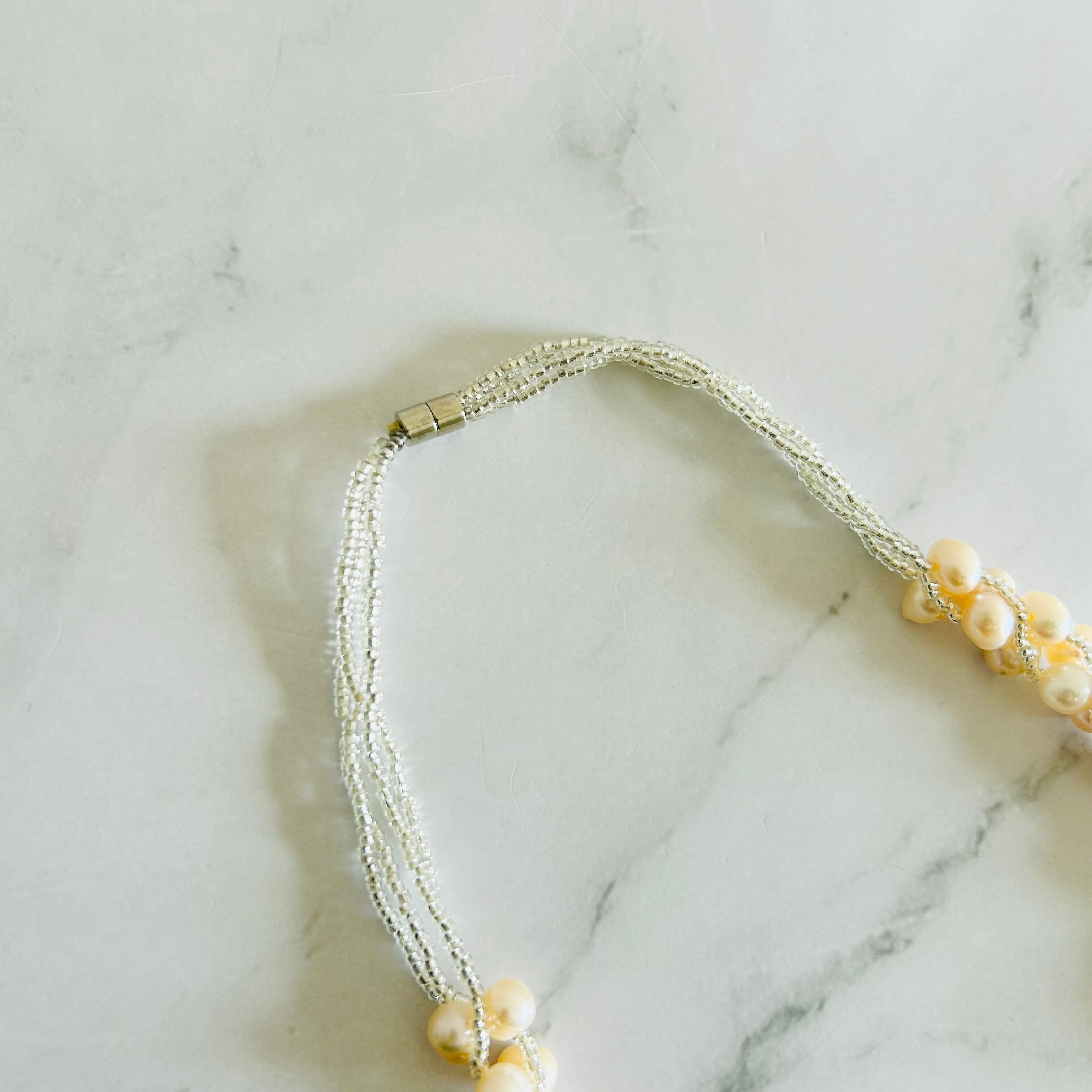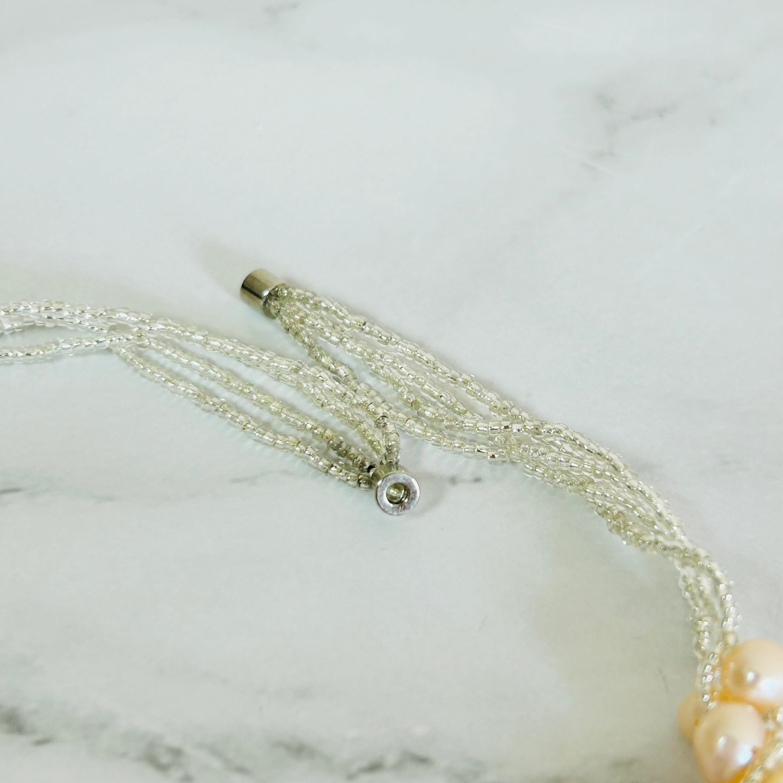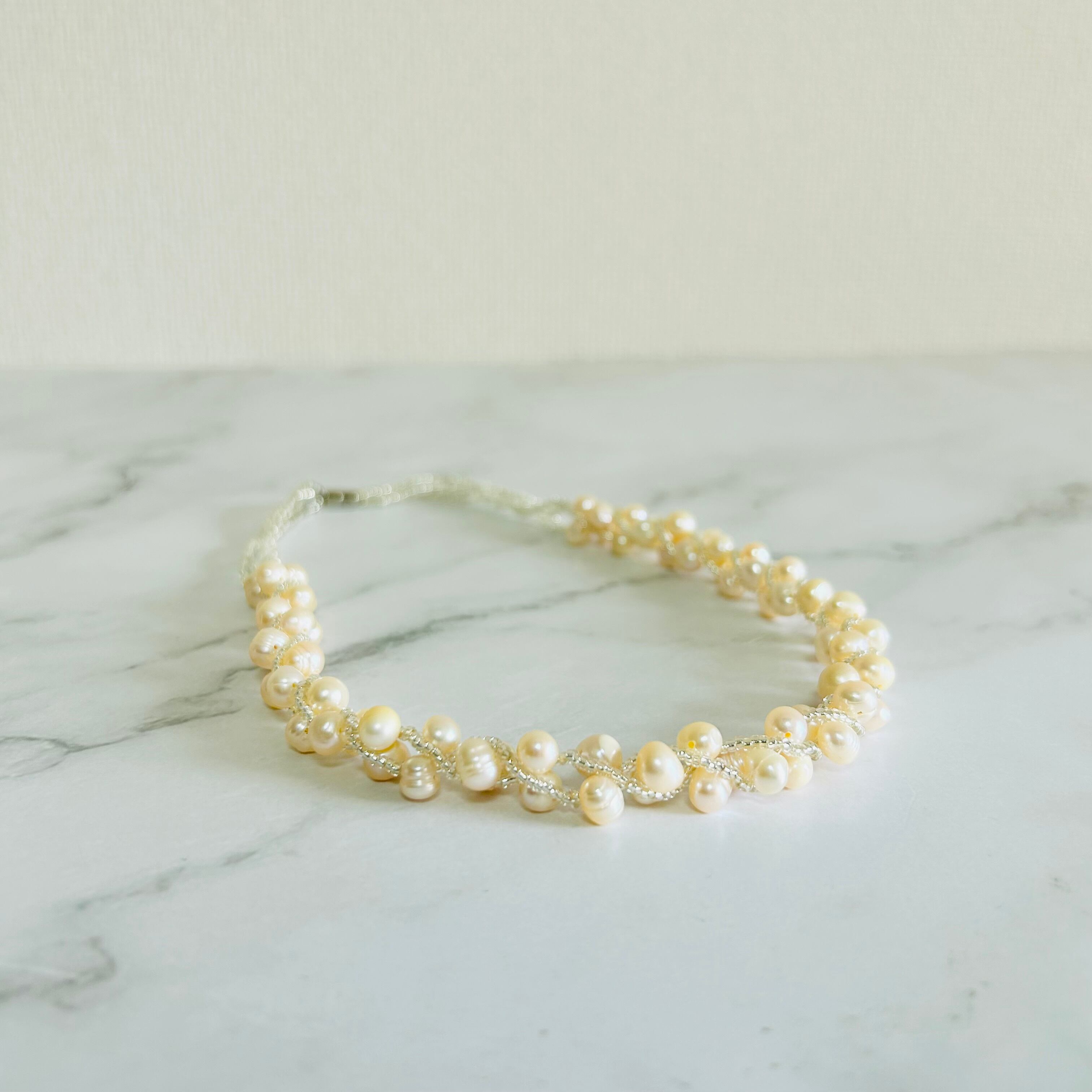 オレンジがかった天然の淡水パールを贅沢に使用し、繊細なビーズを編み込んで仕立てた上品なネックレスです。