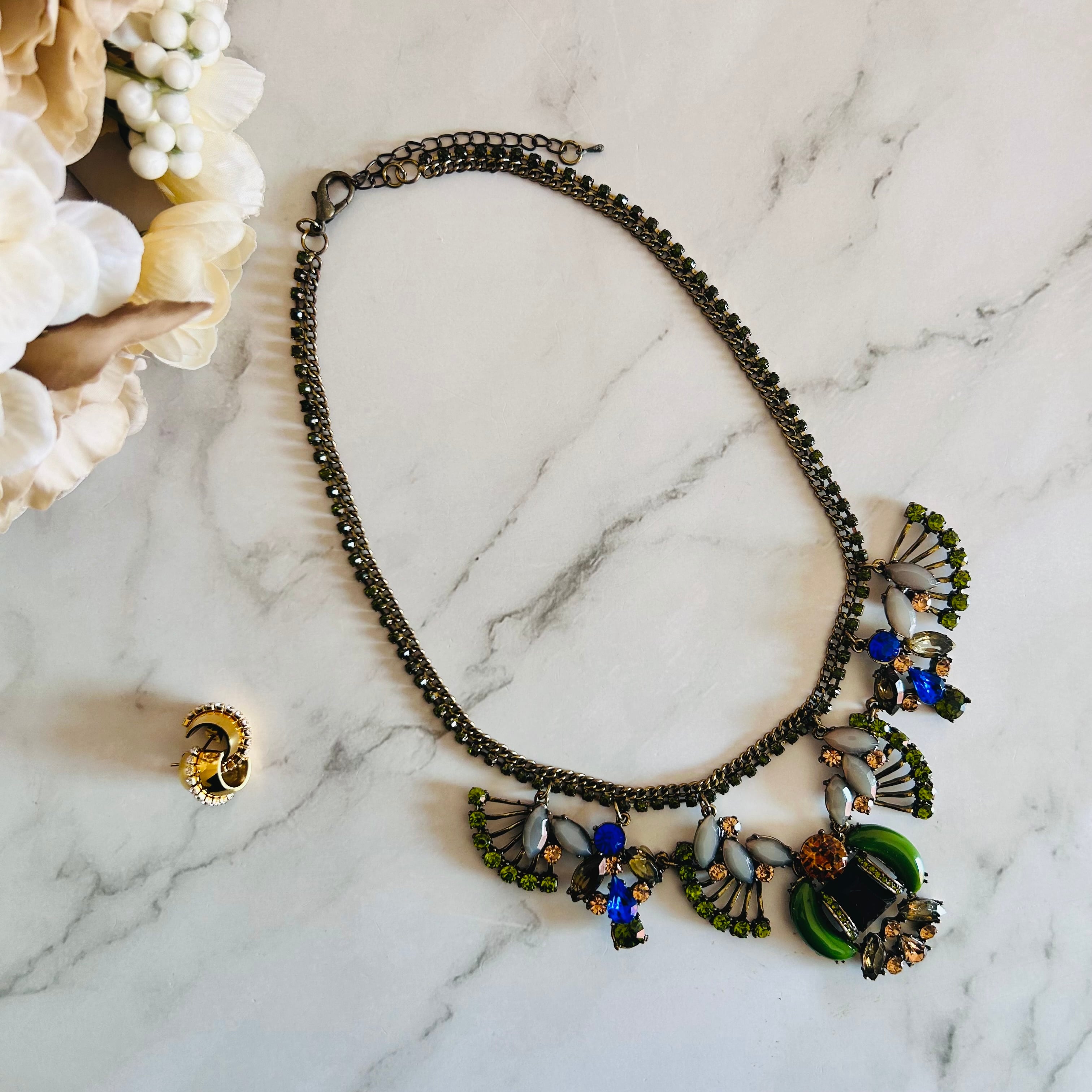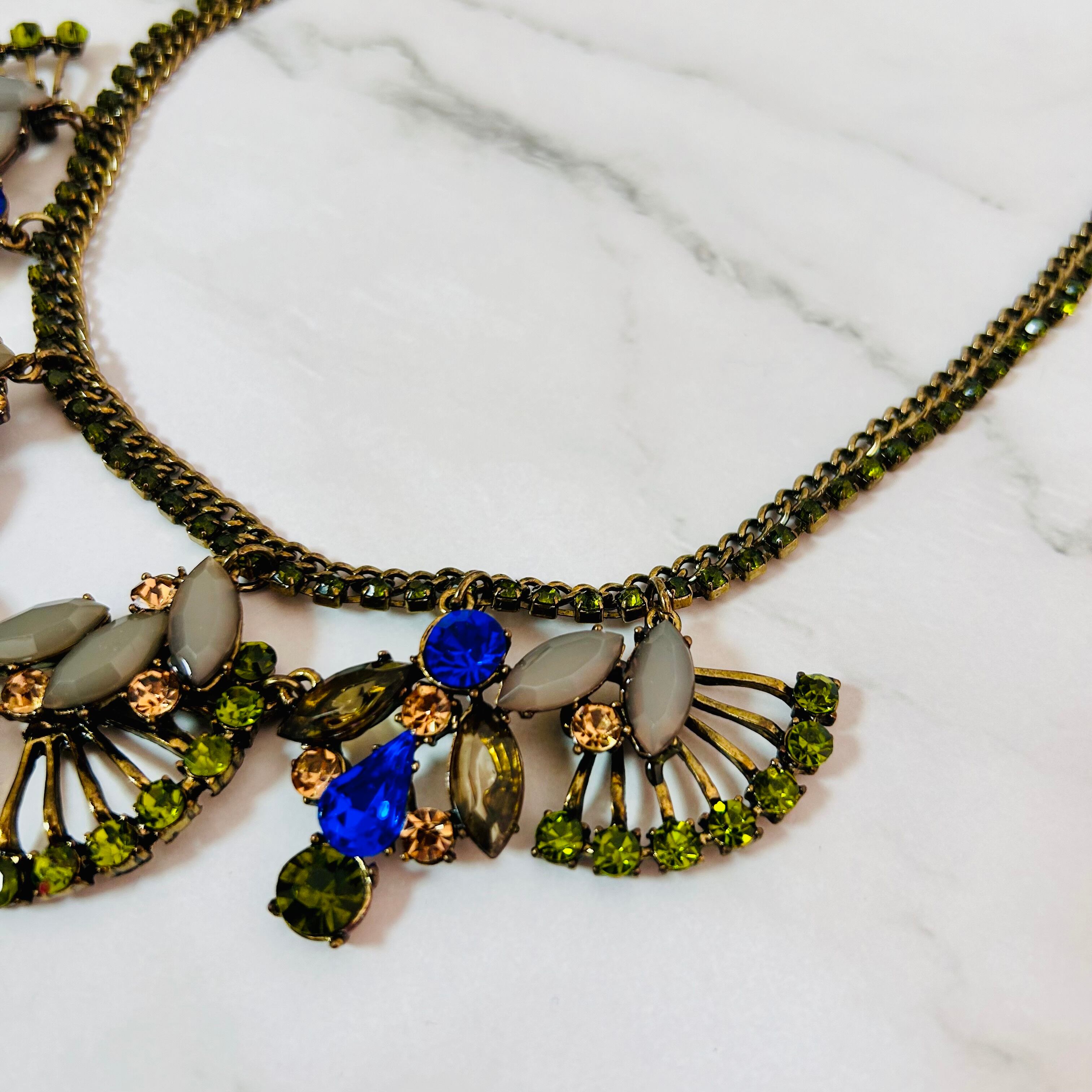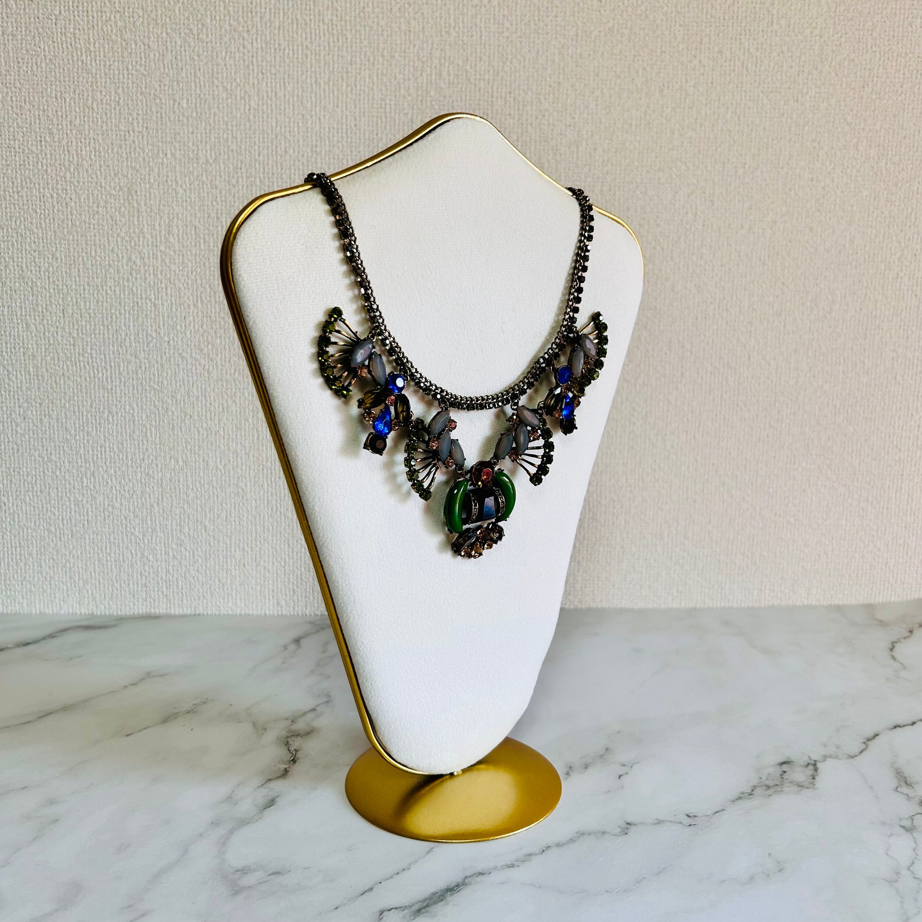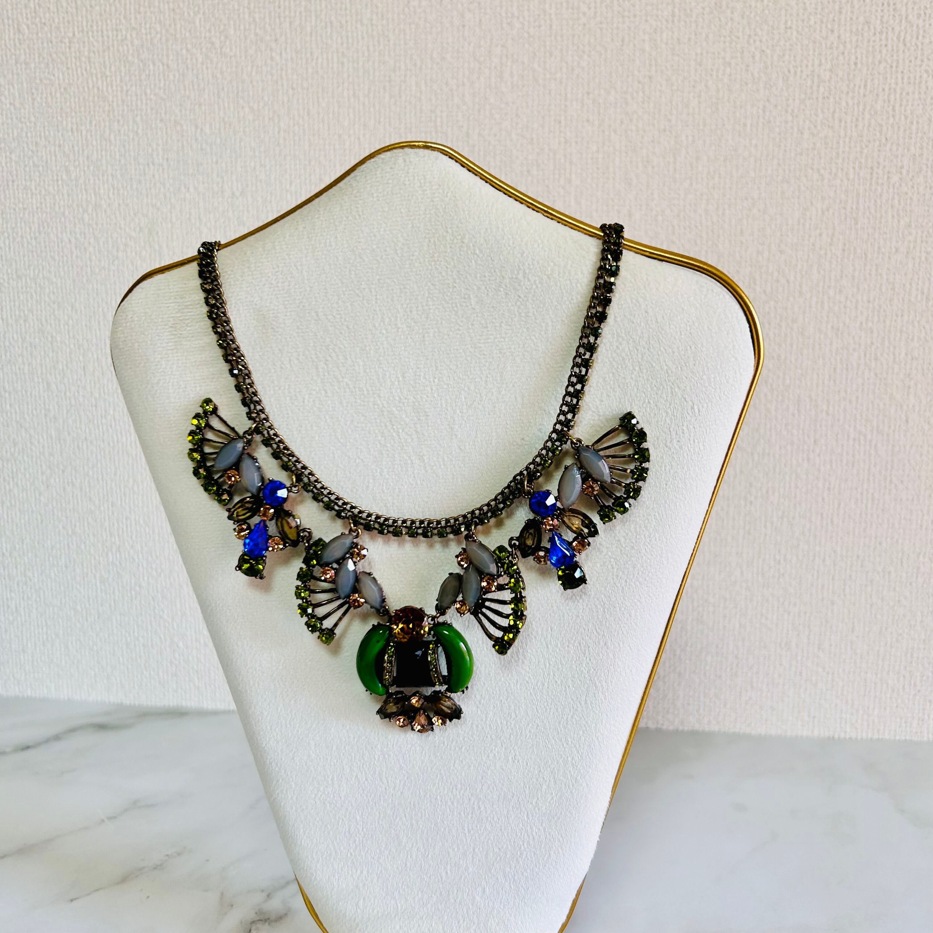 グリーンのラインストーンをあしらったアンティーク調のチェーンに、グリーン・ロイヤルブルー・グレー系のビジューを組み合わせ、扇のようなモチーフでリズミカルに仕上げたデザインネックレス。