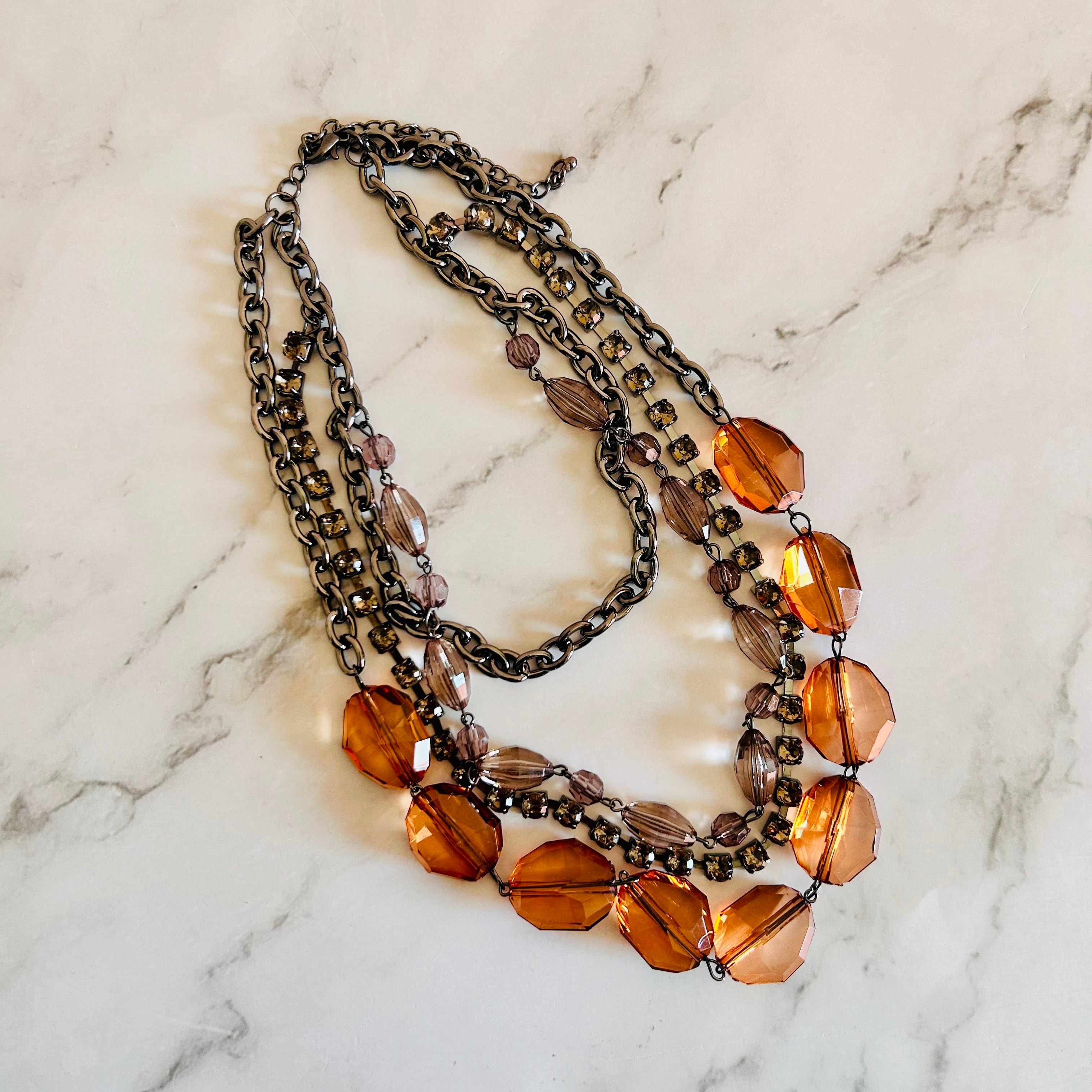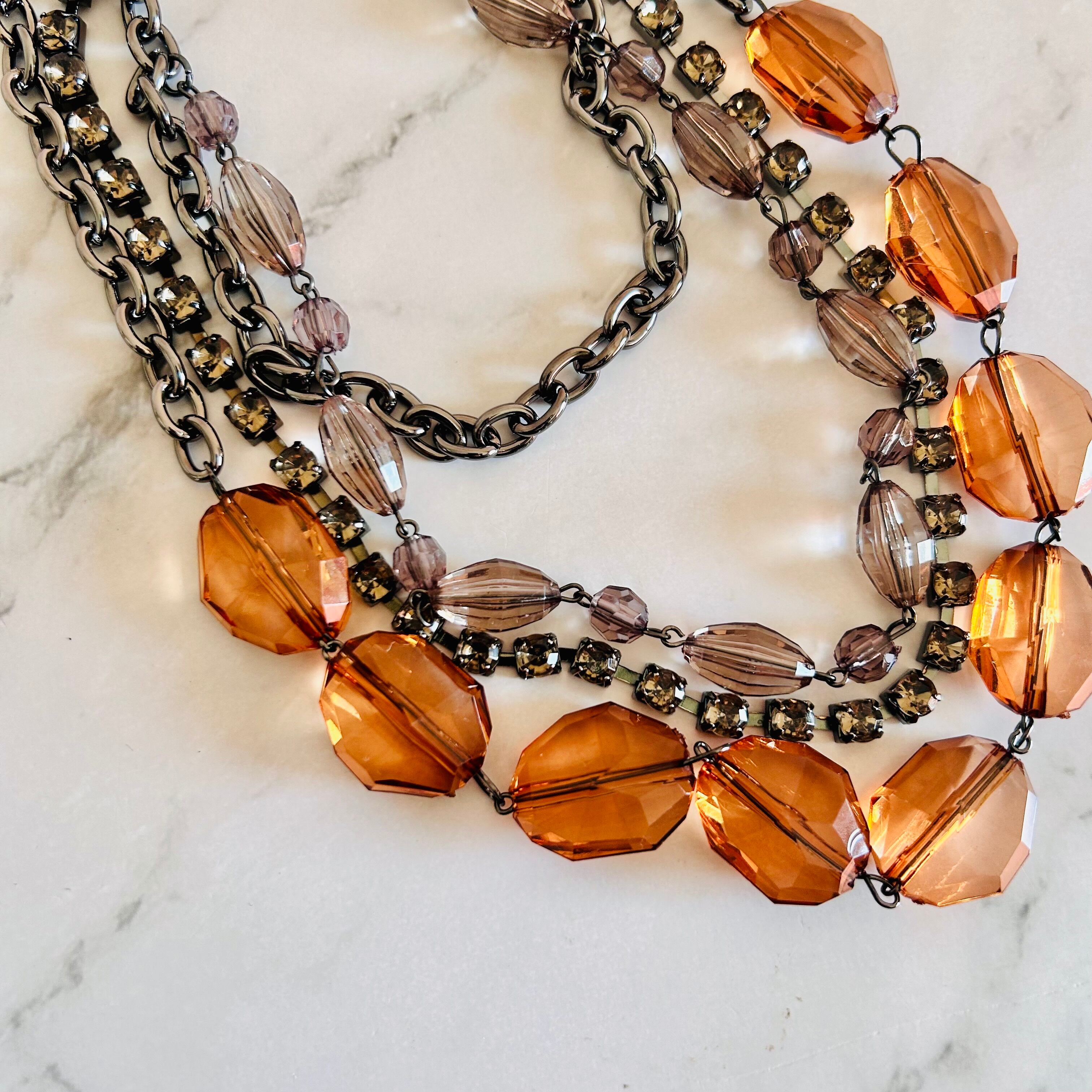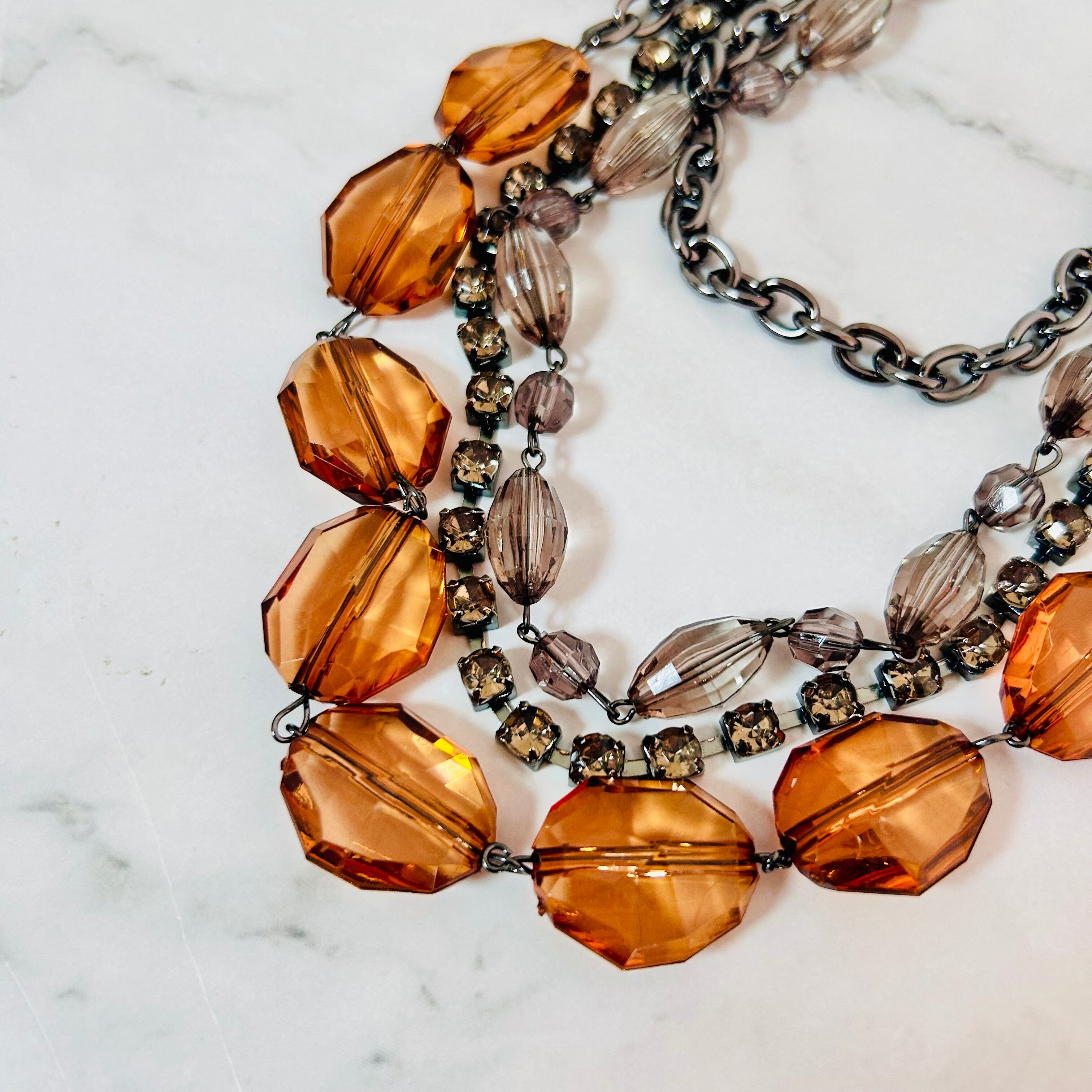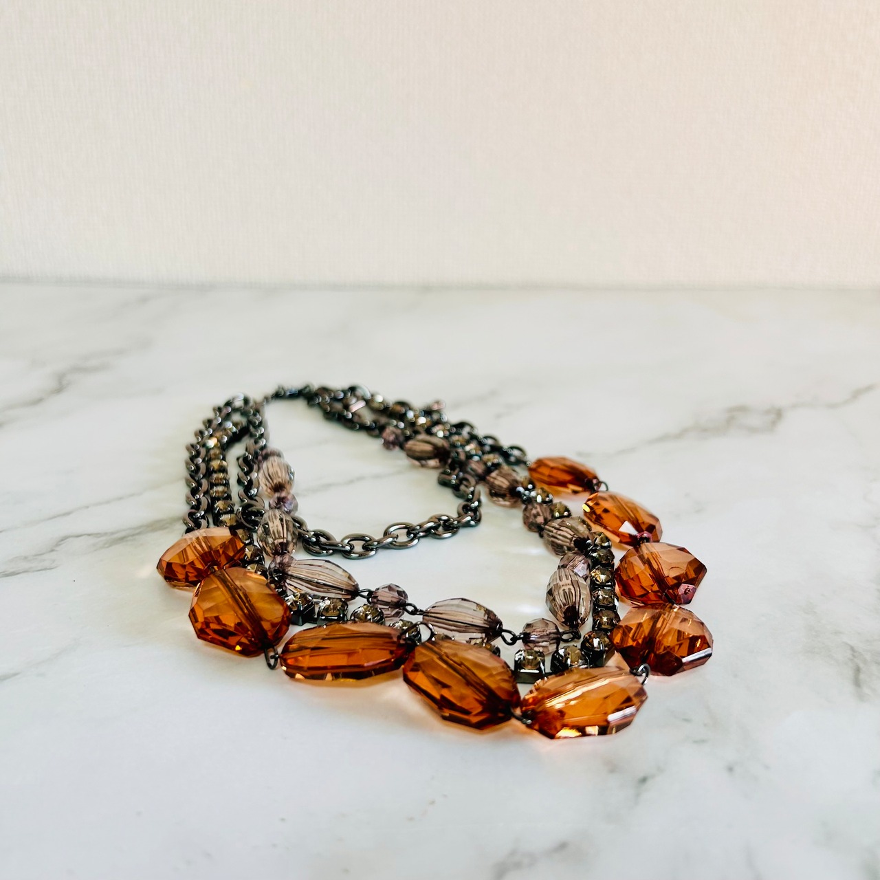 艶やかなアンバーカラーのカットパーツに、スモーキーブラウンのビーズやラインストーンチェーンを重ねた、3連レイヤードネックレス。