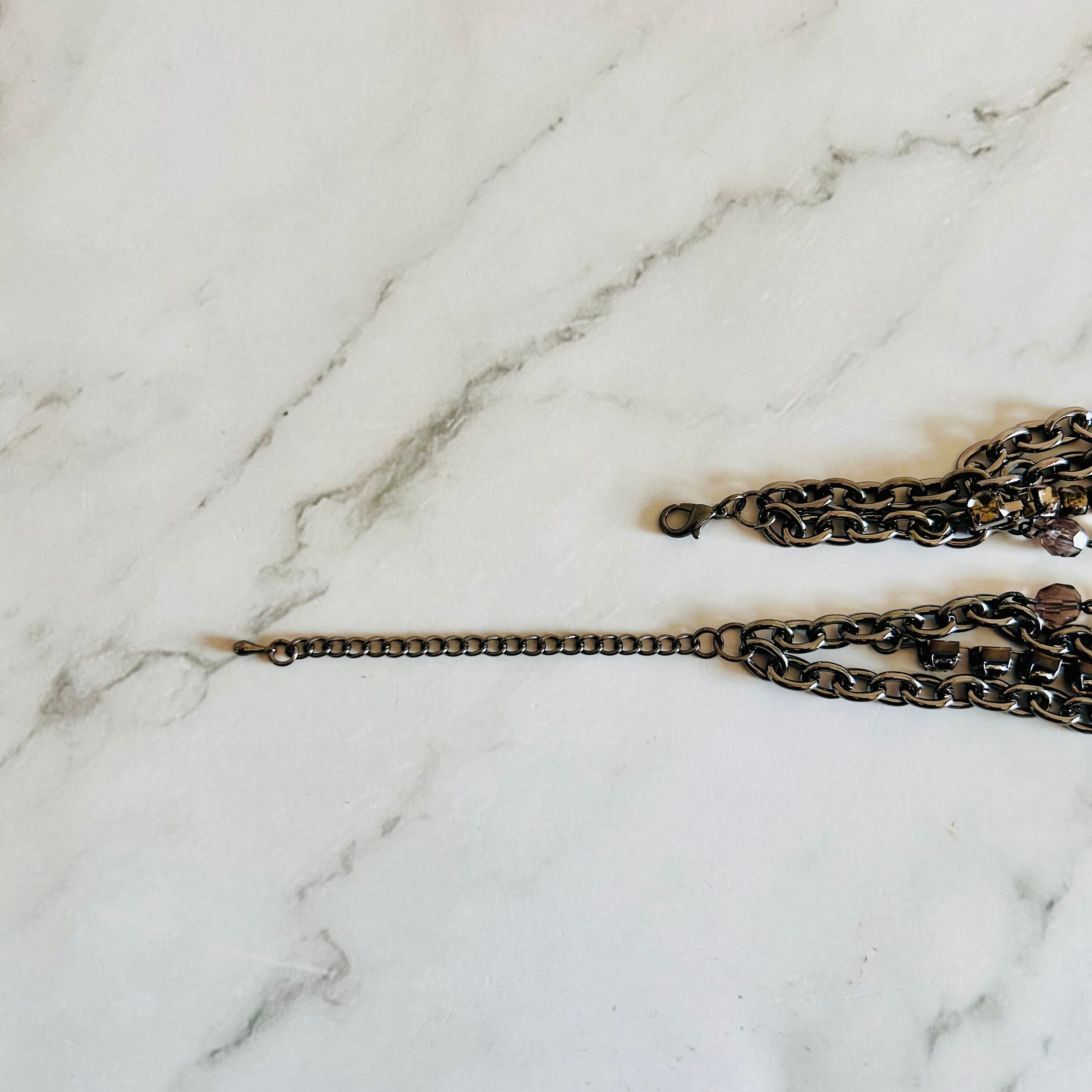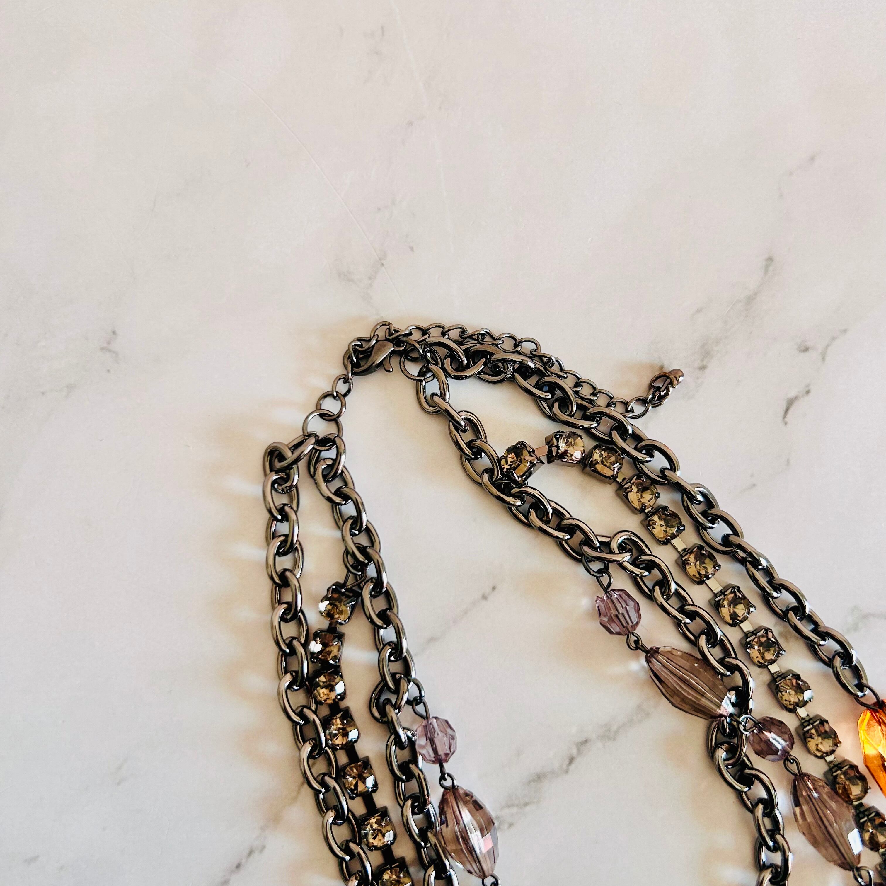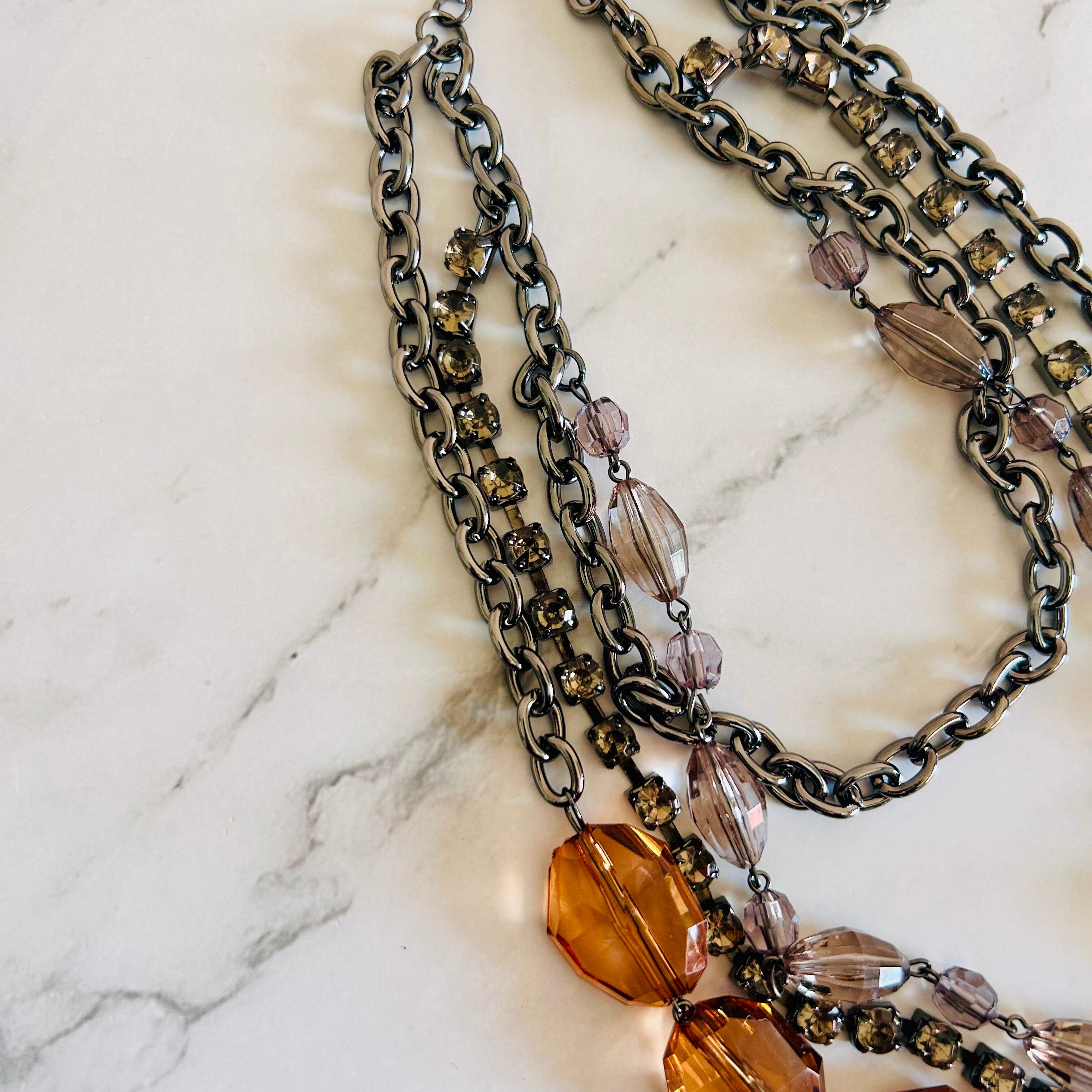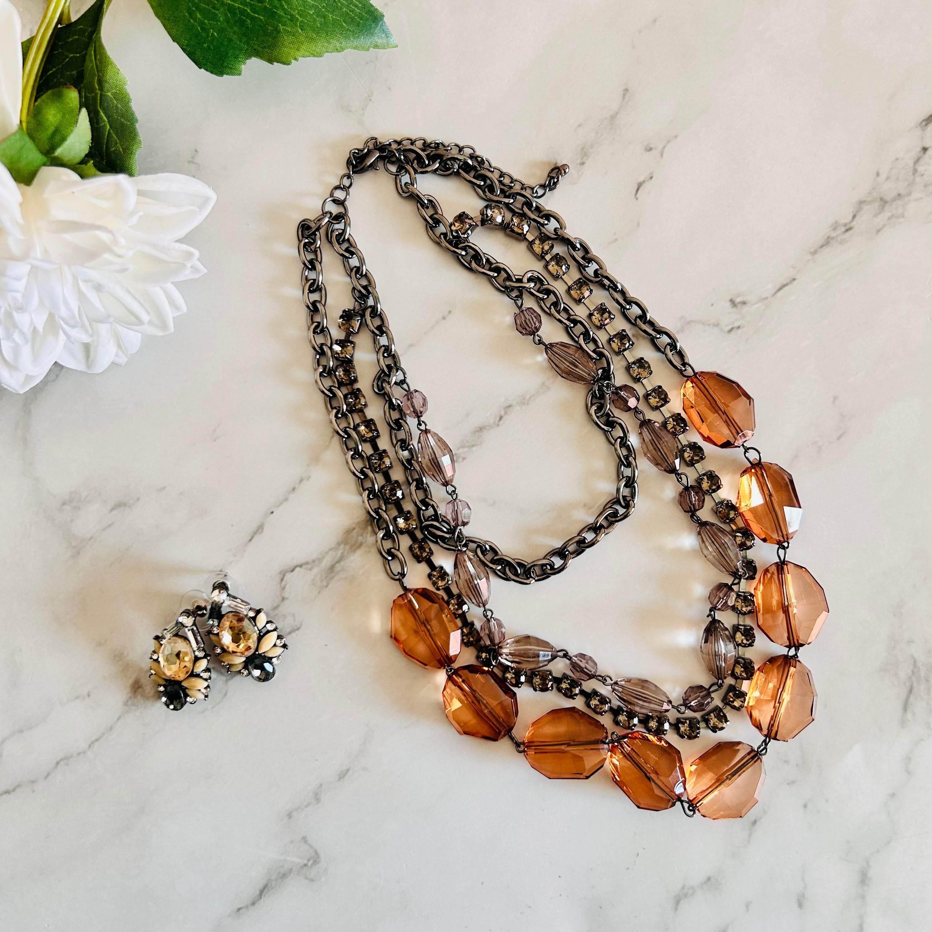 艶やかなアンバーカラーのカットパーツに、スモーキーブラウンのビーズやラインストーンチェーンを重ねた、3連レイヤードネックレス。