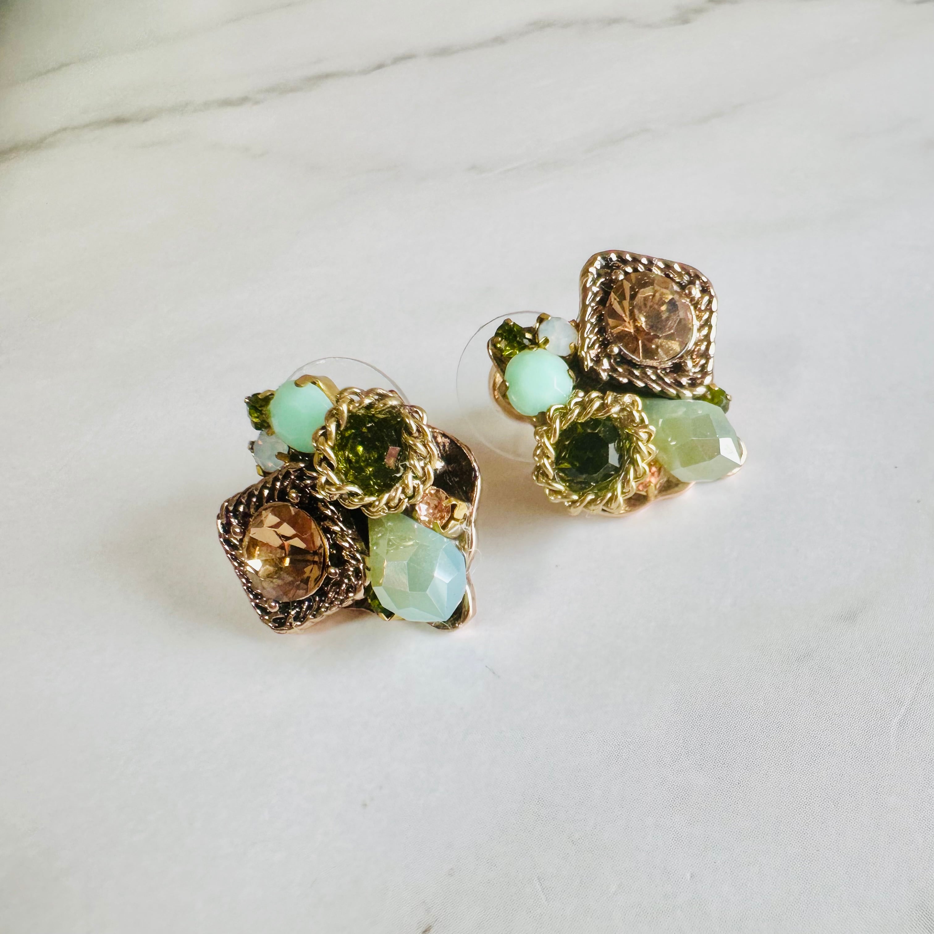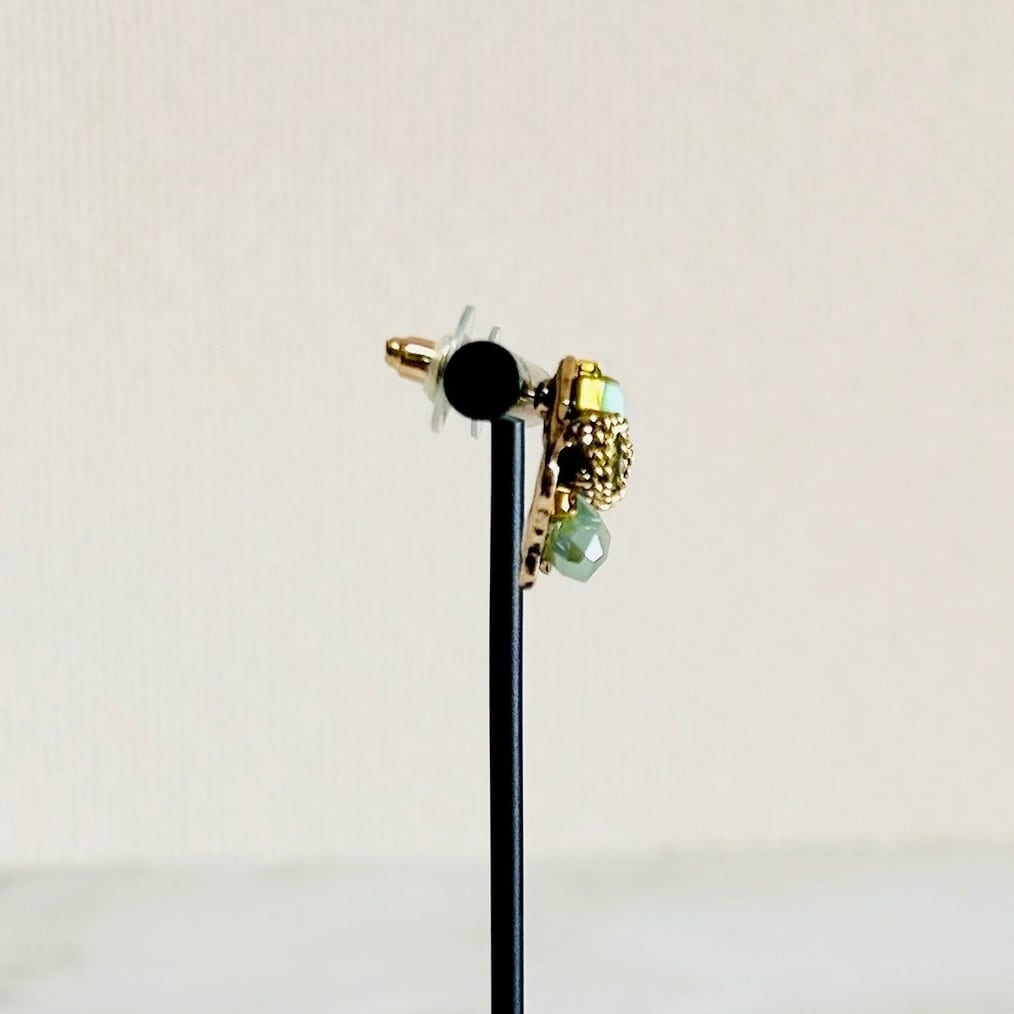 アンティーク調のゴールドベースに、オリーブグリーンや淡いミントカラーのビジューをあしらった、立体感のあるデザインのピアスです。