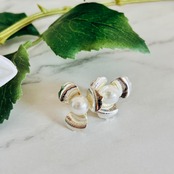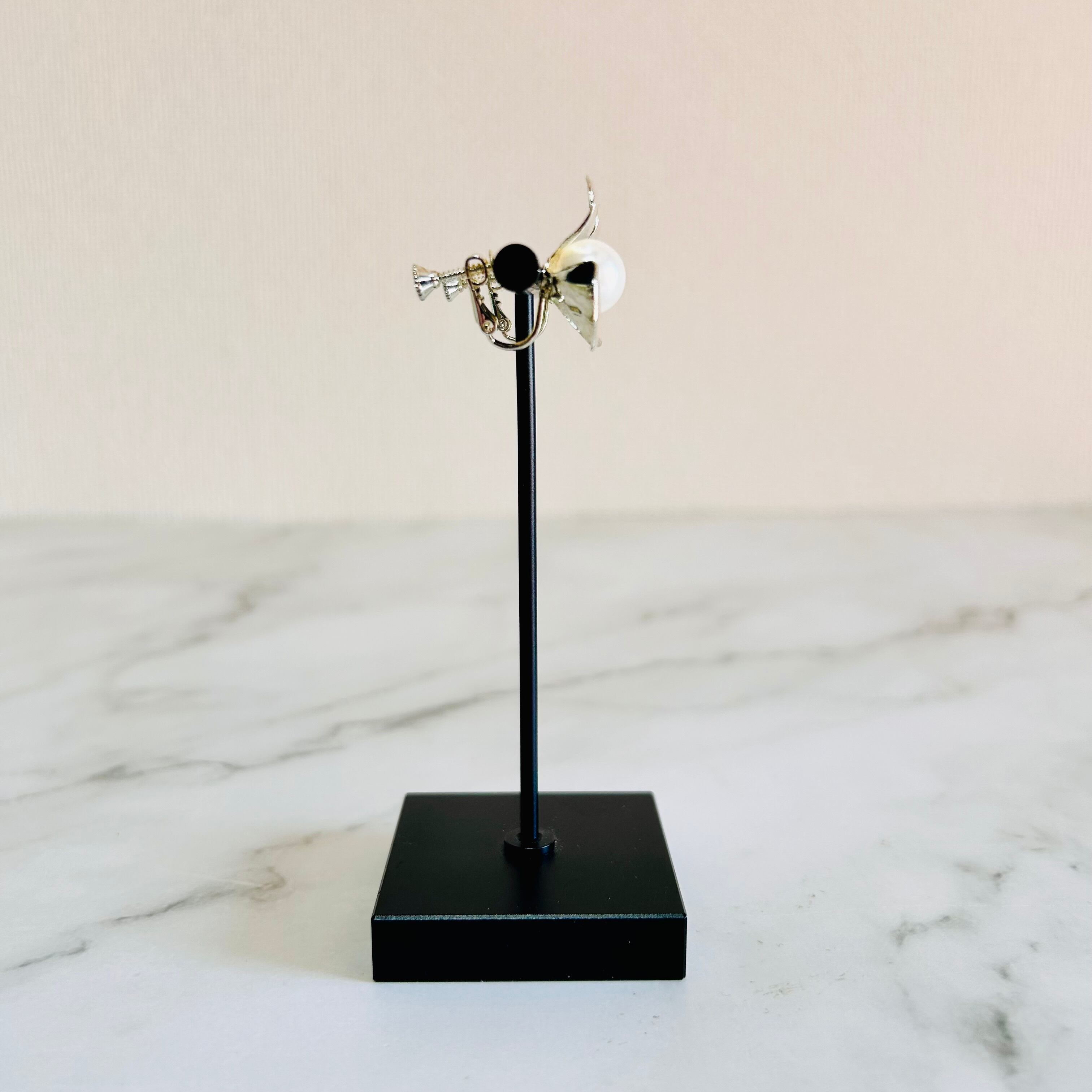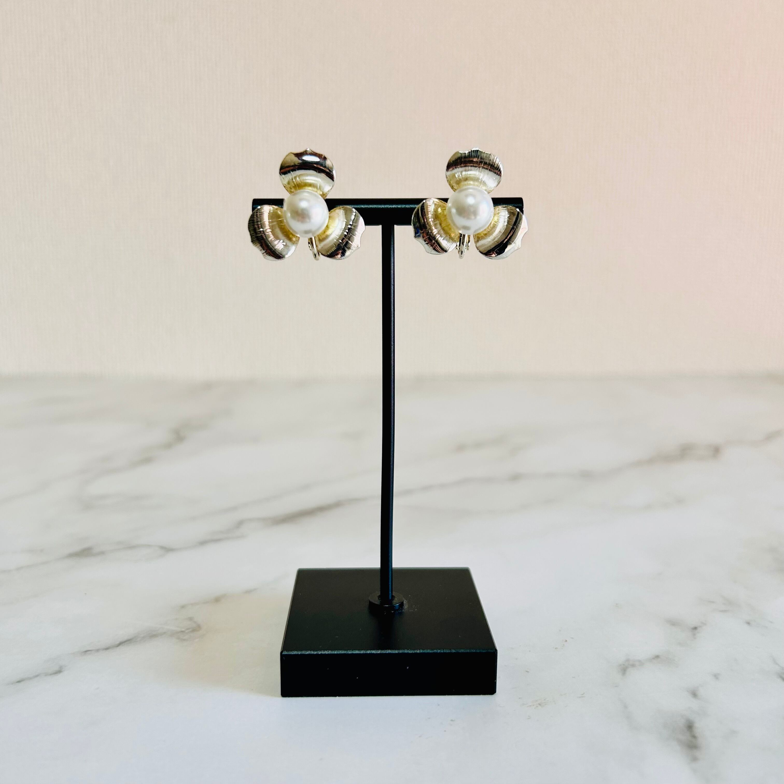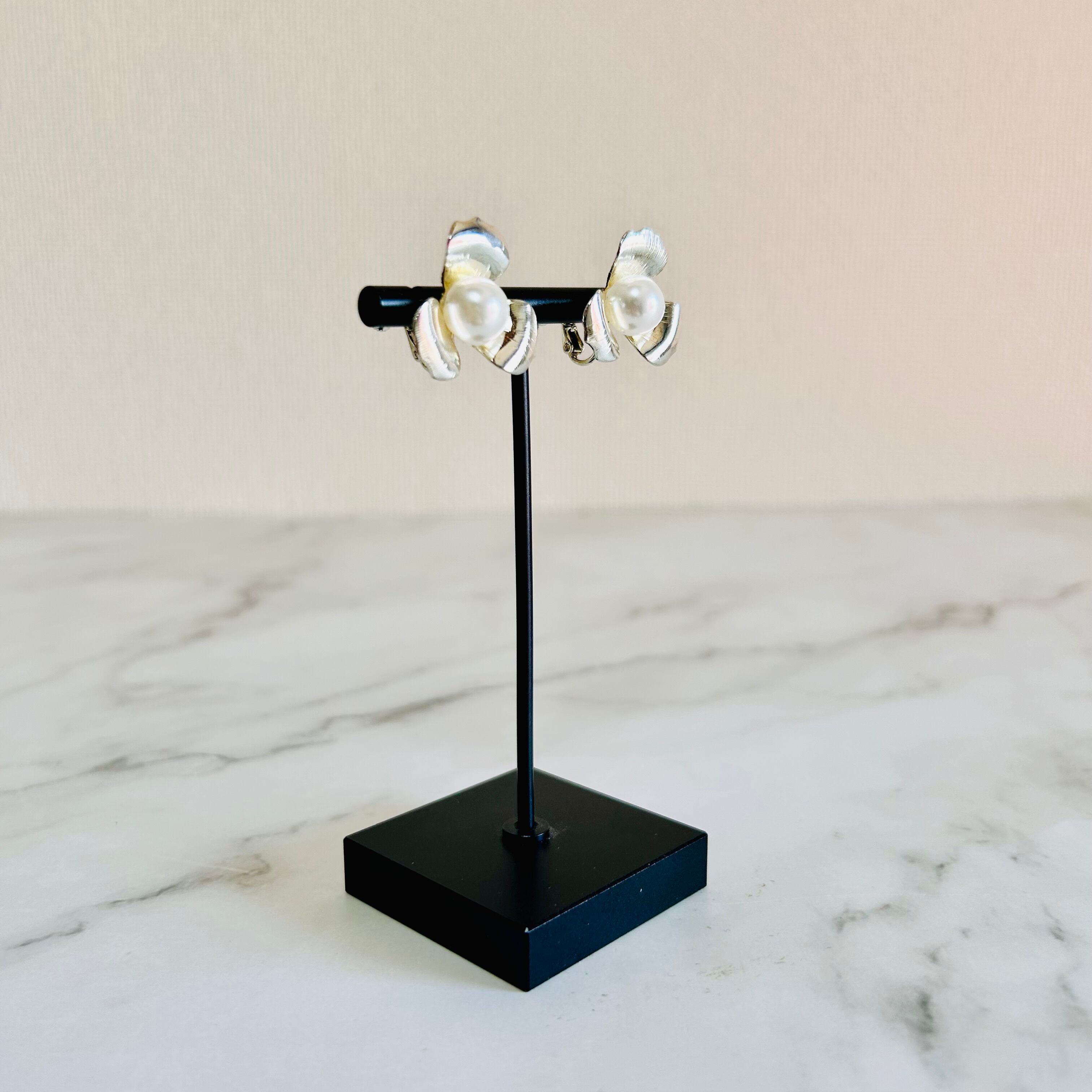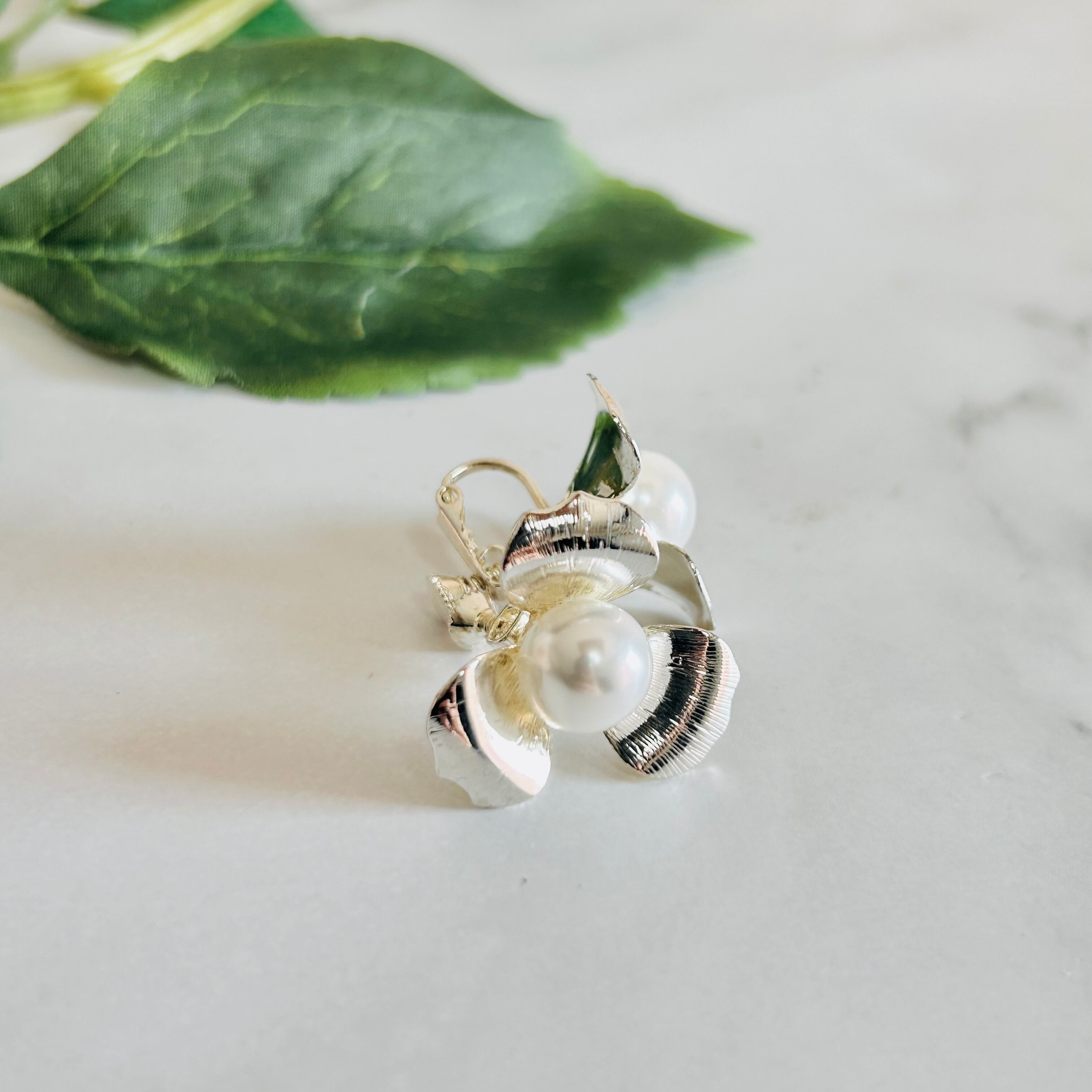 繊細なラインが彫り込まれたシルバートーンの花びらに、つややかなフェイクパールをあしらった上品なデザイン☆